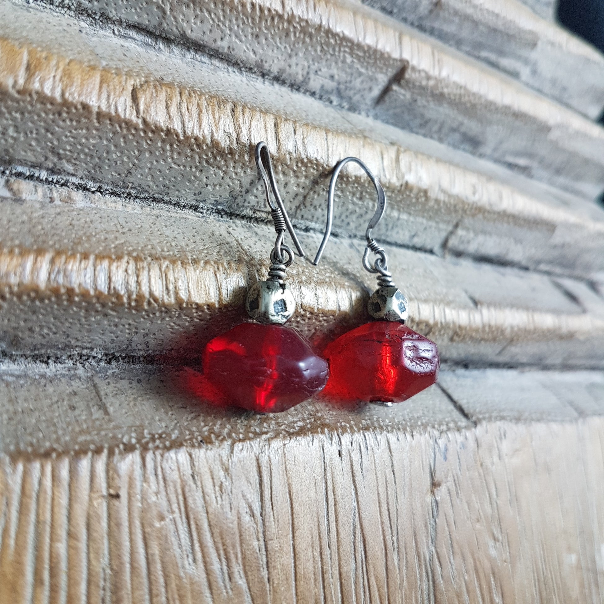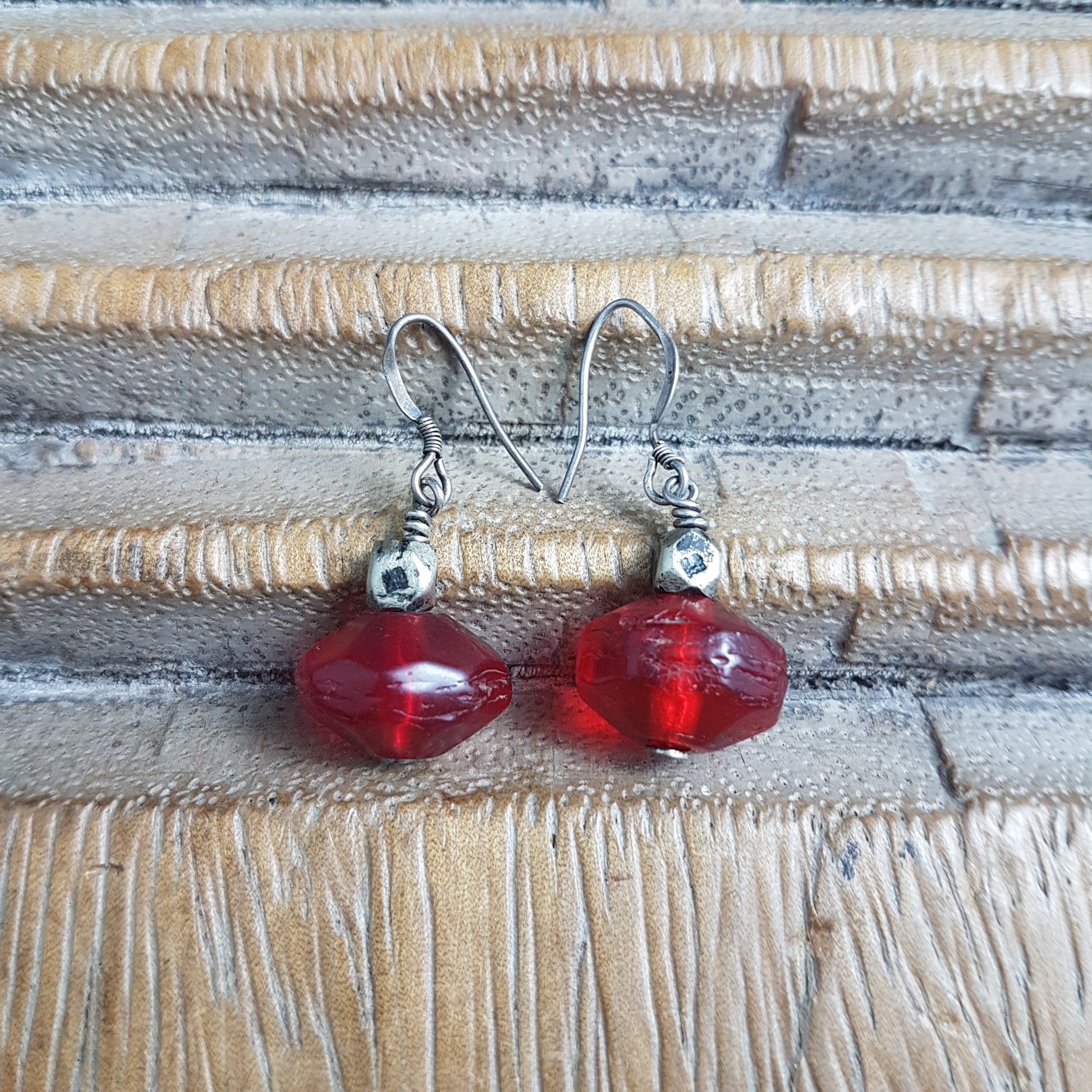 Small handcrafted earrings with red faceted glass beads from Africa and metal beads from the Tuareg on a silver hook by ambra Schmuck.
