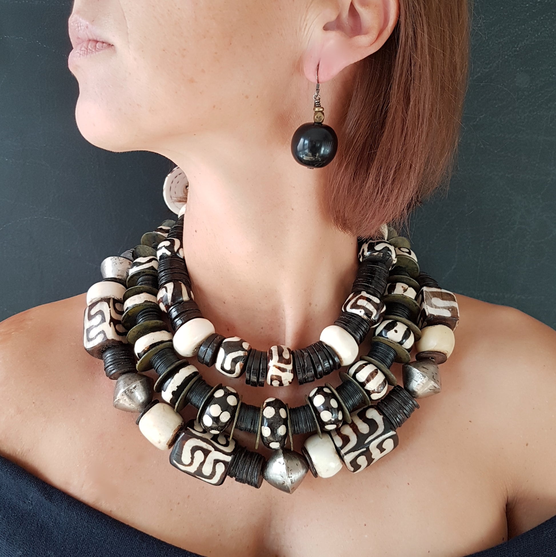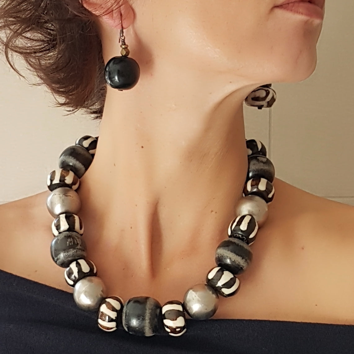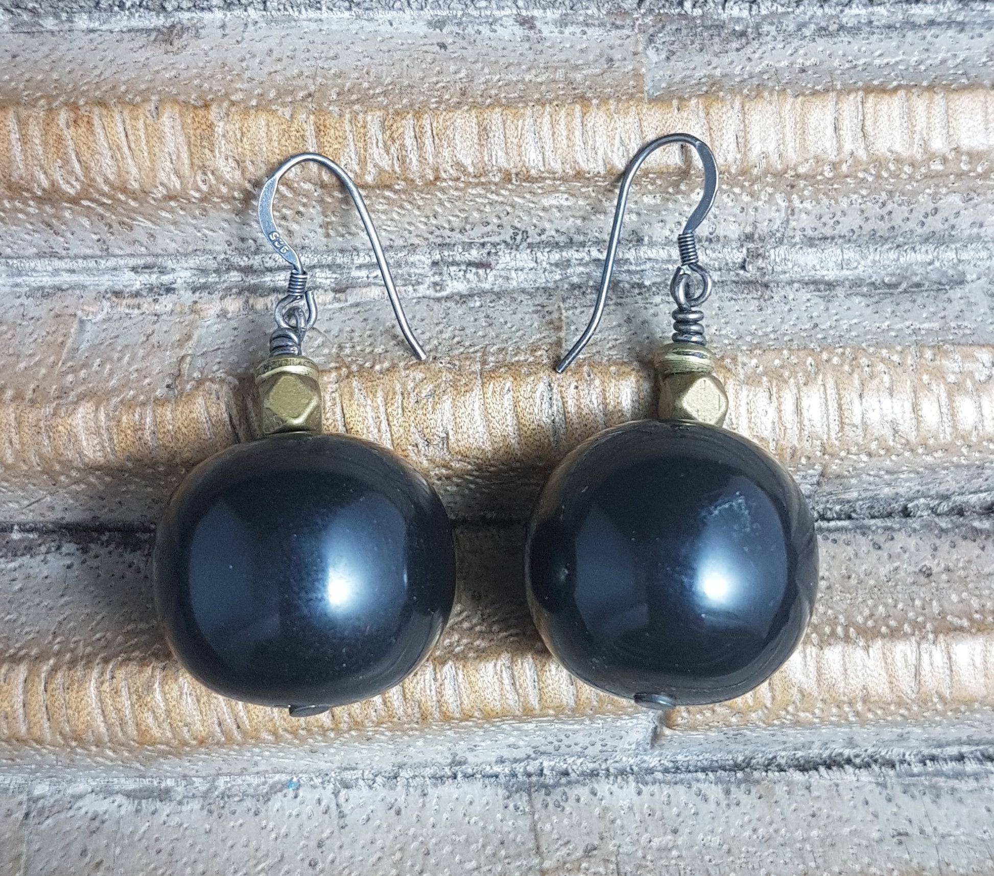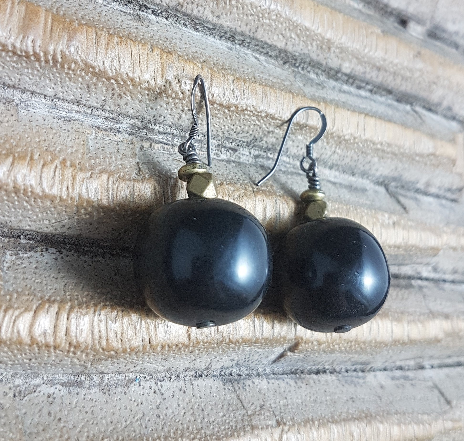 Handmade earrings with black resin beads from Indonesia and Indian bronze beads with oxidized silver hooks by ambra Schmuck.