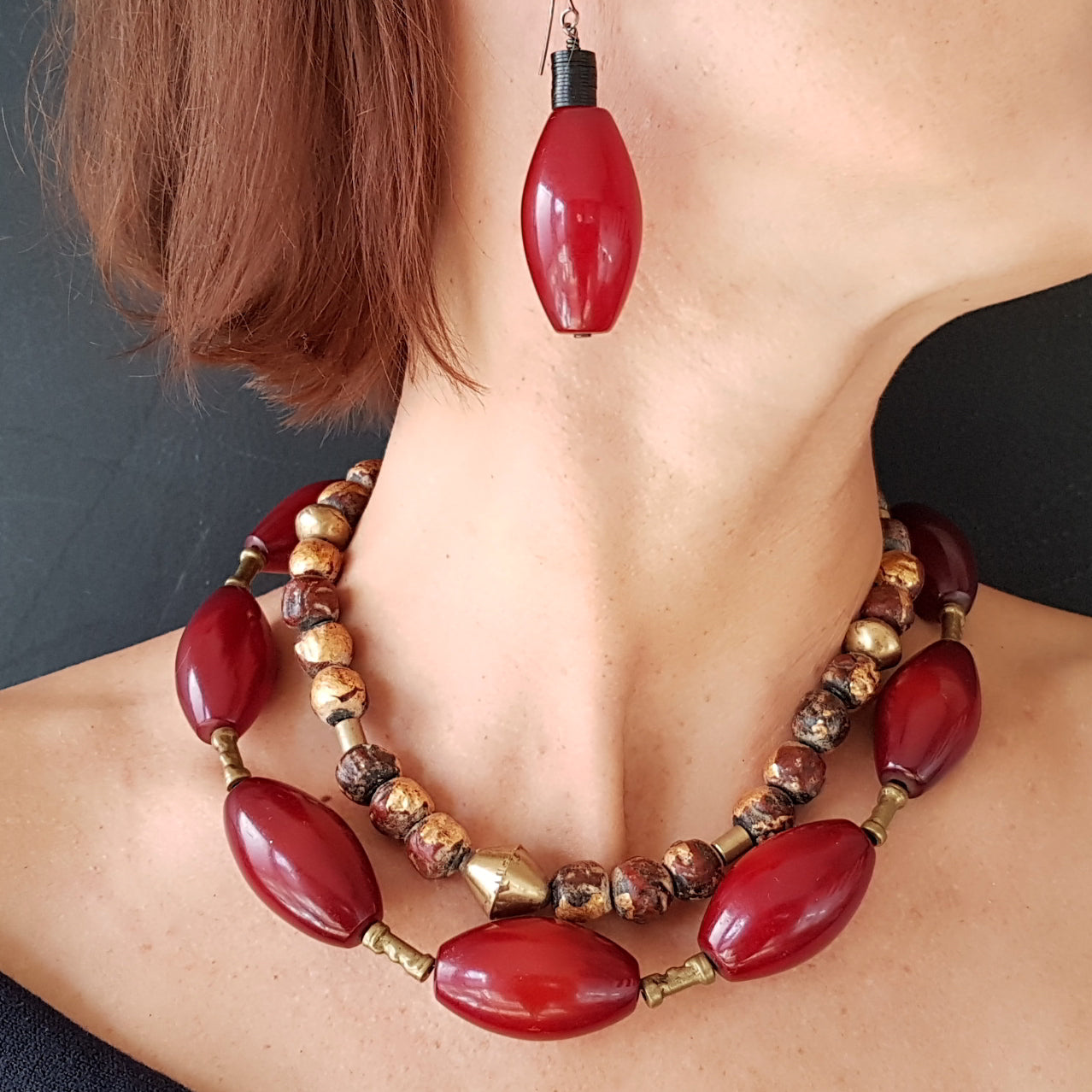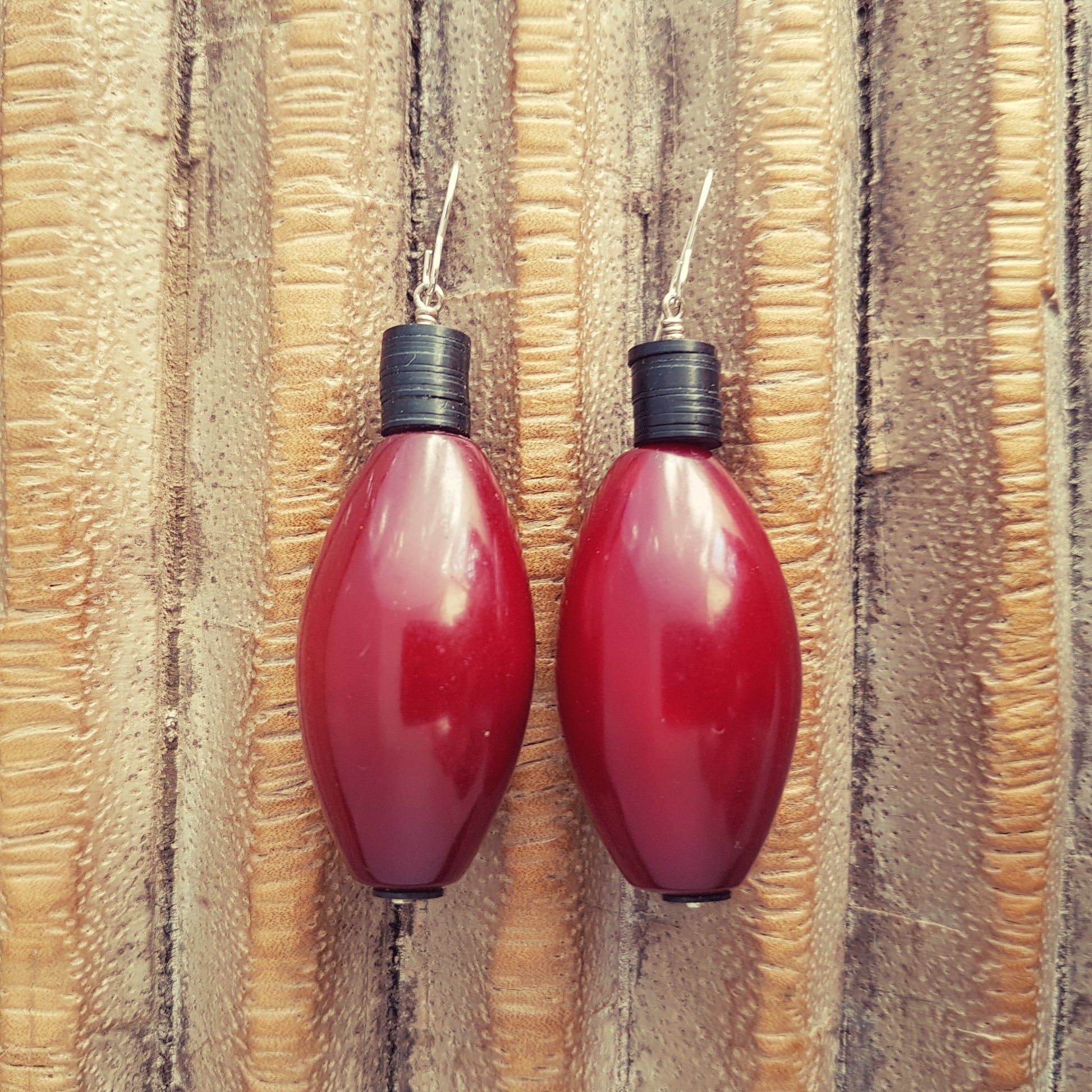 Large handmade earrings with red-brown resin beads from Indonesia and black African Bakelite discs on a silver hook by ambra Schmuck.