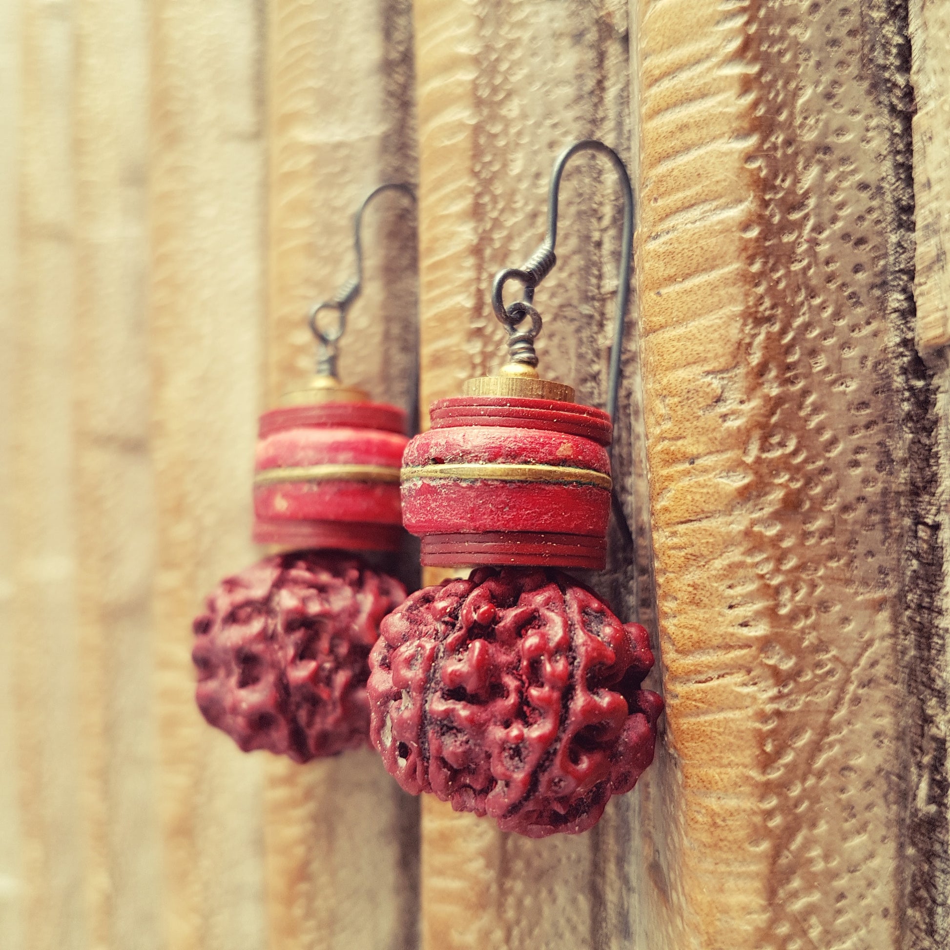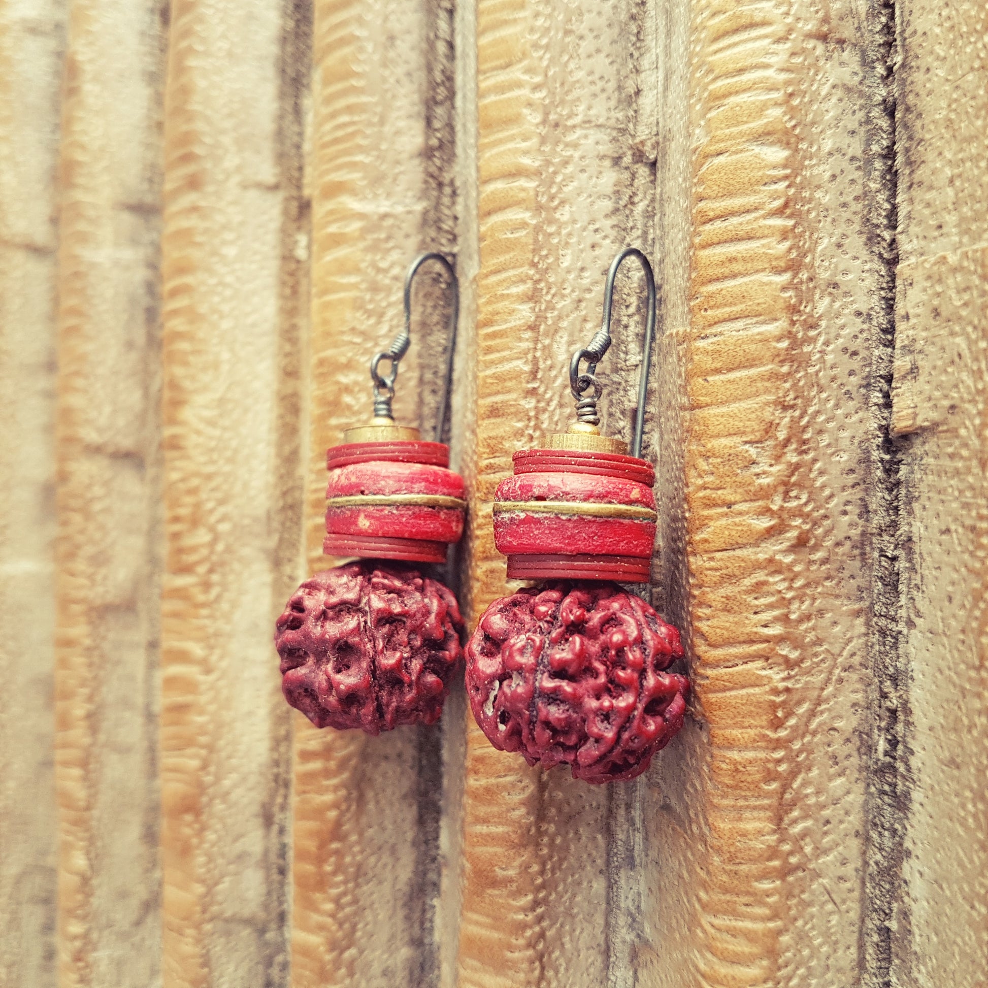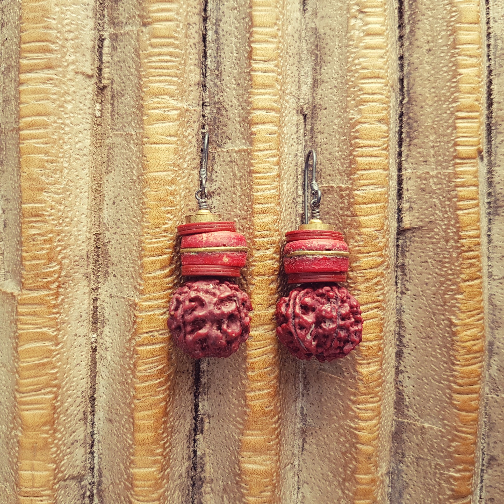 Handmade earrings with reddish Rudraksha seeds and leg beads made from Nepalese prayer malas, red African Bakelite discs and Indian bronze on an oxidized silver hook by ambra Schmuck.