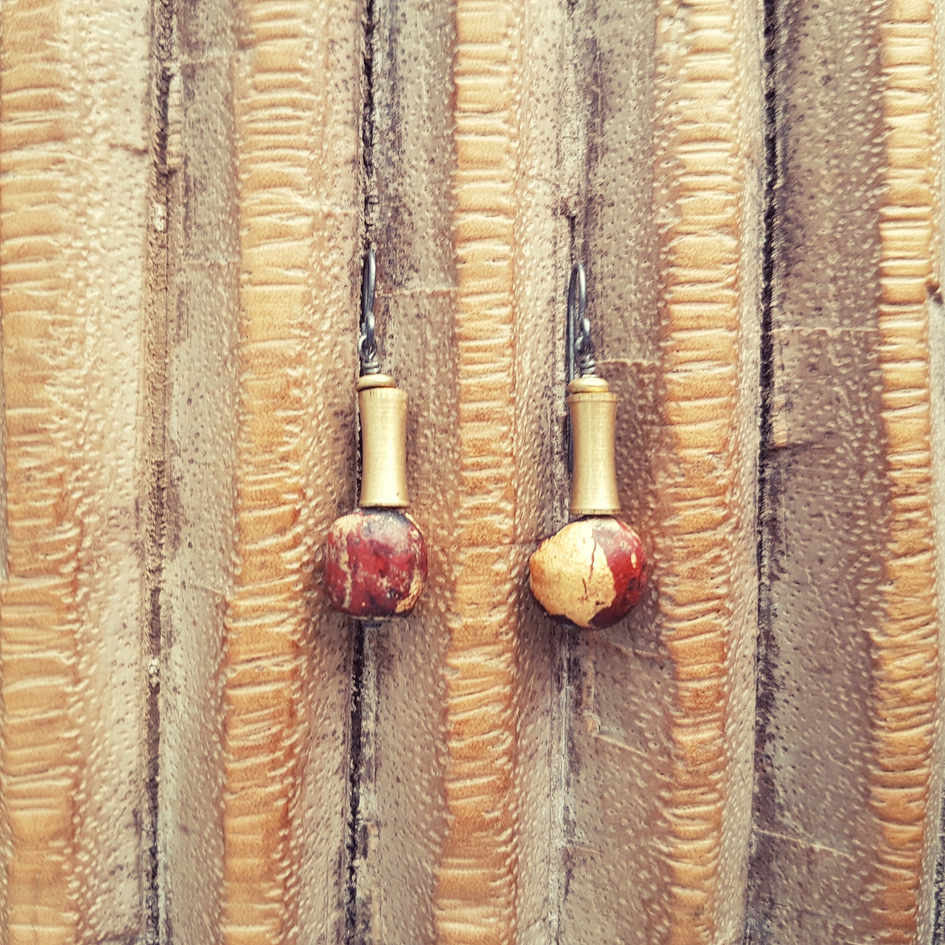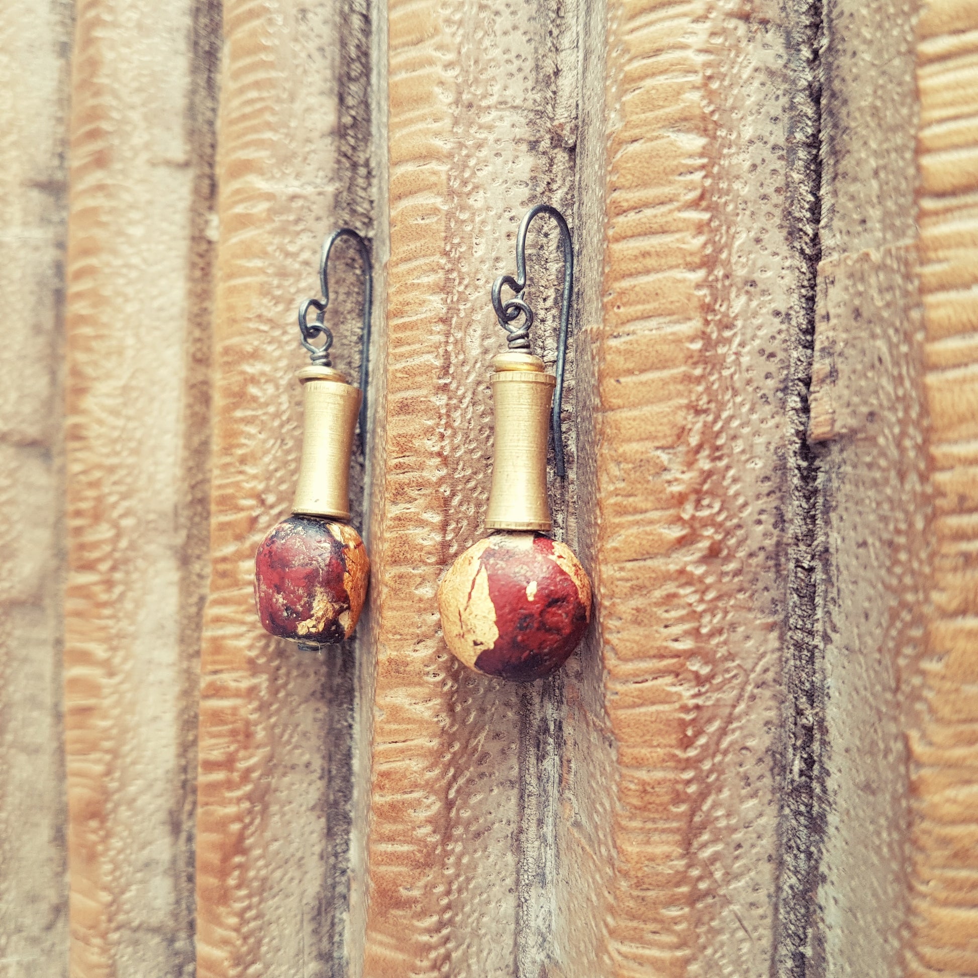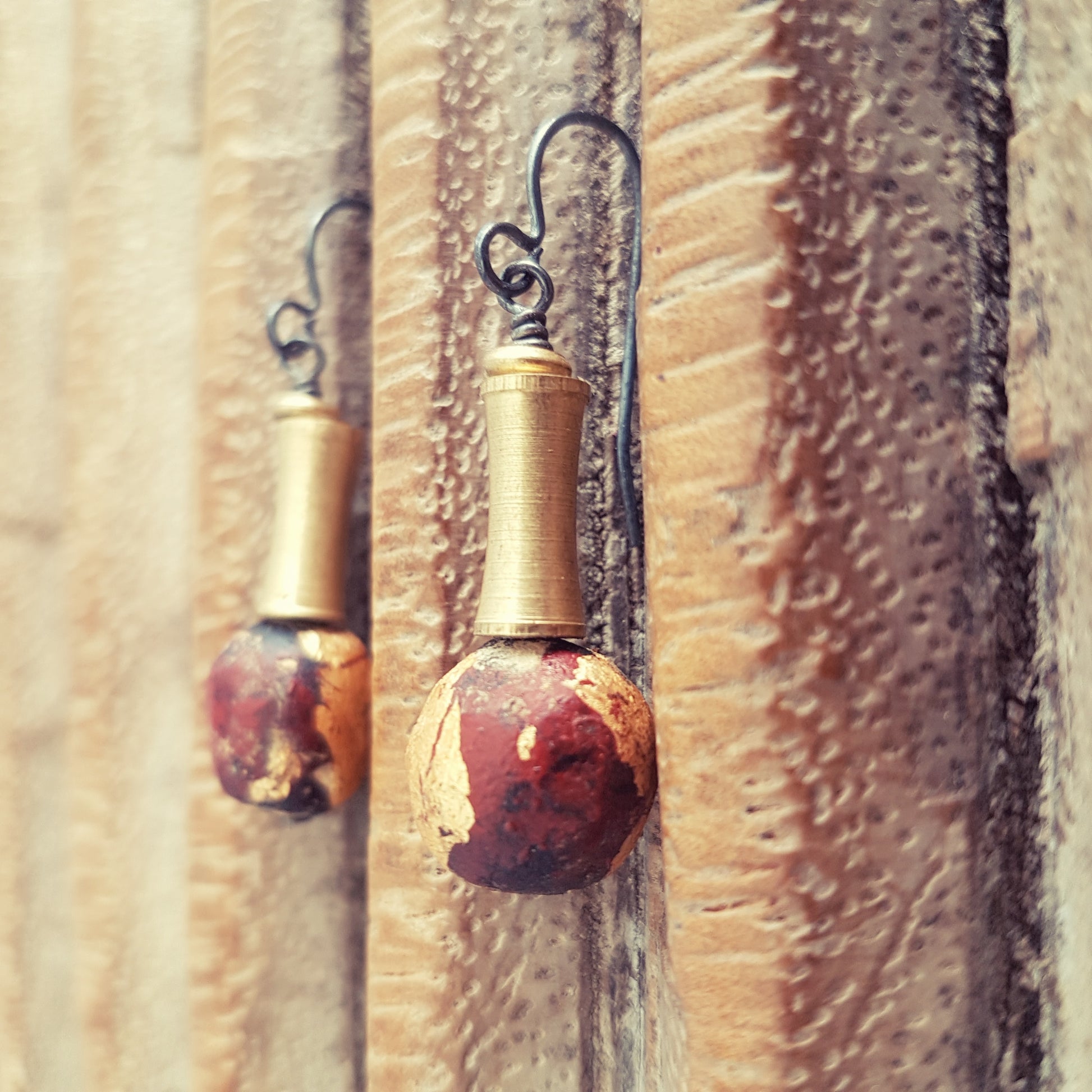 Handmade earrings with clay beads decorated with gold leaf, Buddha beads made from Burmese prayer malas and Indian bronze on oxidized silver hooks by ambra Schmuck.