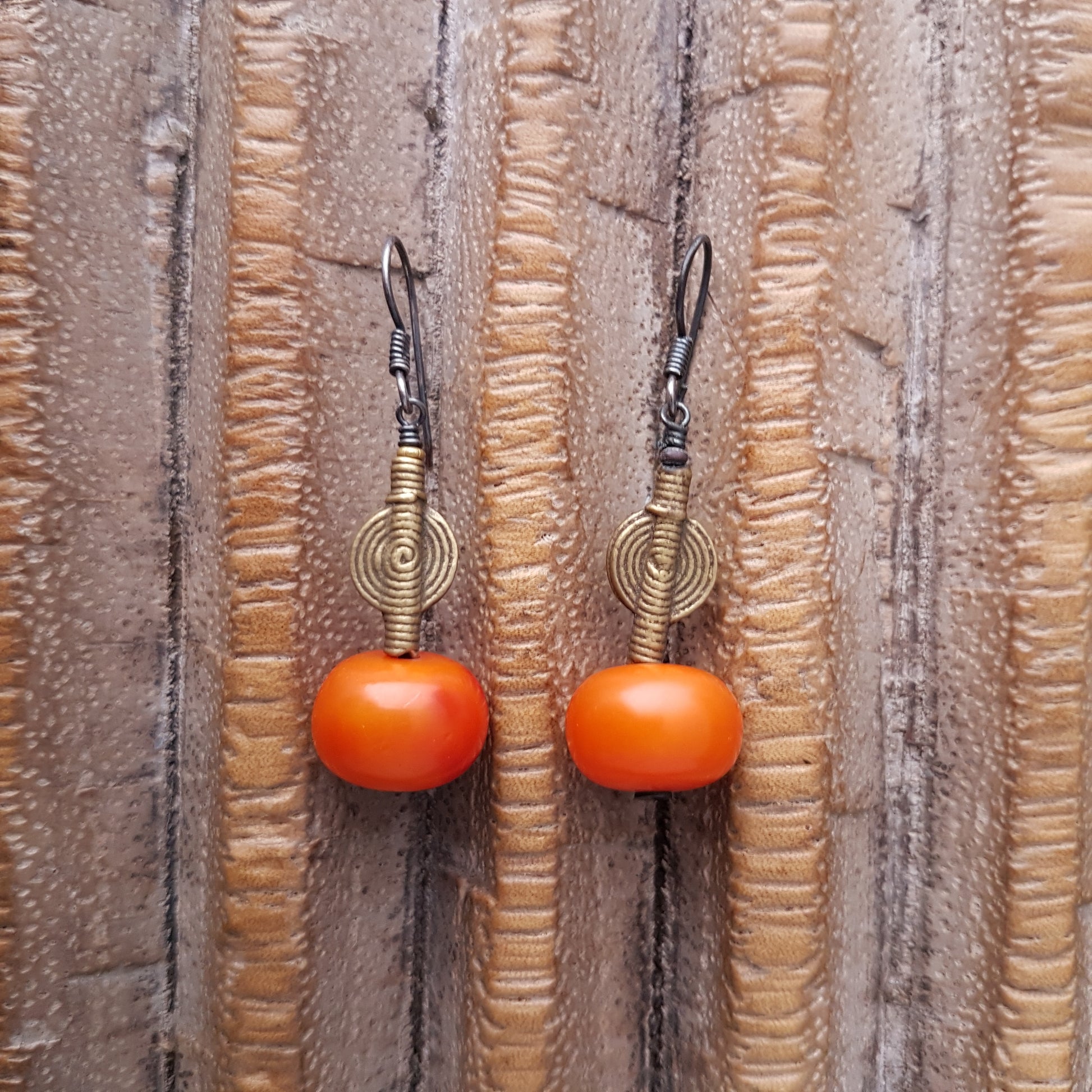 Handmade earrings with orange resin beads from Indonesia and African bronze beads on oxidized silver hooks by ambra Schmuck.