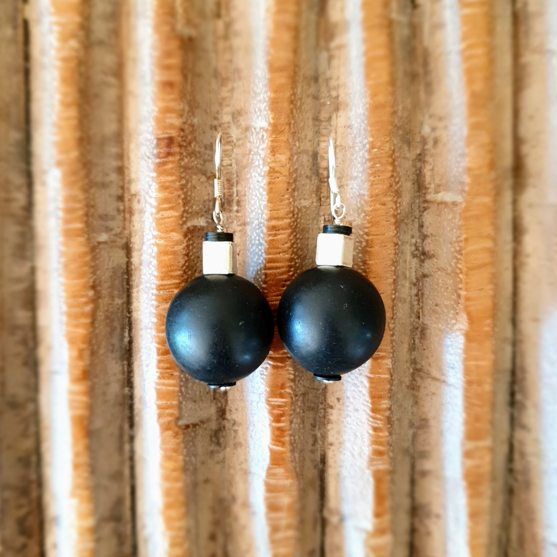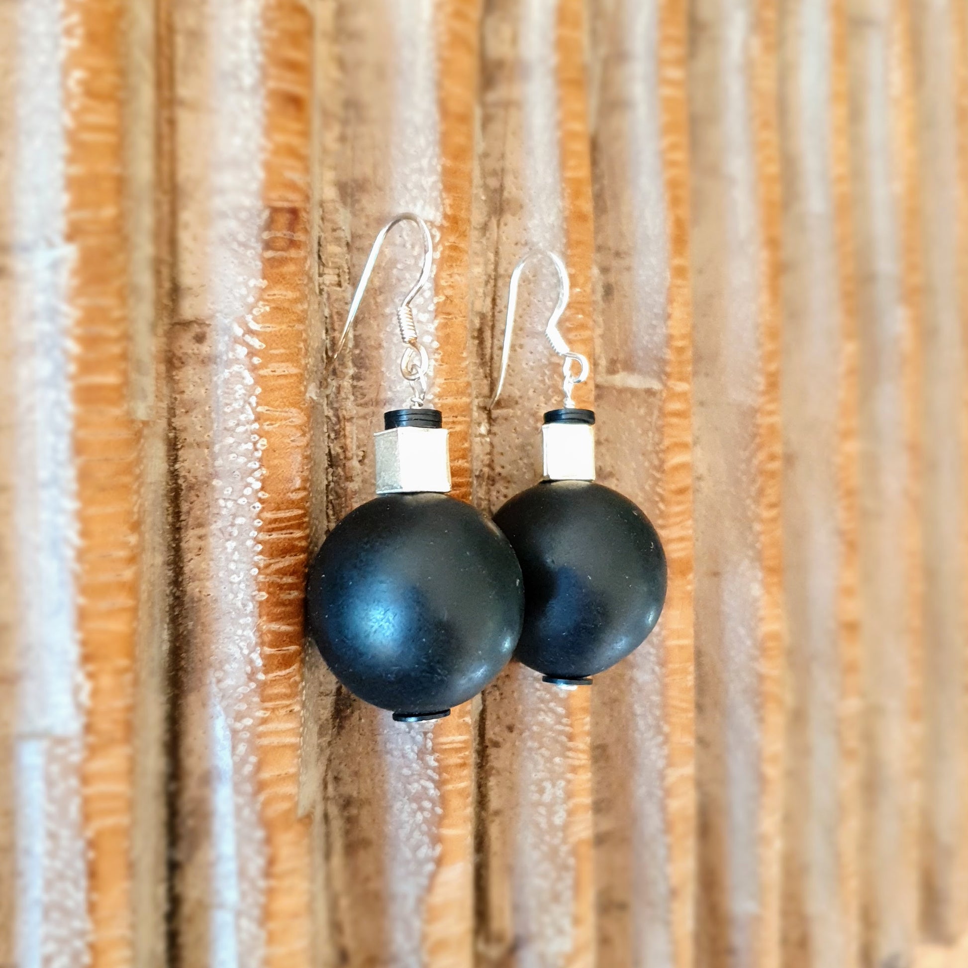 Round handmade earrings with black resin beads from Indonesia, Burmese silver cubes and black Bakelite discs from Africa on a silver hook by ambra Schmuck.