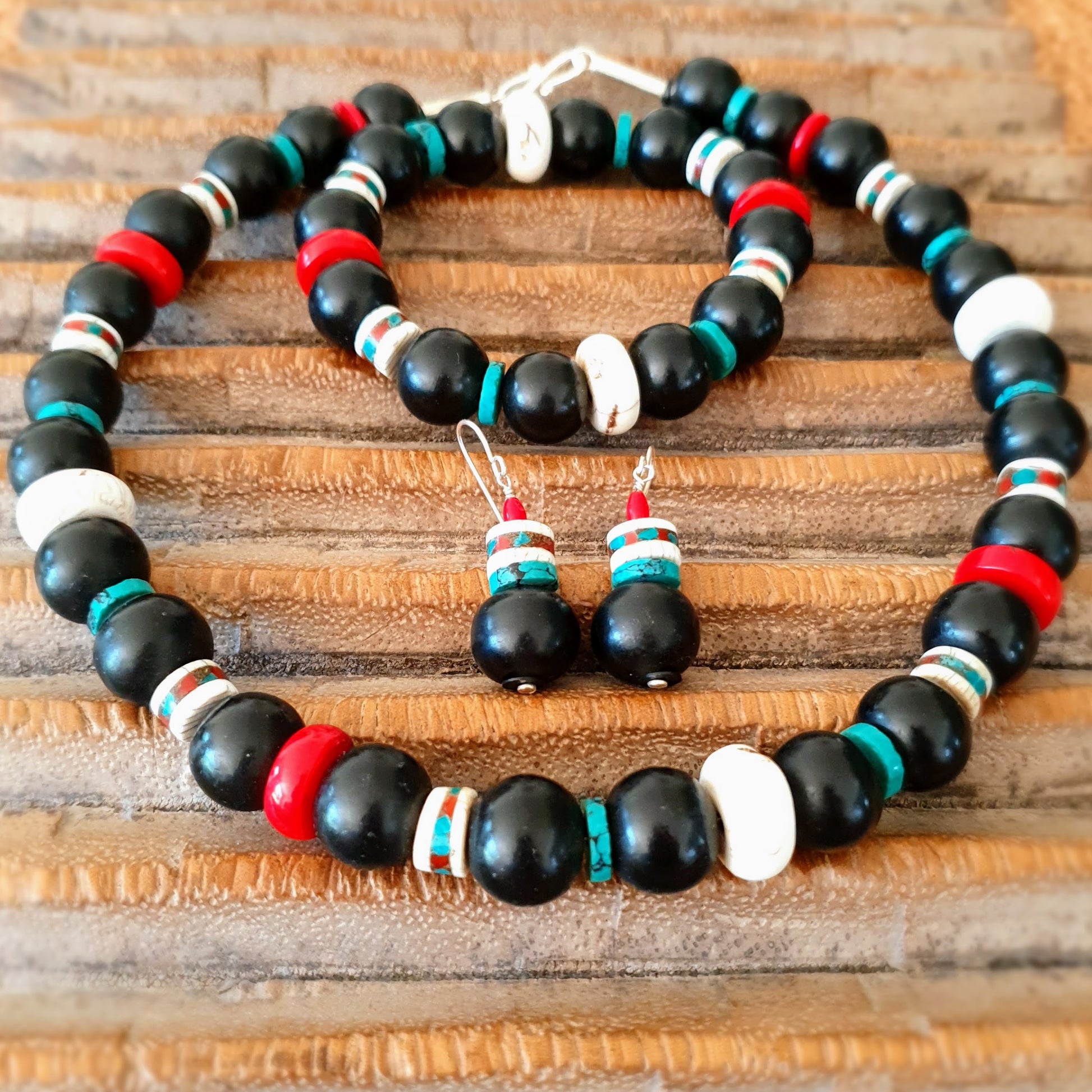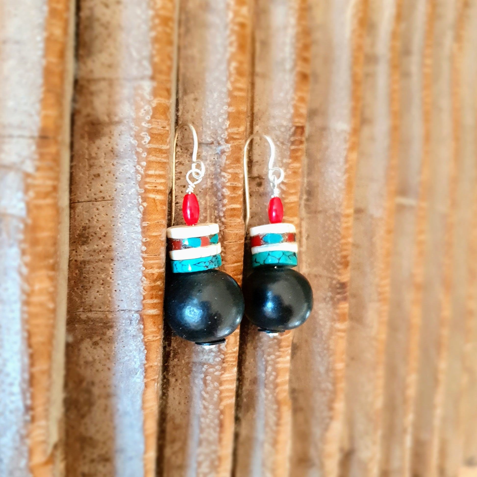 Handmade earrings with black resin beads from Indonesia, turquoise stones, corals and shells from Nepalese prayer malas on a silver hook by ambra Schmuck.
