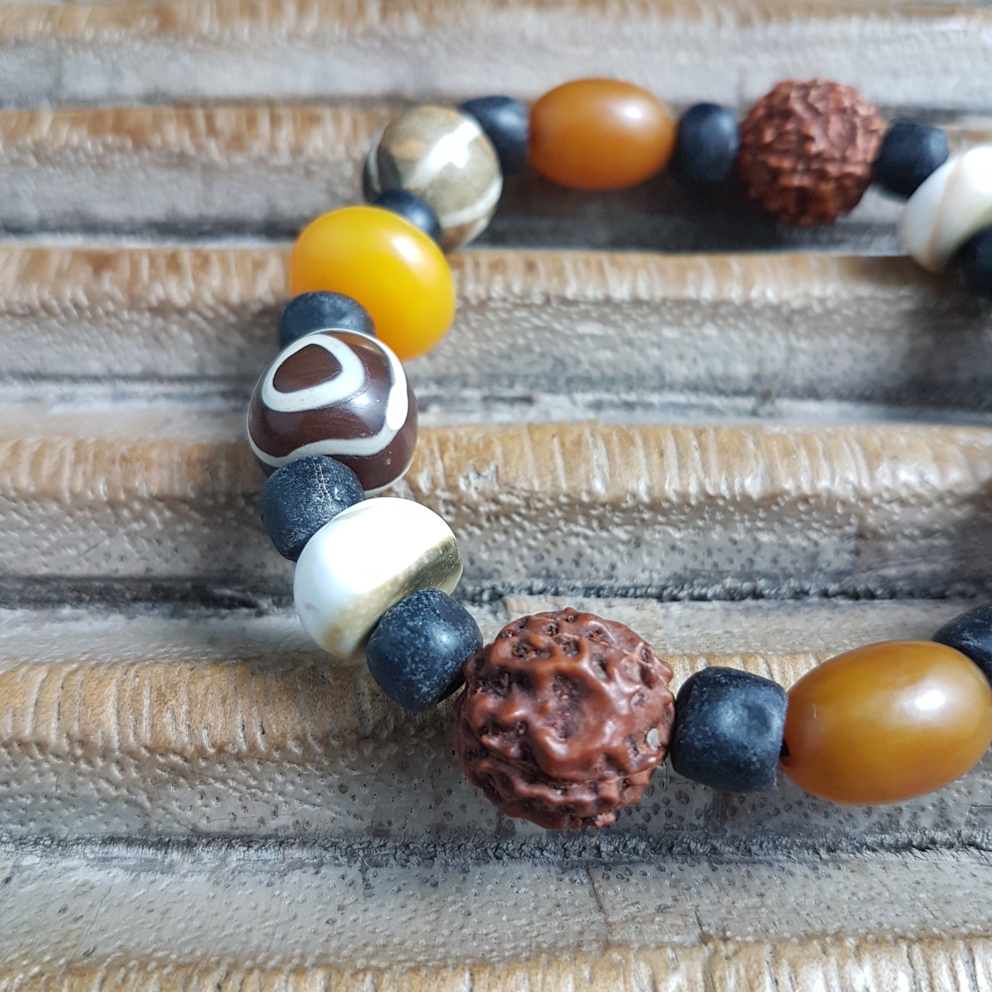 Handmade bracelet with brown Rudraksha seeds from Nepalese prayer malas, black Indonesian wrap glass beads, brown and yellow resin beads, white Shiva shells and striped petrified wood beads from Burma on elastic band by ambra Schmuck.
