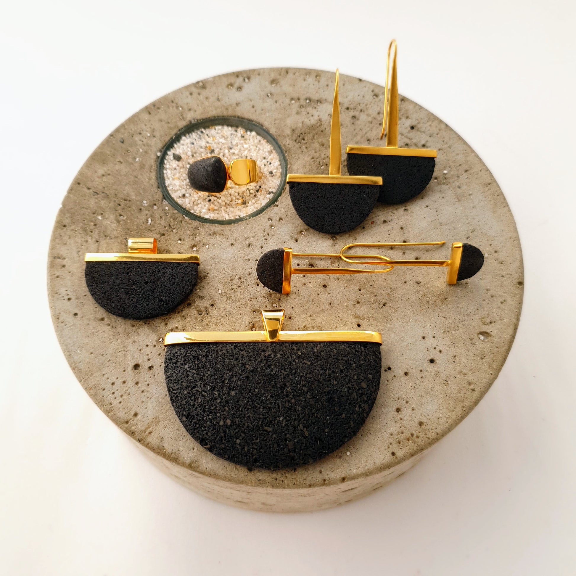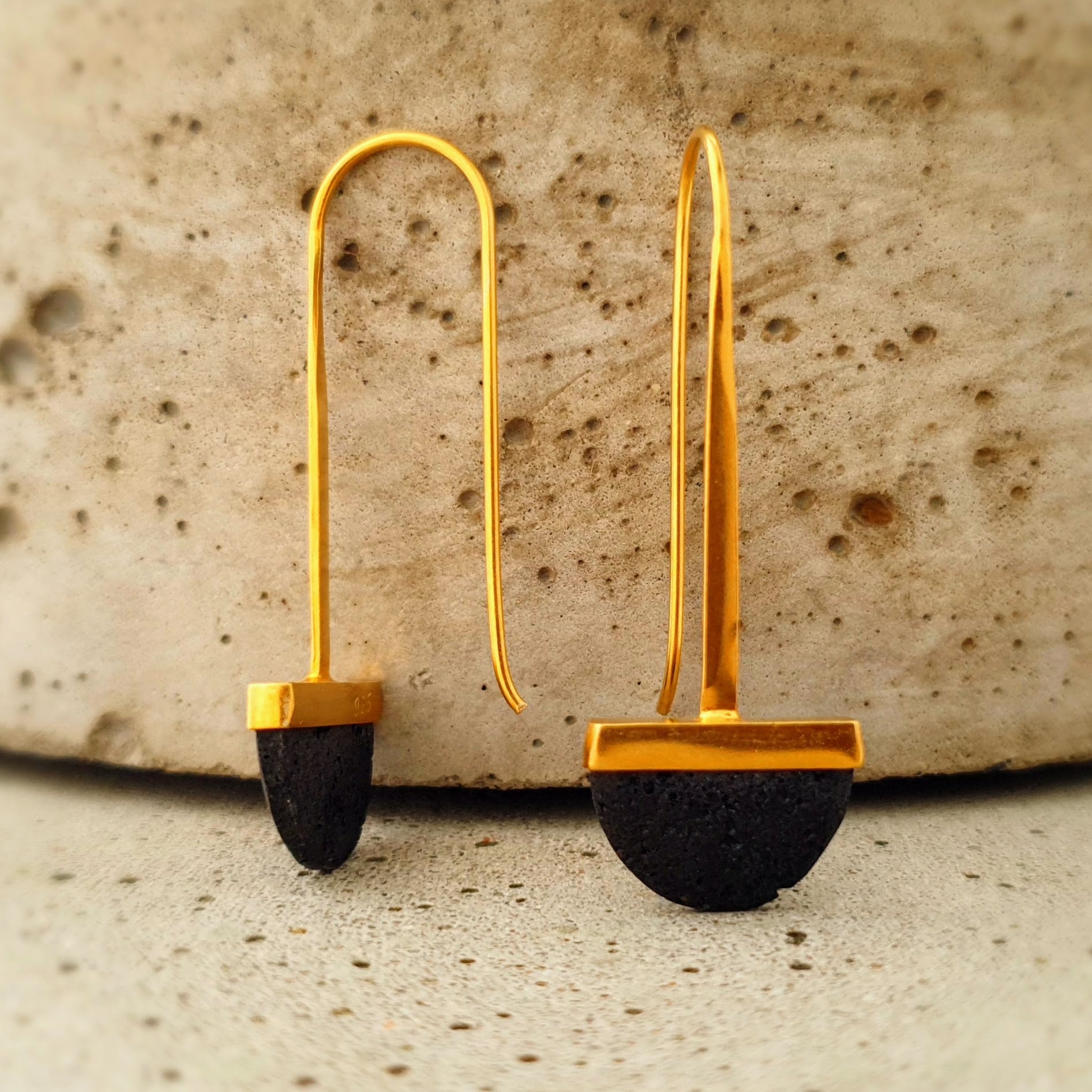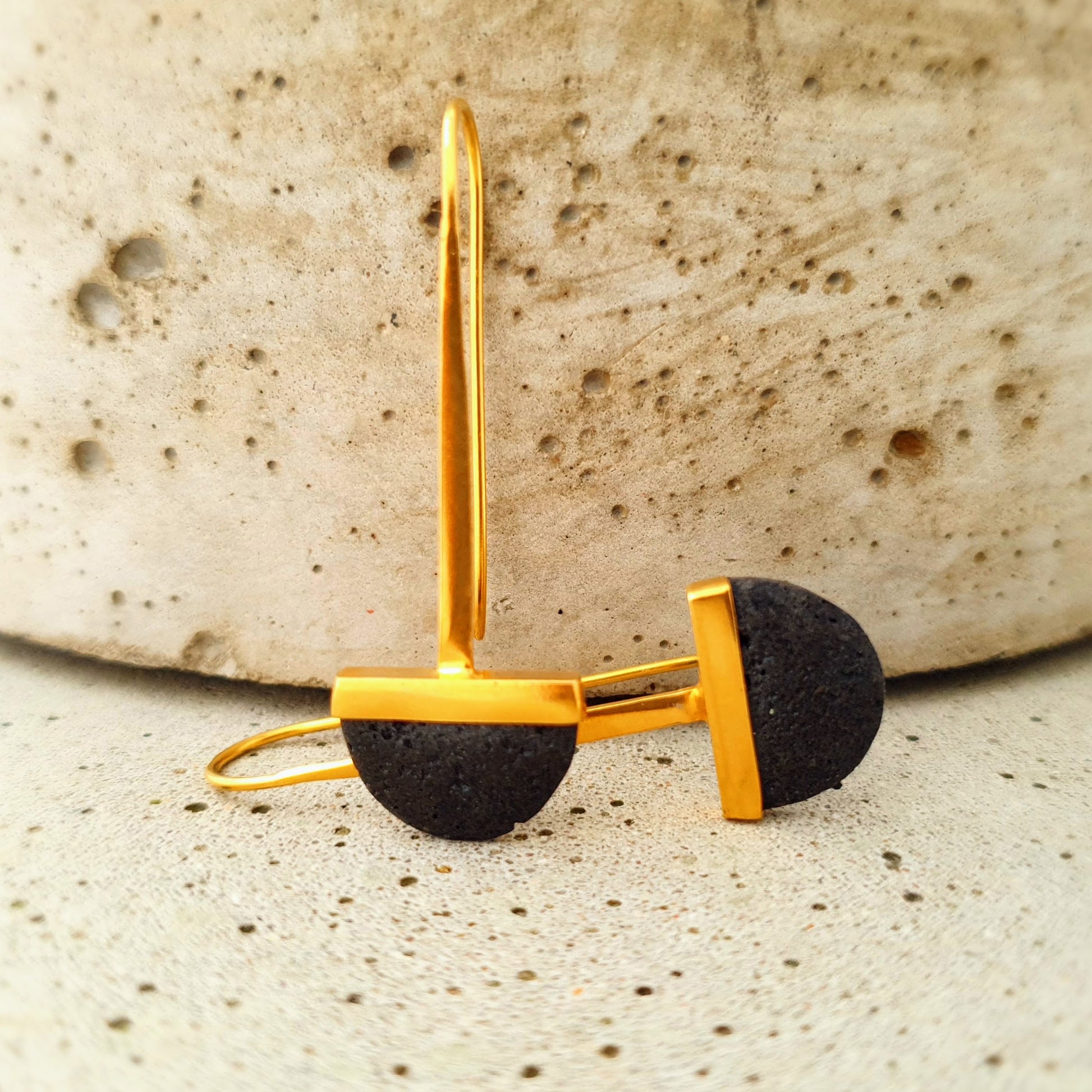 Small long semicircular earrings made of gold-plated sterling silver with black lava stone.