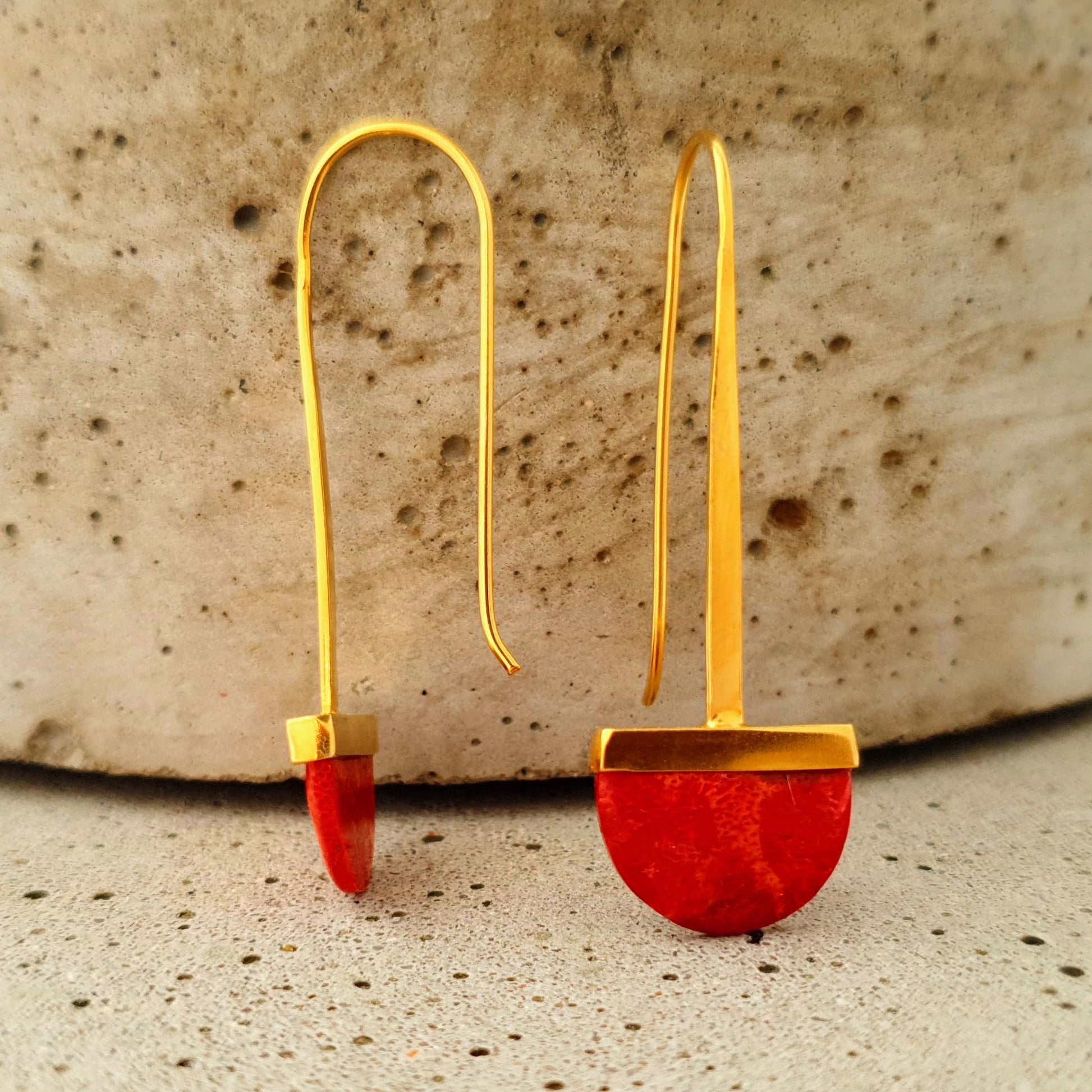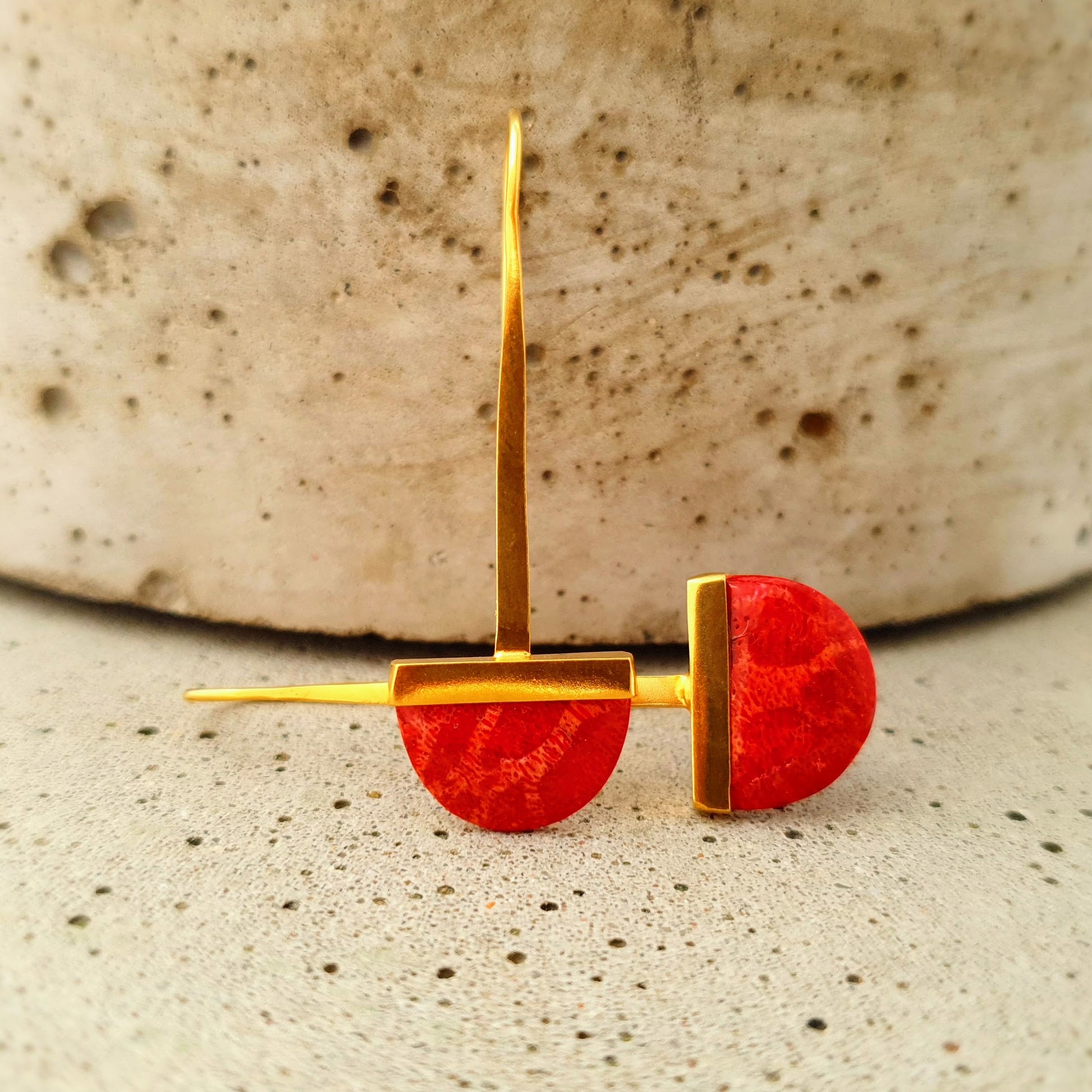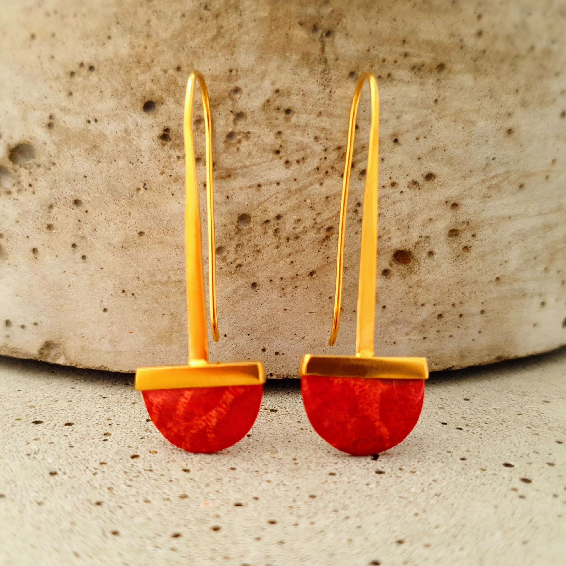 Small long semicircular earrings made of gold-plated sterling silver with red foam coral.