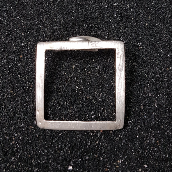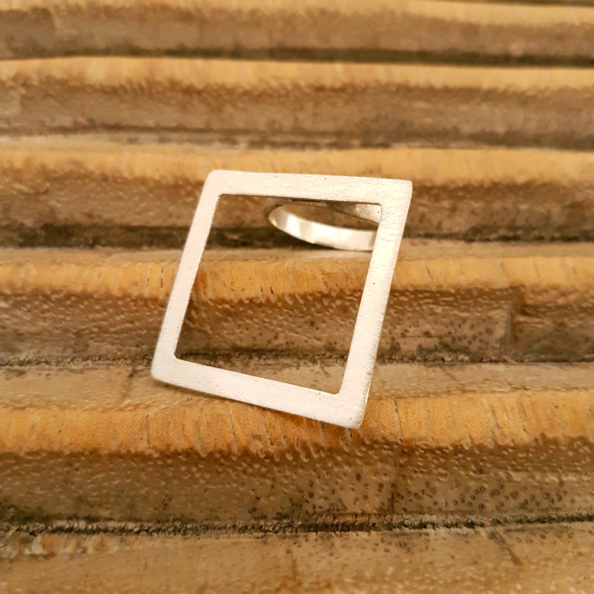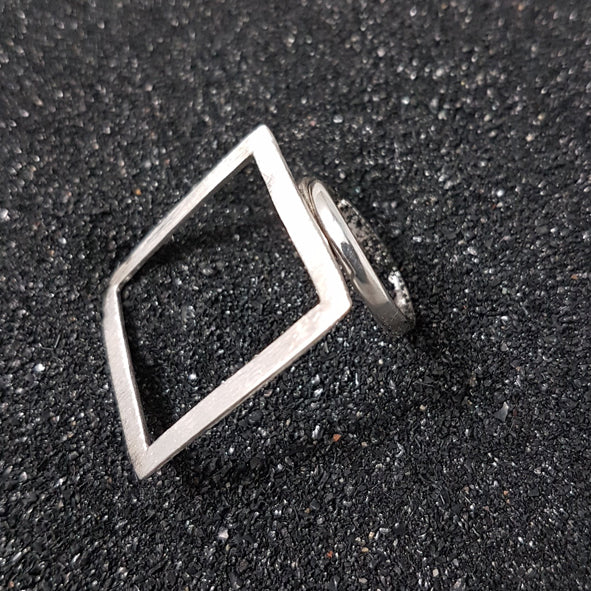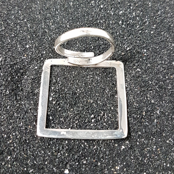 Geometric square ring made of matted 925 sterling silver and size-adjustable ring band.