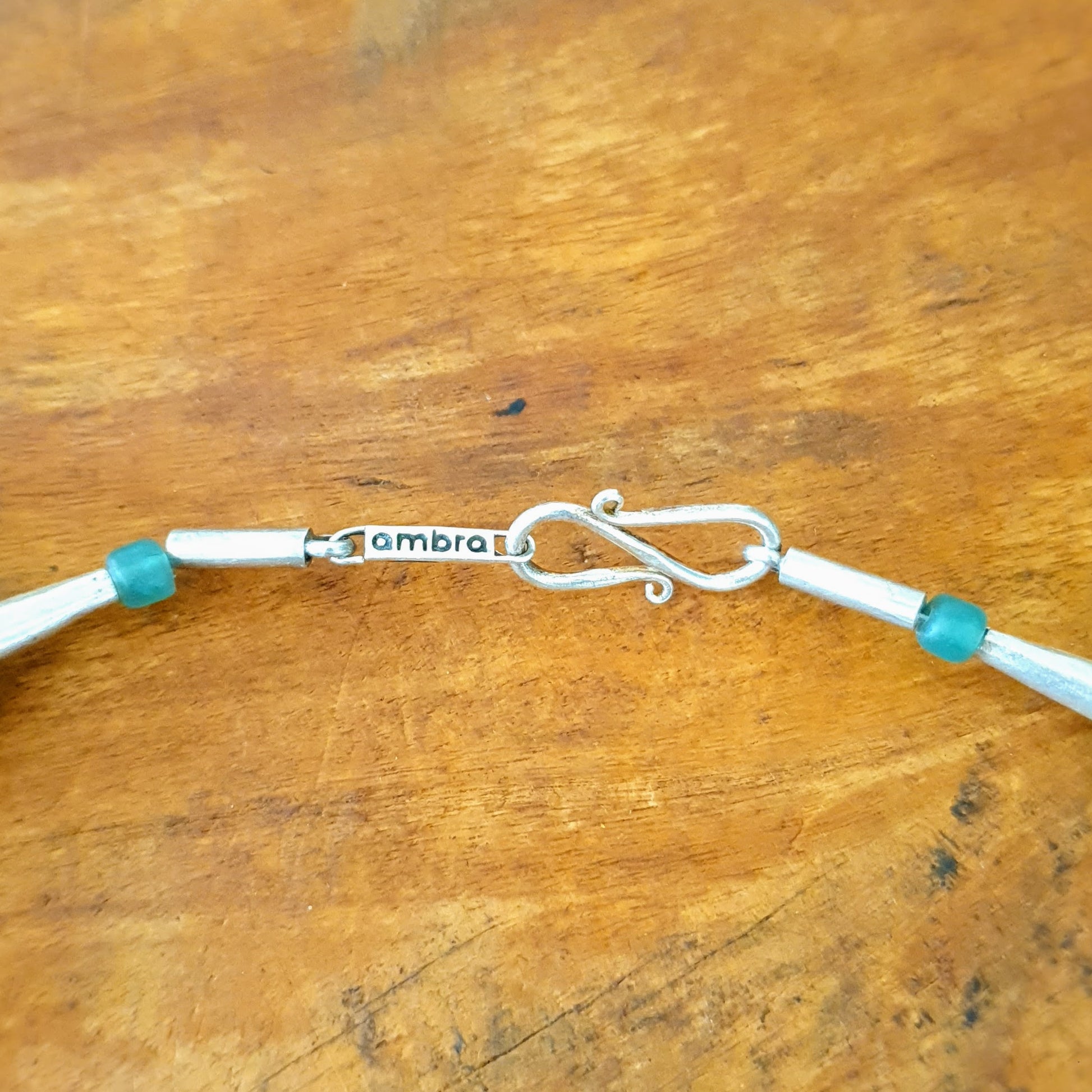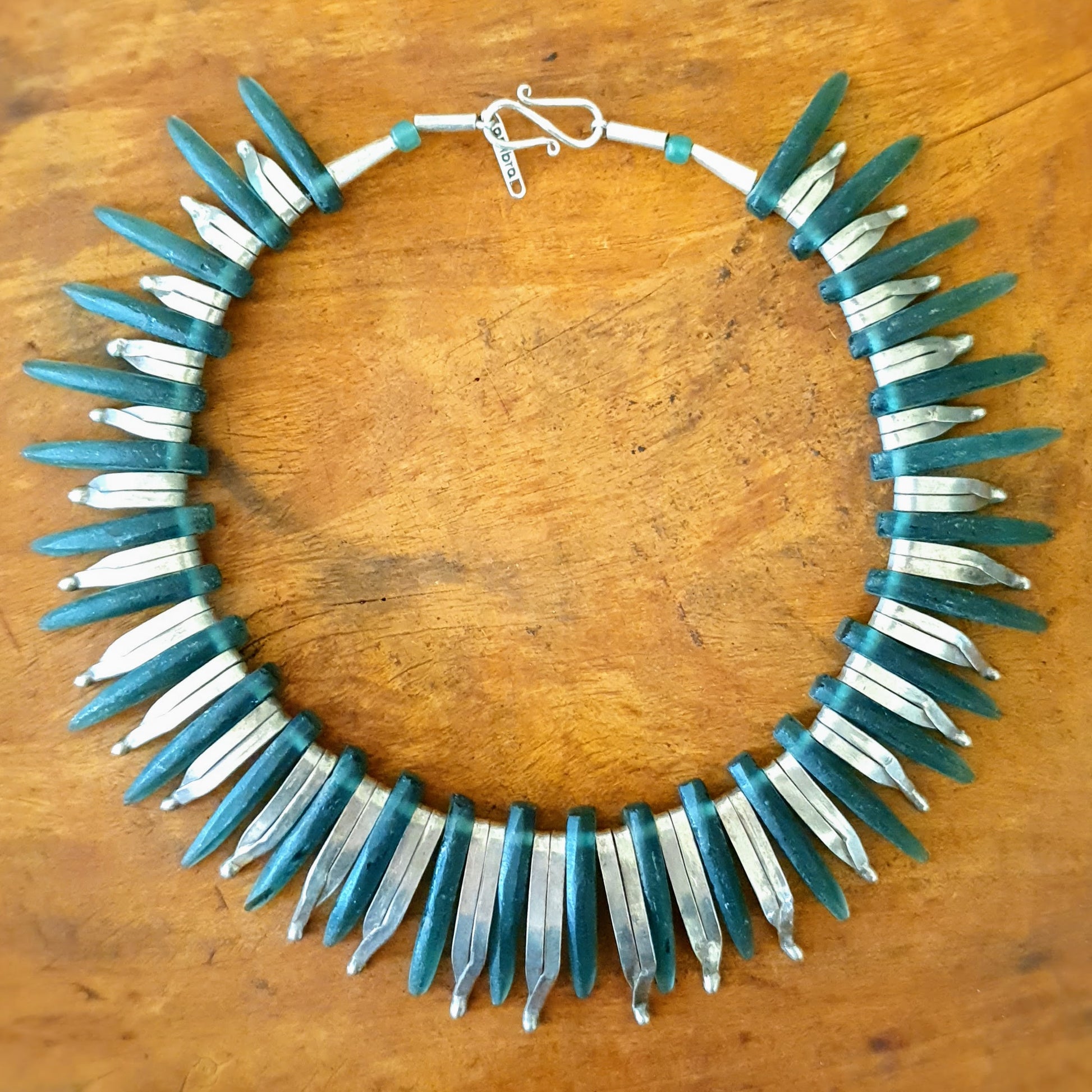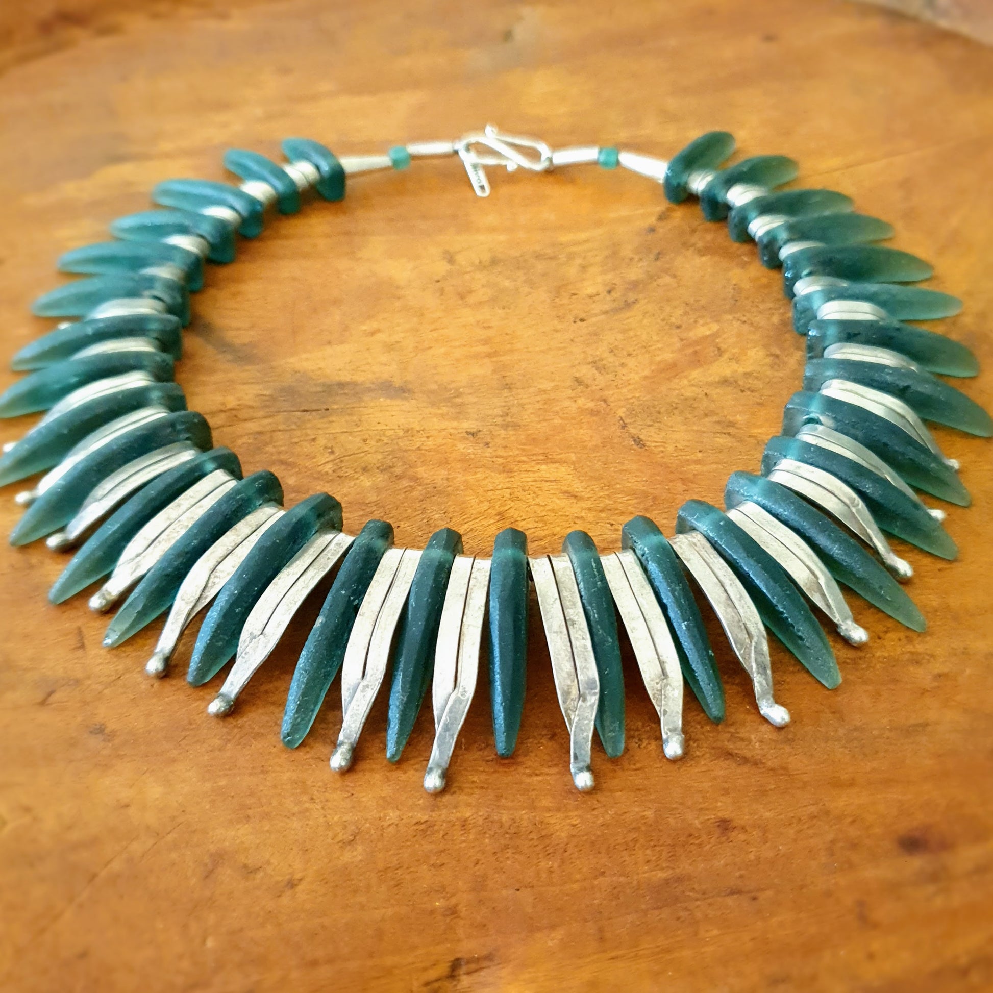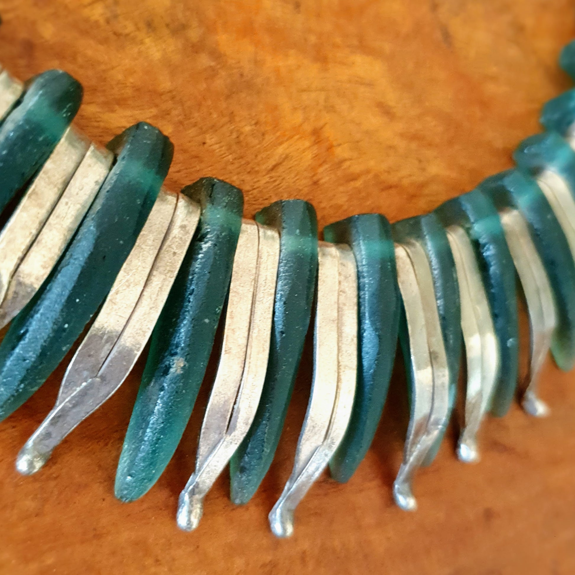 Expressive handcrafted unique necklace with green matt recycled glass elements from the island of Java and hammered Burmese silver elements with silver clasp by ambra Schmuck.