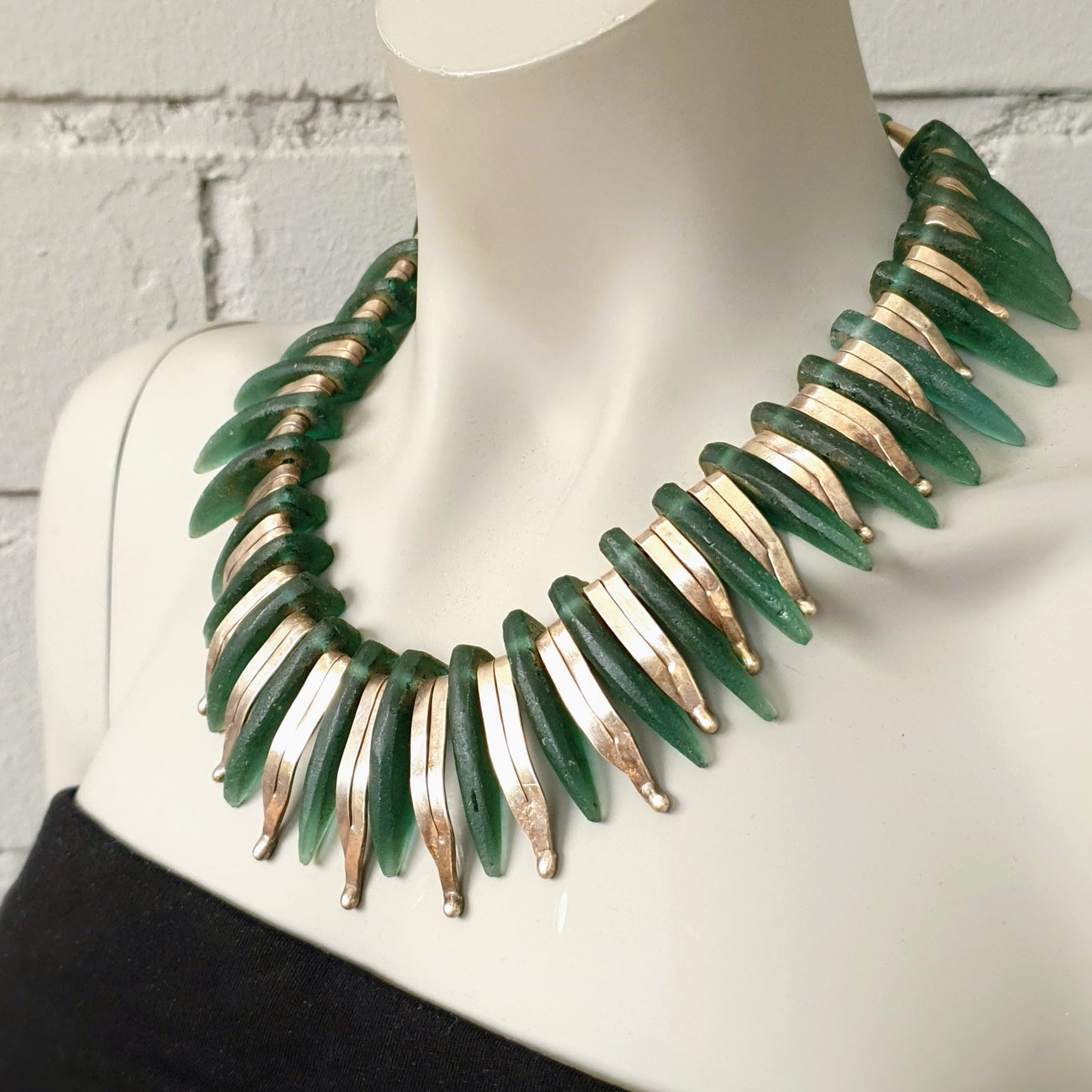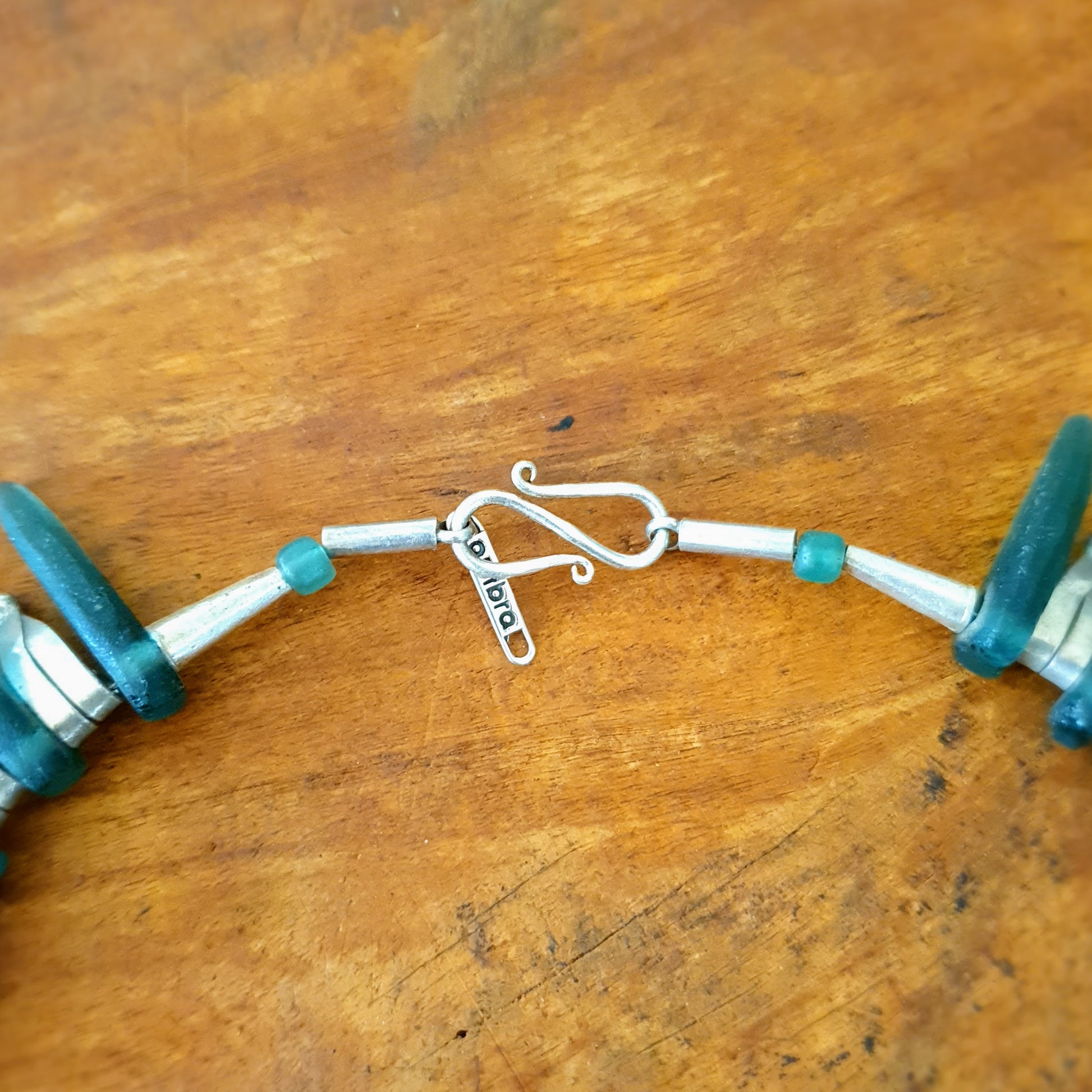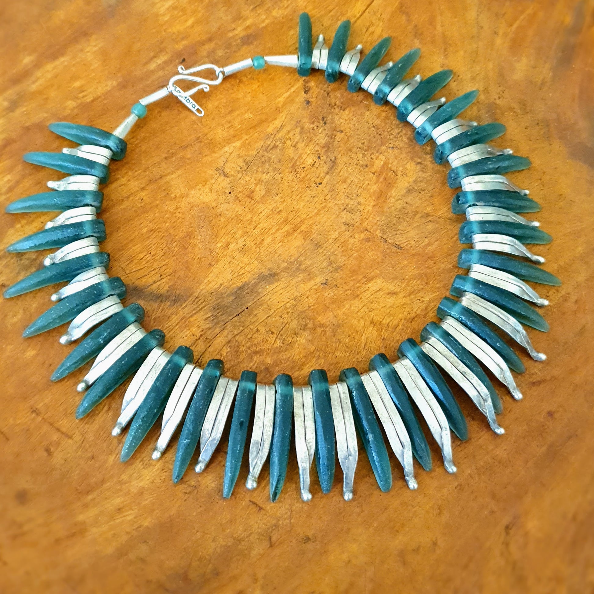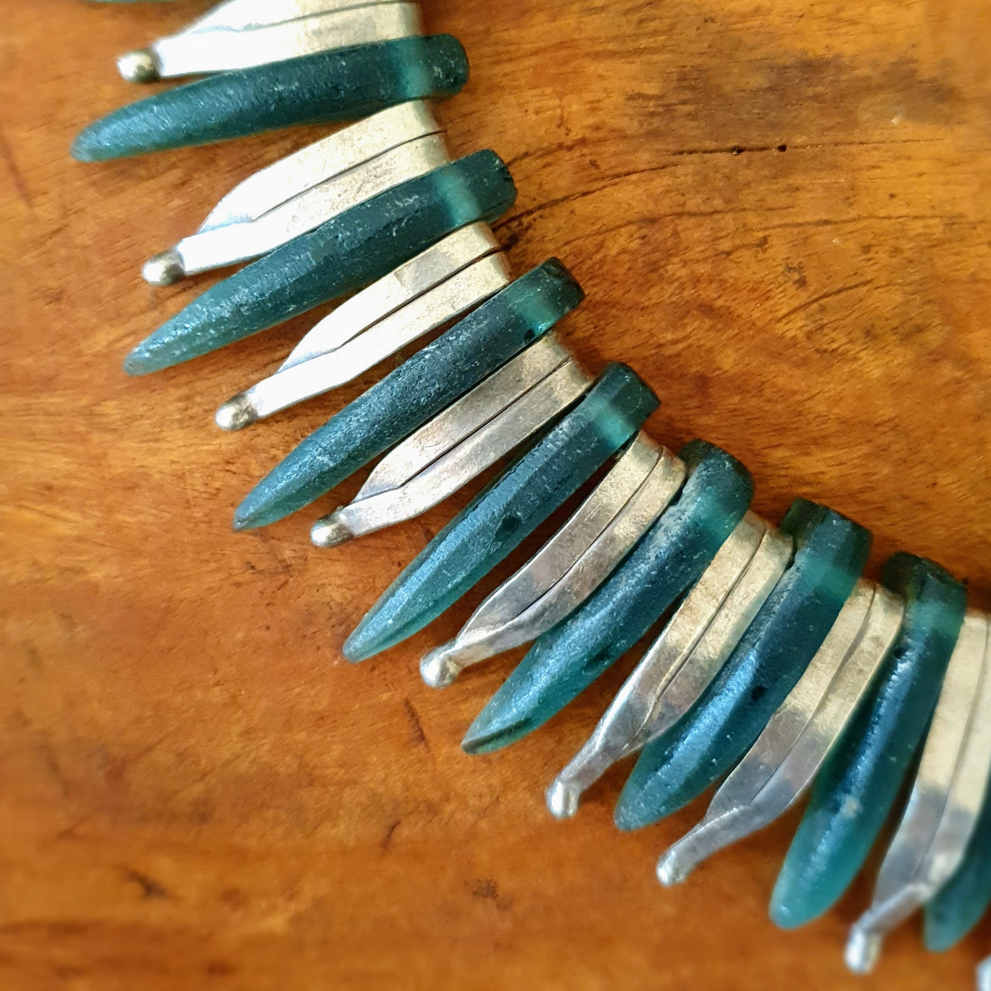 Expressive handcrafted unique necklace with green matt recycled glass elements from the island of Java and hammered Burmese silver elements with silver clasp by ambra Schmuck.