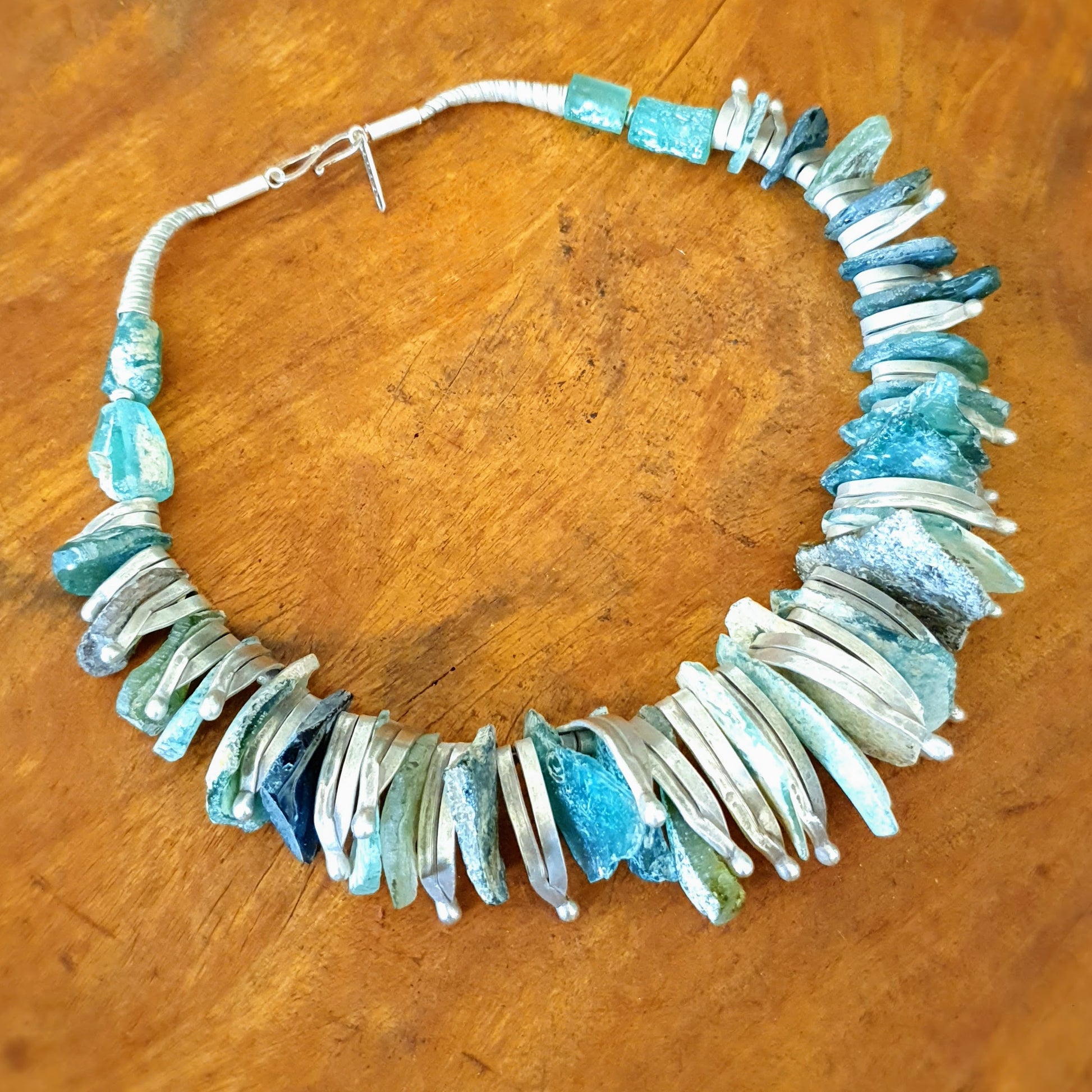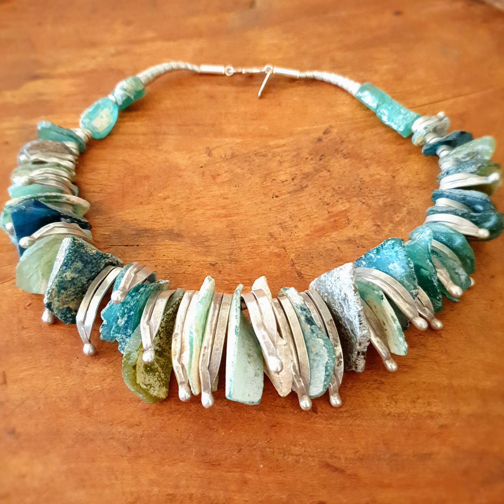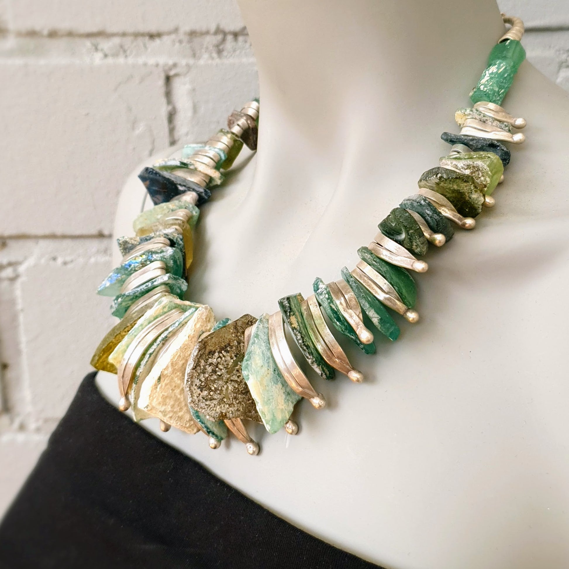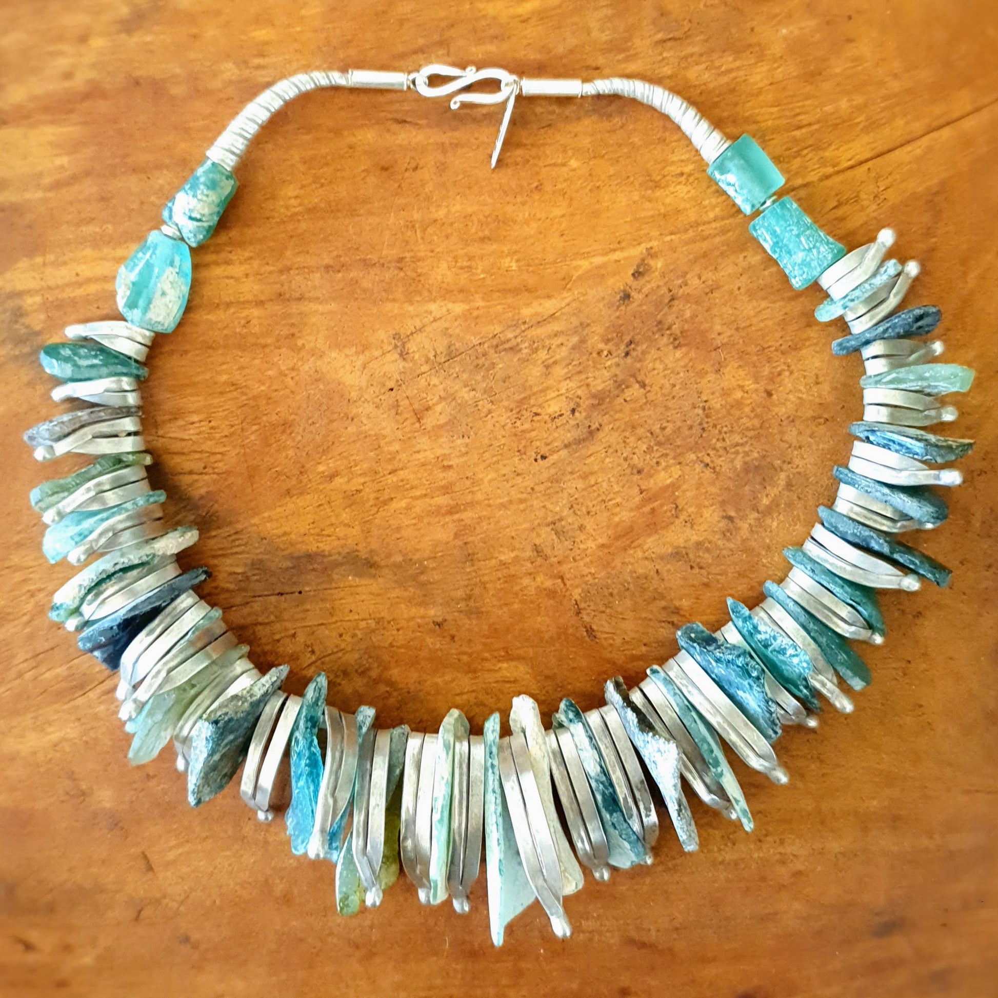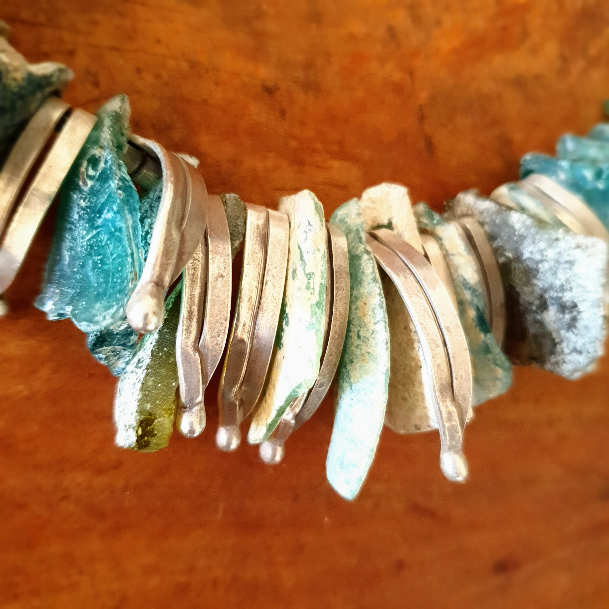 Expressive handcrafted unique necklace with green-blue shimmering Roman glass from Afghanistan and hammered Burmese silver elements with silver clasp by ambra Schmuck.
