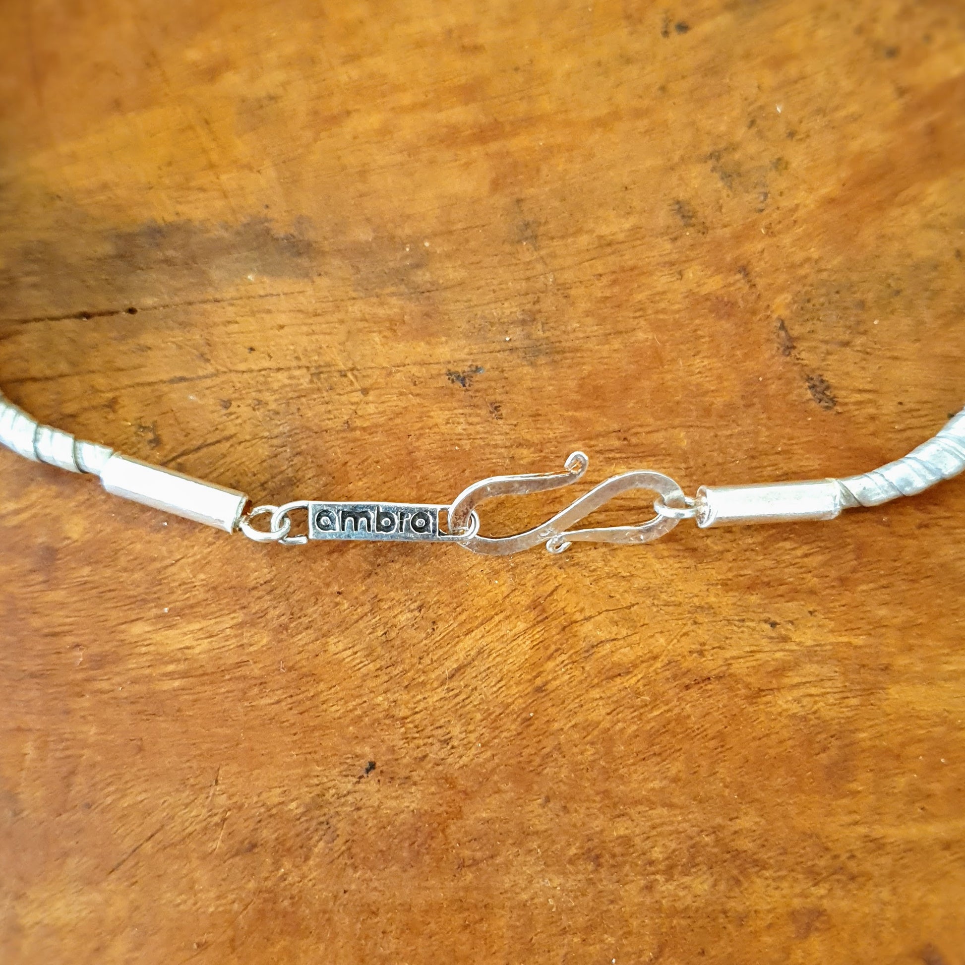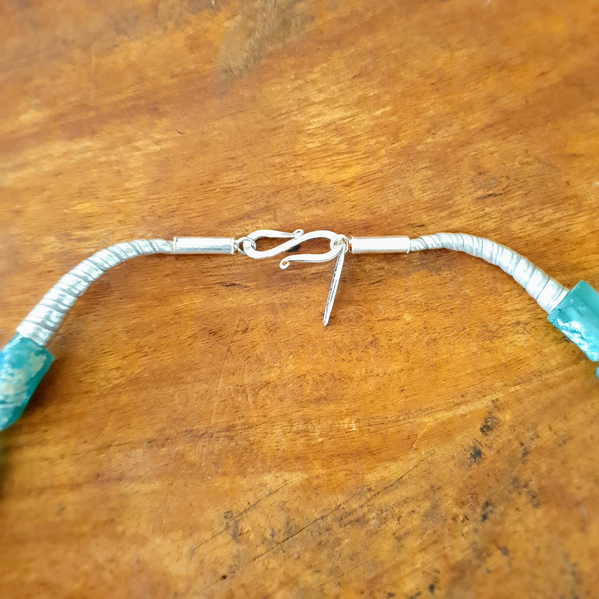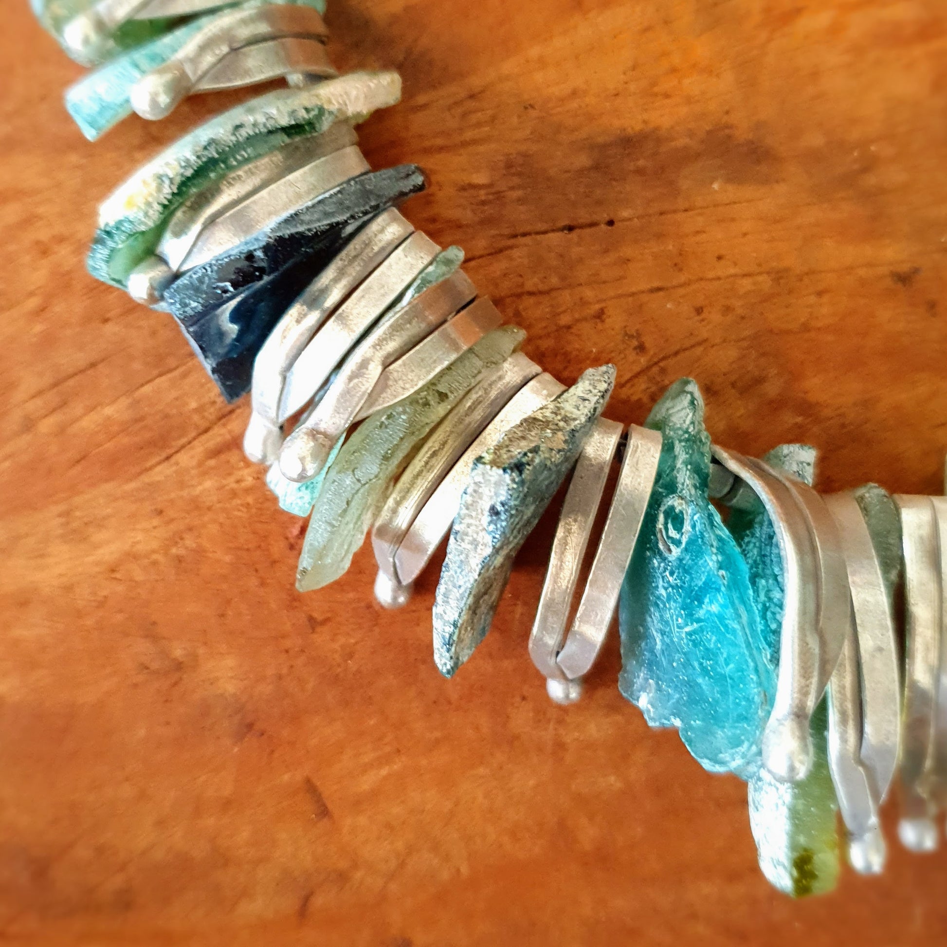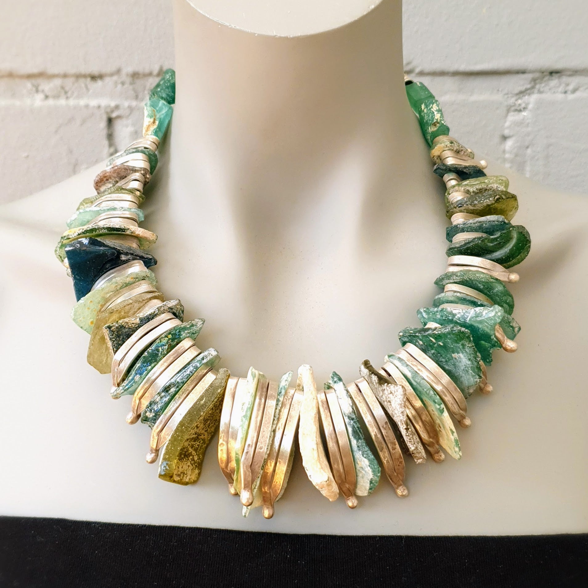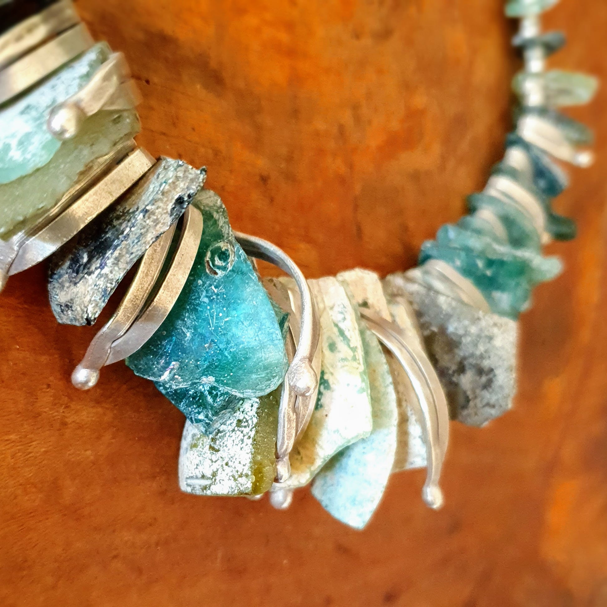 Expressive handcrafted unique necklace with green-blue shimmering Roman glass from Afghanistan and hammered Burmese silver elements with silver clasp by ambra Schmuck.