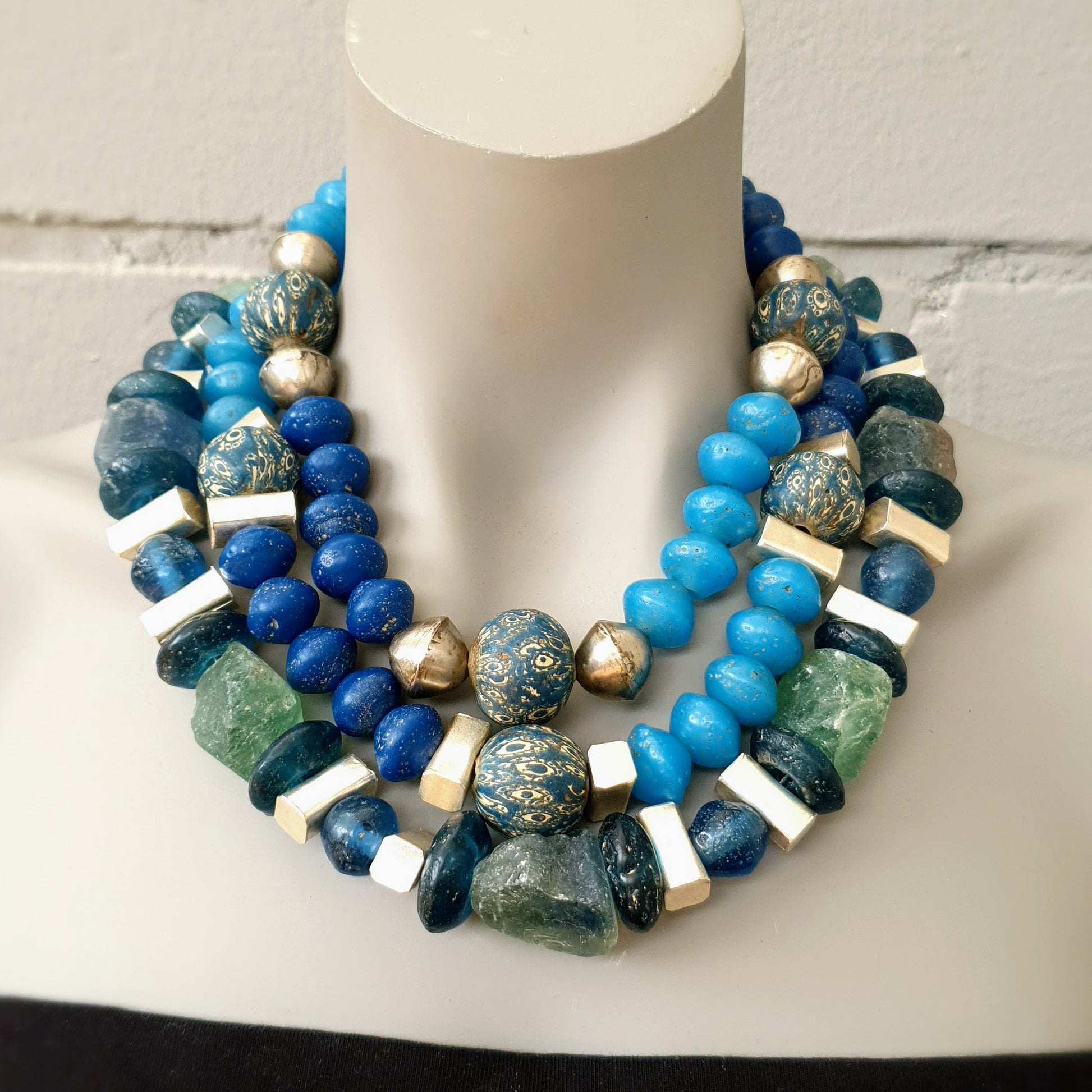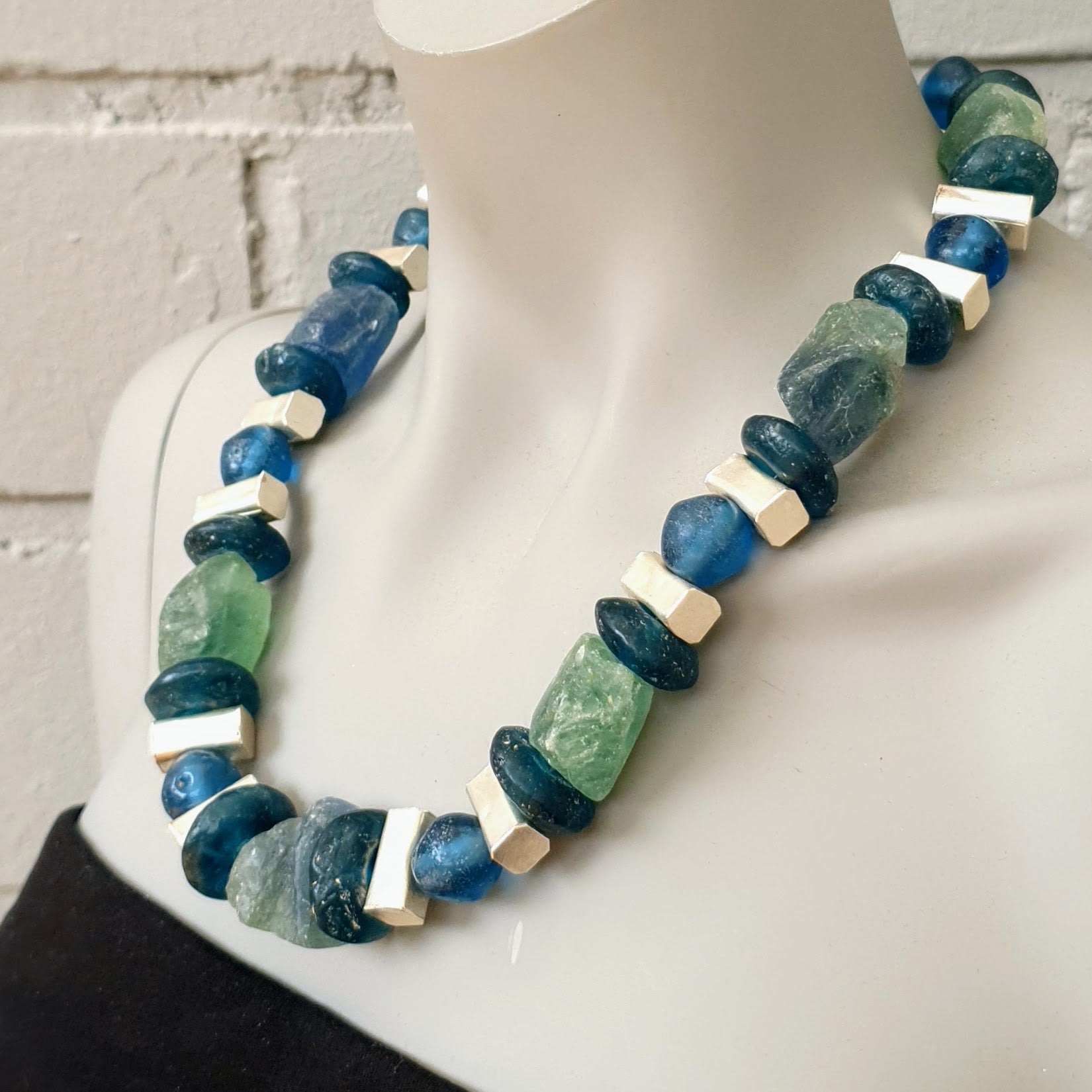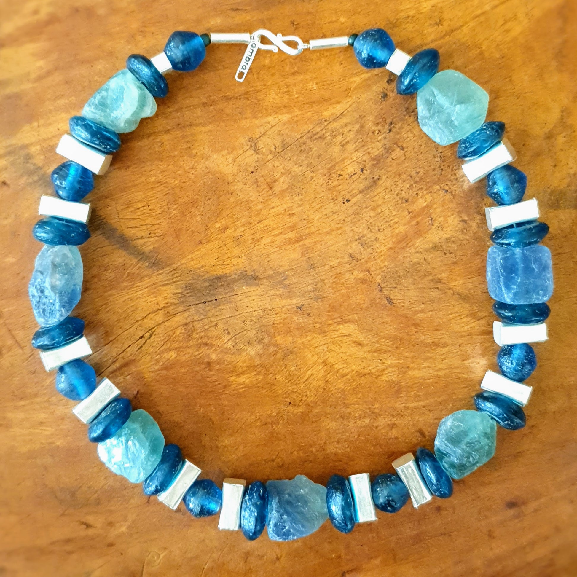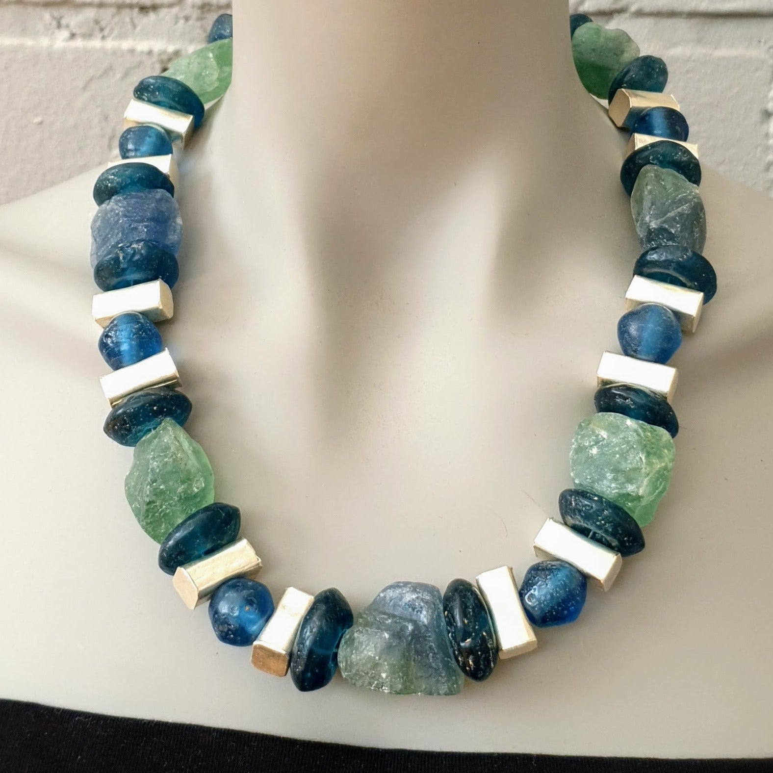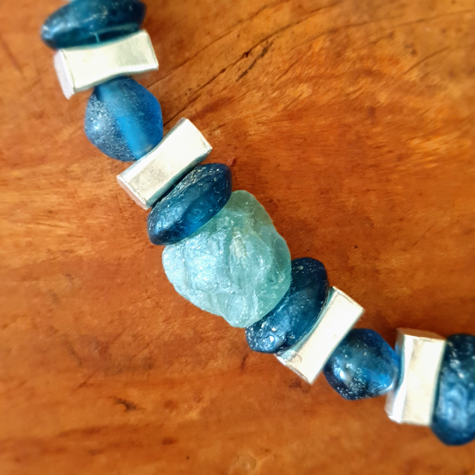 Large handcrafted unique necklace with coarse aventurine chunks in green and blue tones, blue glass beads from the island of Java and Africa and hammered Burmese silver elements with silver clasp by ambra Schmuck.