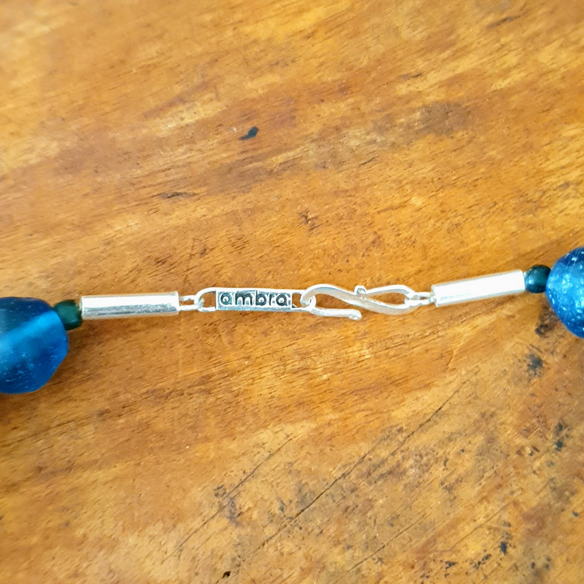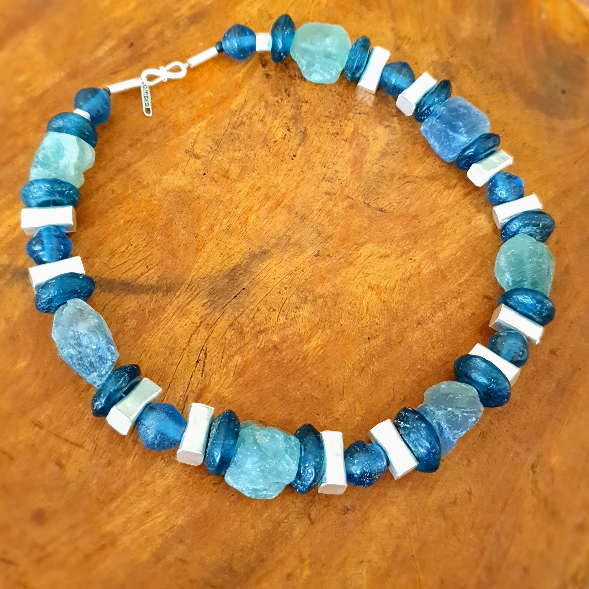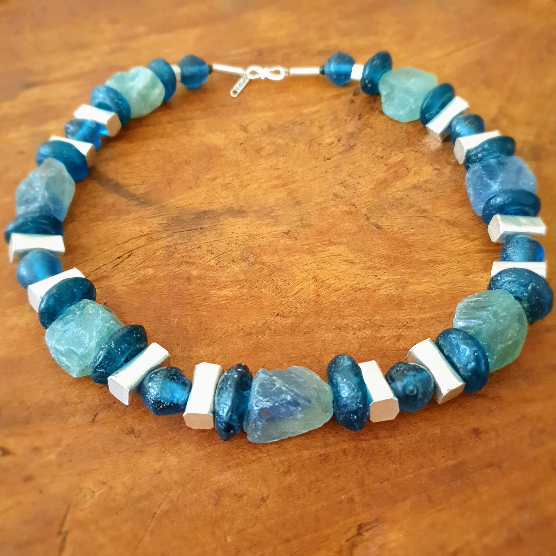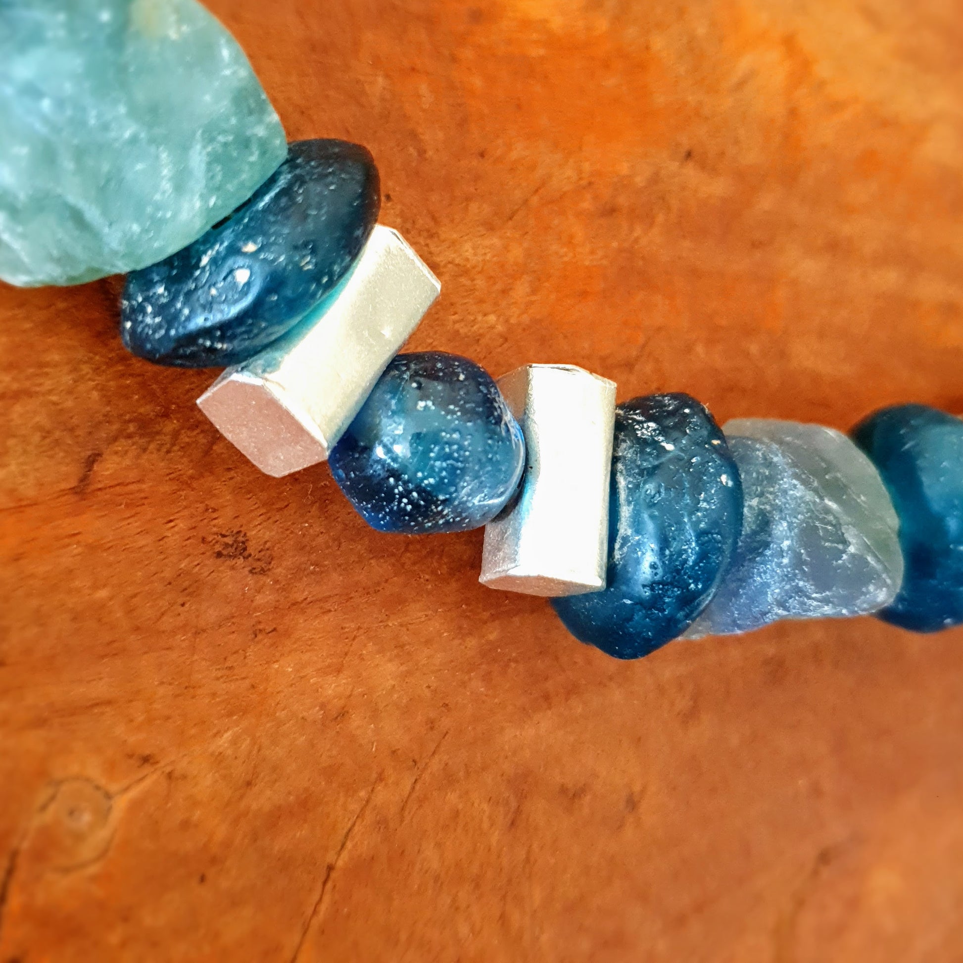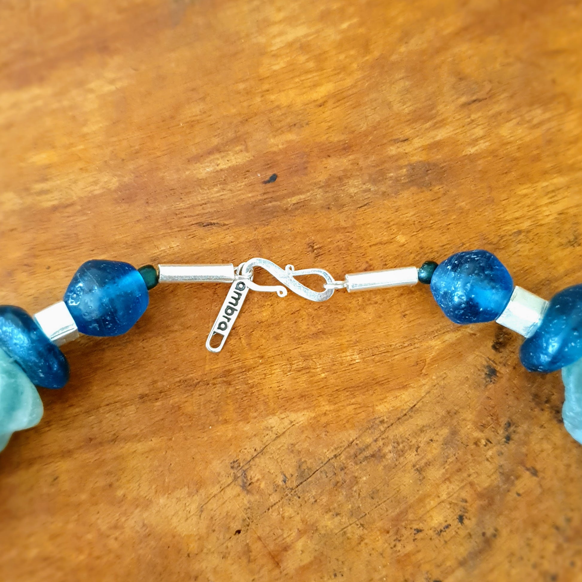 Large handcrafted unique necklace with coarse aventurine chunks in green and blue tones, blue glass beads from the island of Java and Africa and hammered Burmese silver elements with silver clasp by ambra Schmuck.