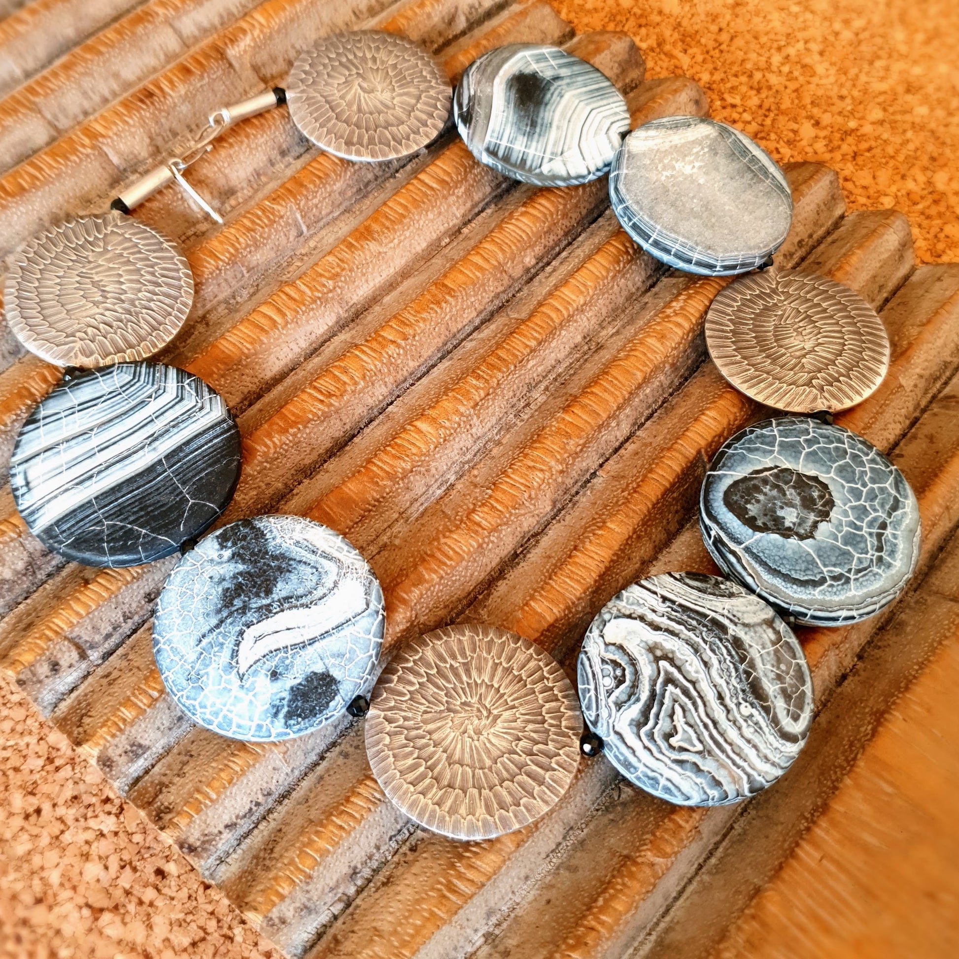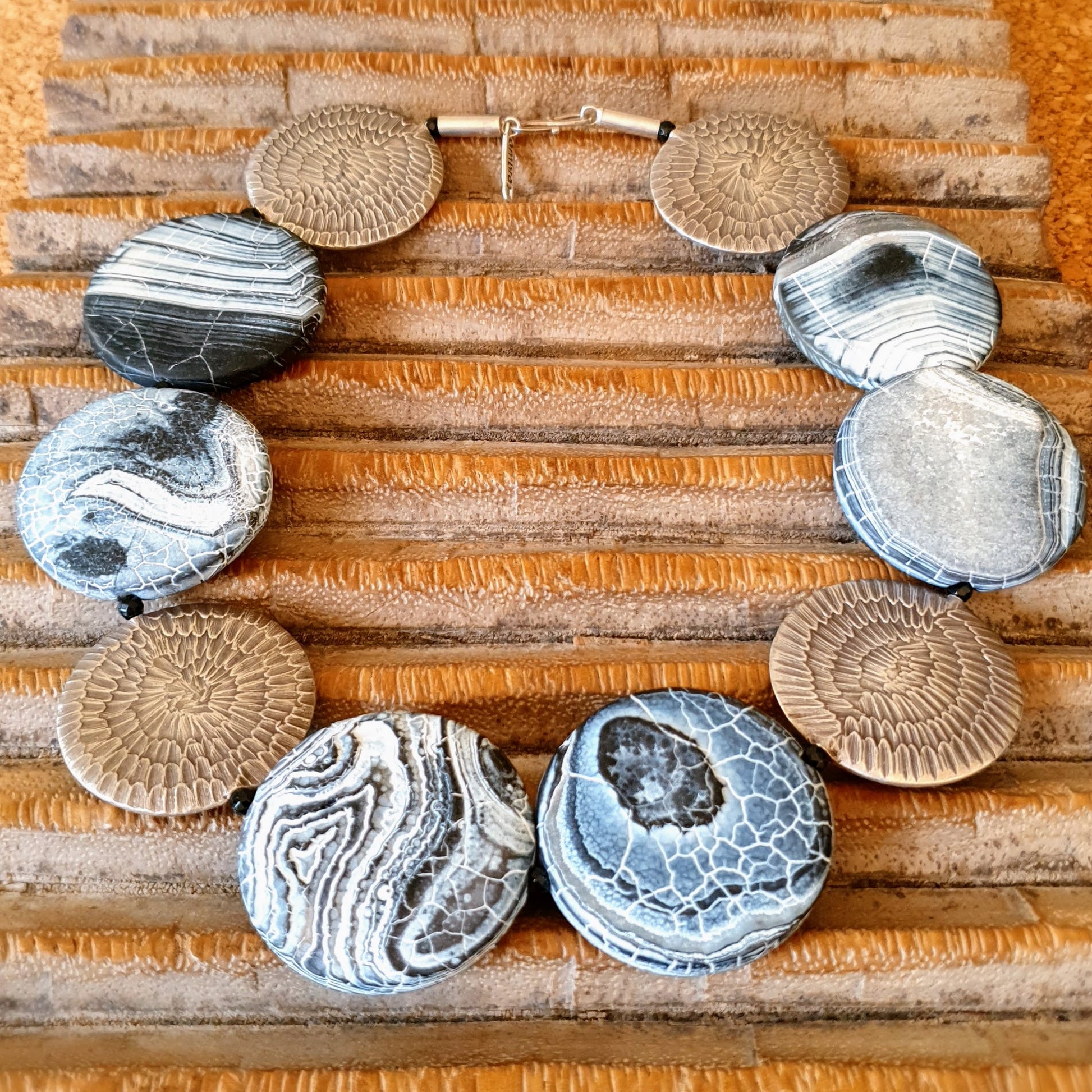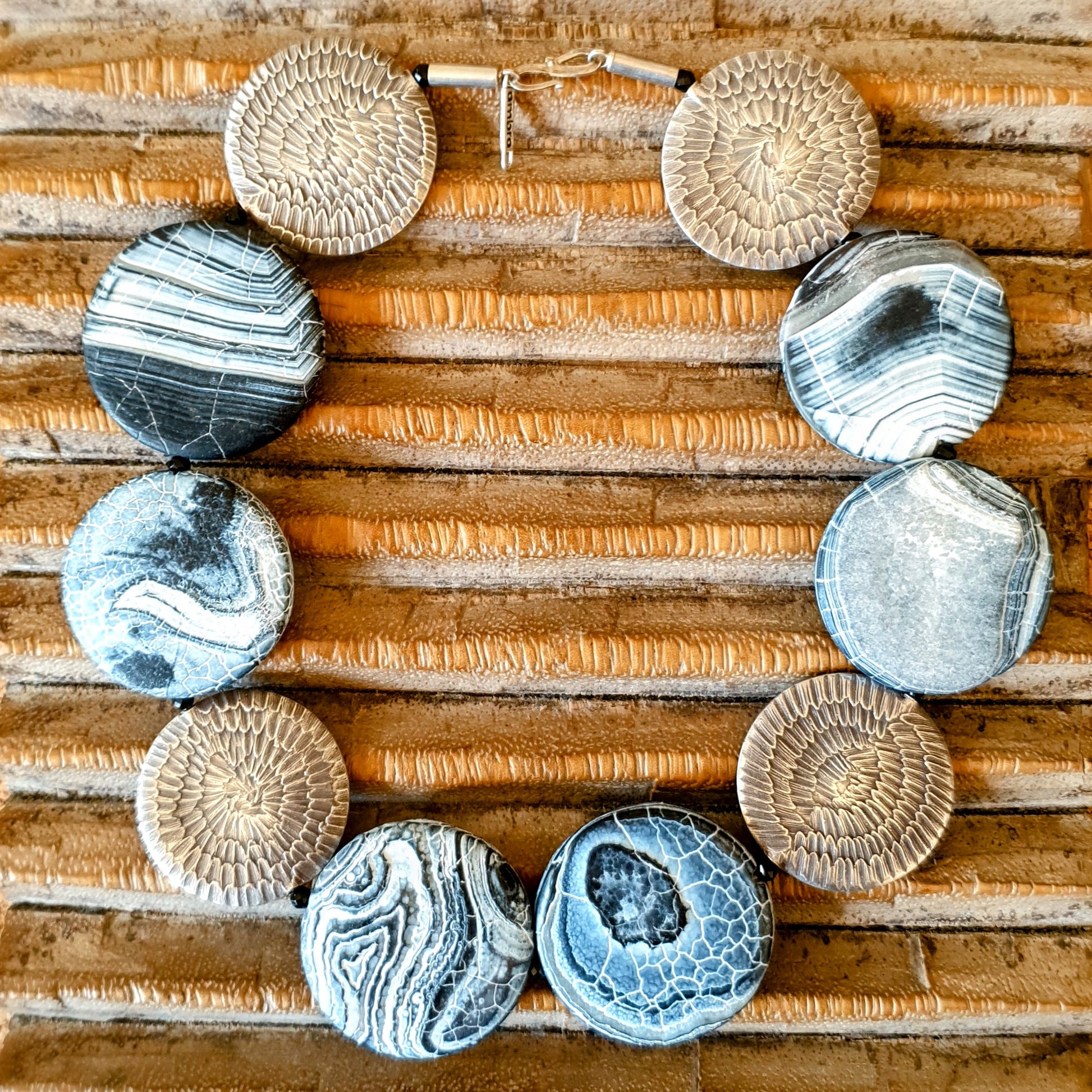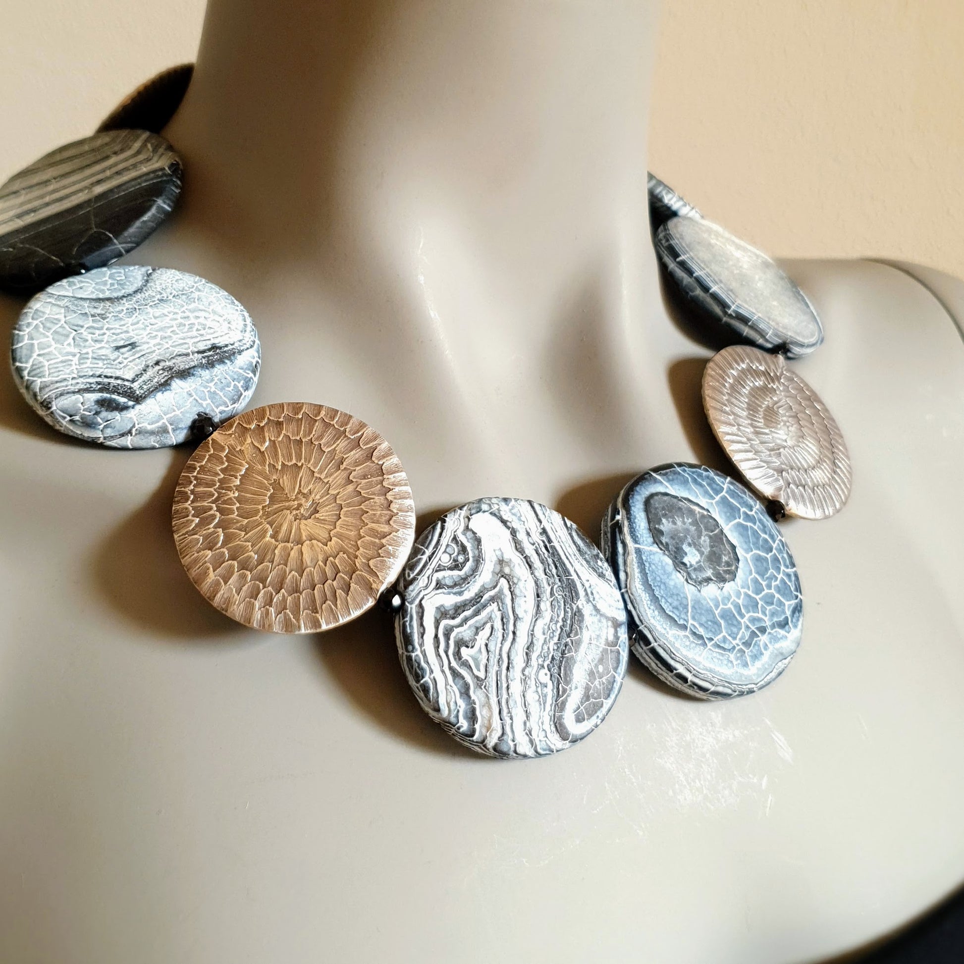 Large handmade unique necklace with etched agate stones, hammered silver discs from Burma and small faceted onyx stones with silver clasp by ambra Schmuck.