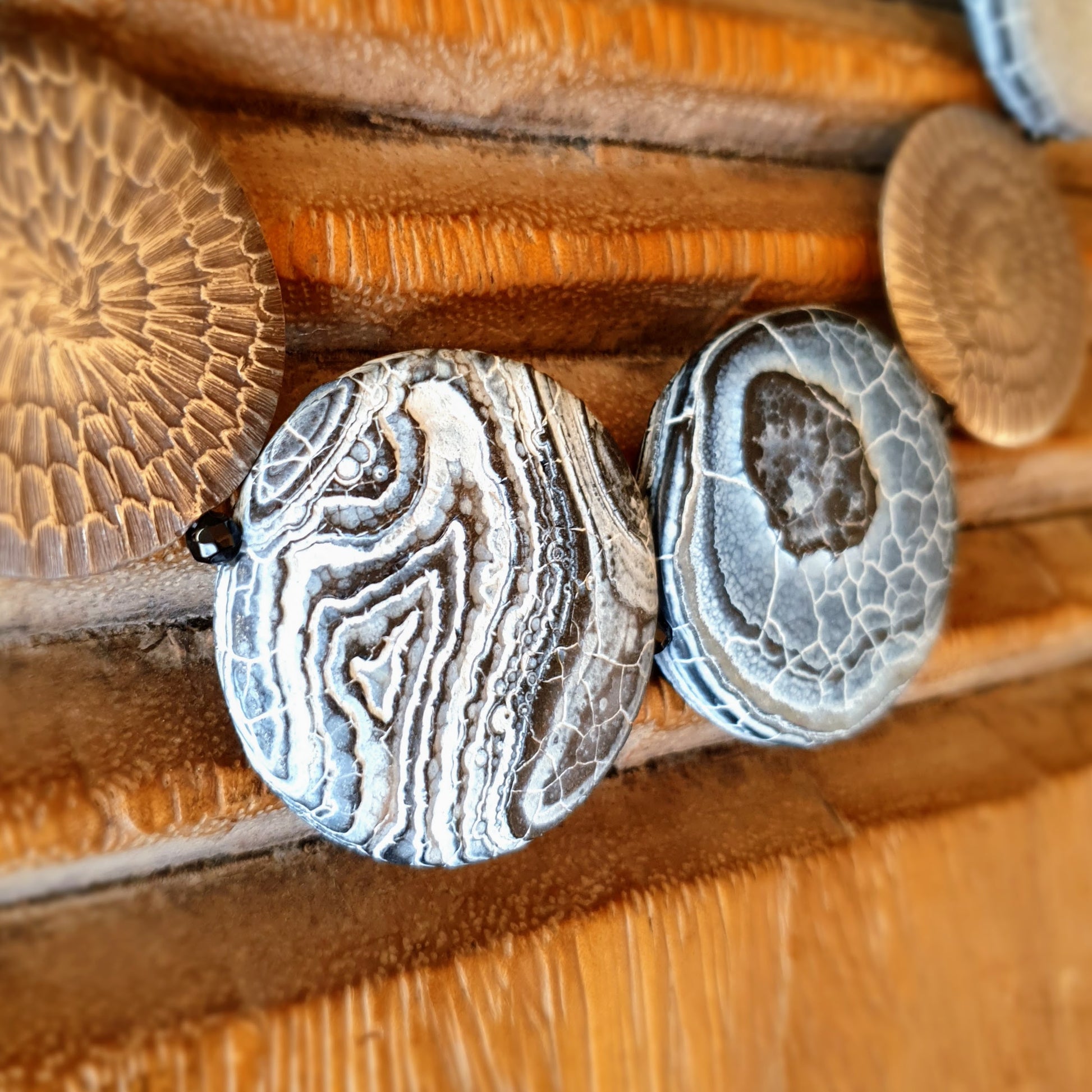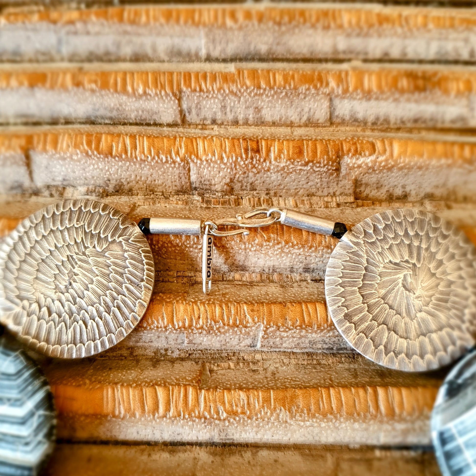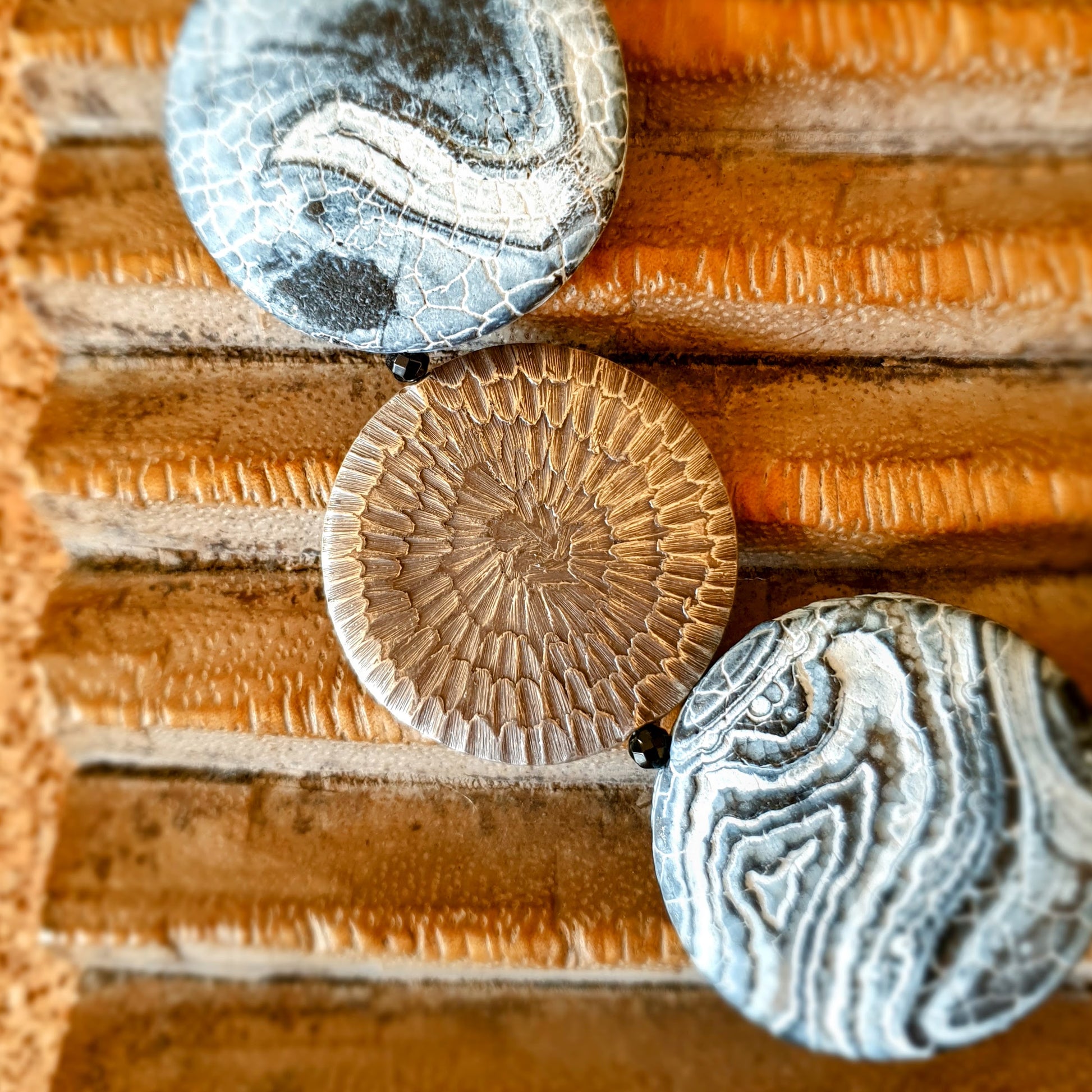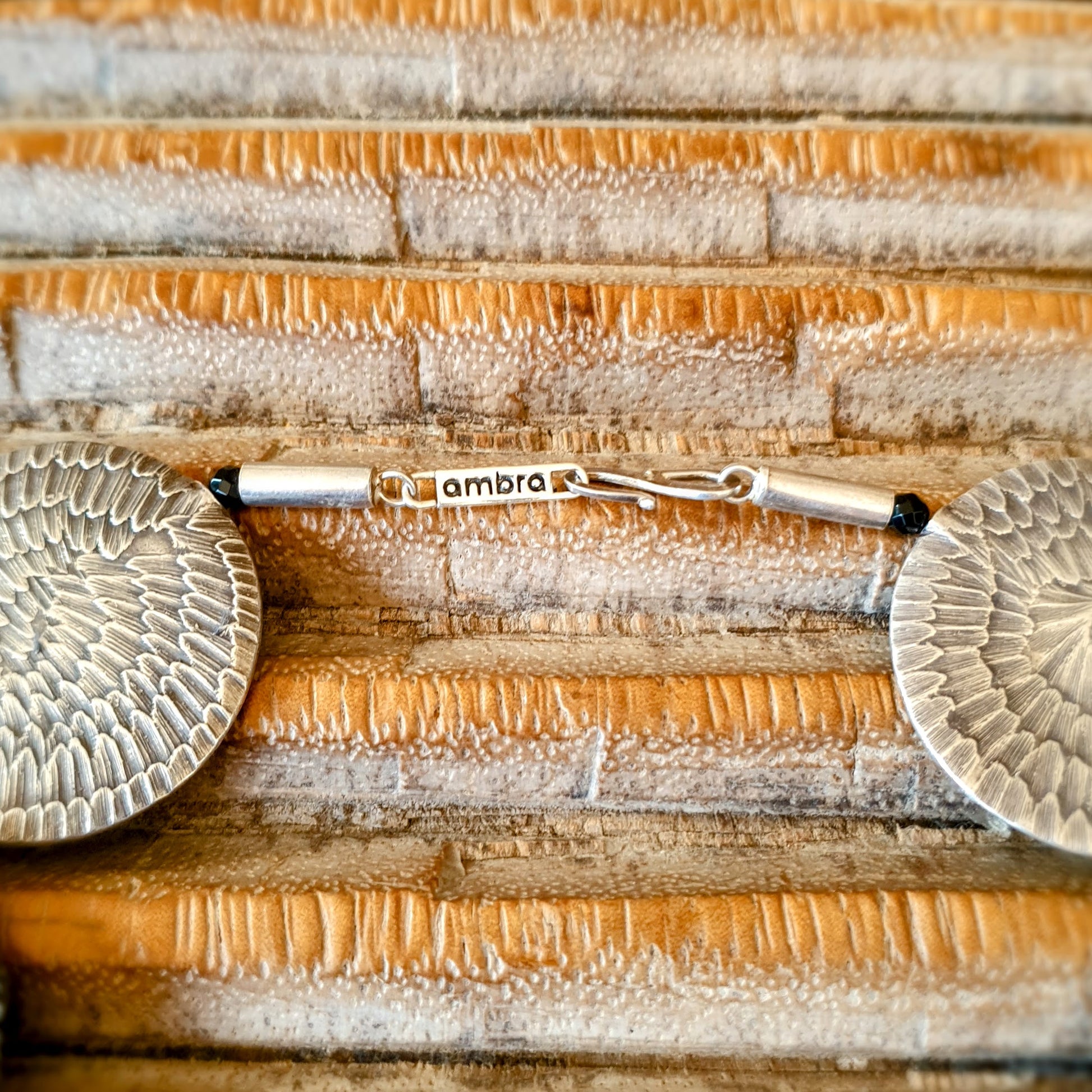 Large handmade unique necklace with etched agate stones, hammered silver discs from Burma and small faceted onyx stones with silver clasp by ambra Schmuck.
