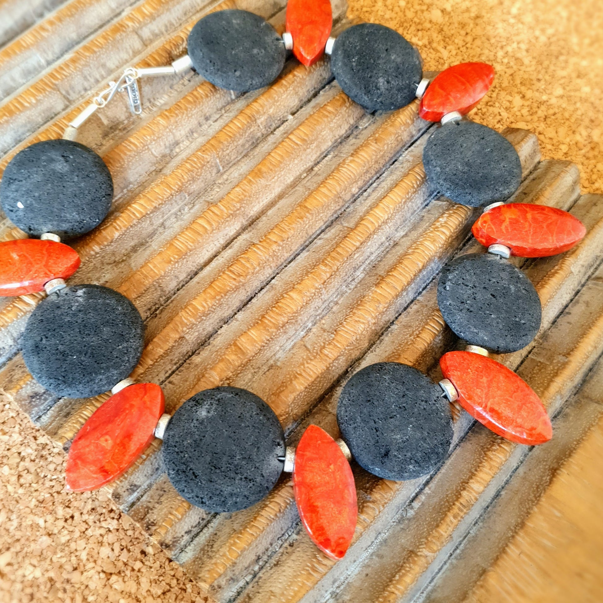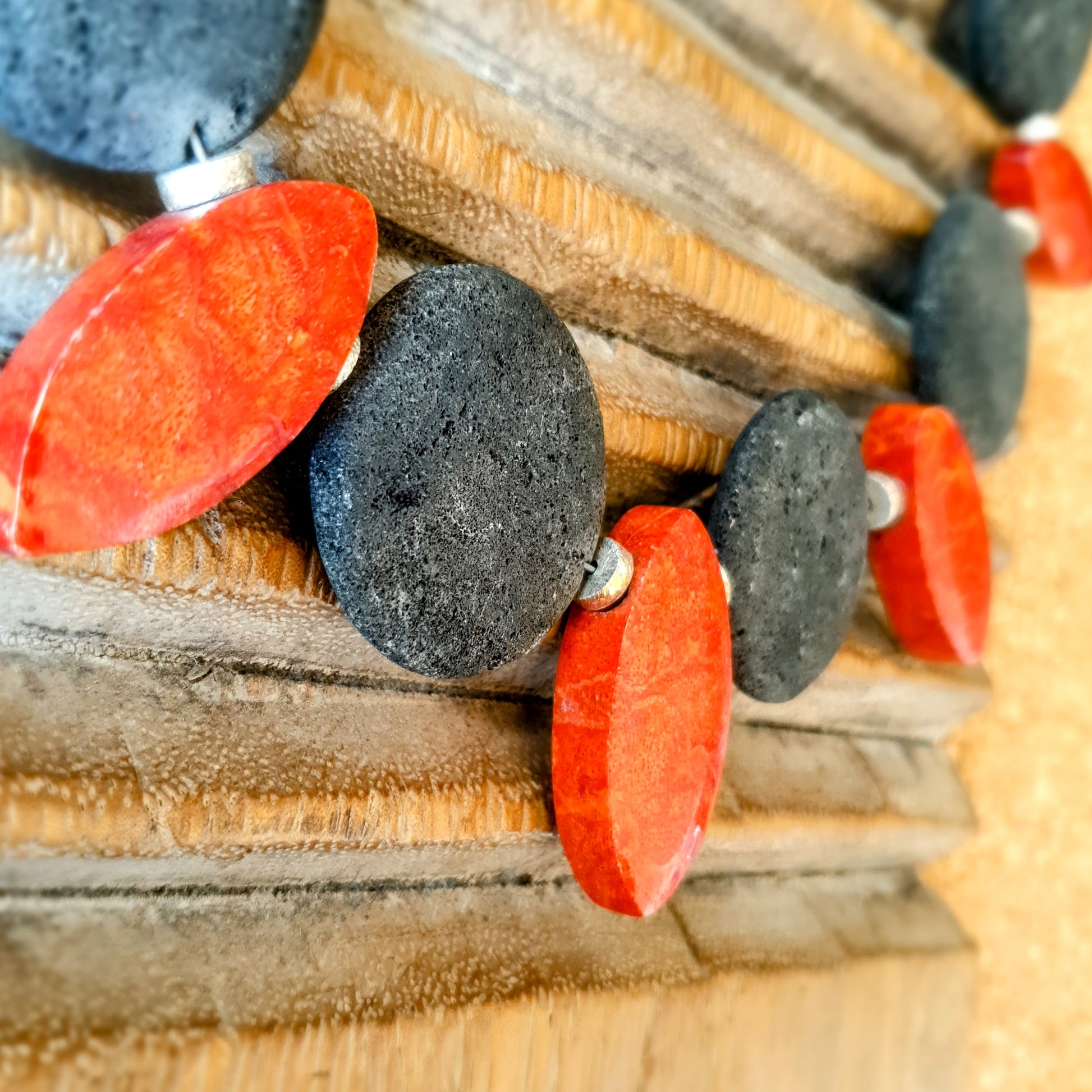 Expressive handmade unique necklace with red foam coral, anthracite-colored lava stones and matte silver beads with silver clasp by ambra Schmuck.