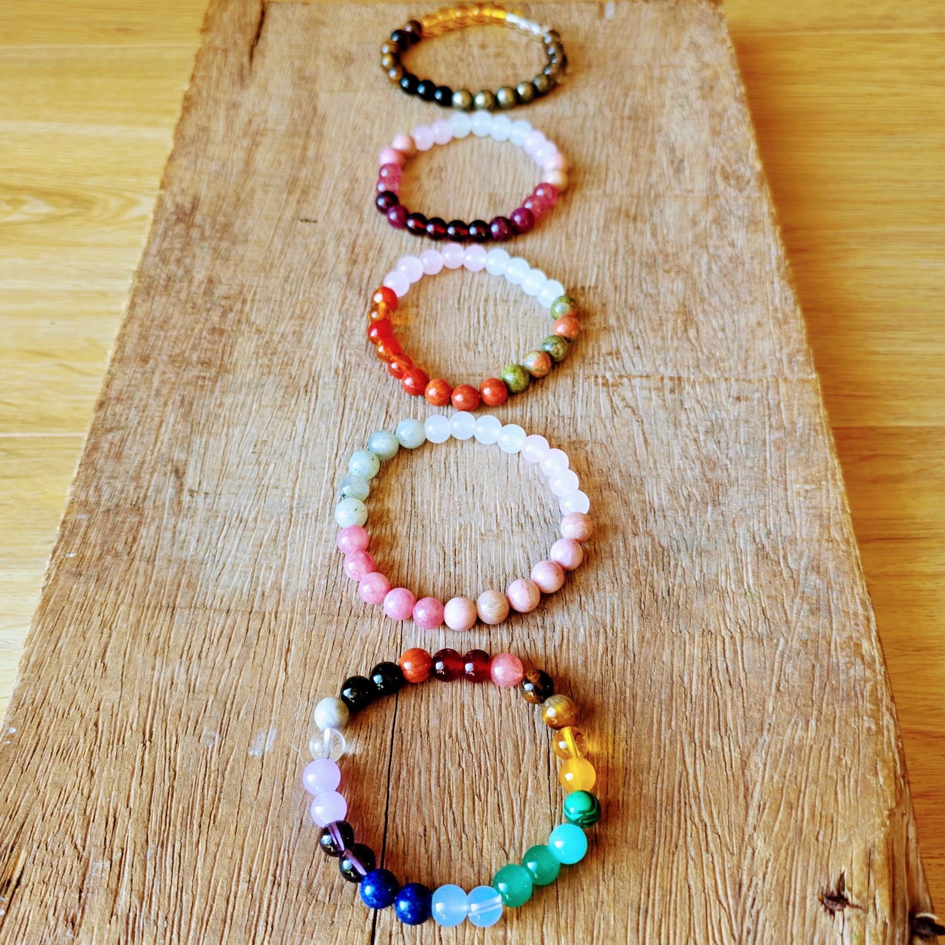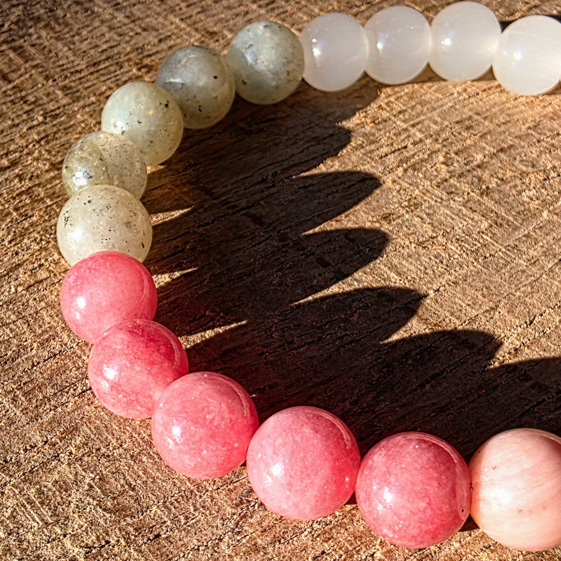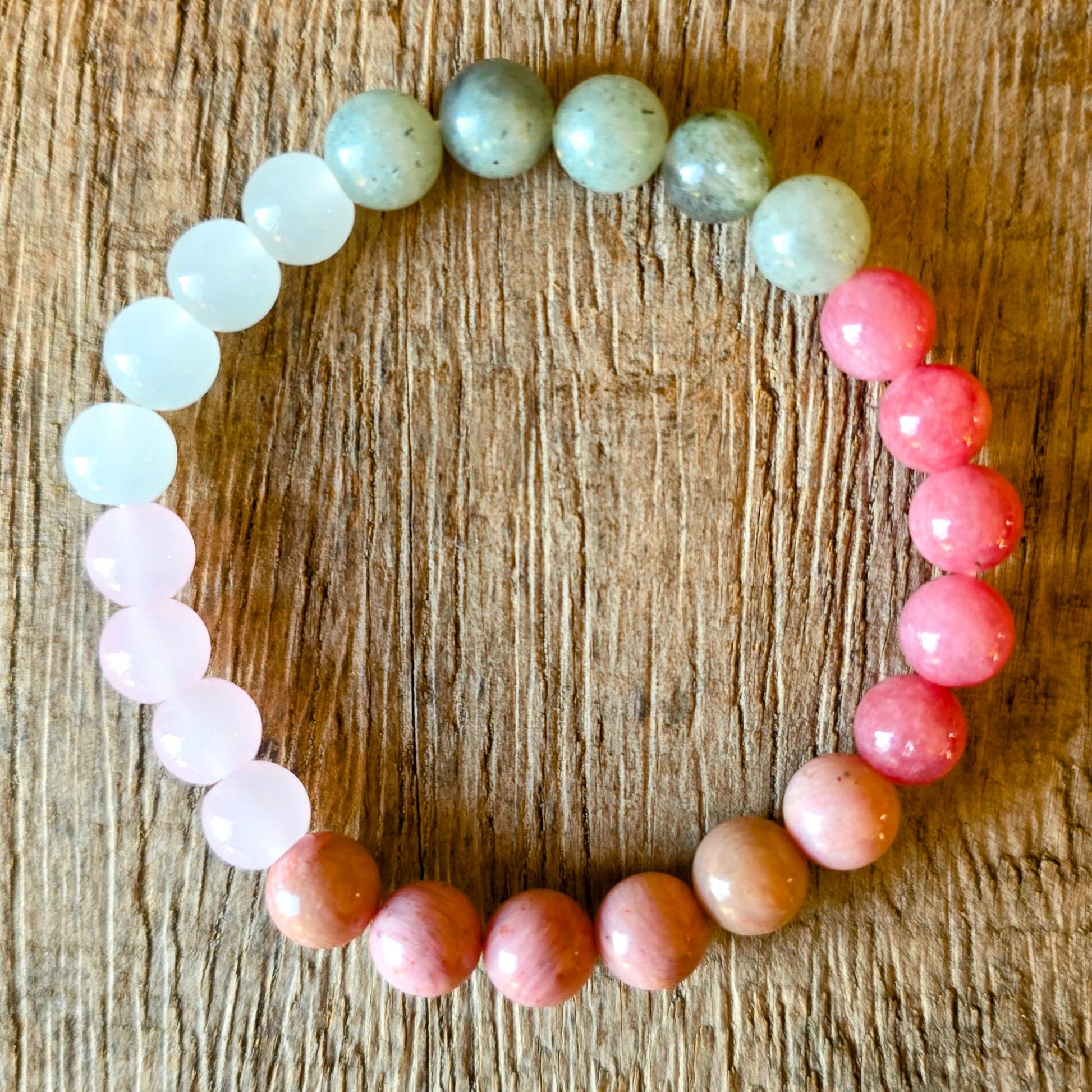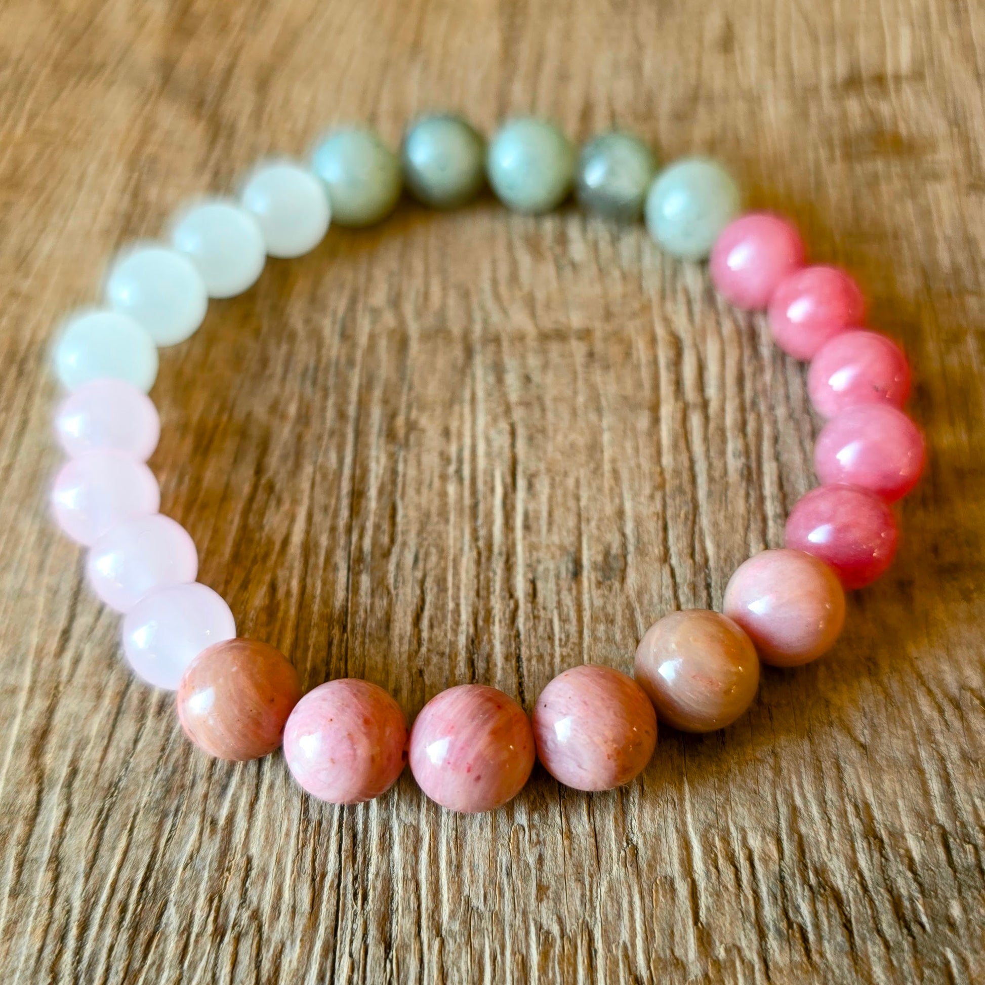 Pastellfarbenes Meditationsarmband SELBSTVERTRAUEN mit einem Edelsteinmix aus Opalit, Rhodochrosit, grünem Aventurin und Quarzkristall auf Gummiband.