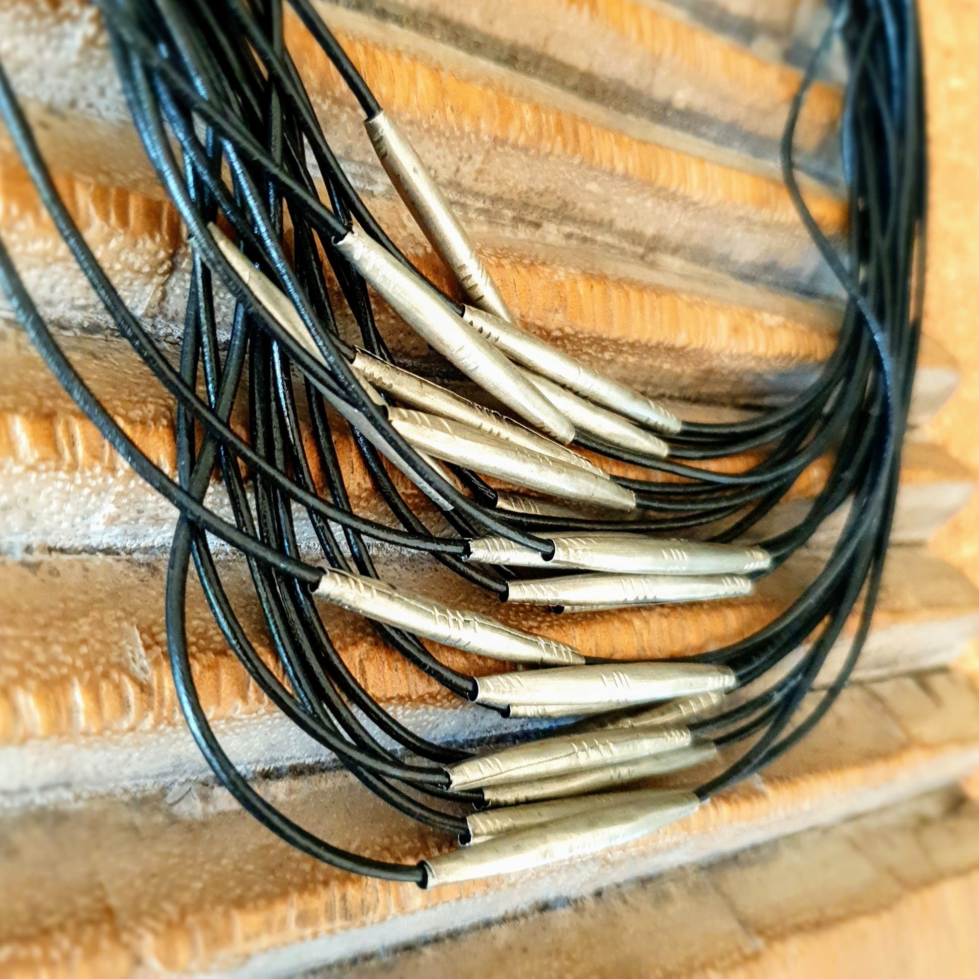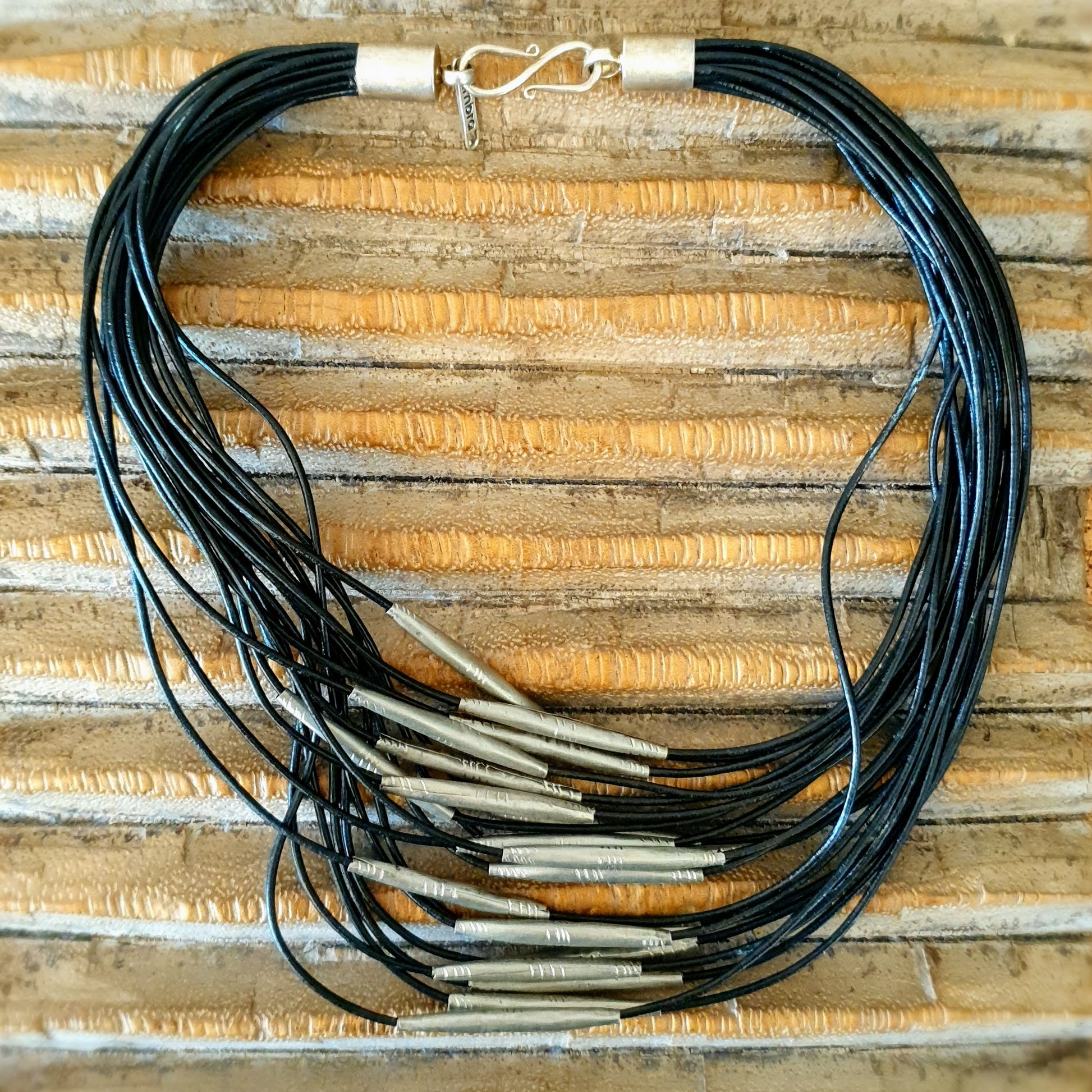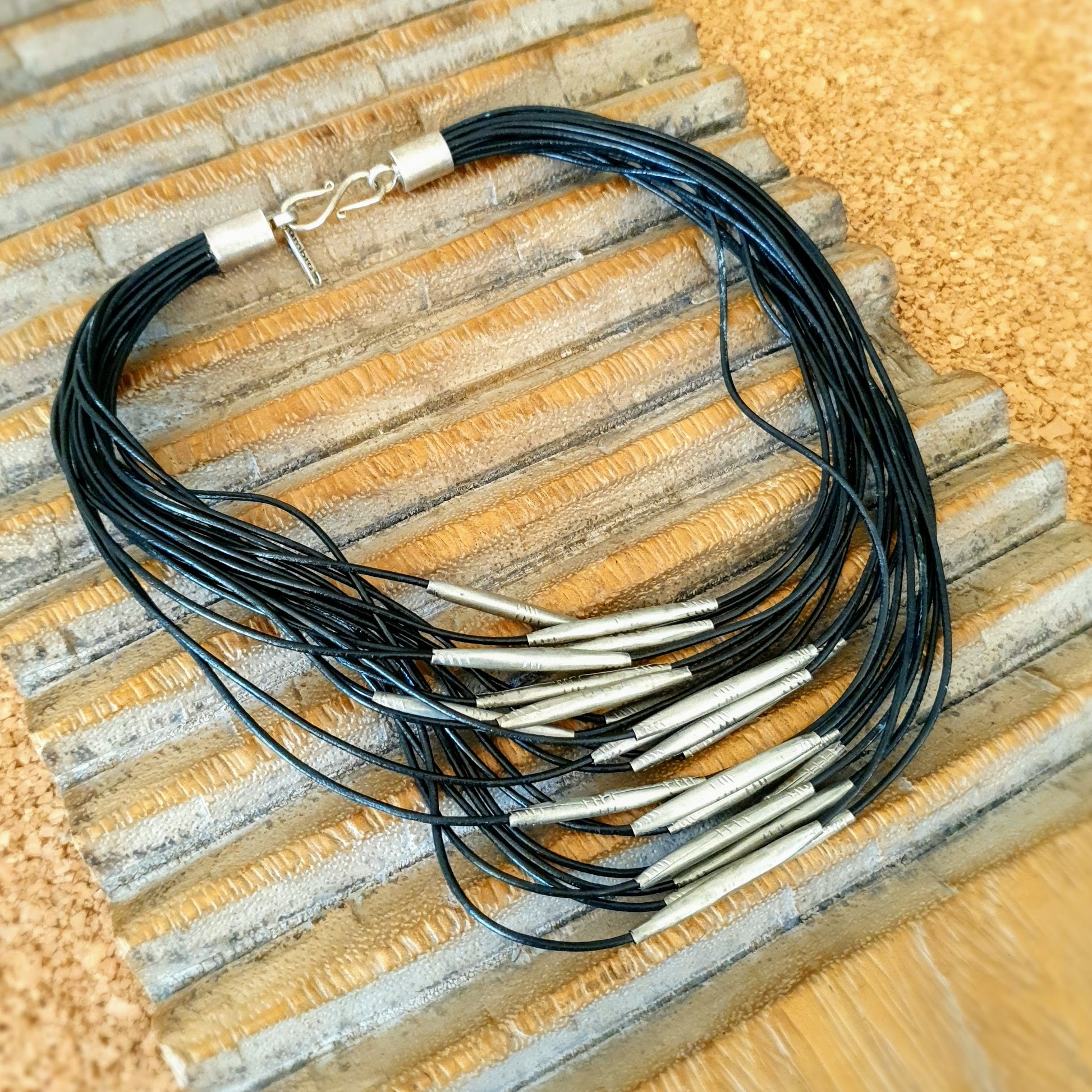 Handgearbeitete mehrreihige Kette mit länglichen Metallröhren der Tuareg auf schwarzem Leder mit Silberverschluss von ambra Schmuck.