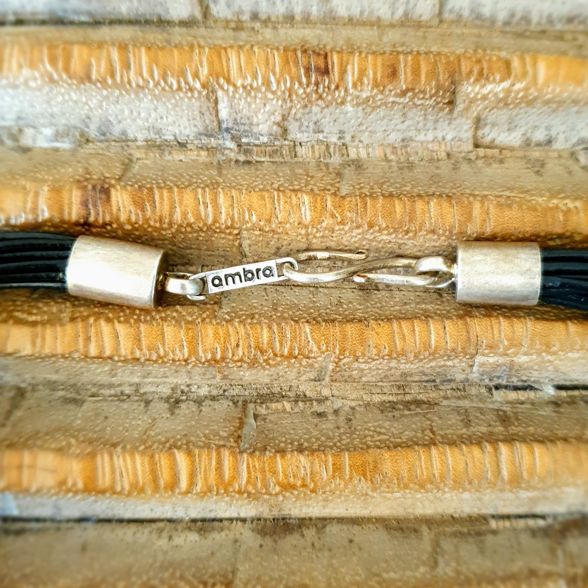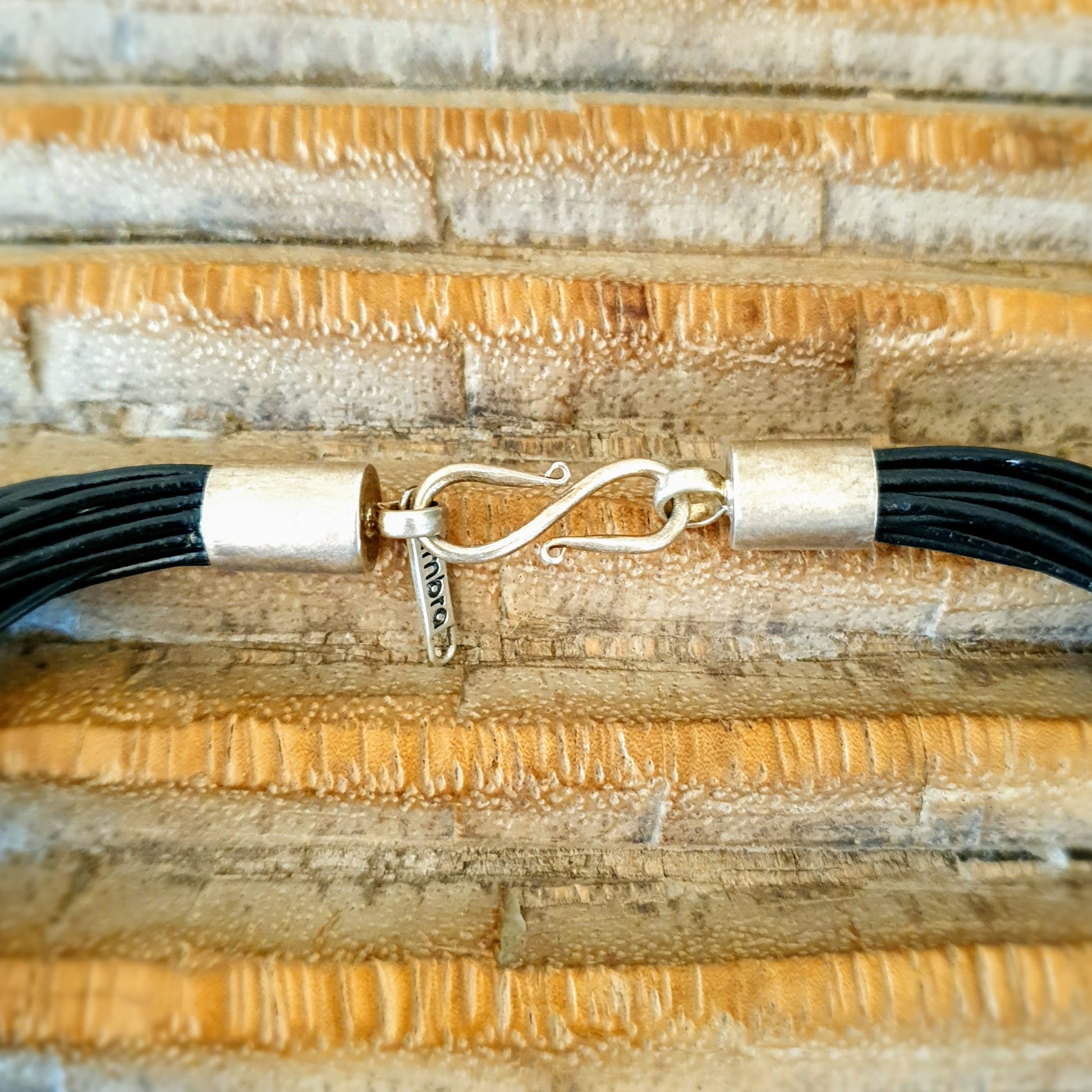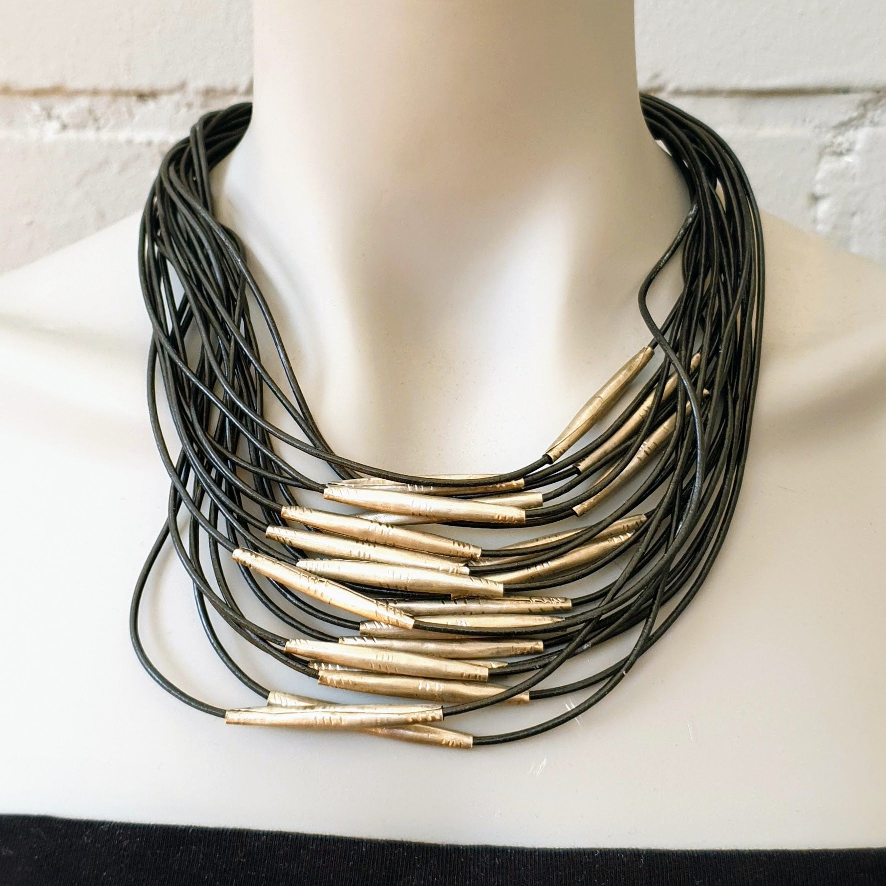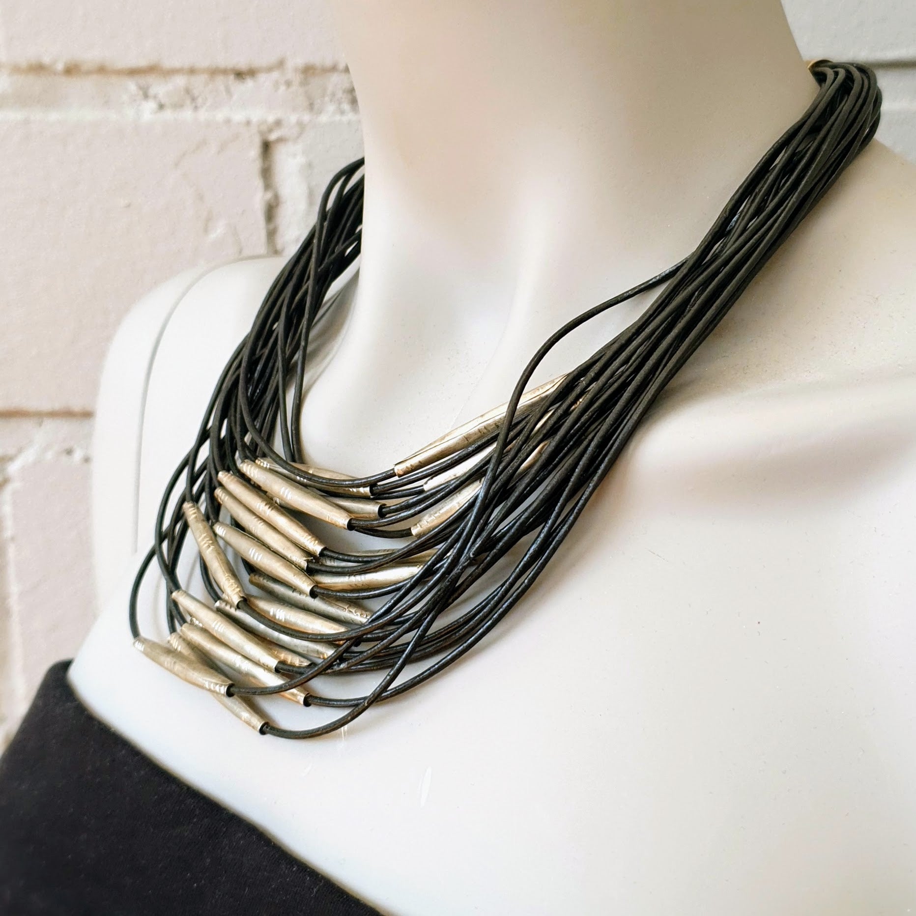 Handgearbeitete mehrreihige Kette mit länglichen Metallröhren der Tuareg auf schwarzem Leder mit Silberverschluss von ambra Schmuck.