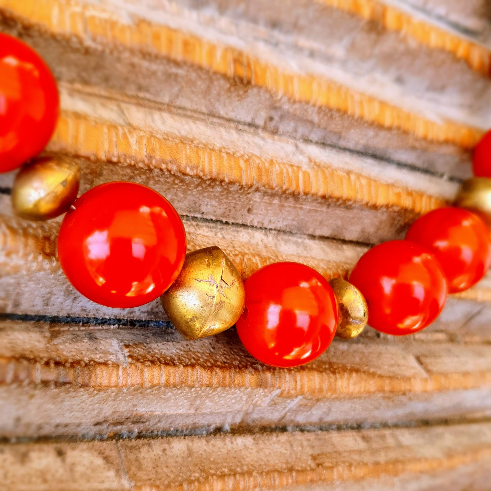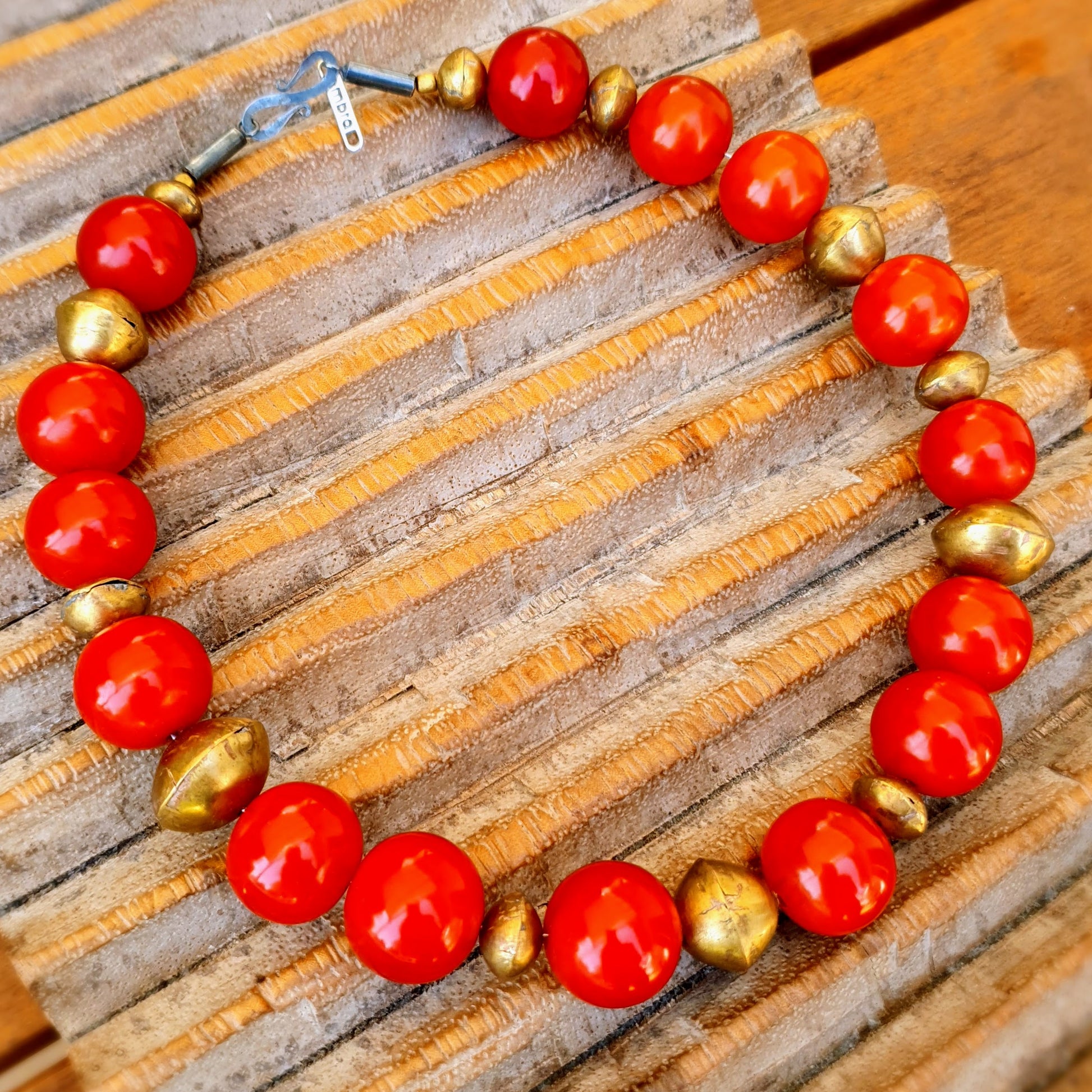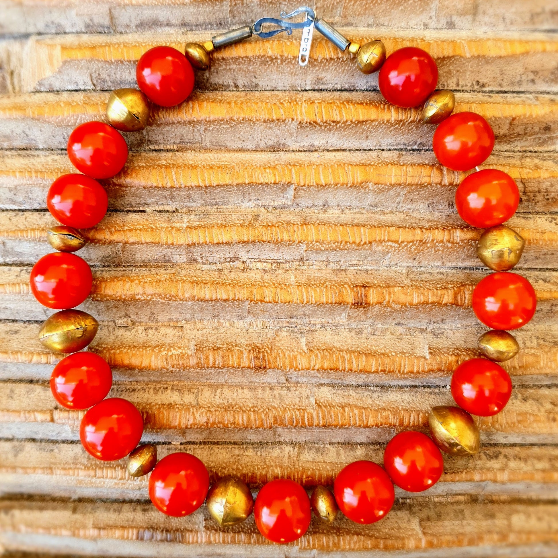 Handcrafted necklace with orange resin balls from Indonesia and hollow Tuareg bronze beads with oxidized silver clasp by ambra Schmuck.