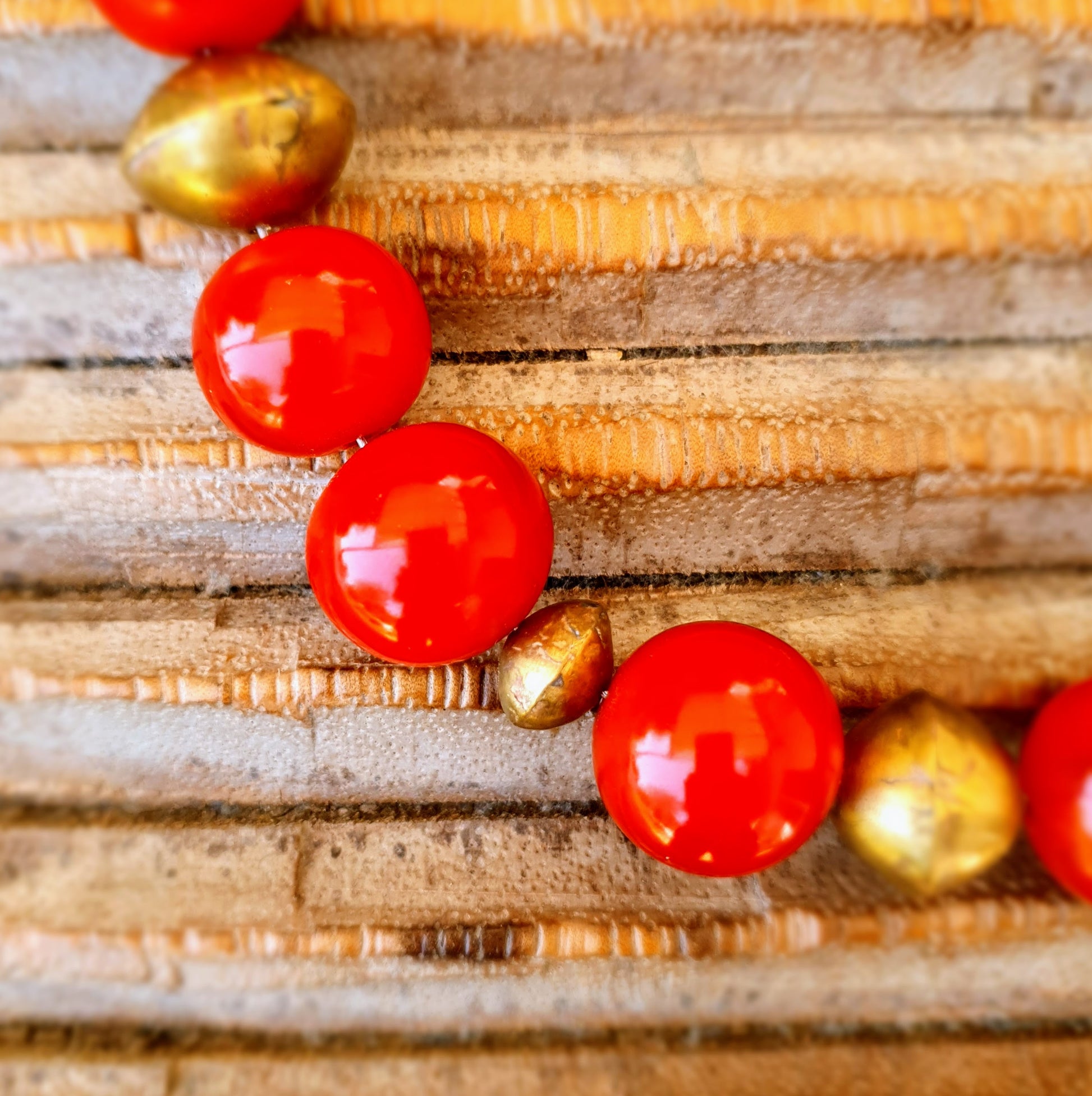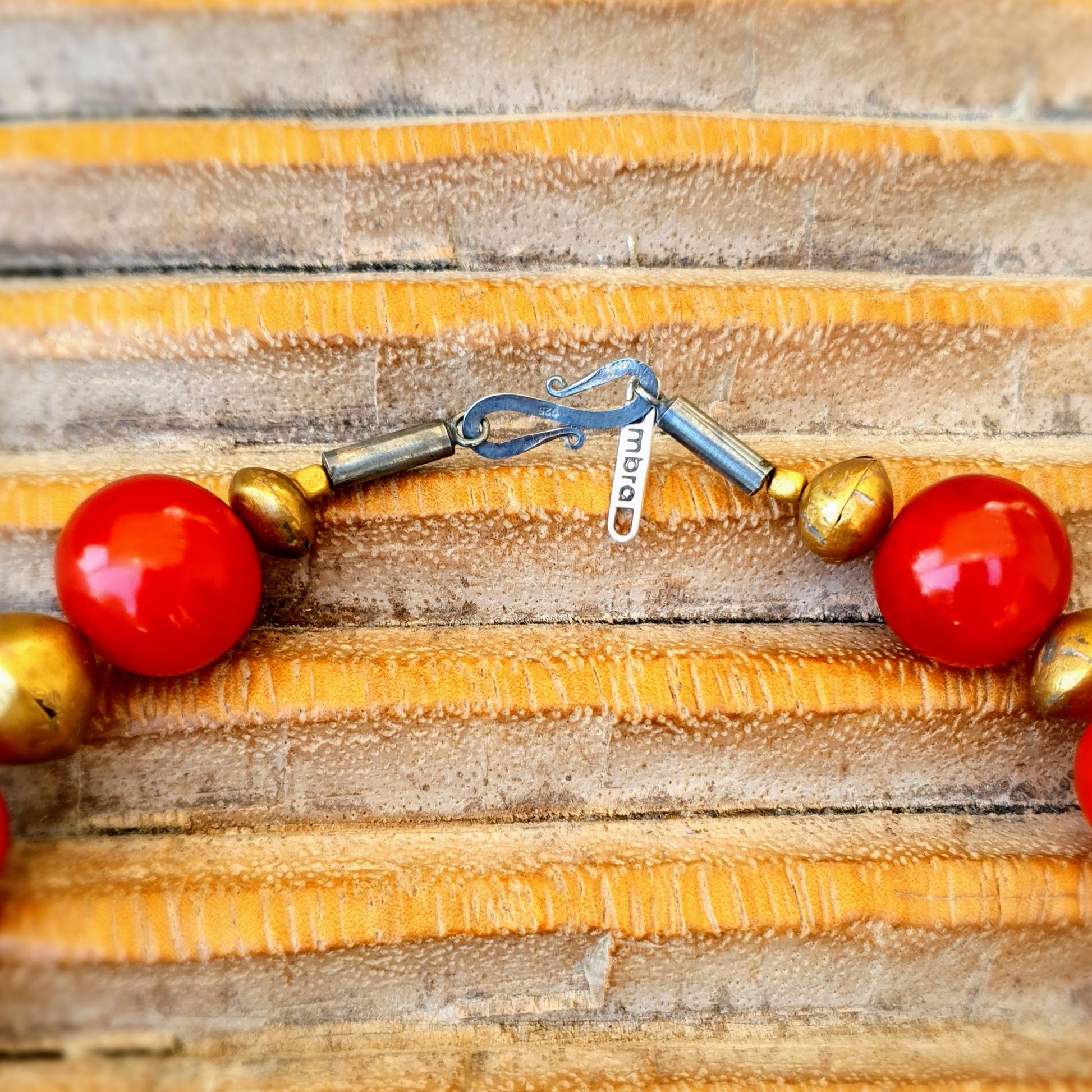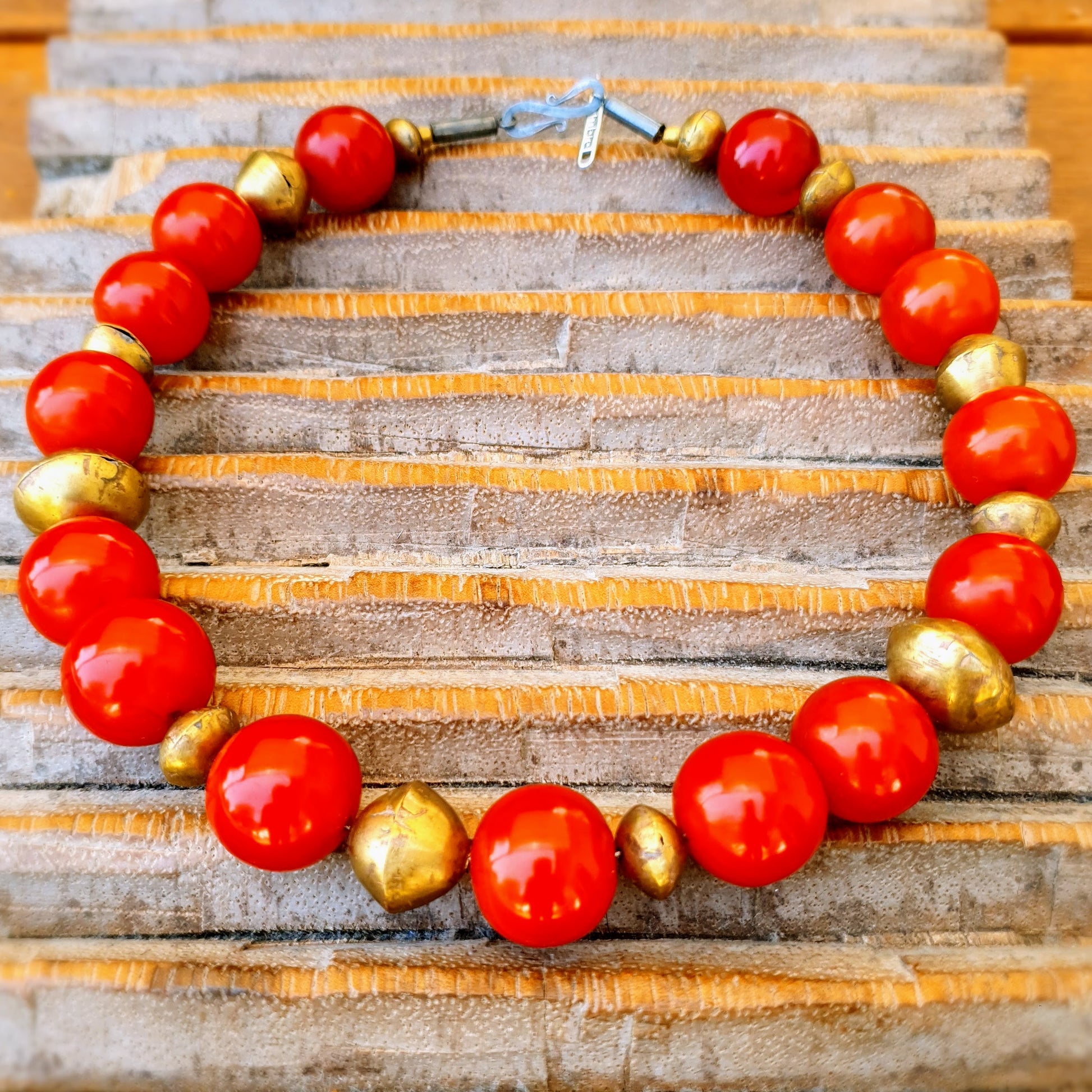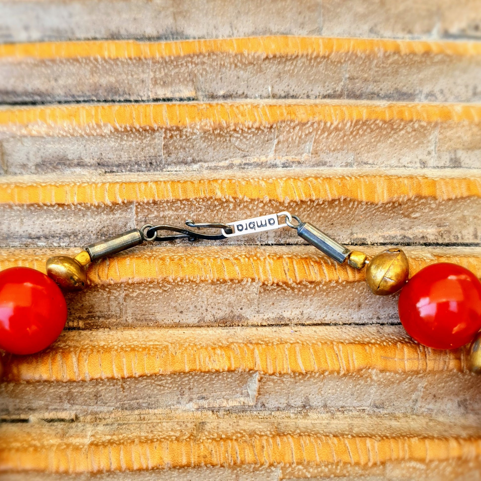 Handcrafted necklace with orange resin balls from Indonesia and hollow Tuareg bronze beads with oxidized silver clasp by ambra Schmuck.