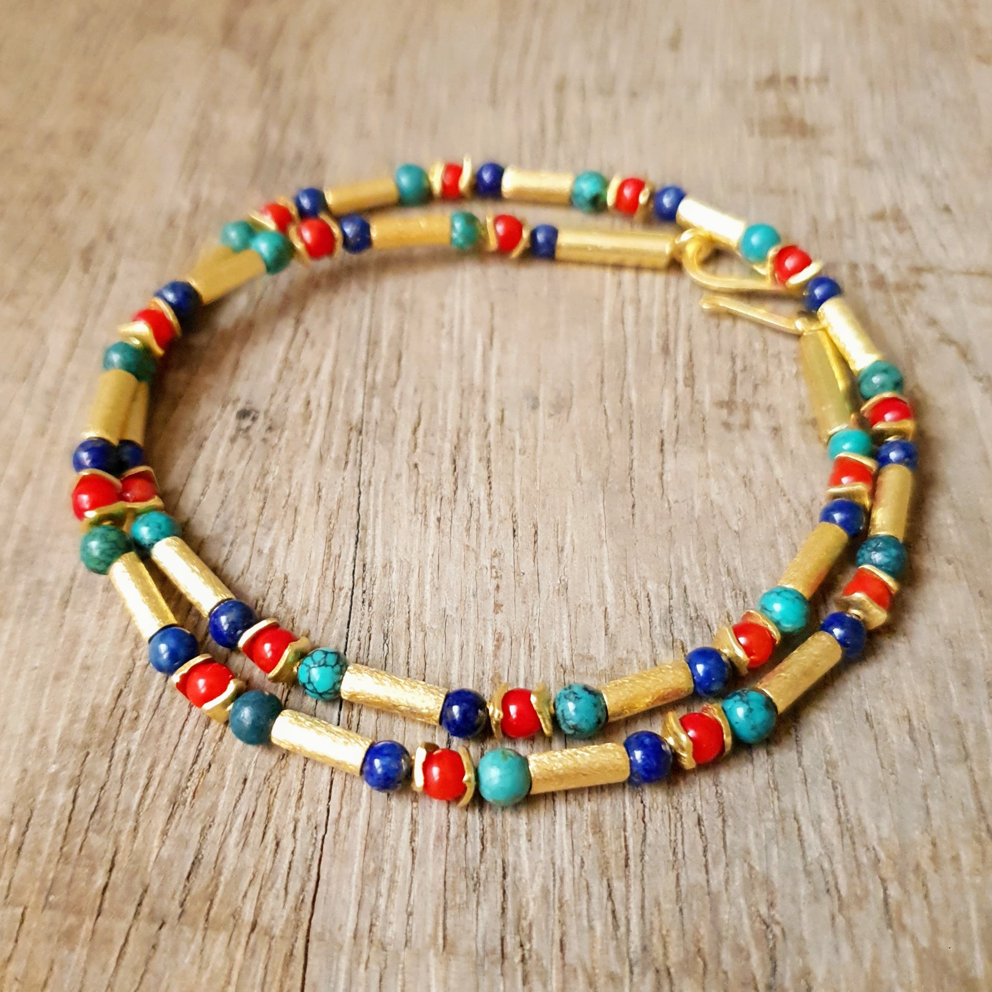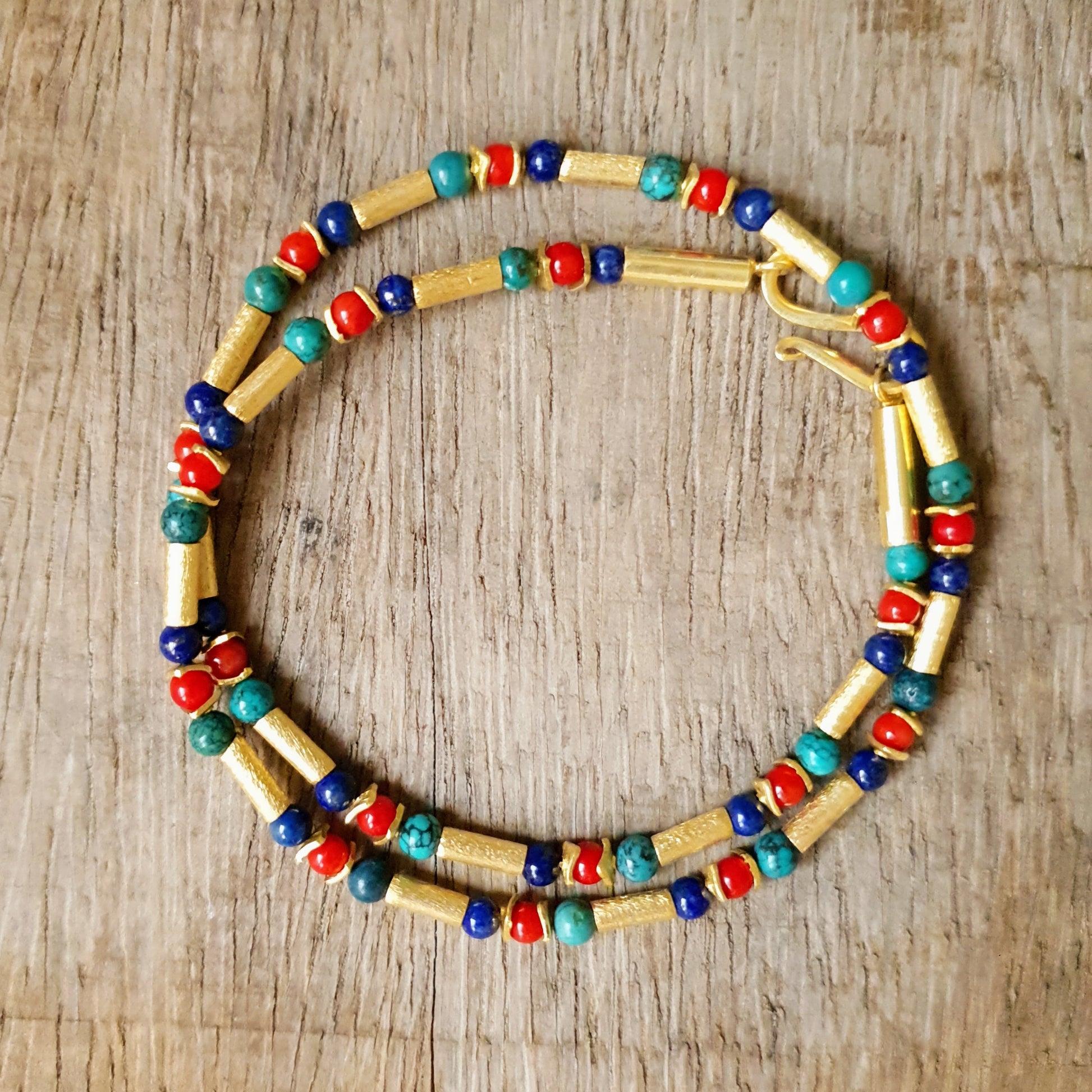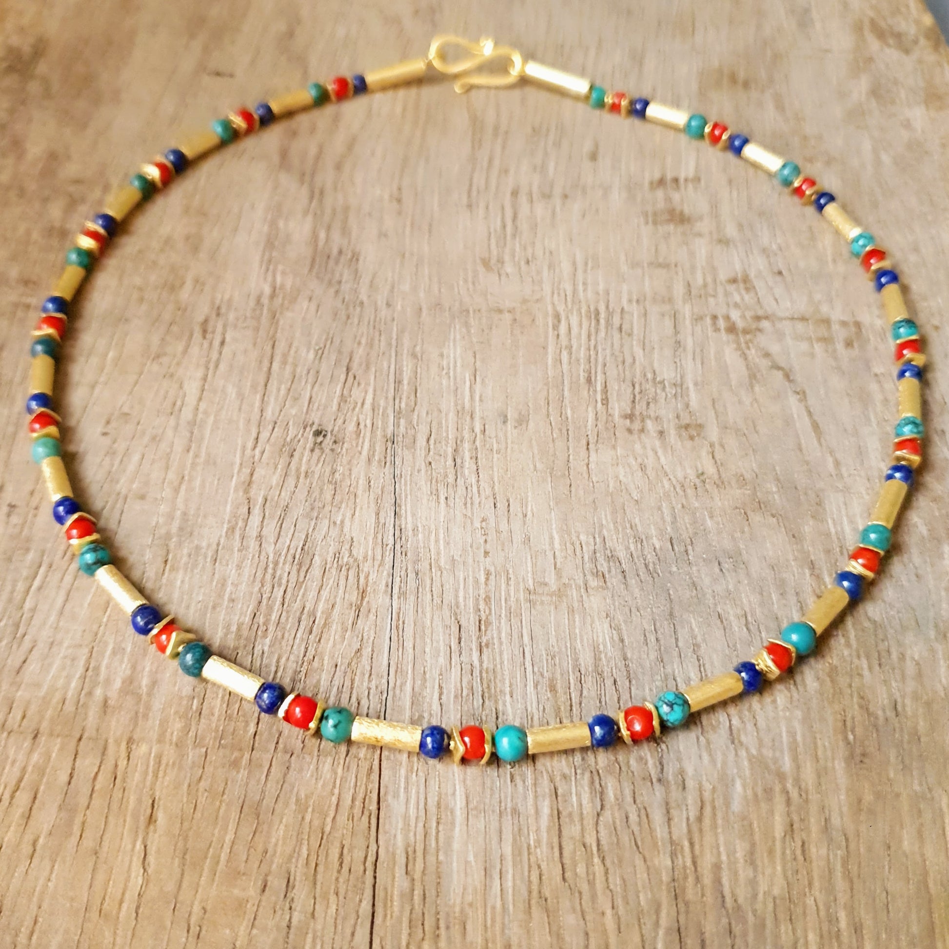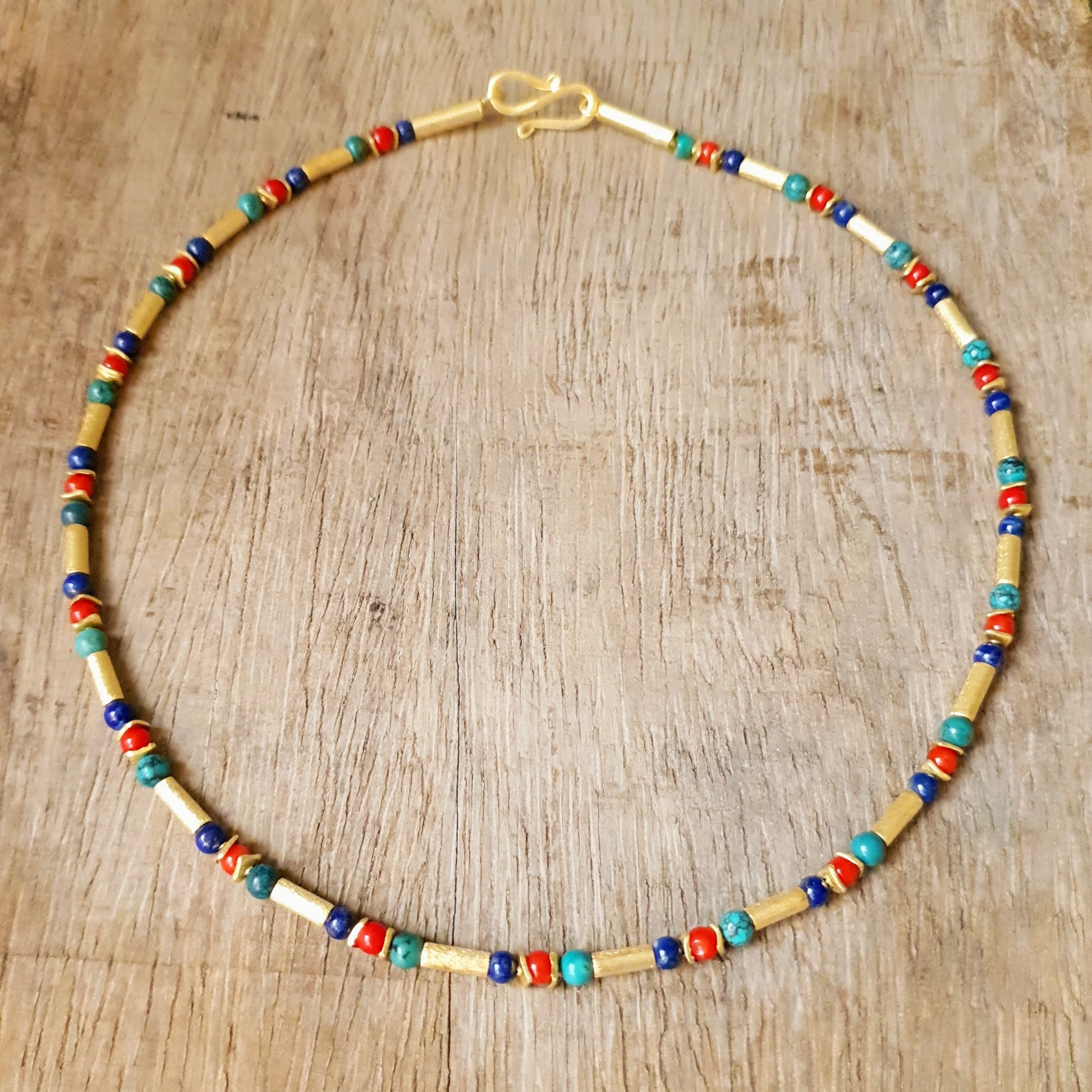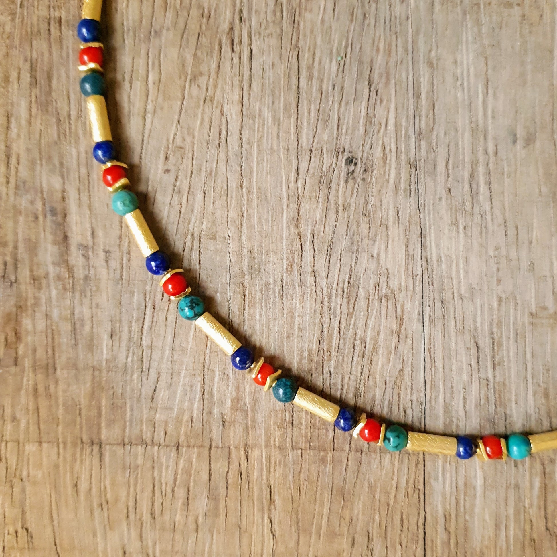 Feine handgearbeitete Kette mit Lapislazulisteinen, Türkissteinen und Korallenperlen zwischen vergoldeten mattierten Silberröhrchen mit vergoldetem Silberverschluss von ambra Schmuck.