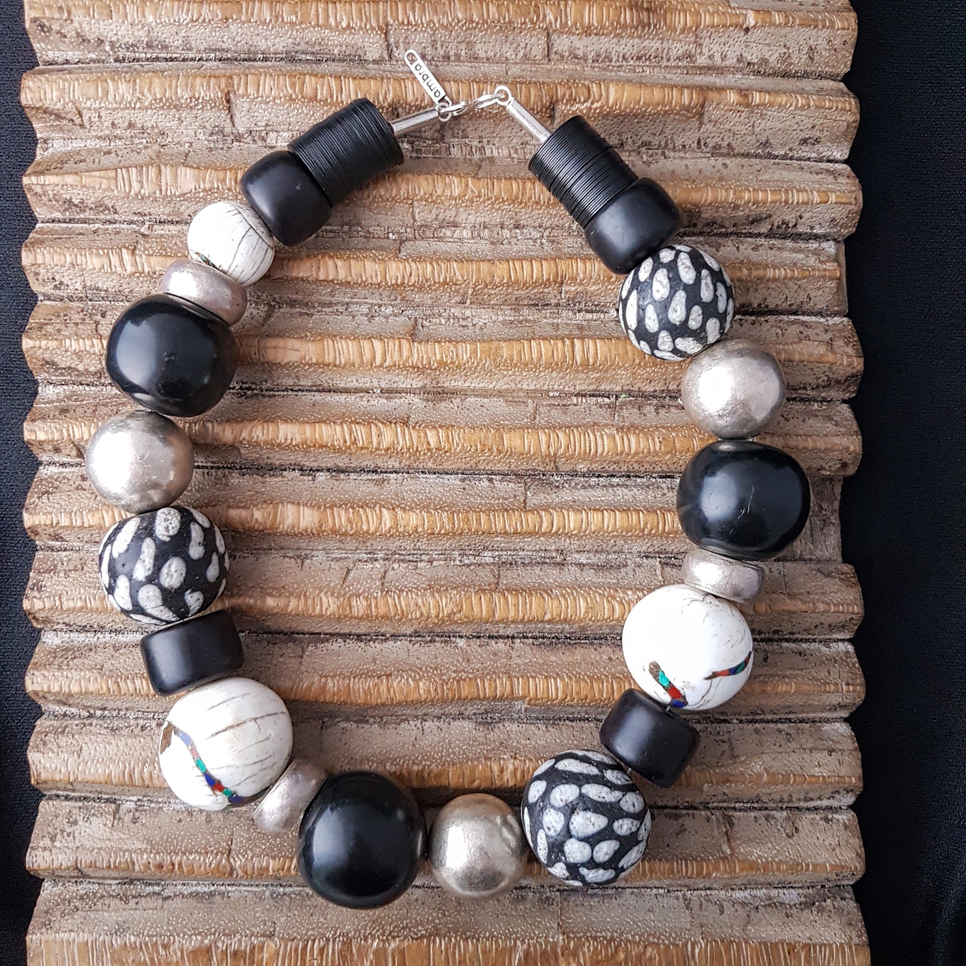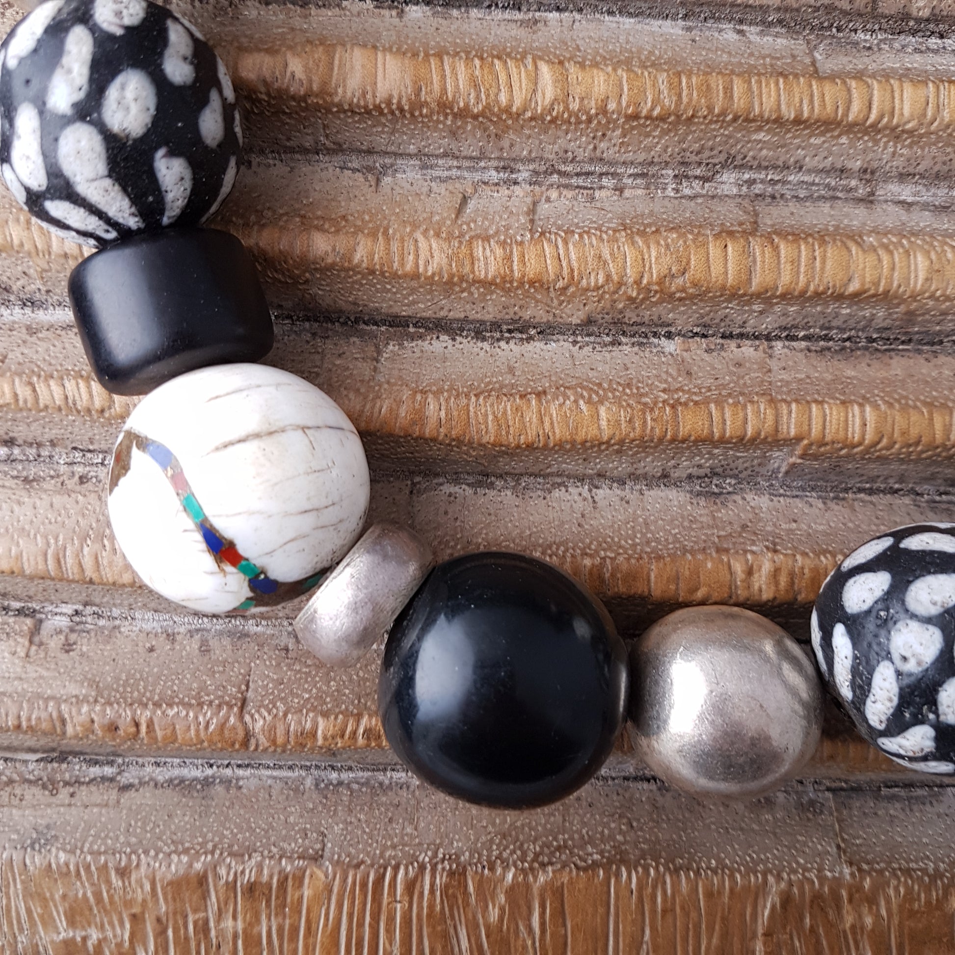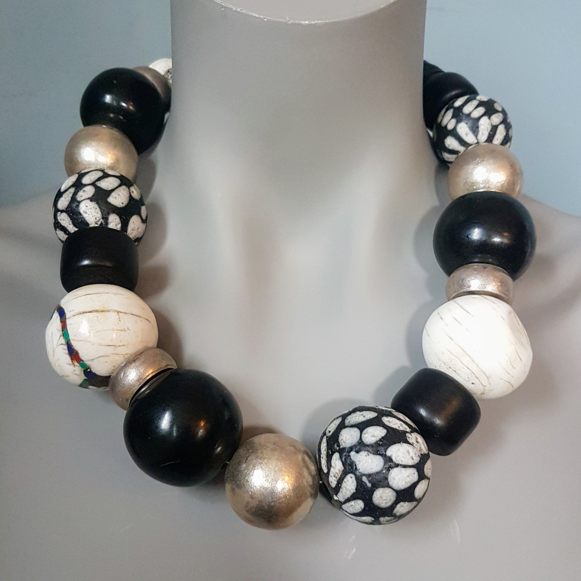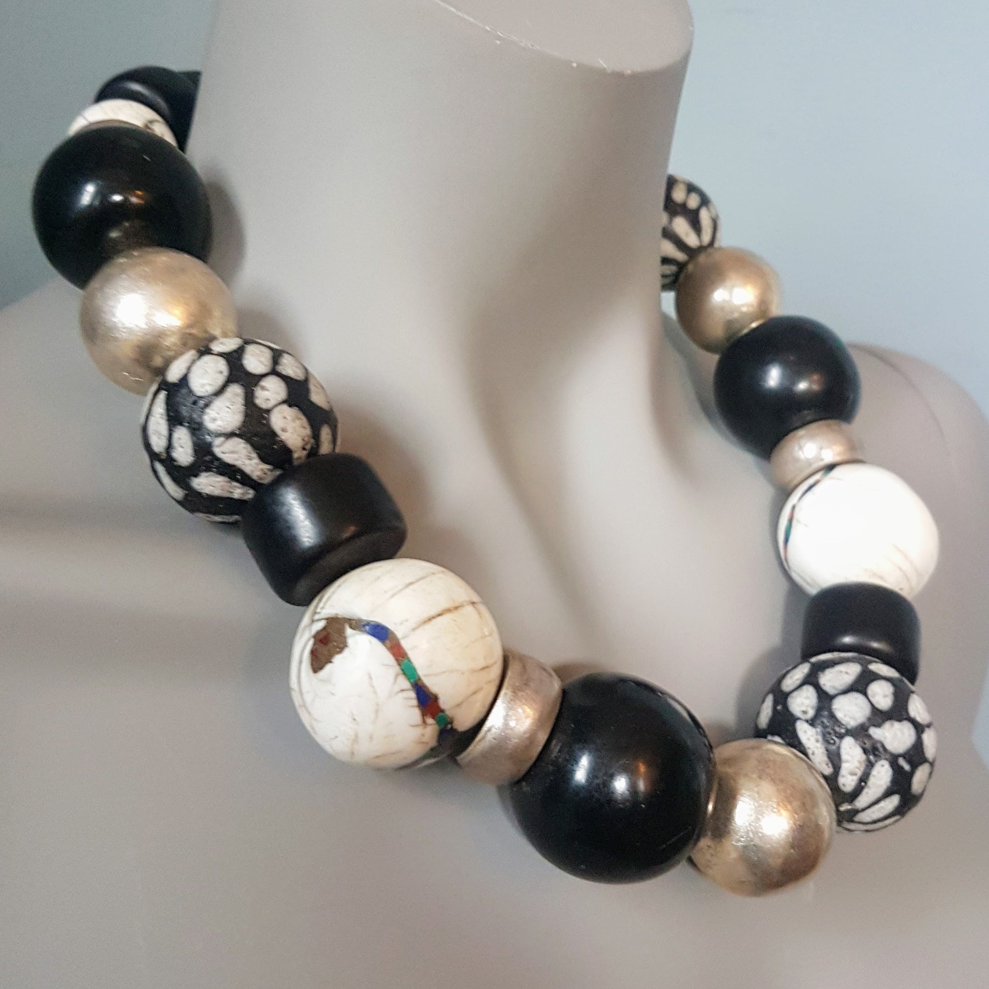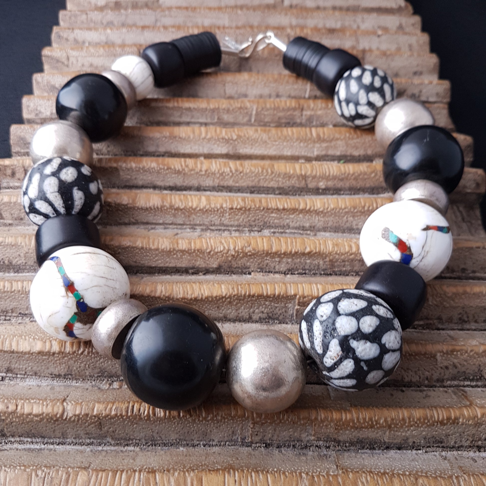 Handcrafted necklace with Tibetan NAGA CONCH shell beads with inlays of coral and turquoise from distant Nepal, dotted glass beads from the island of Java, silver beads from Burma and black Indonesian resin beads with silver clasp by ambra Schmuck.