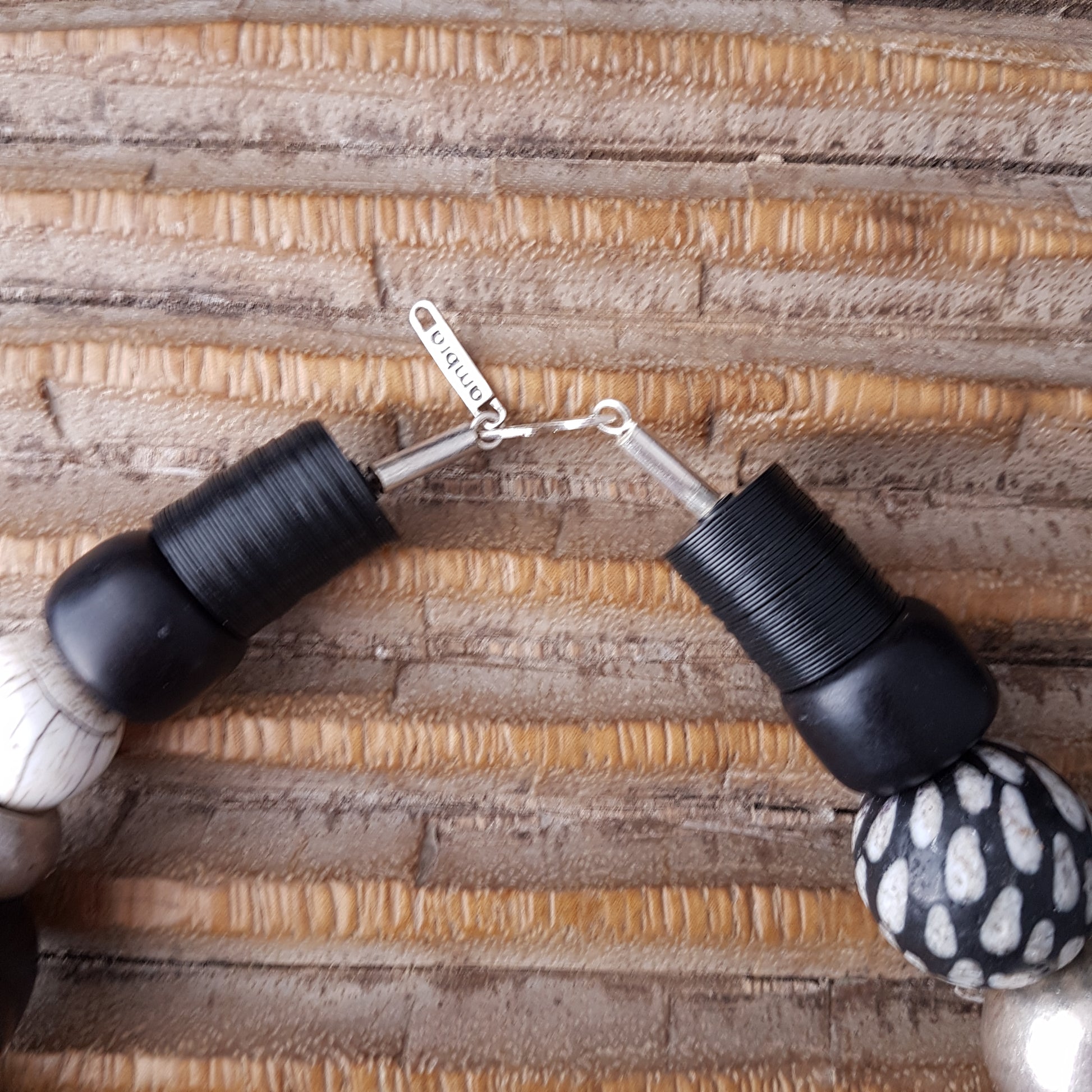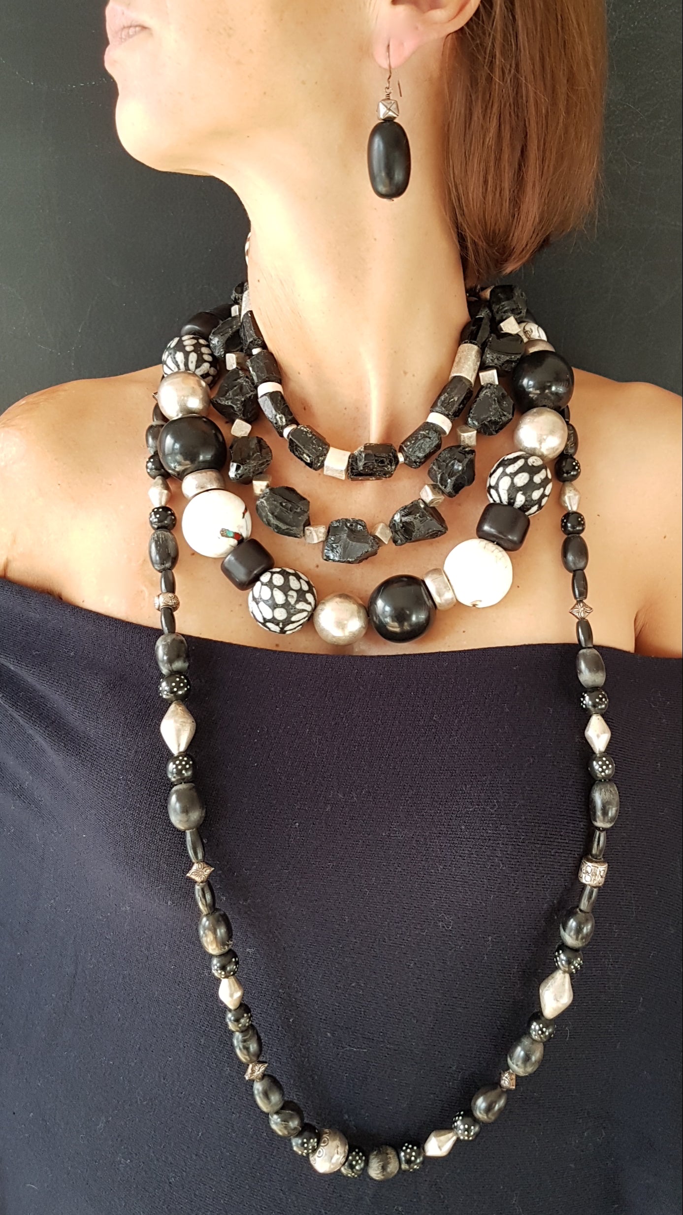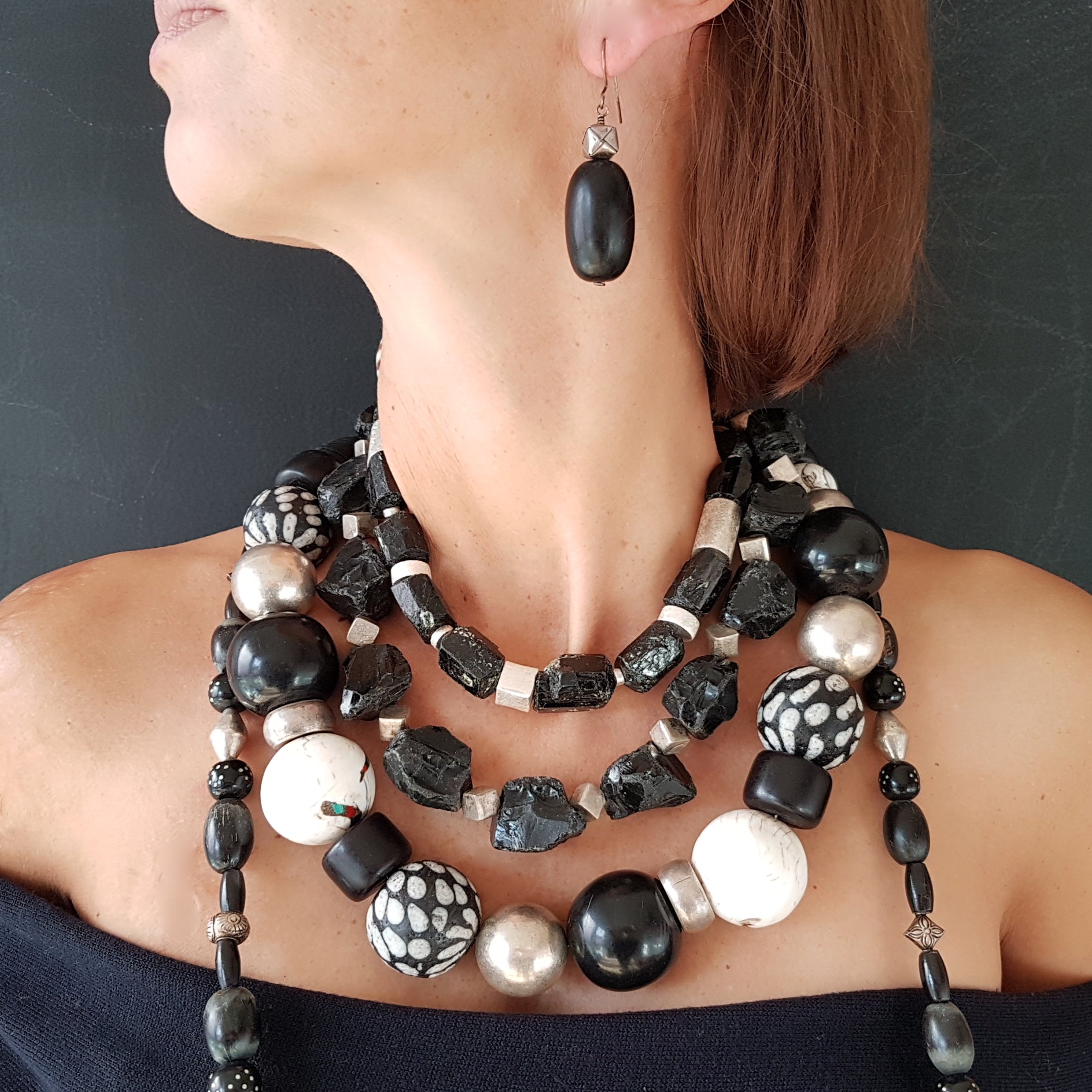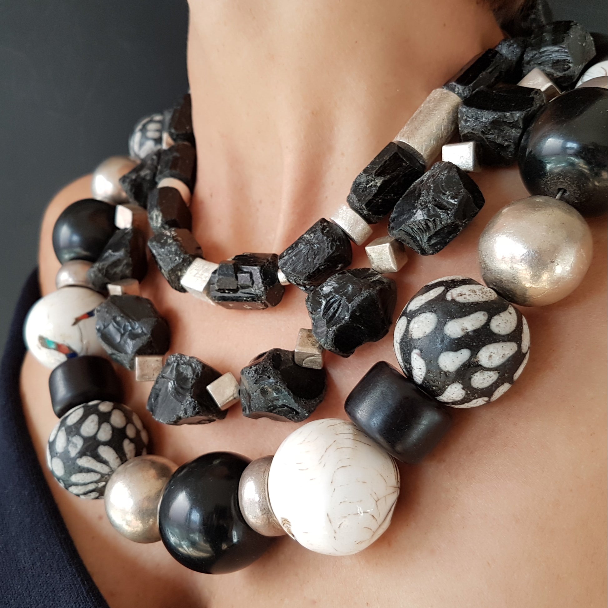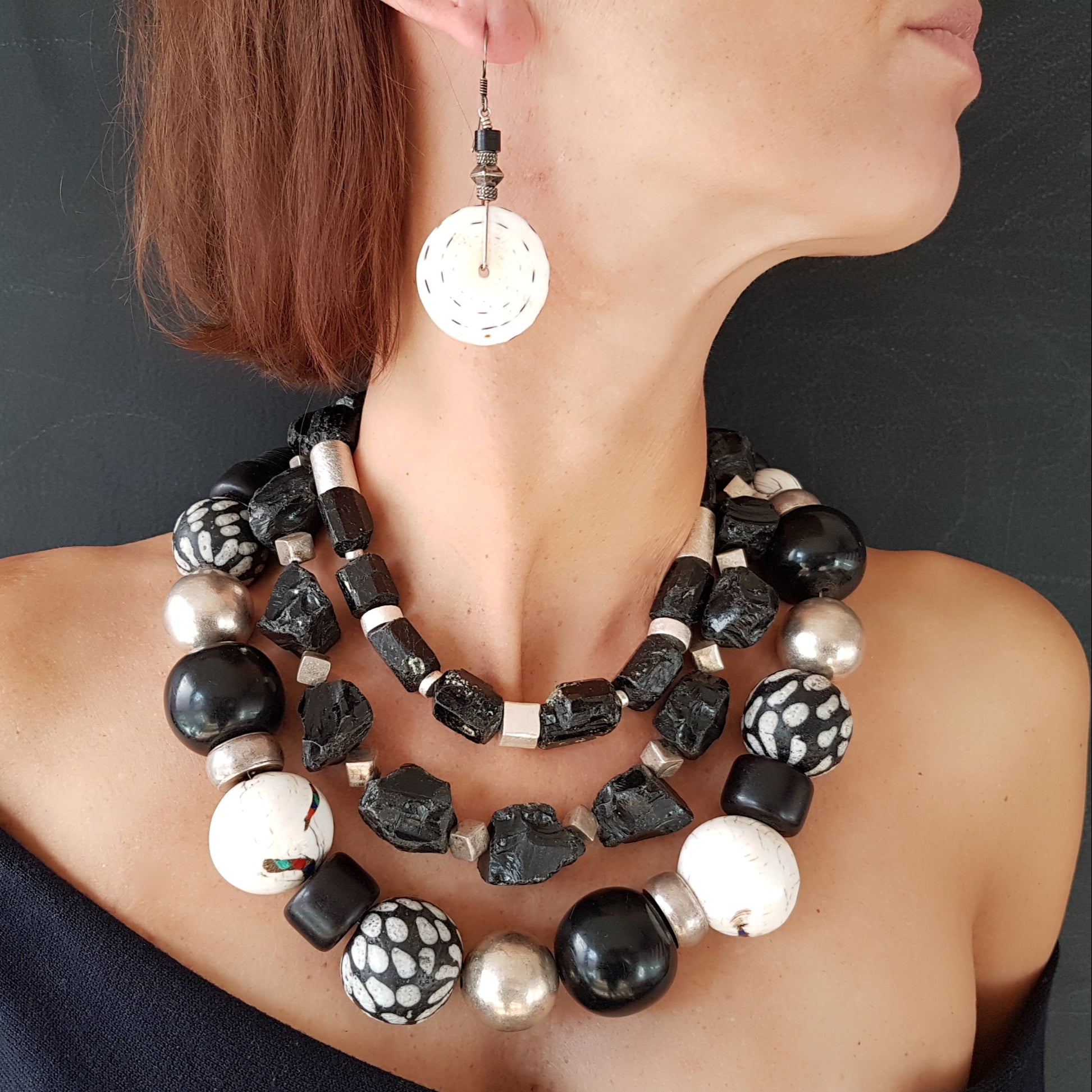 Handcrafted necklace with Tibetan NAGA CONCH shell beads with inlays of coral and turquoise from distant Nepal, dotted glass beads from the island of Java, silver beads from Burma and black Indonesian resin beads with silver clasp by ambra Schmuck.