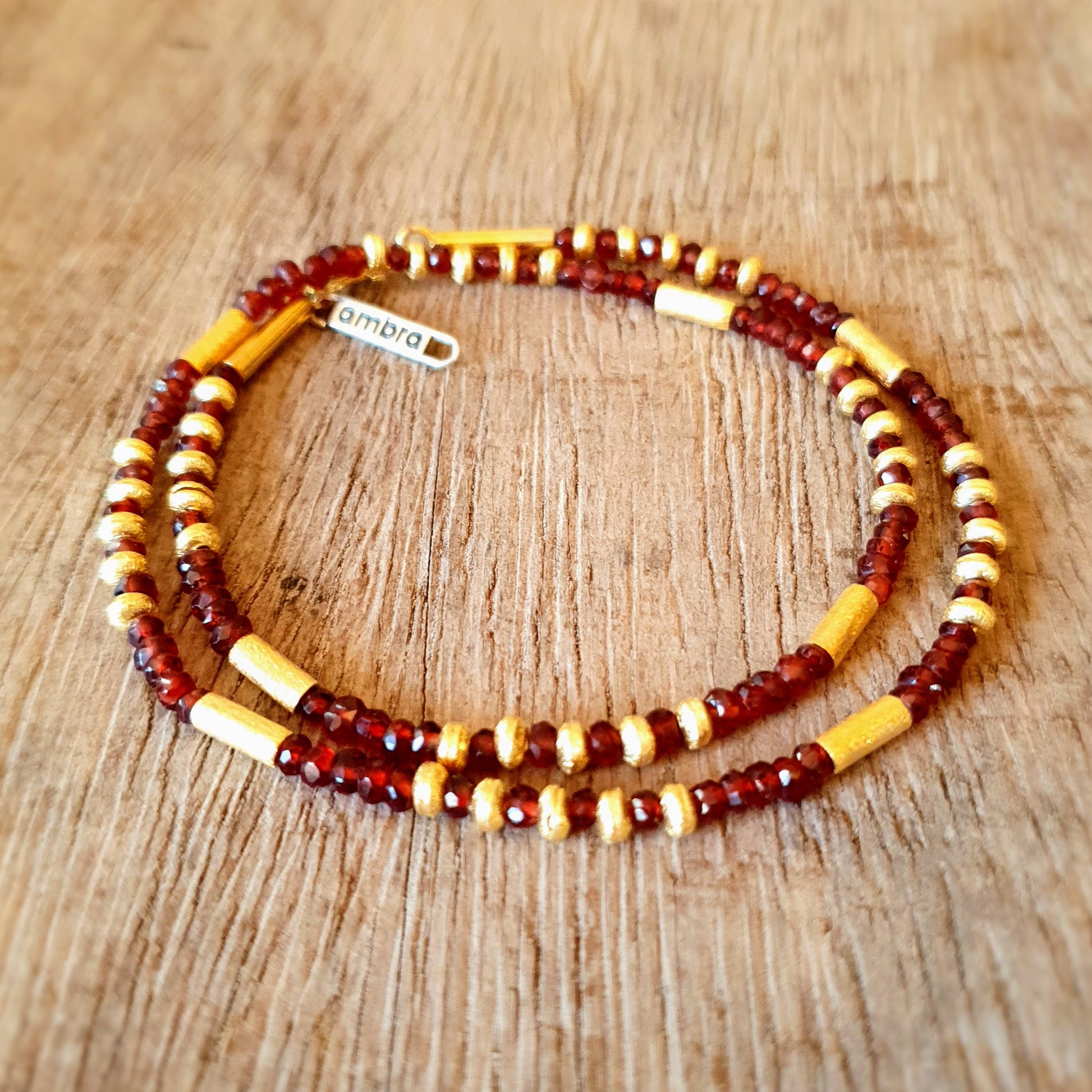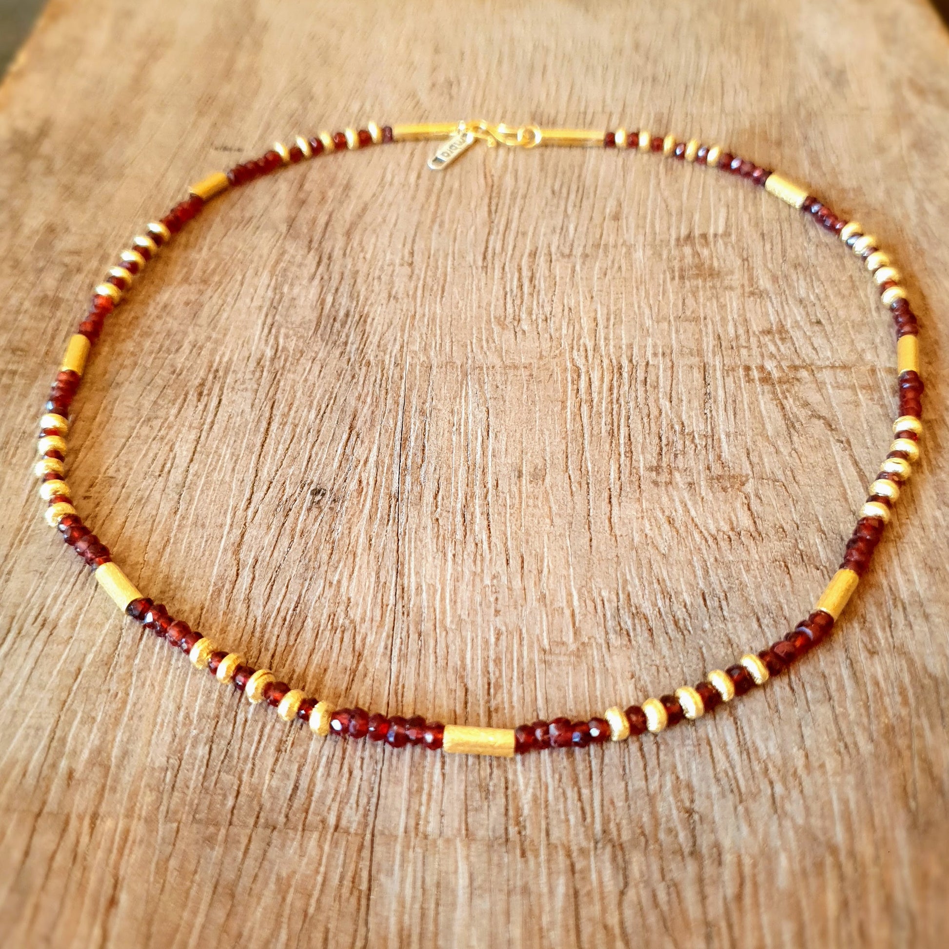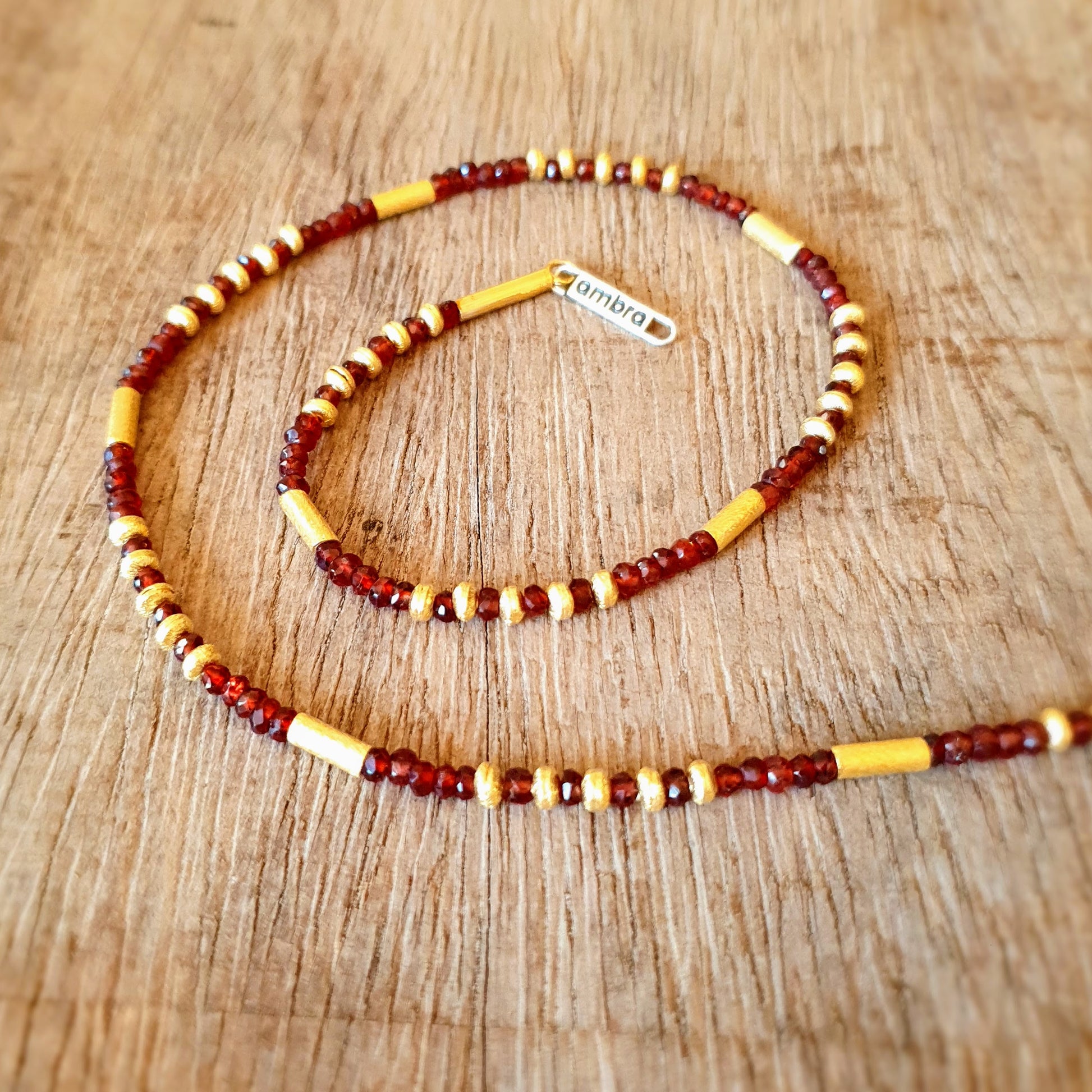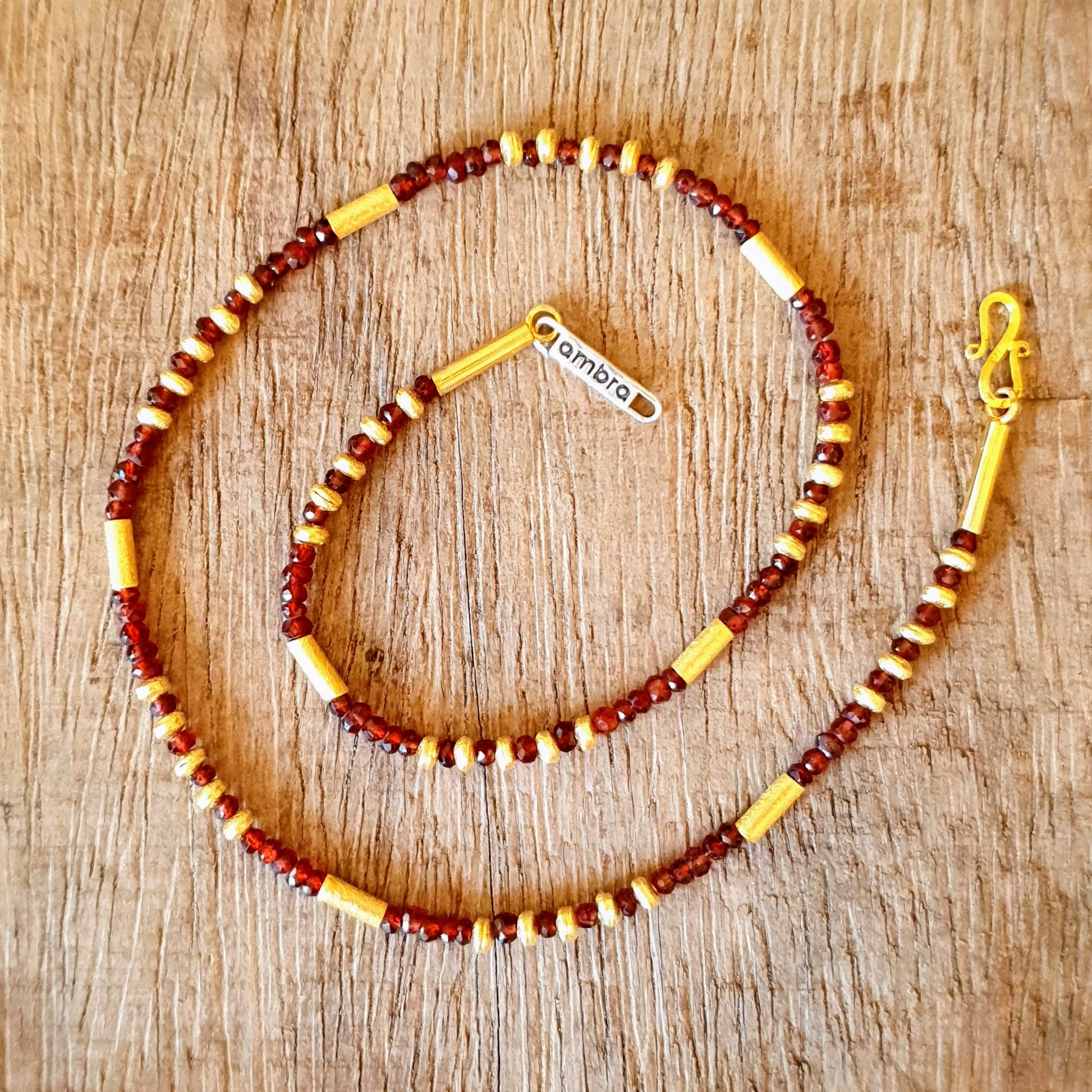 Feine handgearbeitete Halskette mit facettierten rotbraunen Granatsteinen und vergoldeten Silberperlen mit vergoldetem Silberverschluss von ambra Schmuck.