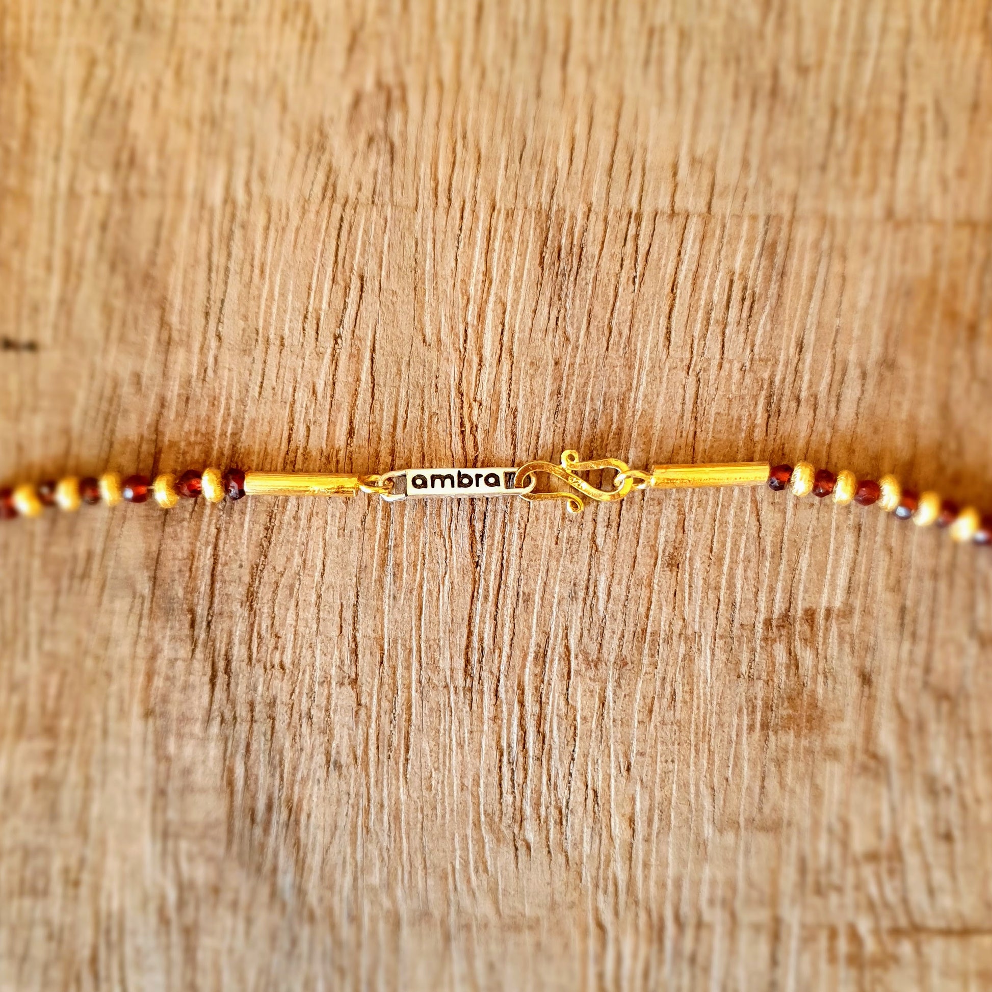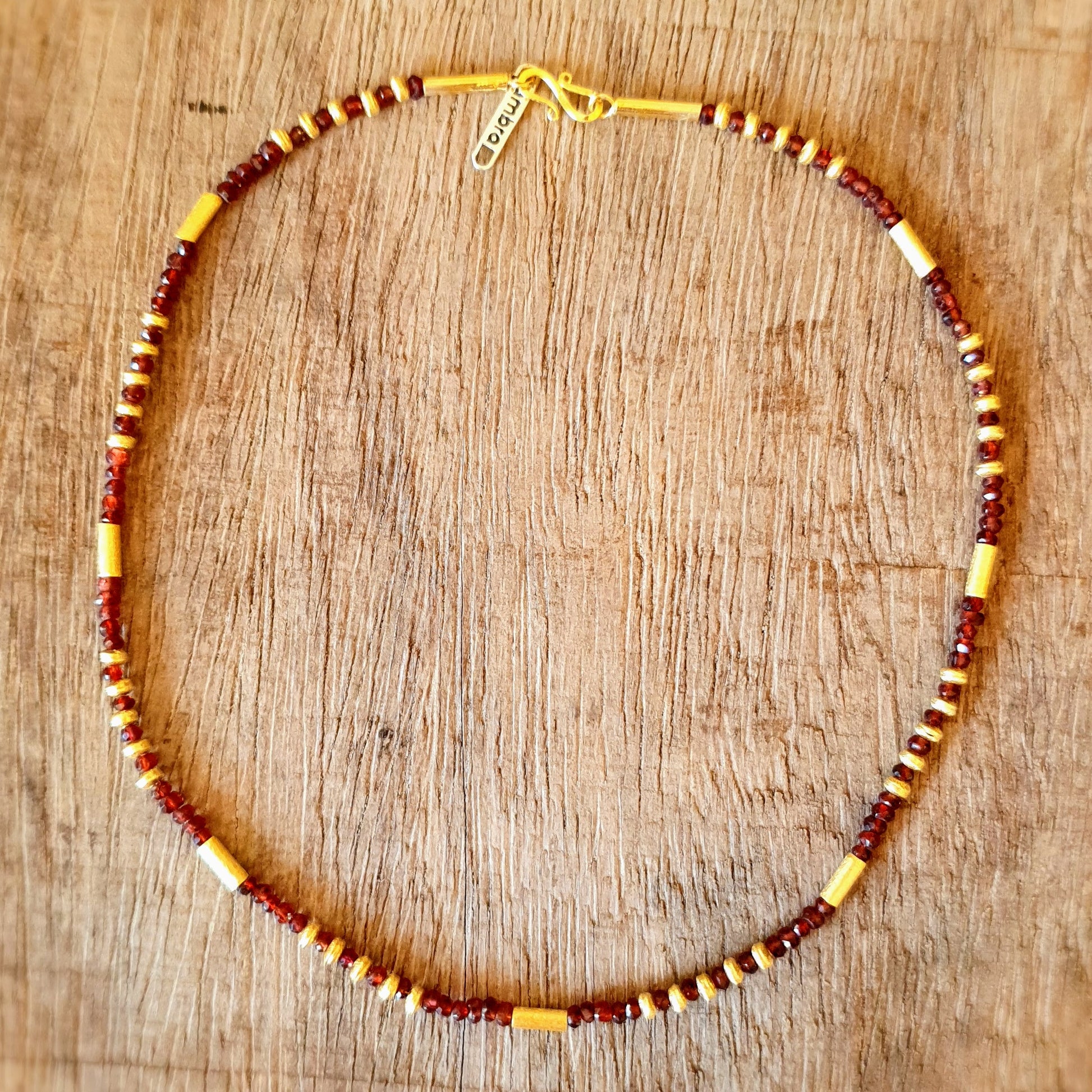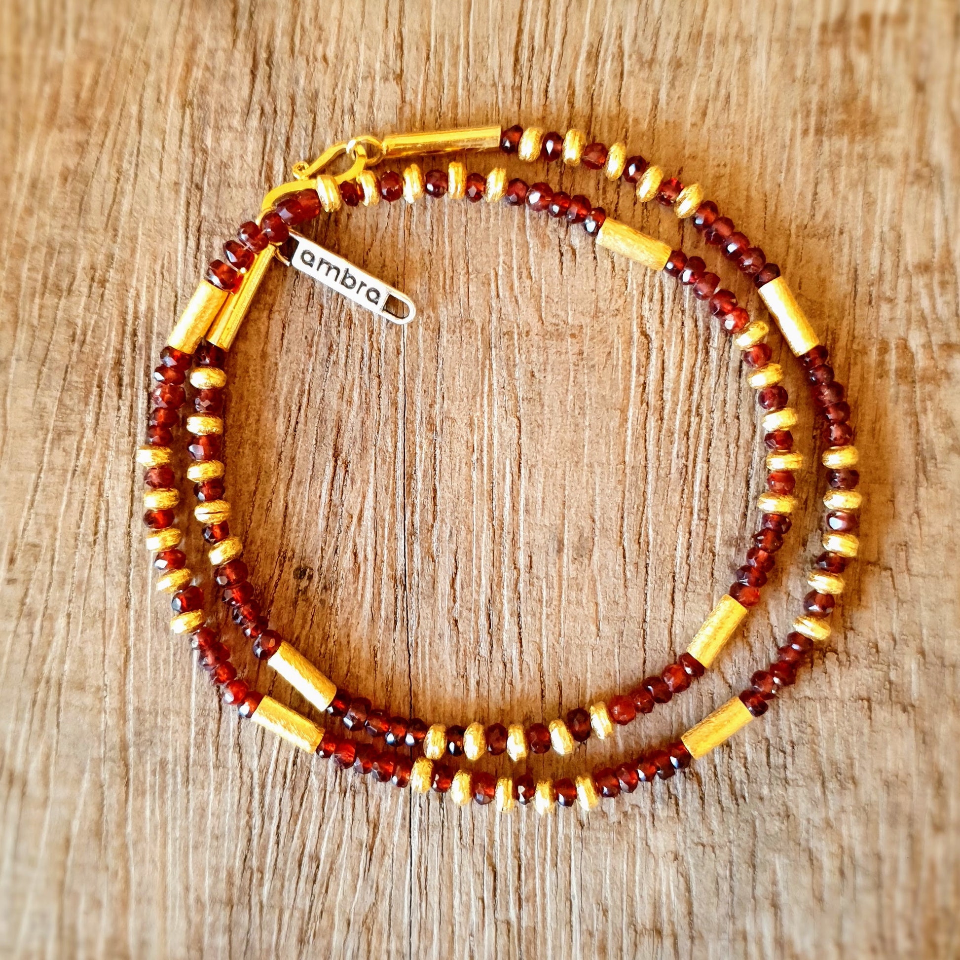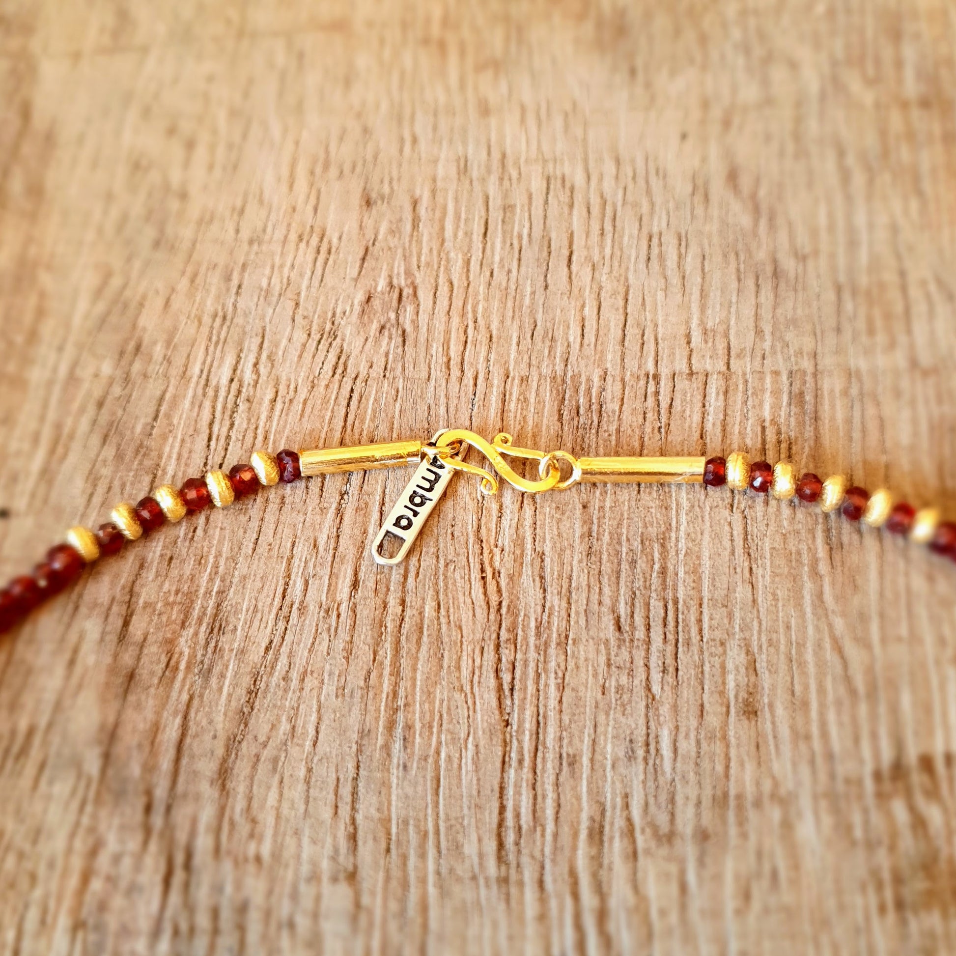 Feine handgearbeitete Halskette mit facettierten rotbraunen Granatsteinen und vergoldeten Silberperlen mit vergoldetem Silberverschluss von ambra Schmuck.