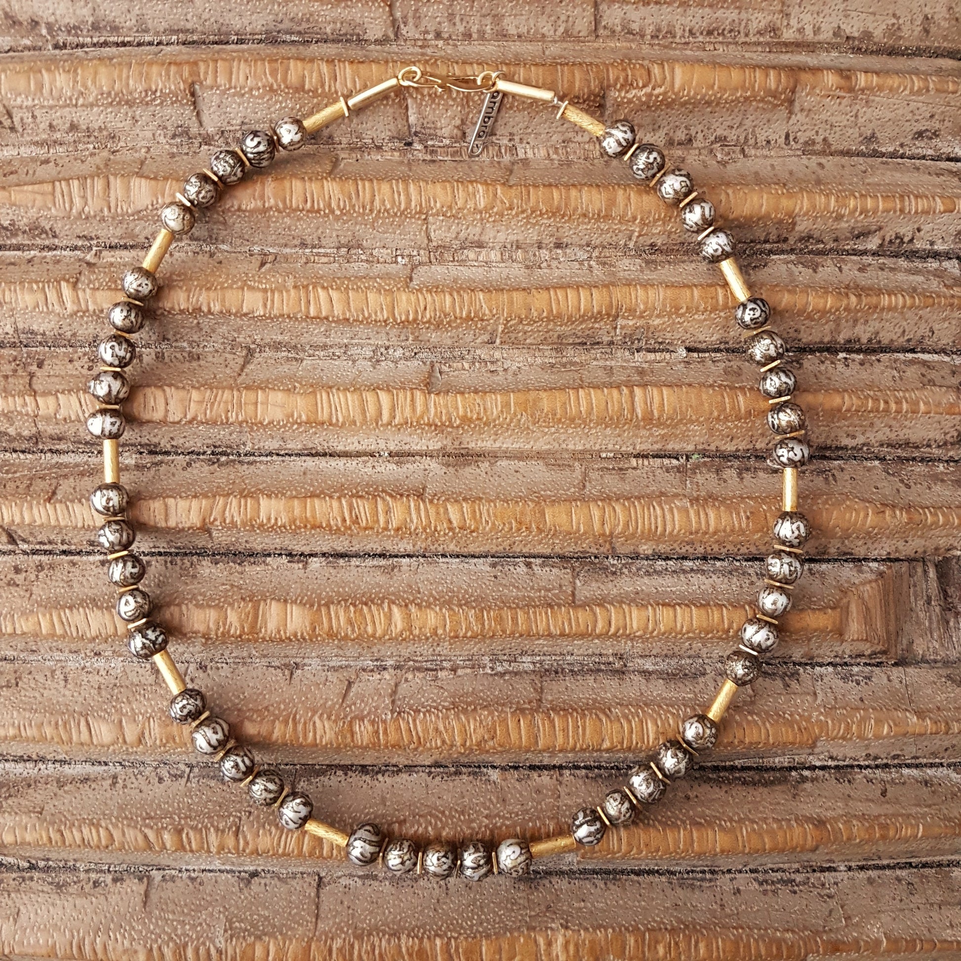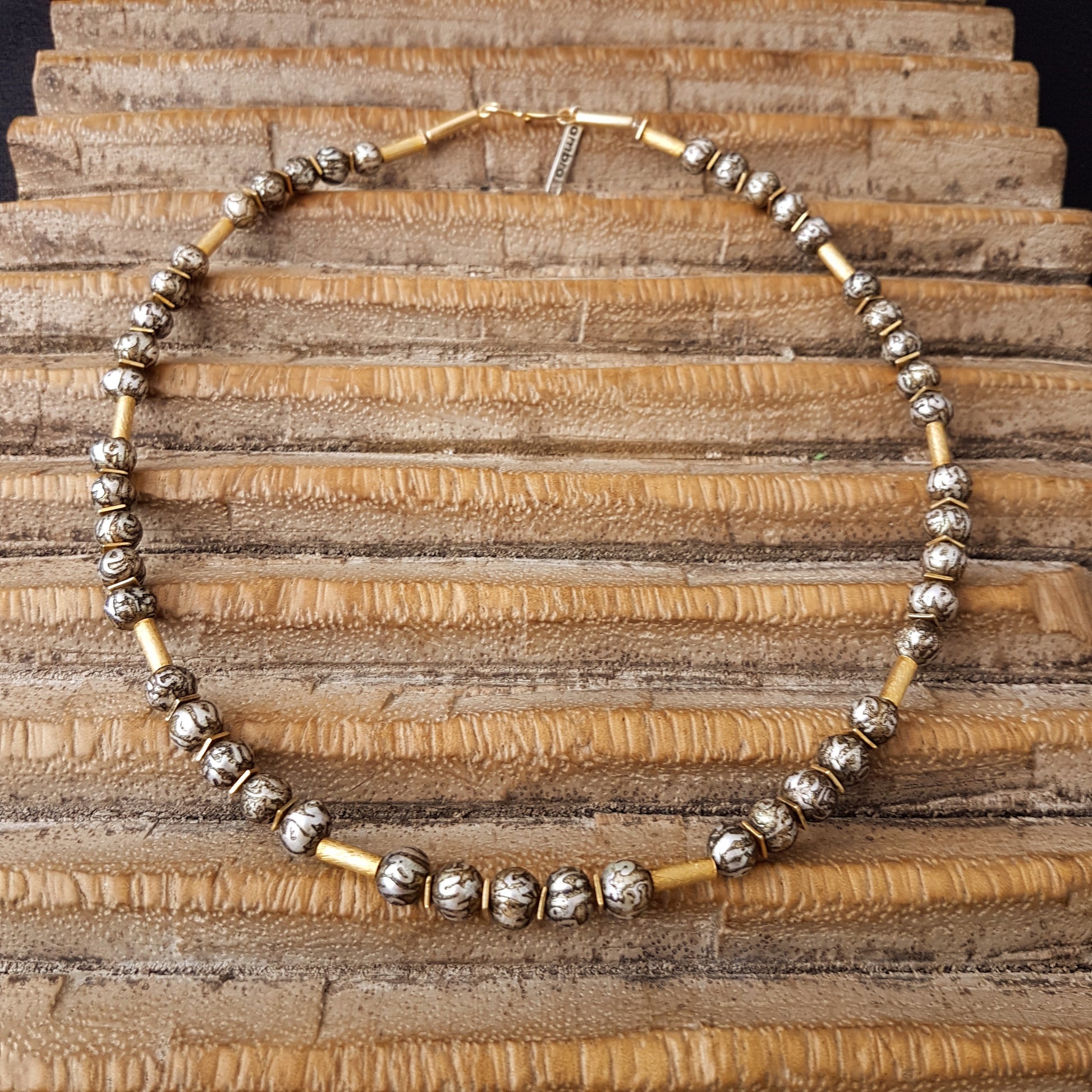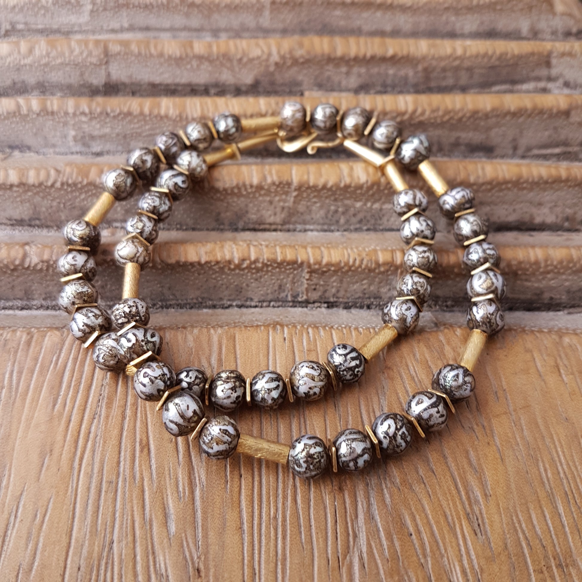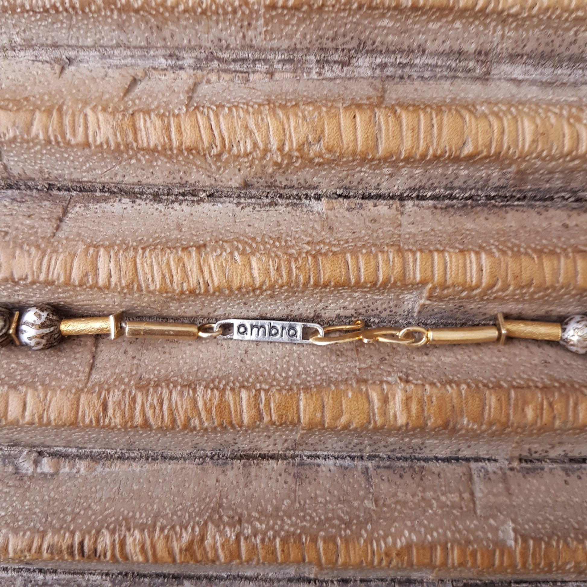 Elegant handcrafted necklace with carved cultured pearls from Nepal and matted gold-plated silver beads with gold-plated silver clasp by ambra Schmuck.