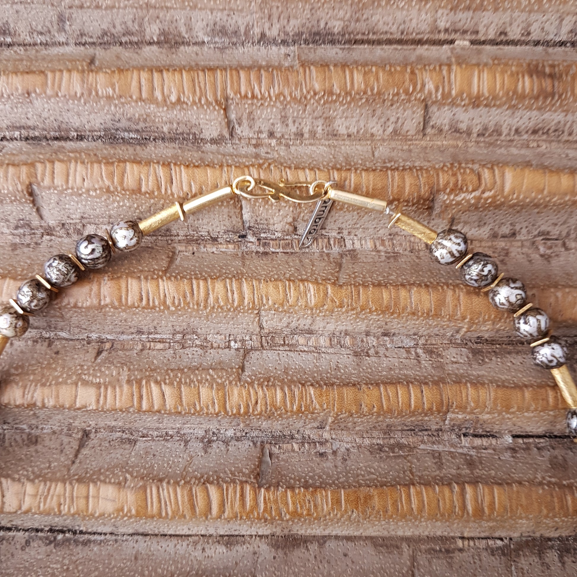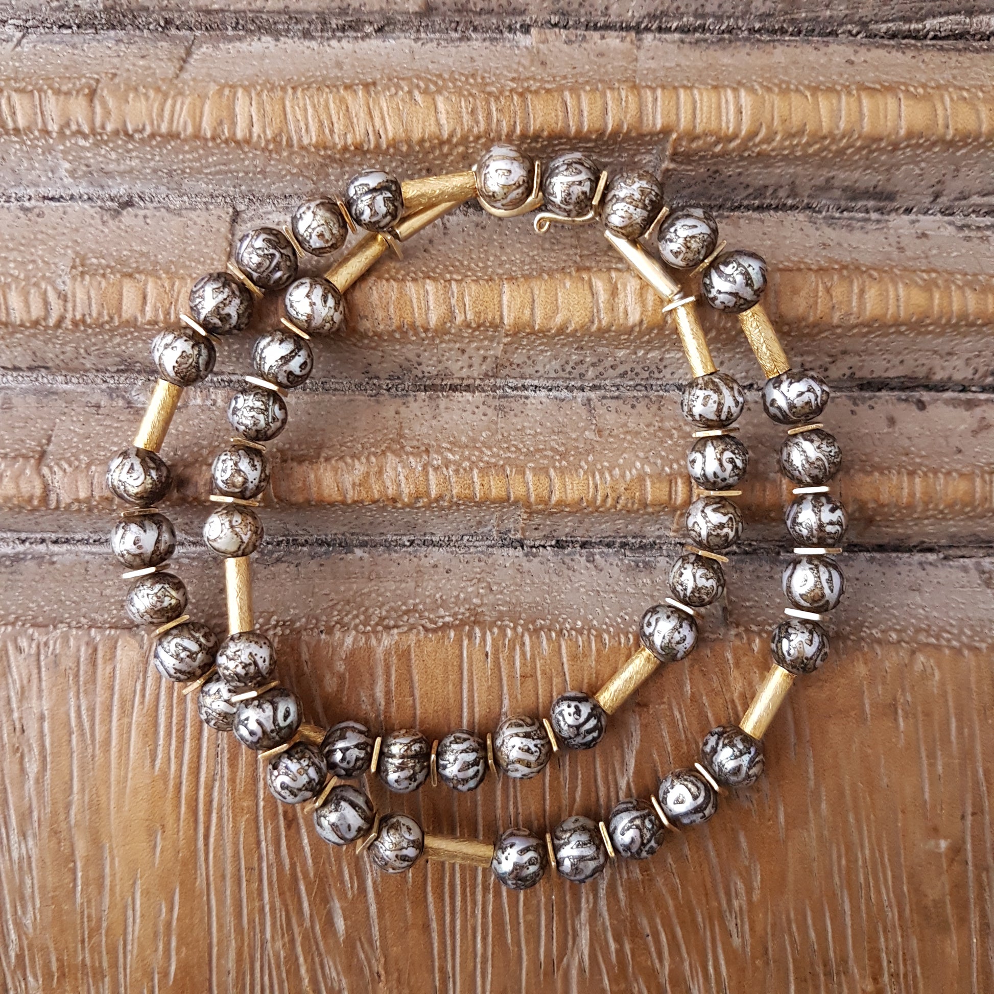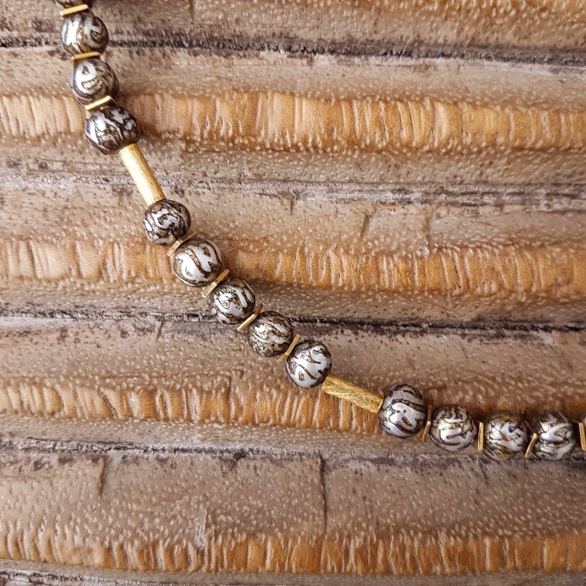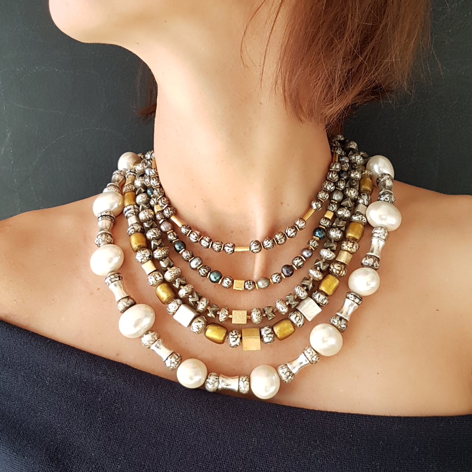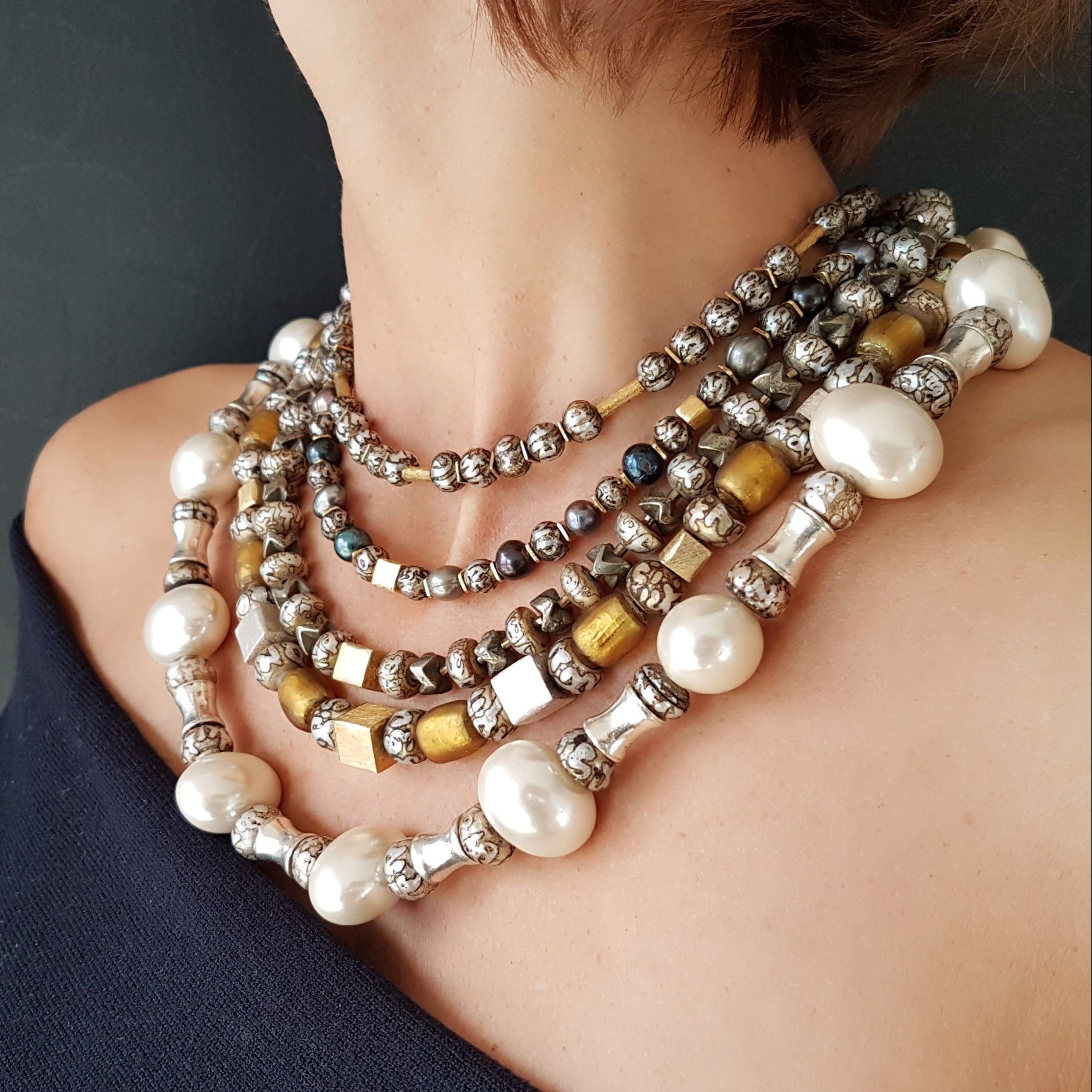 Elegant handcrafted necklace with carved cultured pearls from Nepal and matted gold-plated silver beads with gold-plated silver clasp by ambra Schmuck.