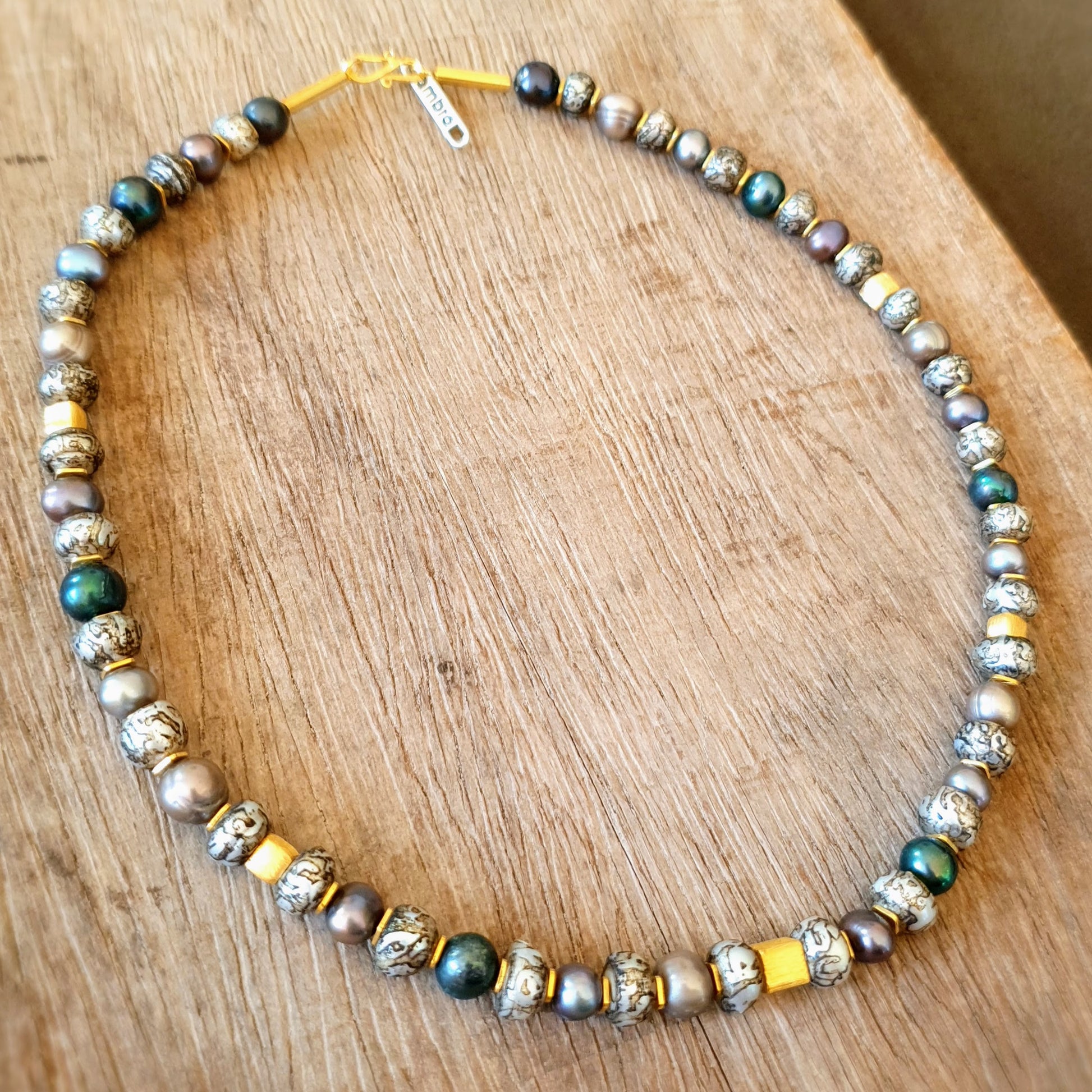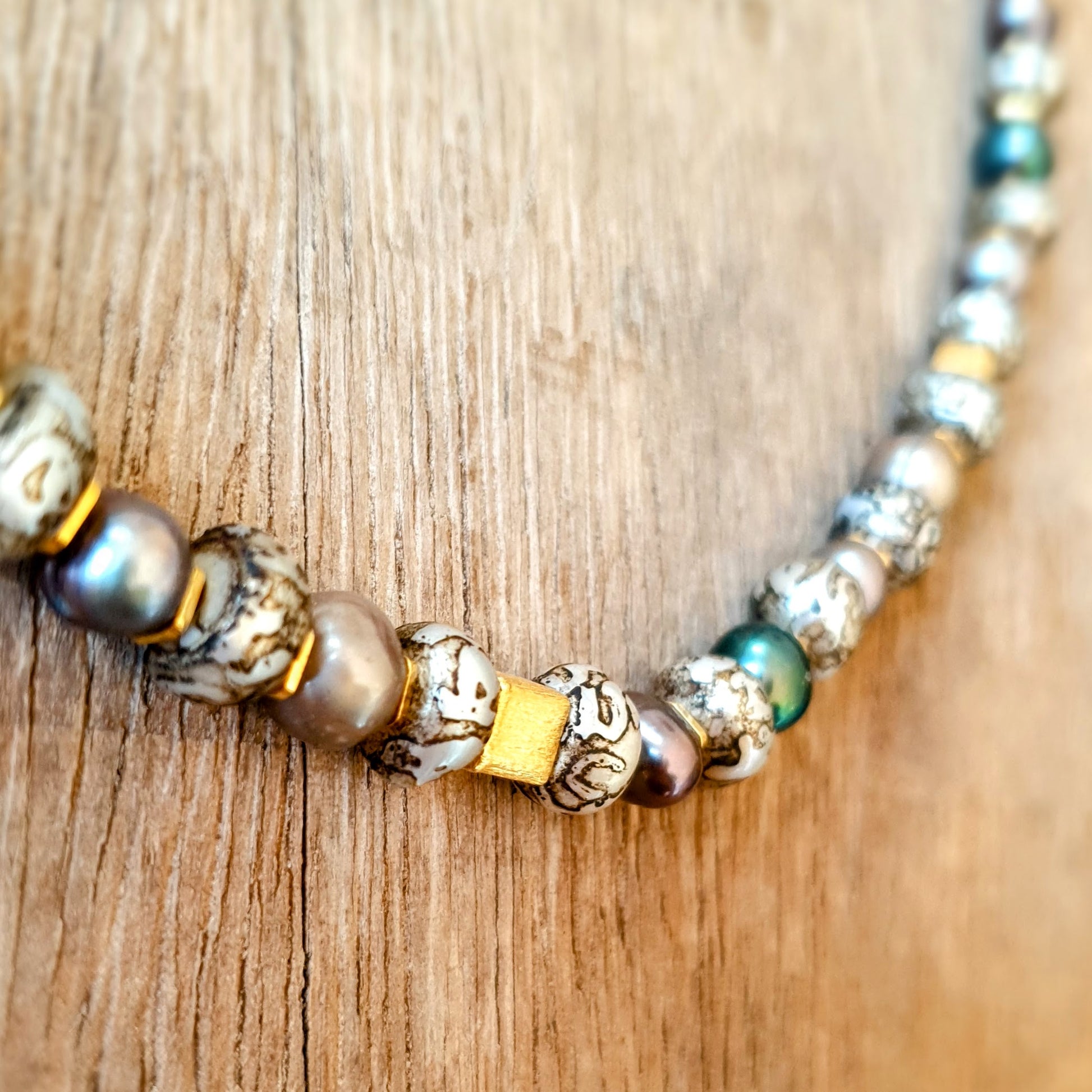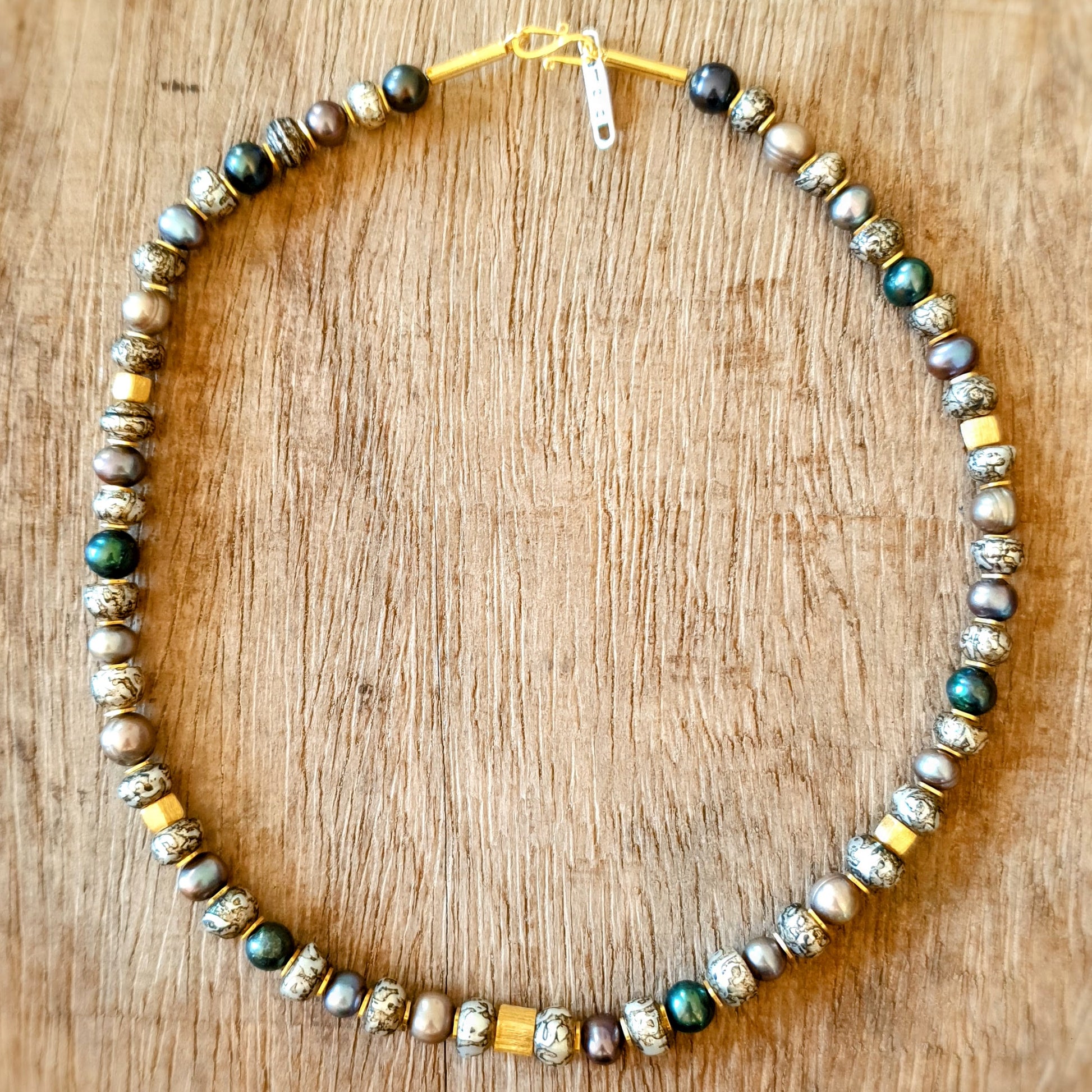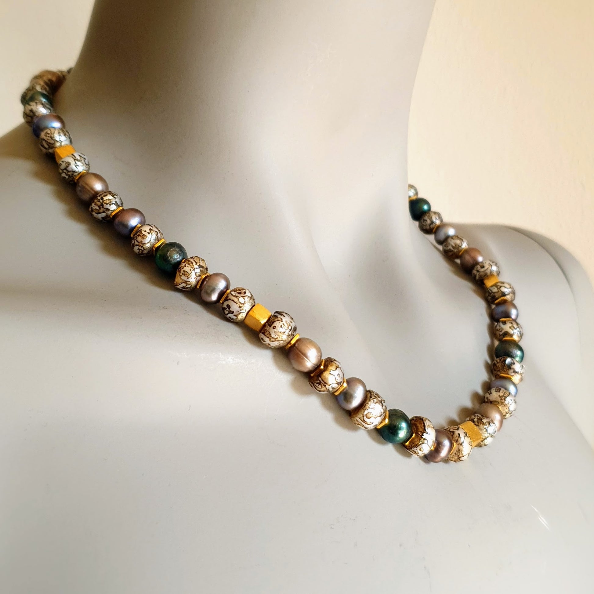 Elegant handcrafted necklace with carved cultured pearls from Nepal, various cultured pearls and matted gold-plated silver beads with gold-plated silver clasp by ambra Schmuck.