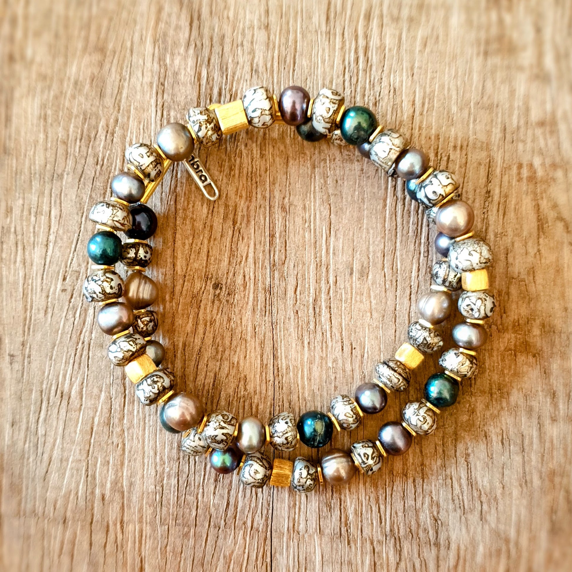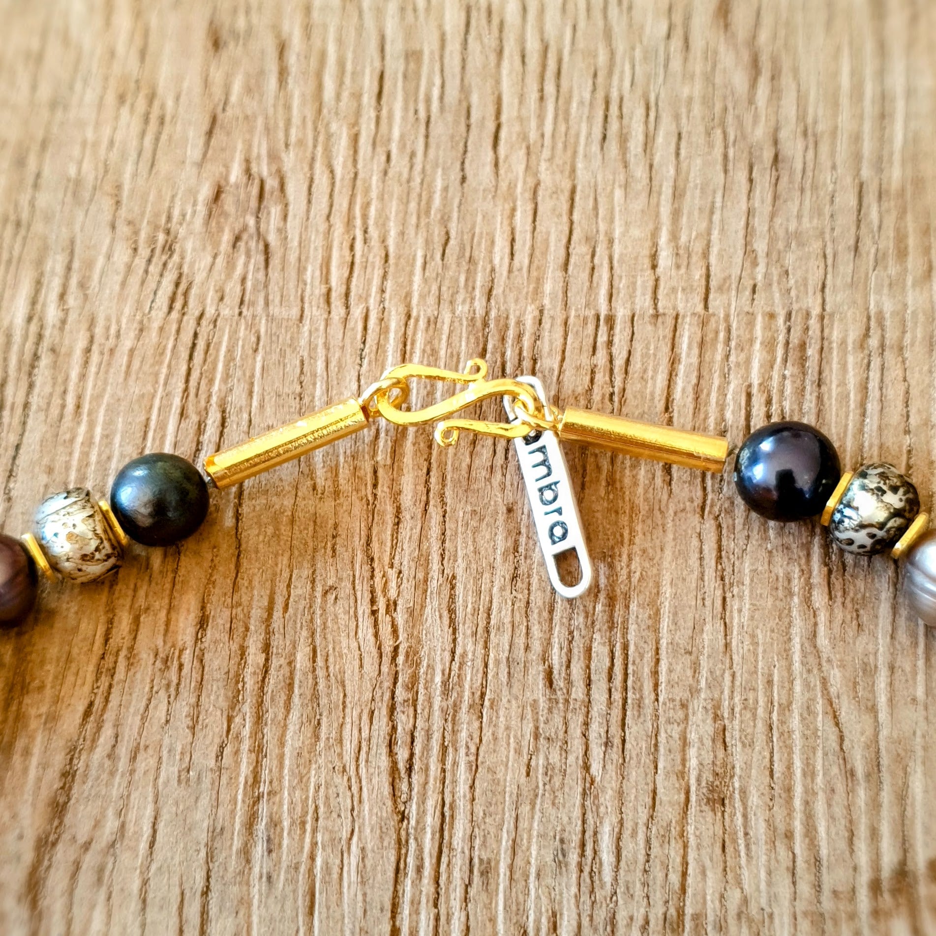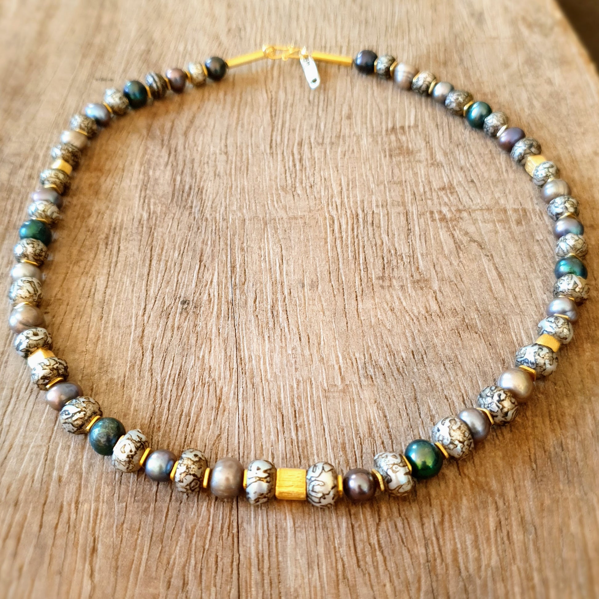 Elegant handcrafted necklace with carved cultured pearls from Nepal, various cultured pearls and matted gold-plated silver beads with gold-plated silver clasp by ambra Schmuck.