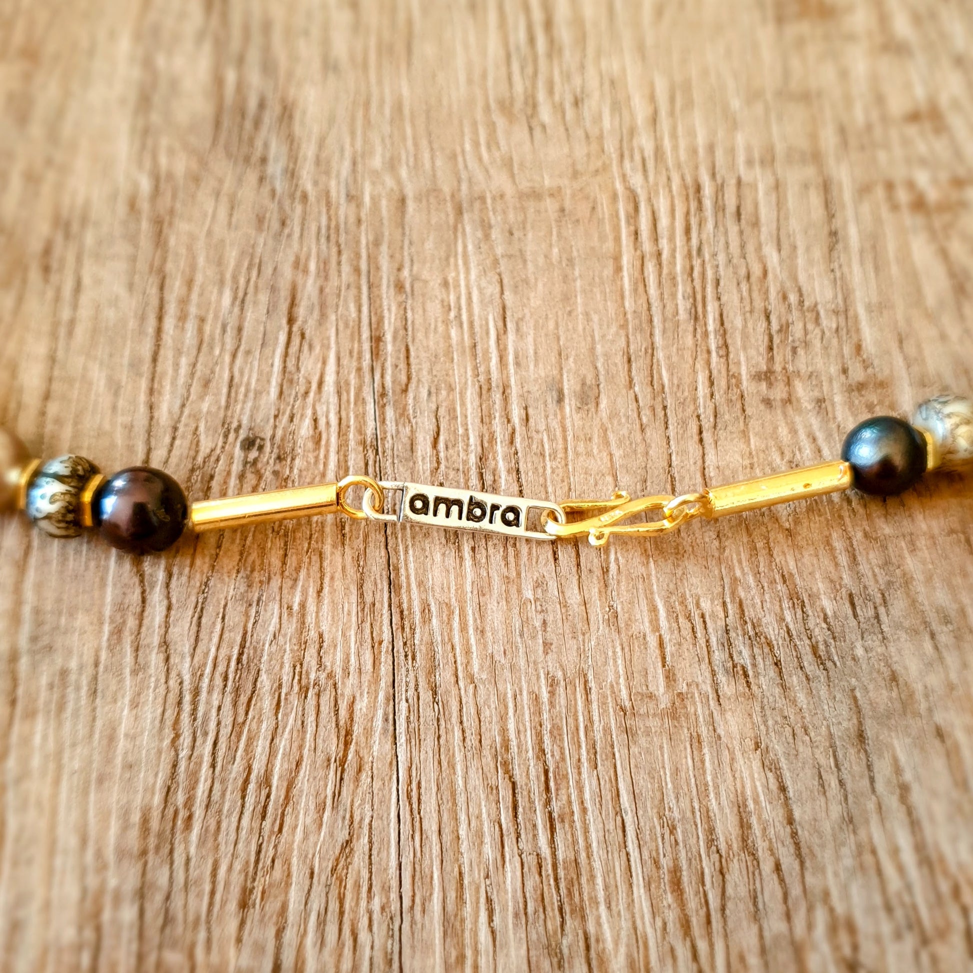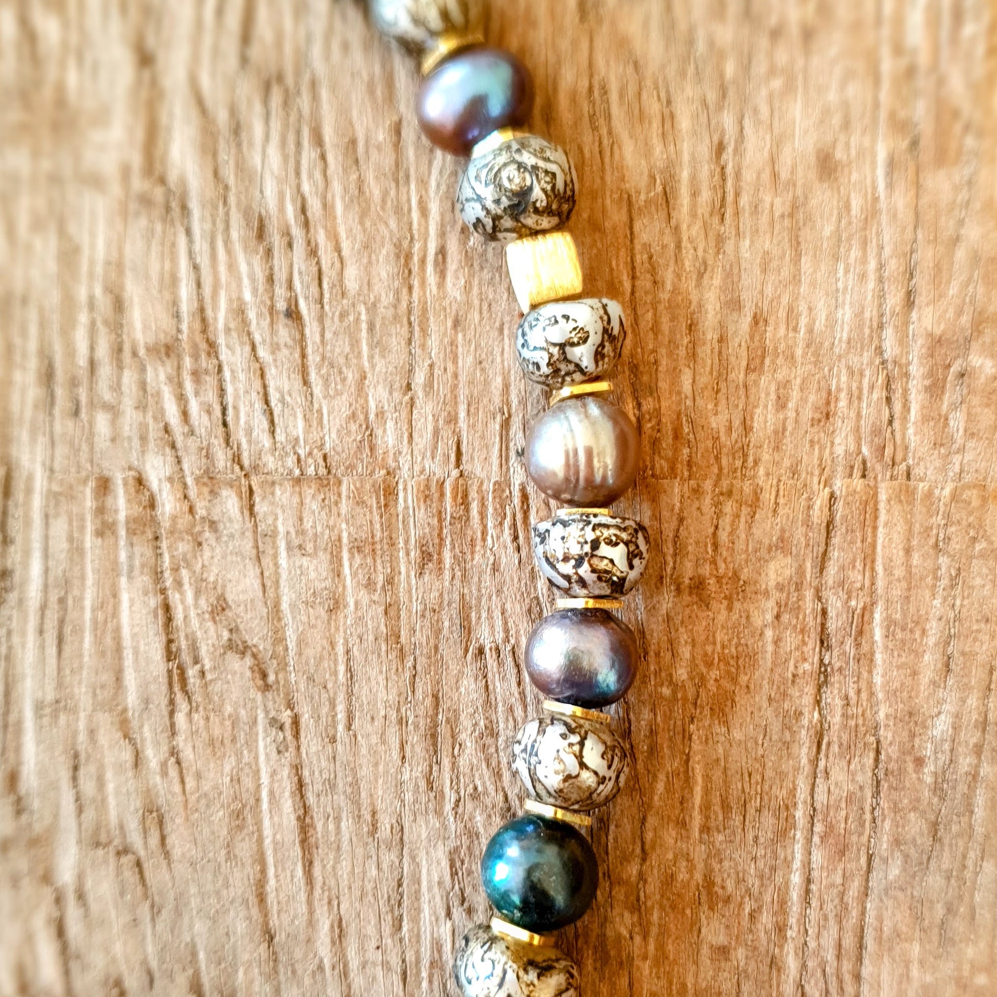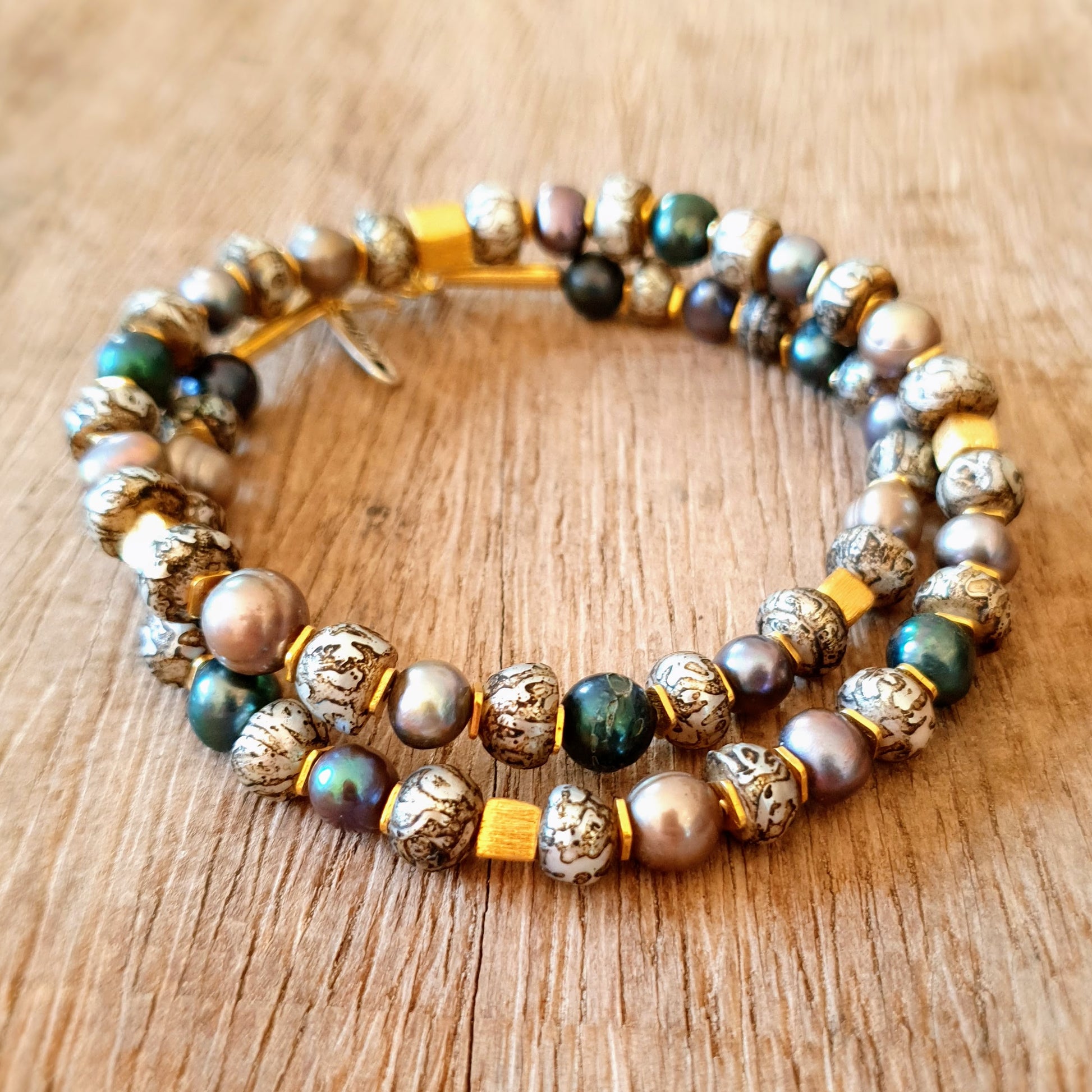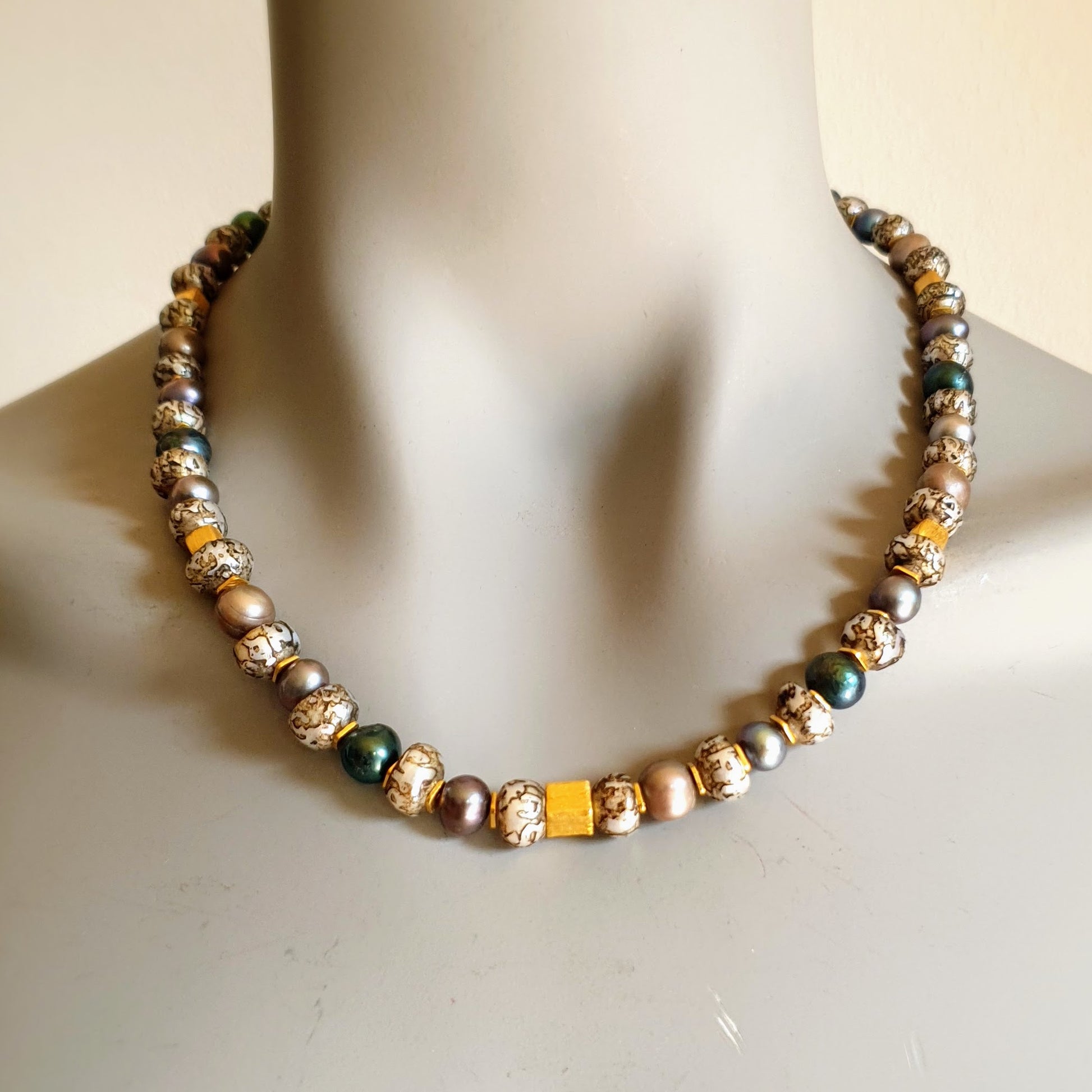 Elegant handcrafted necklace with carved cultured pearls from Nepal, various cultured pearls and matted gold-plated silver beads with gold-plated silver clasp by ambra Schmuck.