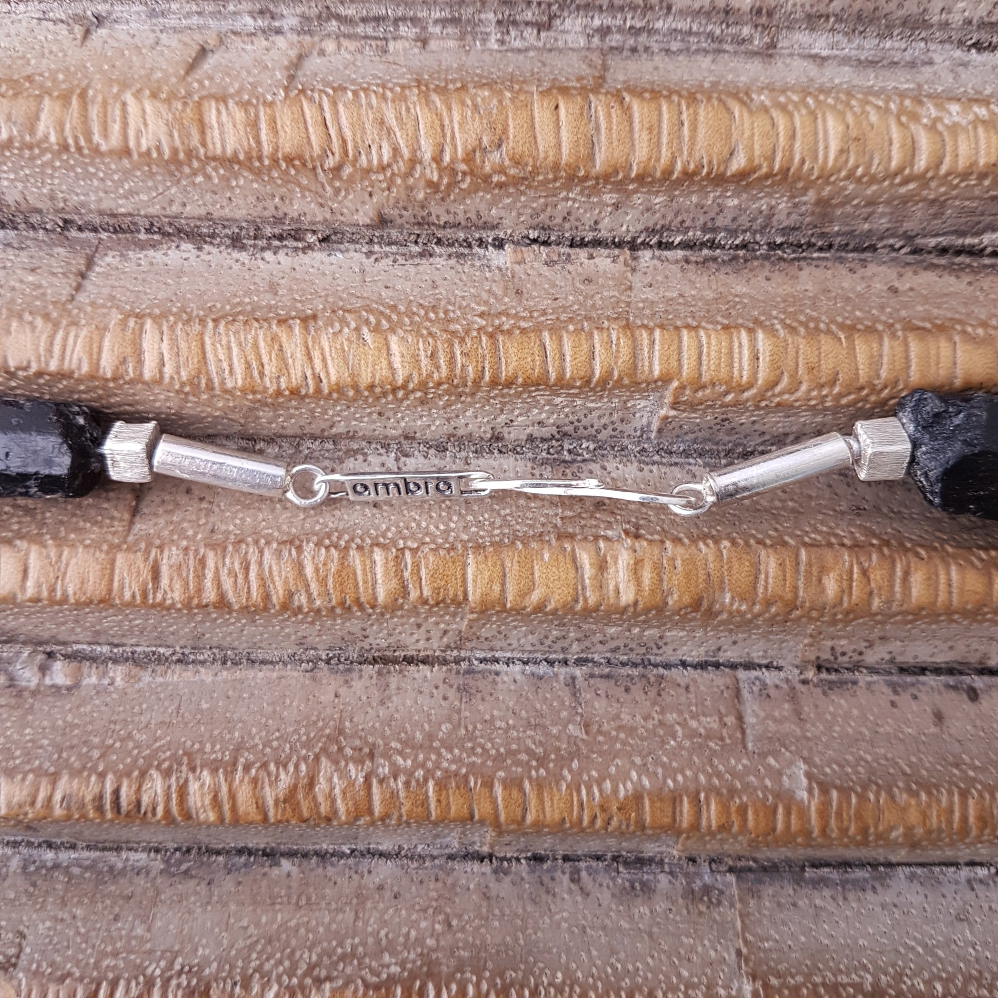 Handgearbeitete Halskette mit rohen ungeschliffenen Turmalinsteinen zwischen geradlinigen mattierten Silberelementen mit Silberverschluss von ambra Schmuck.