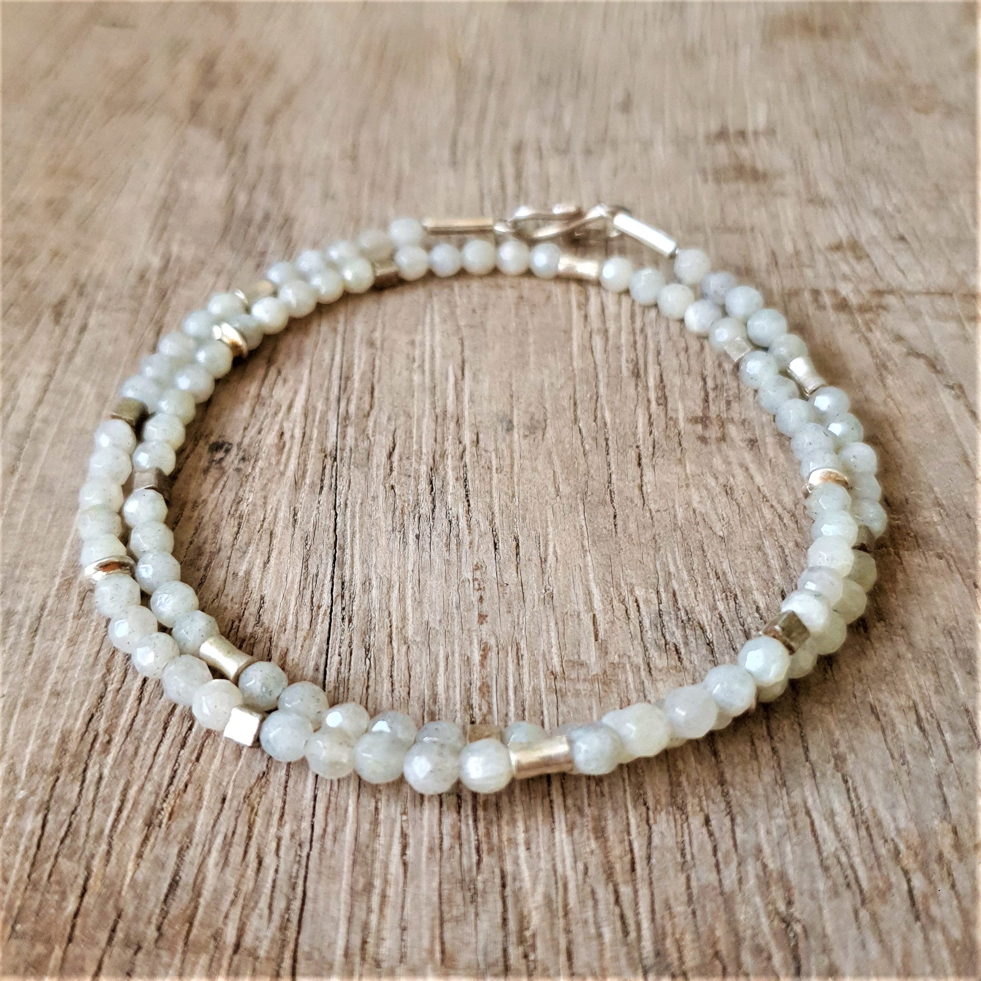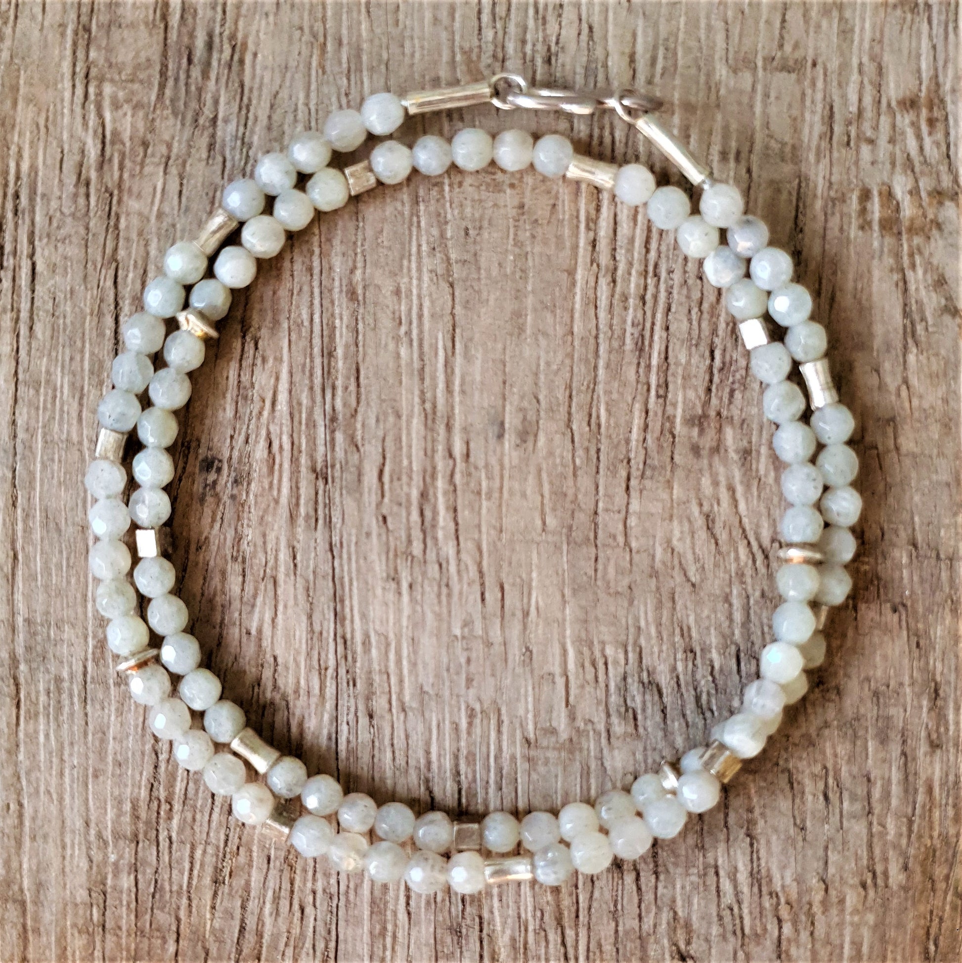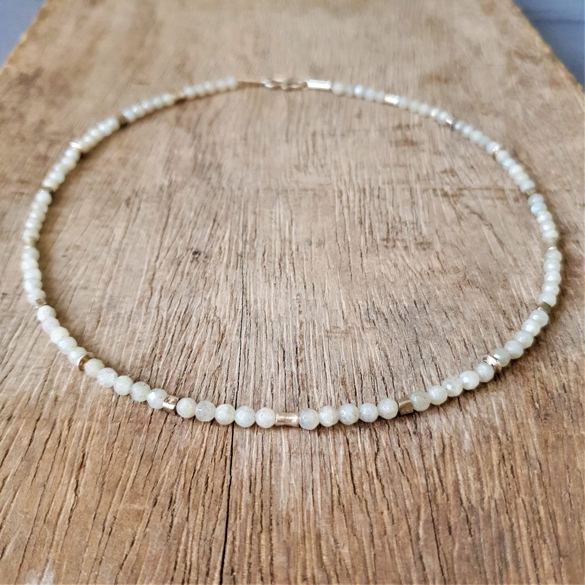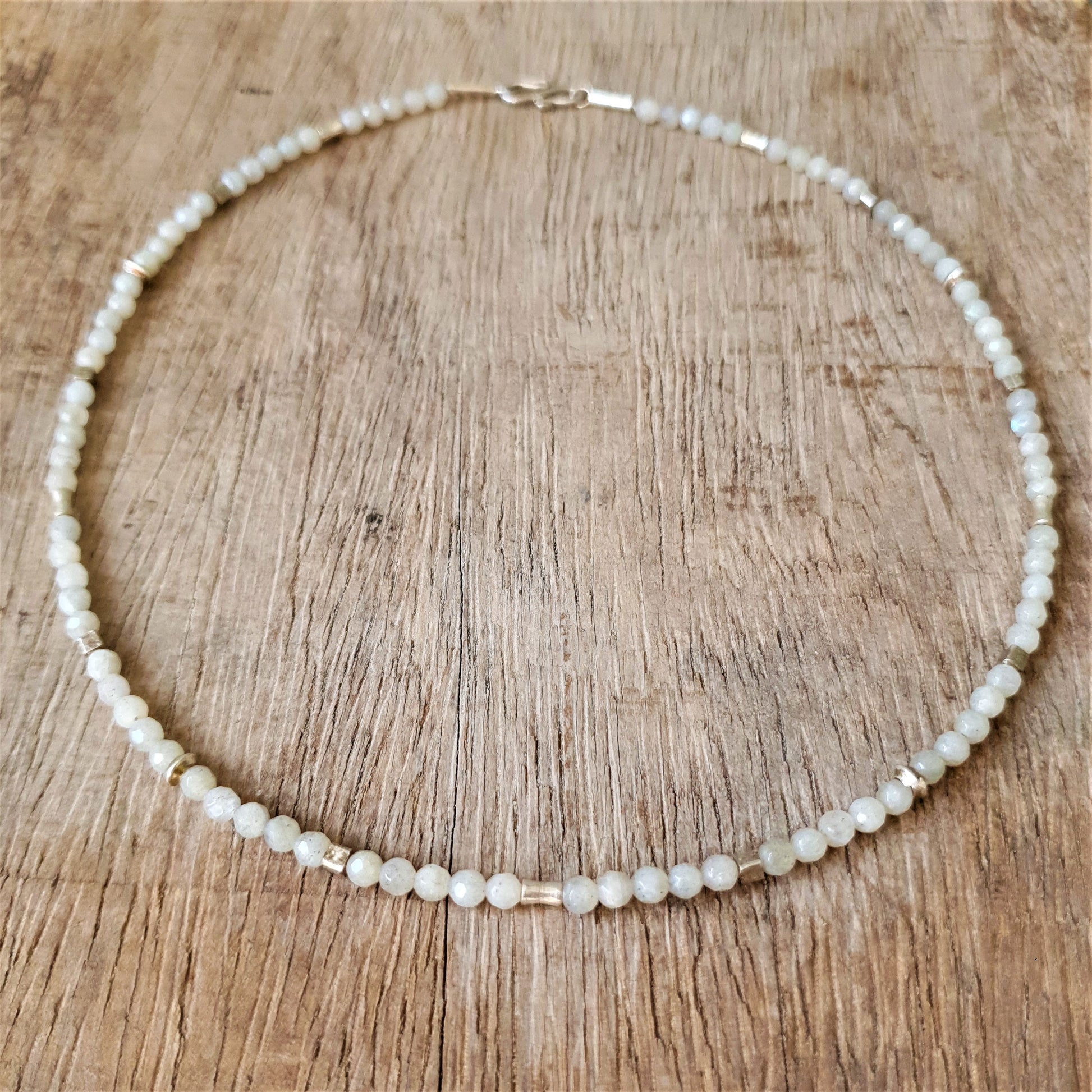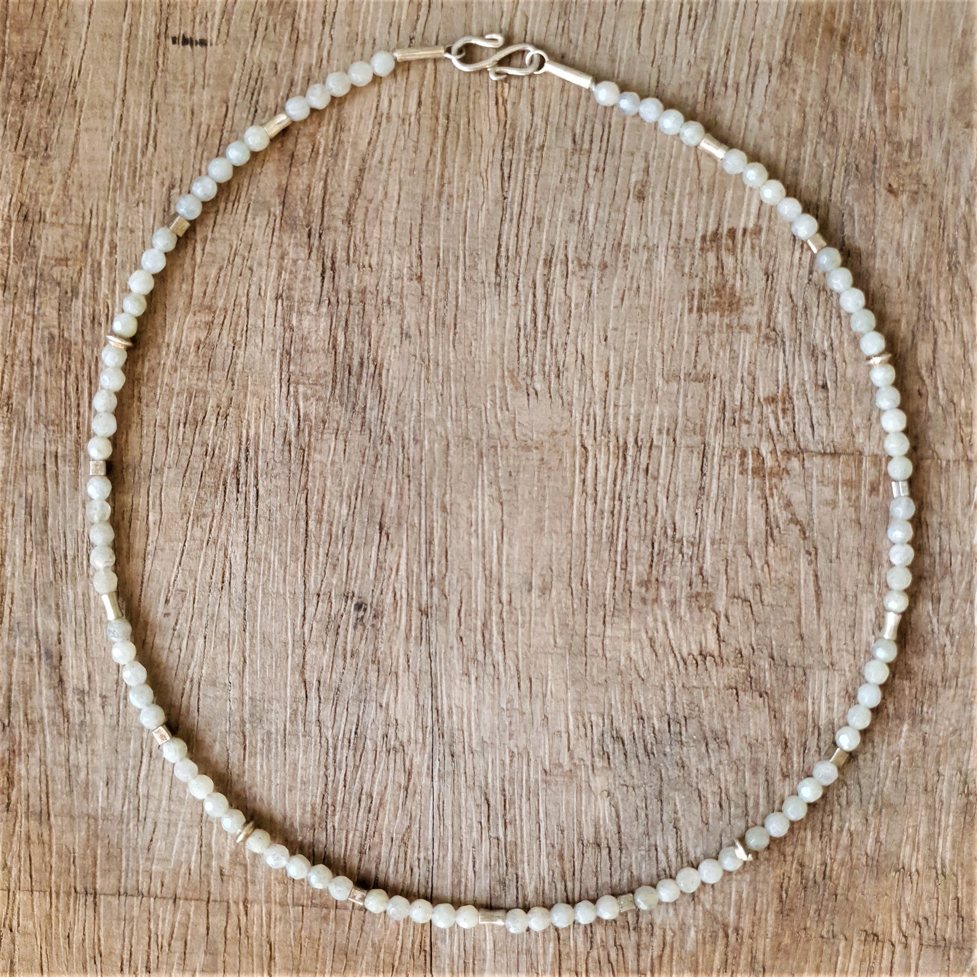 Handcrafted necklace with white faceted rainbow moonstones and Burmese silver beads with silver clasp by ambra Schmuck.
