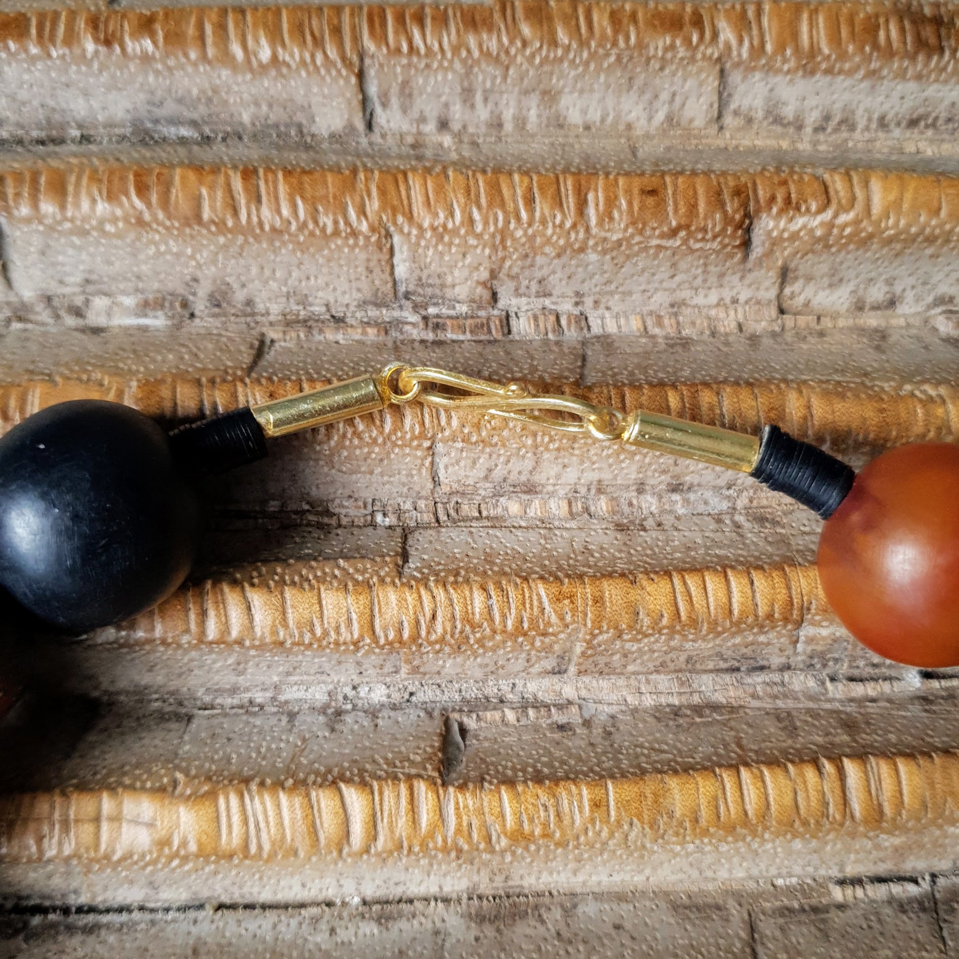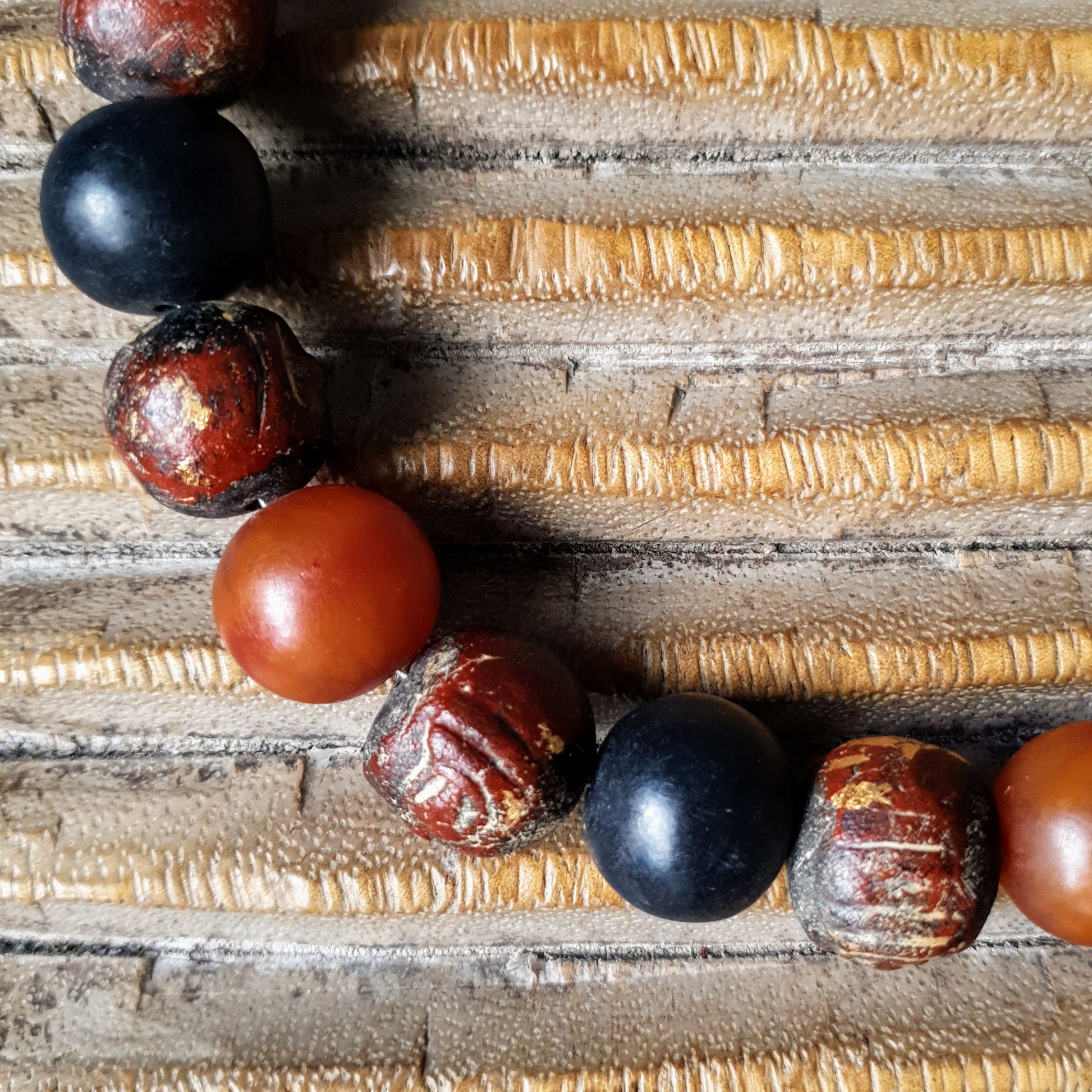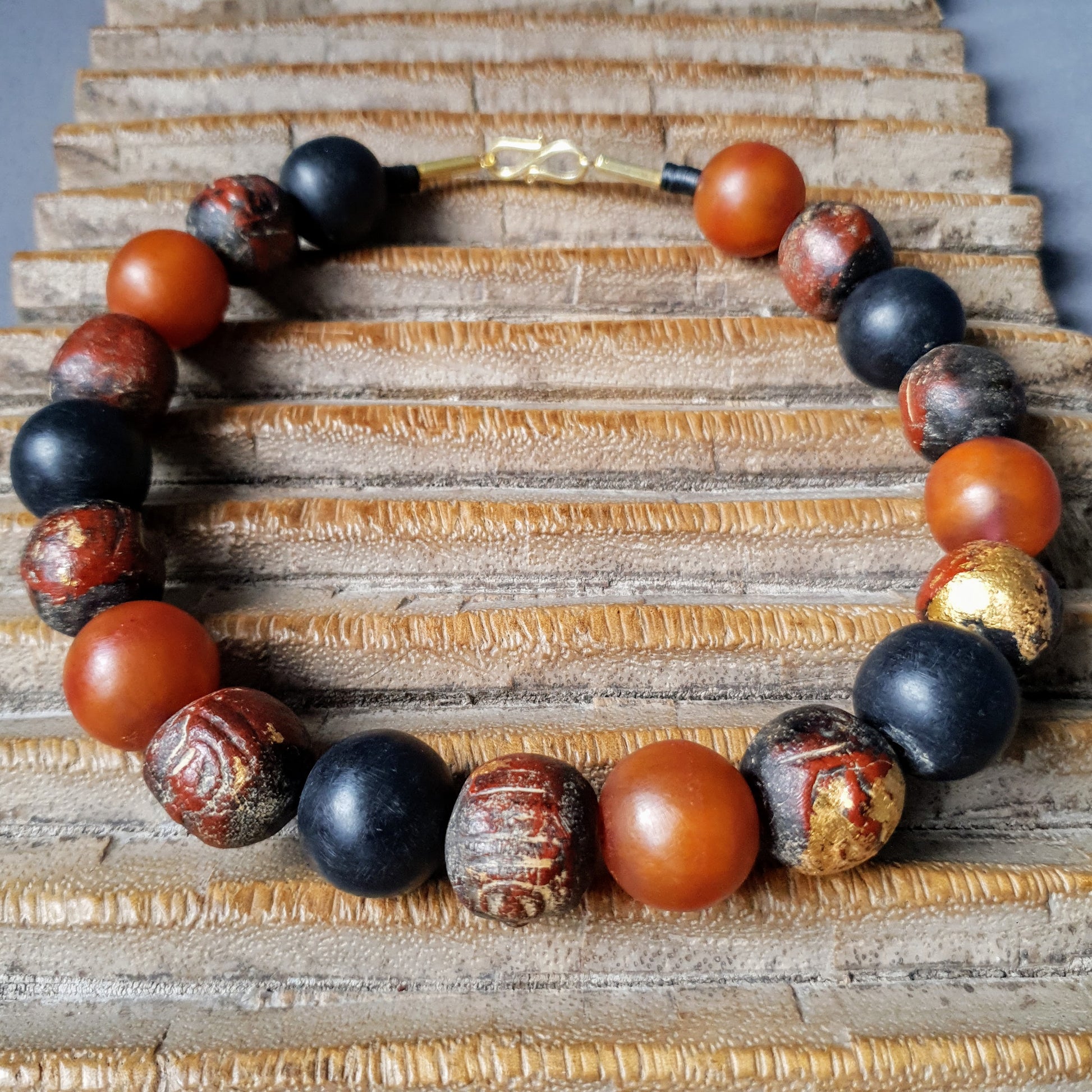 Handcrafted necklace with clay beads decorated with gold leaf , Buddha beads from Burmese prayer malas and resin beads from Indonesia in brown and black with gold-plated silver clasp by ambra Schmuck.