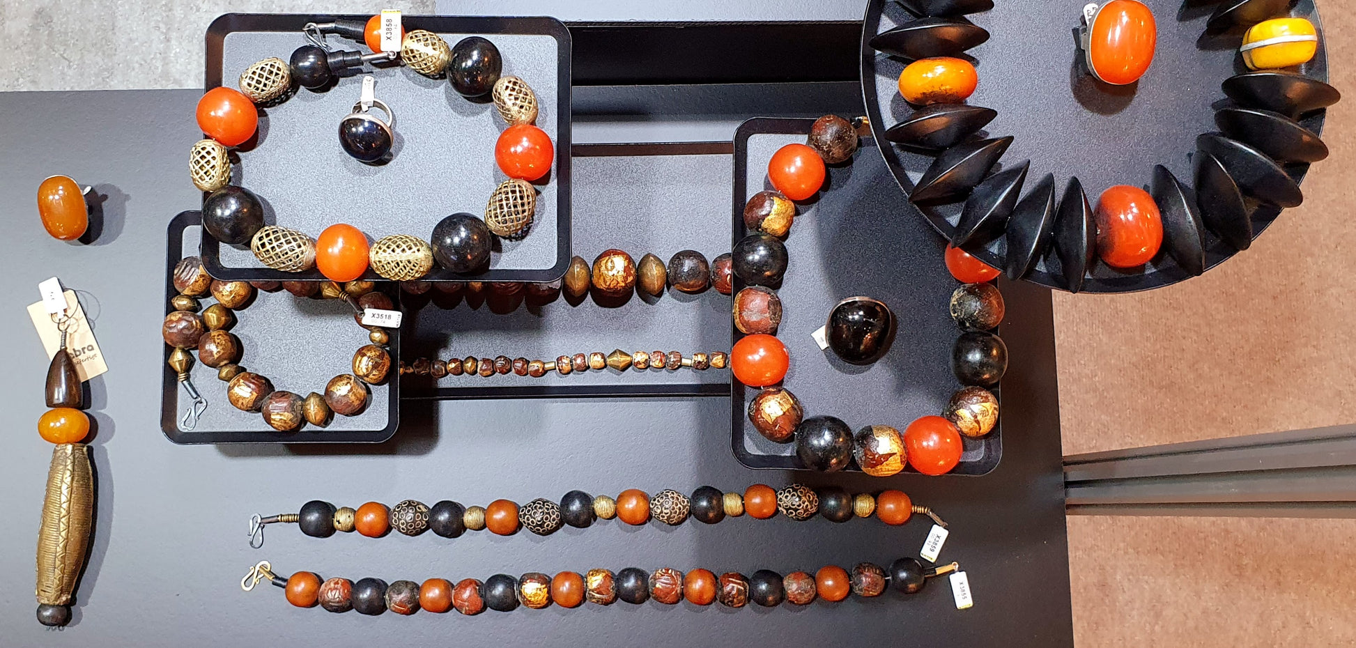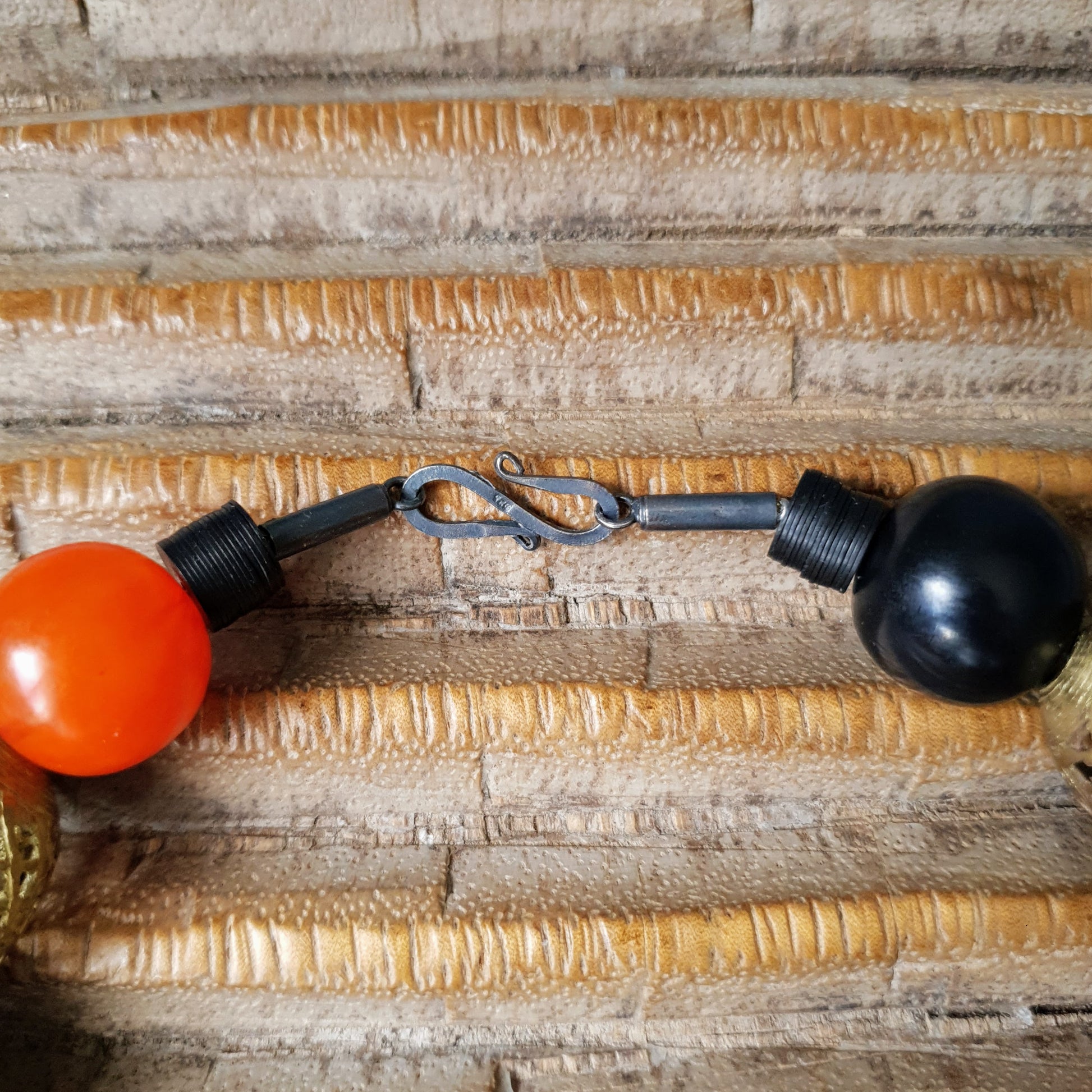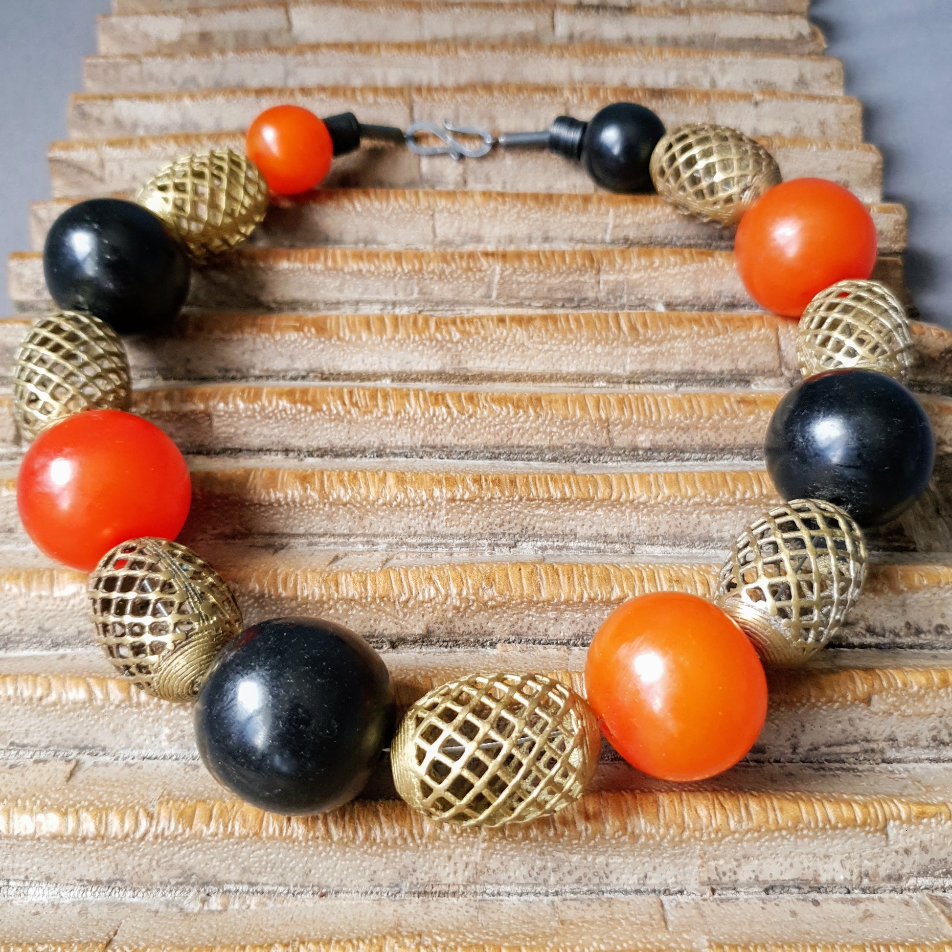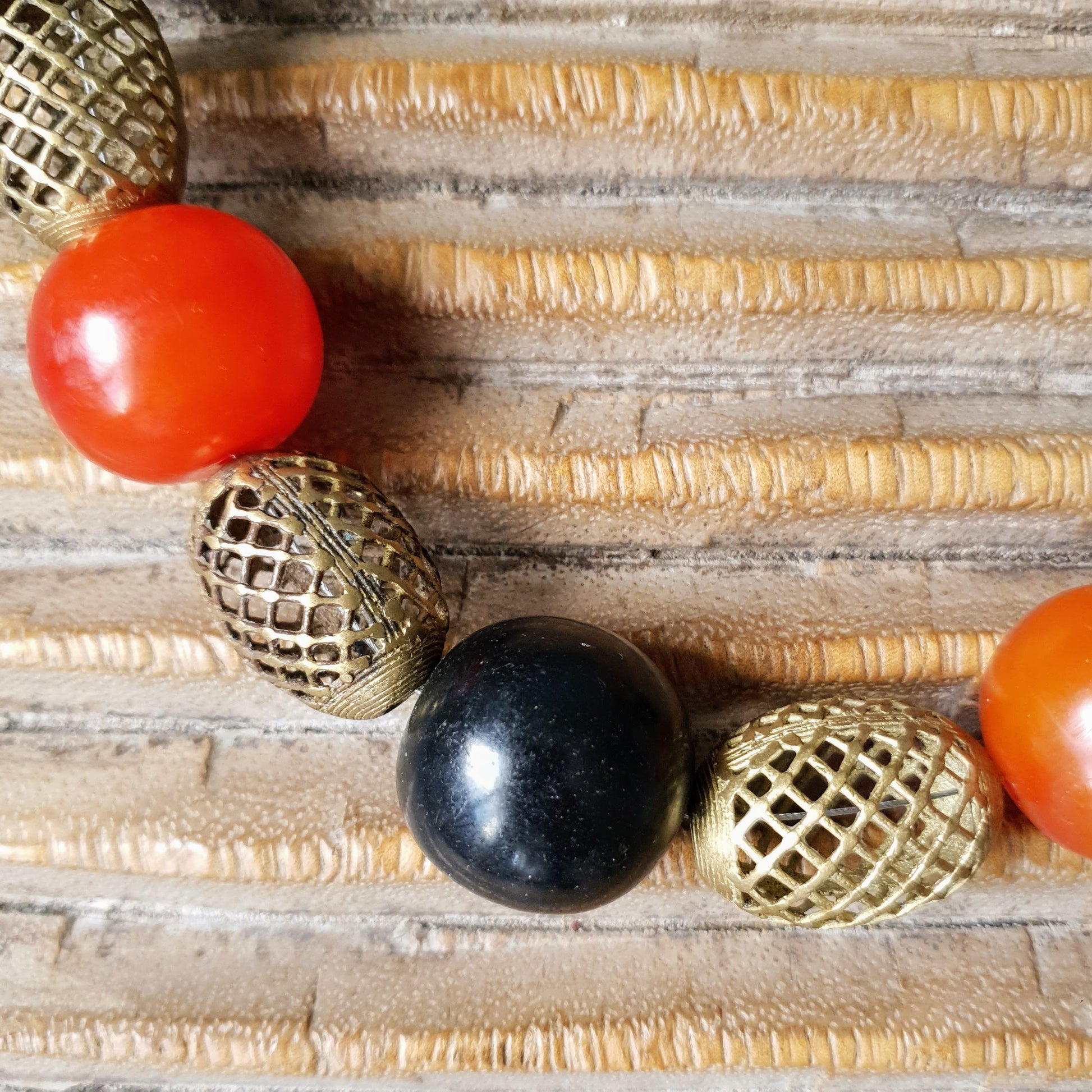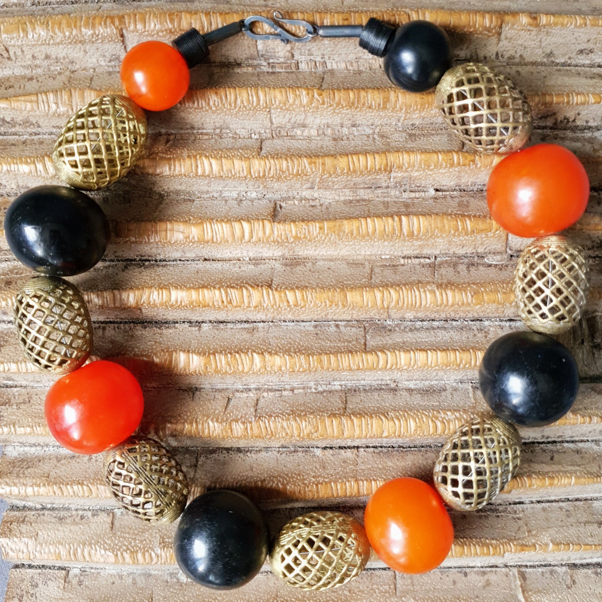 Large handcrafted necklace with resin beads from Indonesia in orange and black and Ashanti bronze beads made using the wax melting technique with oxidized silver clasp by ambra Schmuck.
