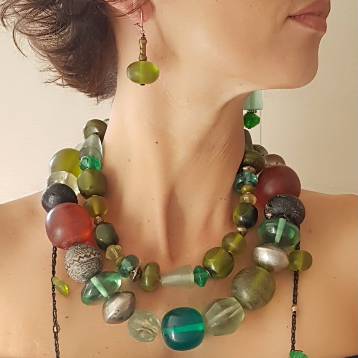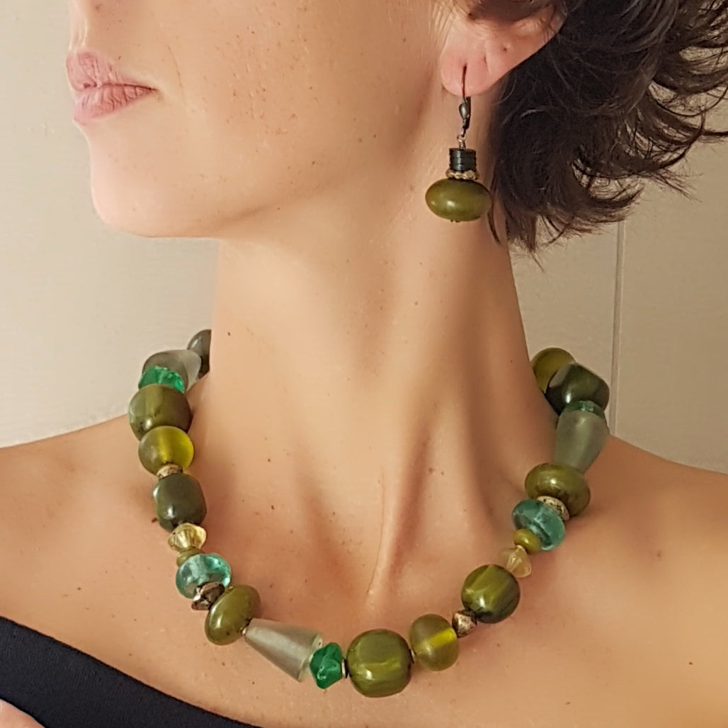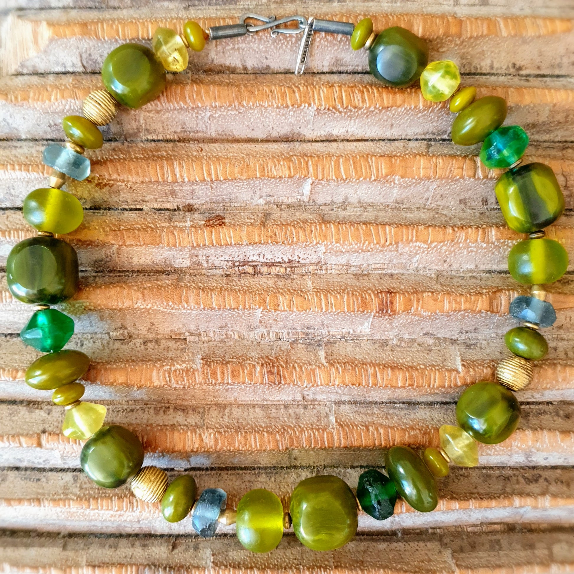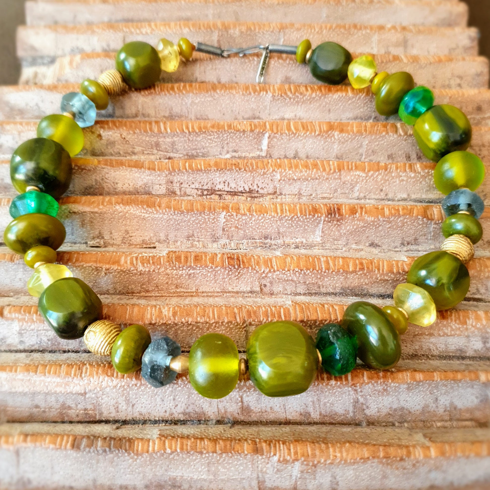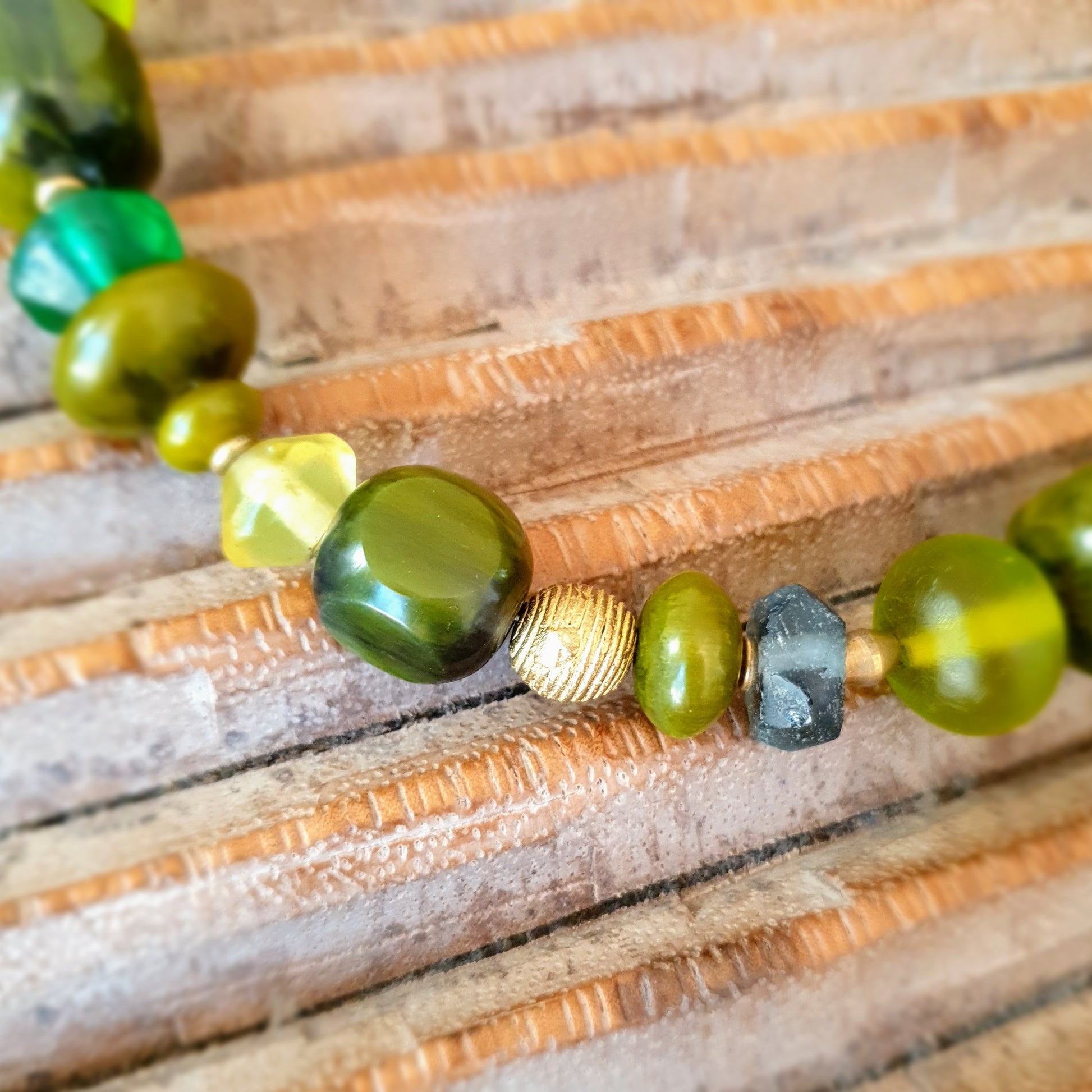 Handcrafted necklace with Indonesian resin beads in different shades of green, faceted glass beads from Africa and Indonesia and Indian bronze beads with oxidized silver clasp by ambra Schmuck.