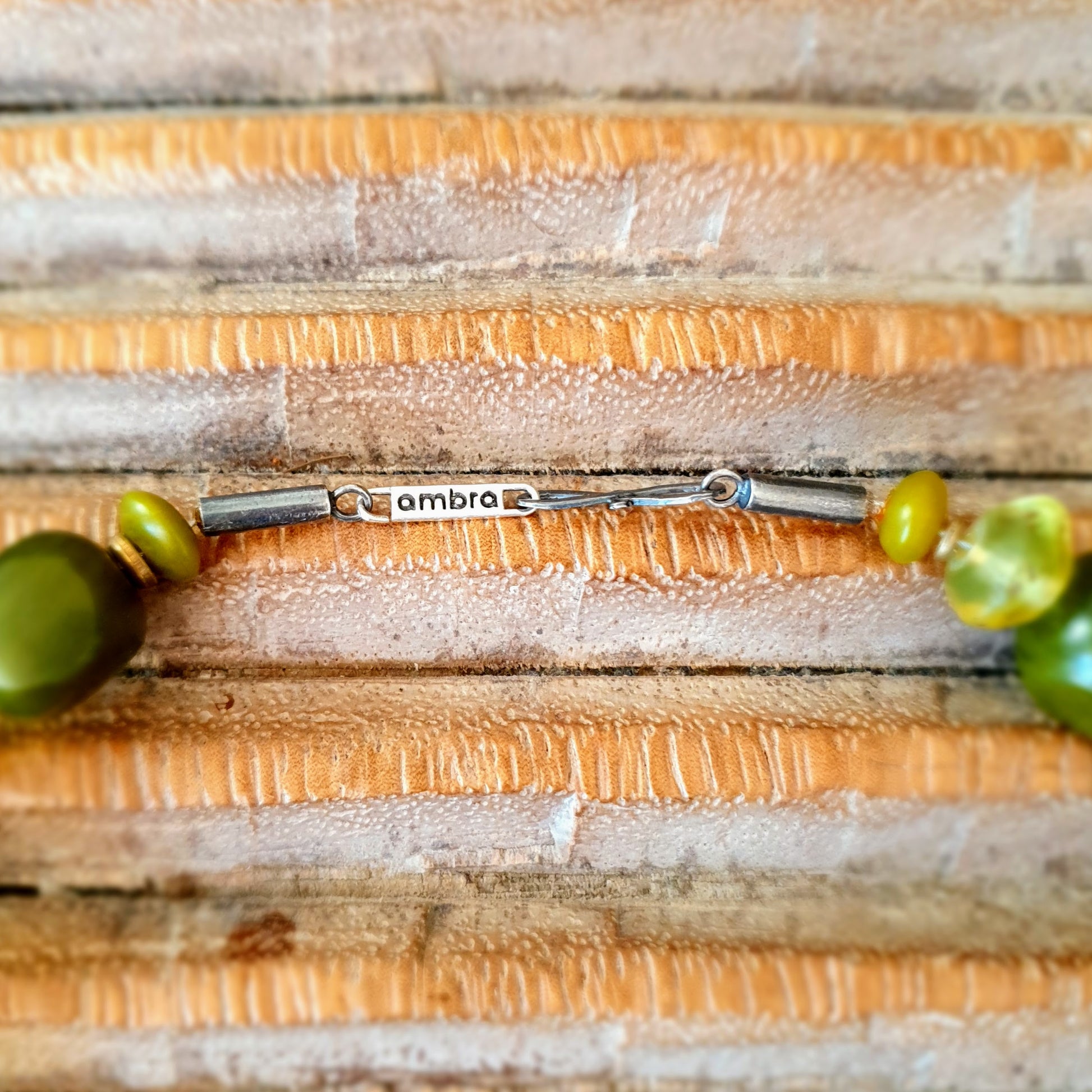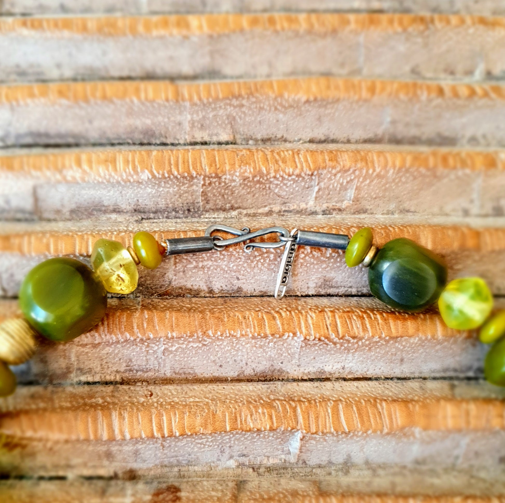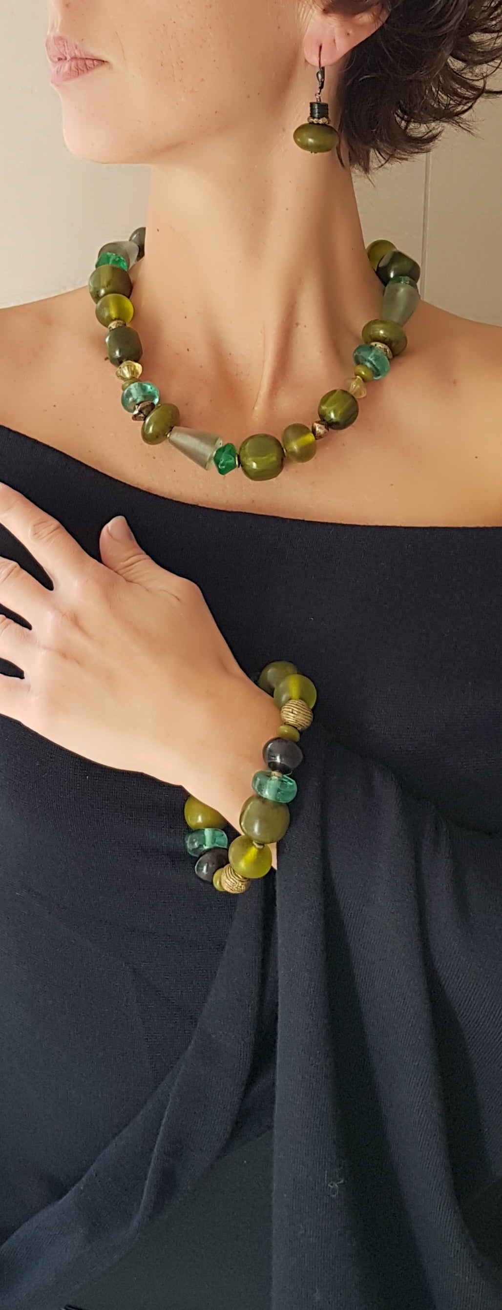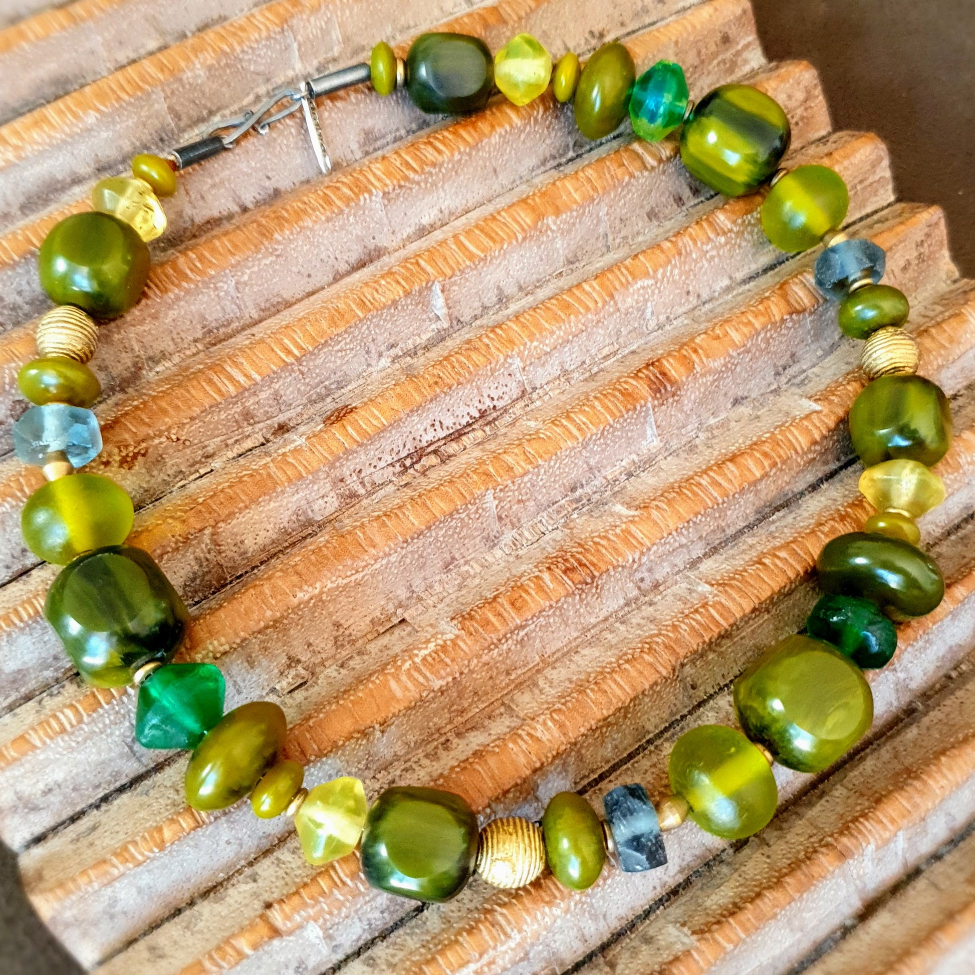 Handcrafted necklace with Indonesian resin beads in different shades of green, faceted glass beads from Africa and Indonesia and Indian bronze beads with oxidized silver clasp by ambra Schmuck.