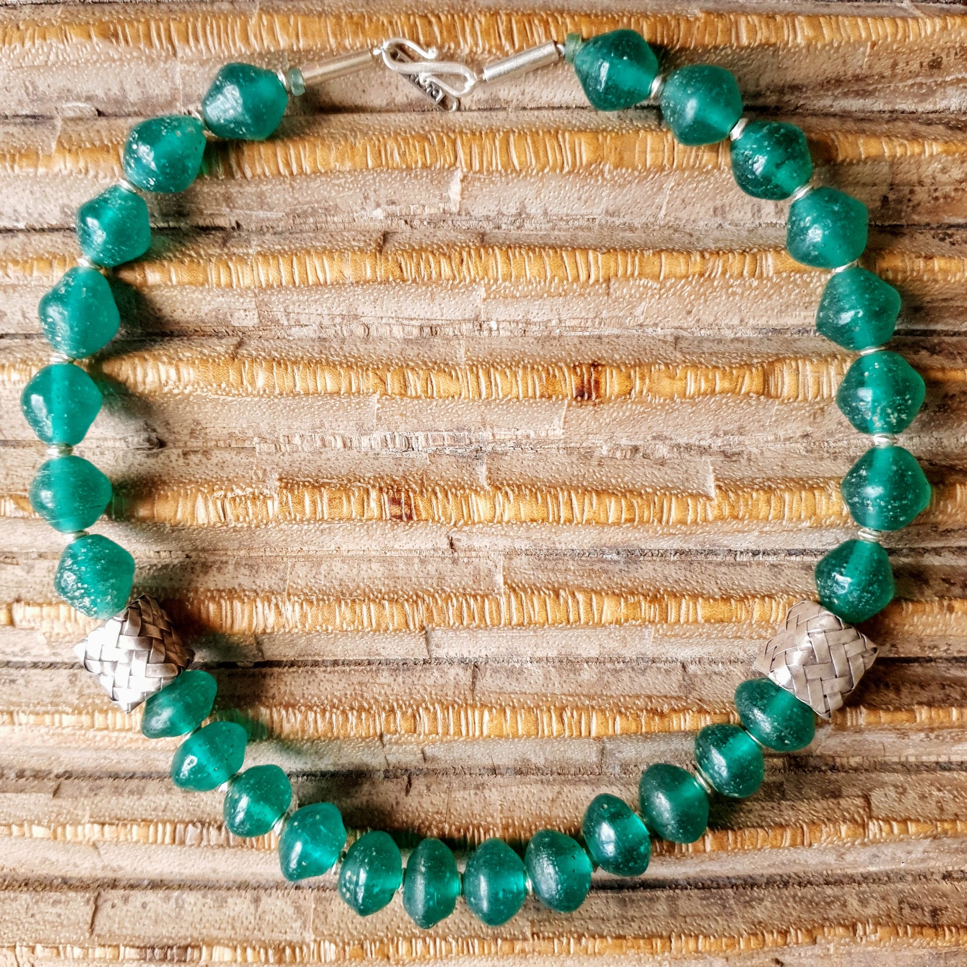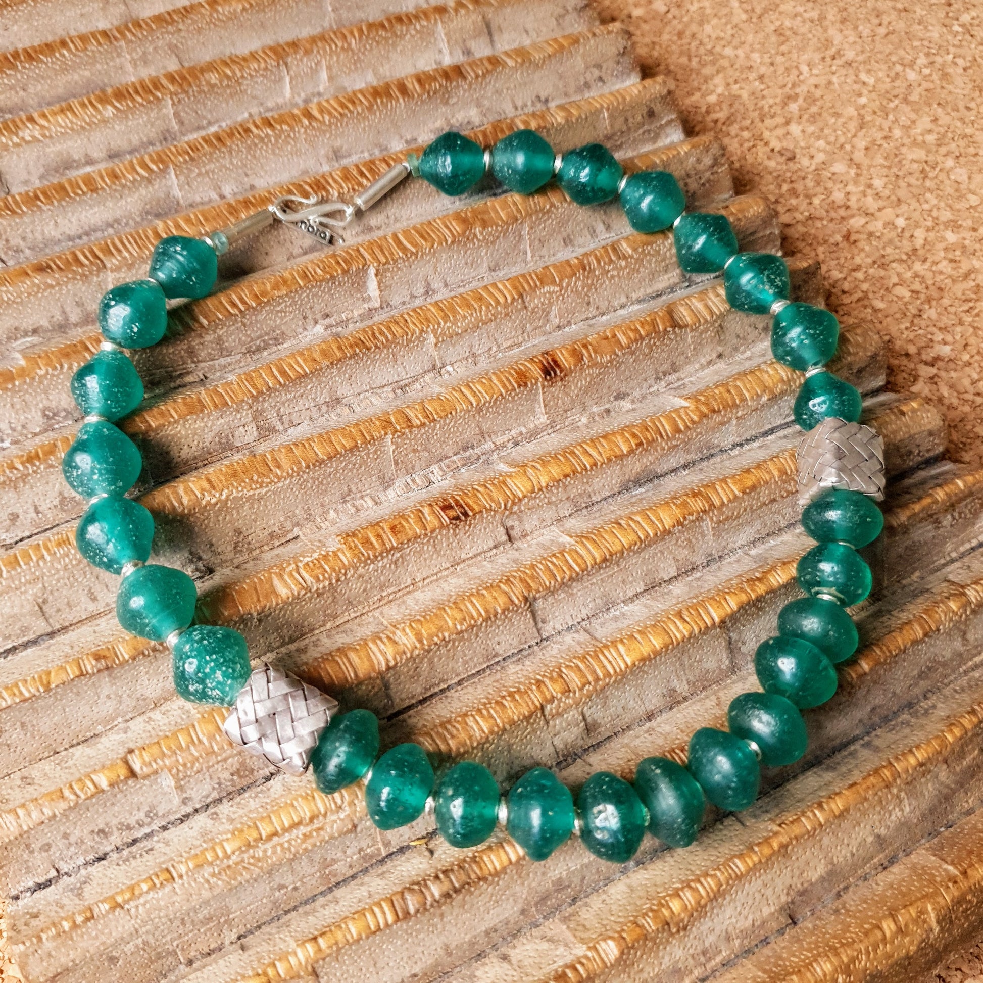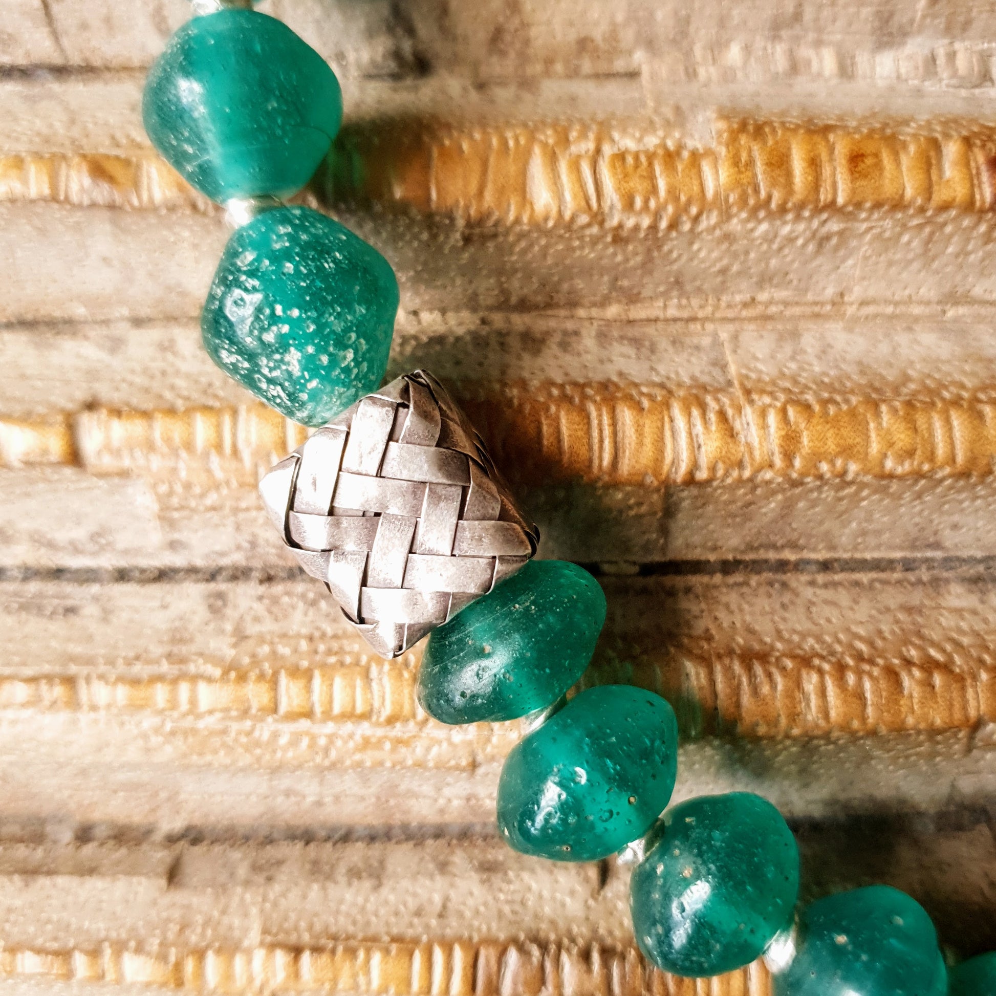 Handgearbeitete Kette mit grünen Glasperlen von der Insel Java, geflochtenen Päckchen aus burmesischem Silber und kleinen Silberperlen mit Silberverschluss von ambra Schmuck.