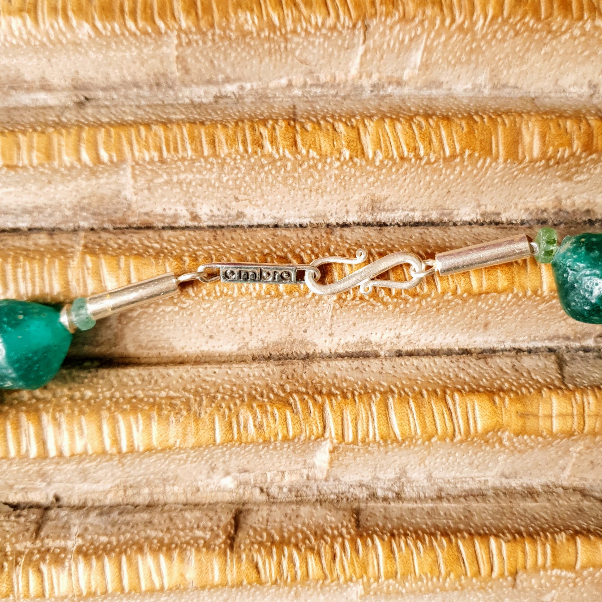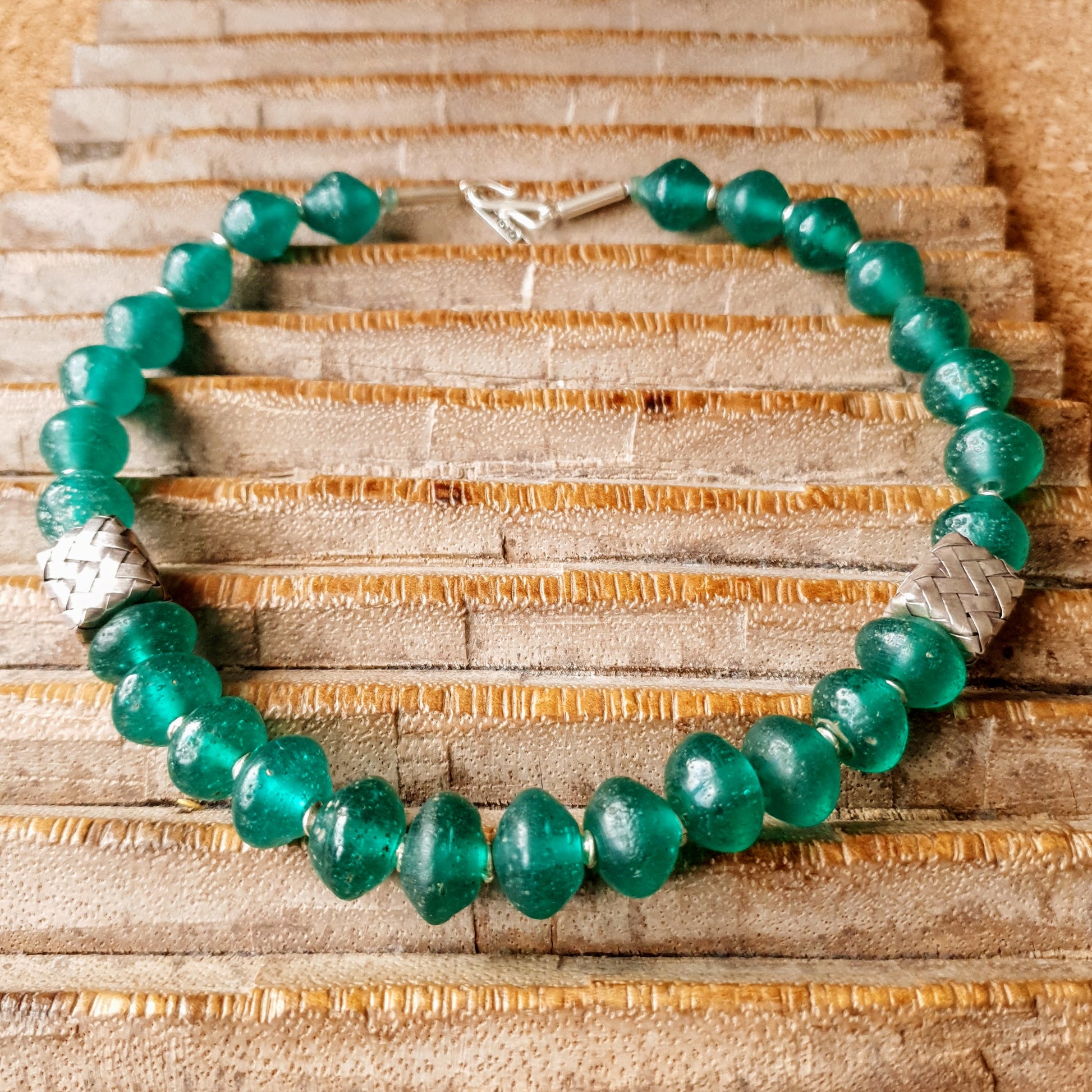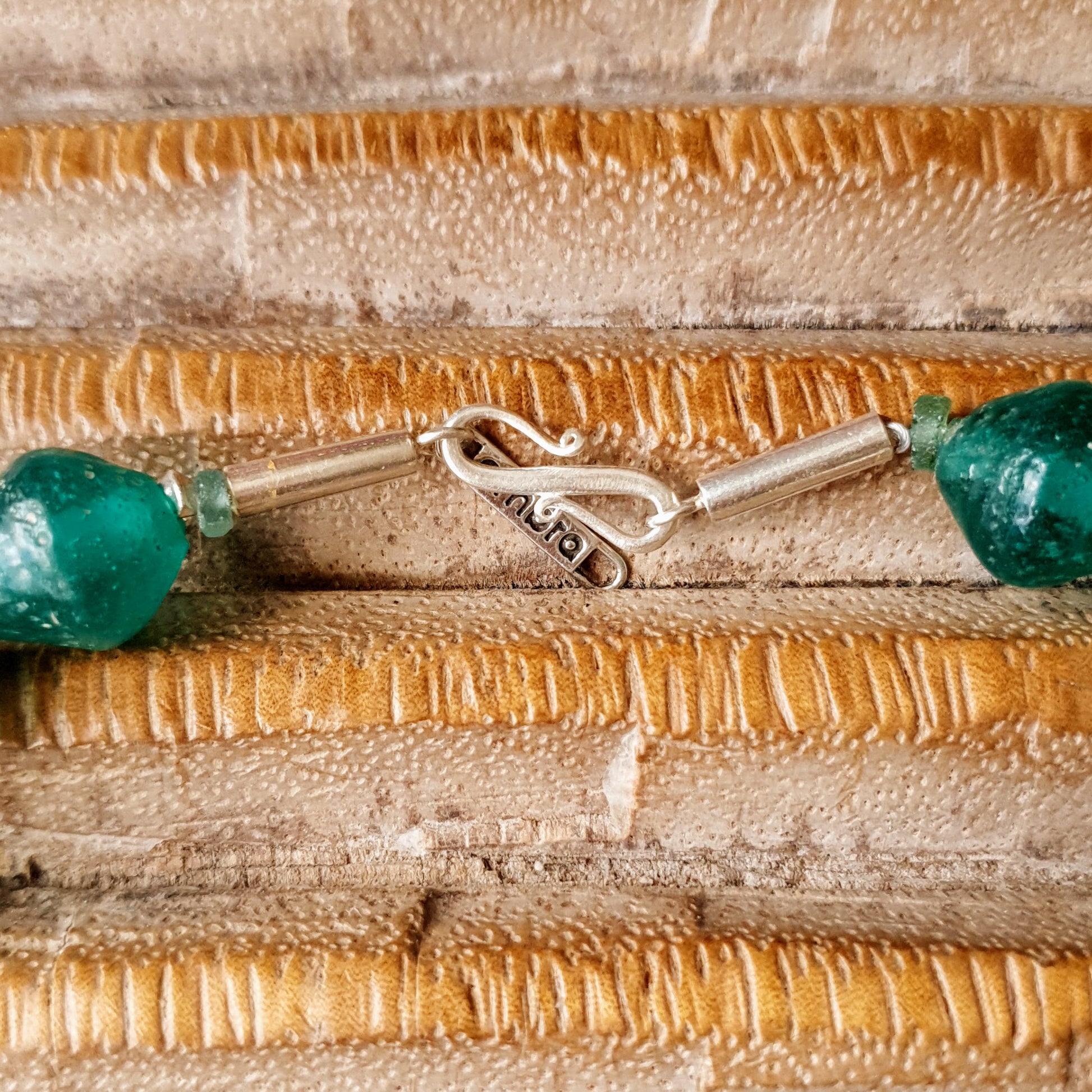 Handgearbeitete Kette mit grünen Glasperlen von der Insel Java, geflochtenen Päckchen aus burmesischem Silber und kleinen Silberperlen mit Silberverschluss von ambra Schmuck.