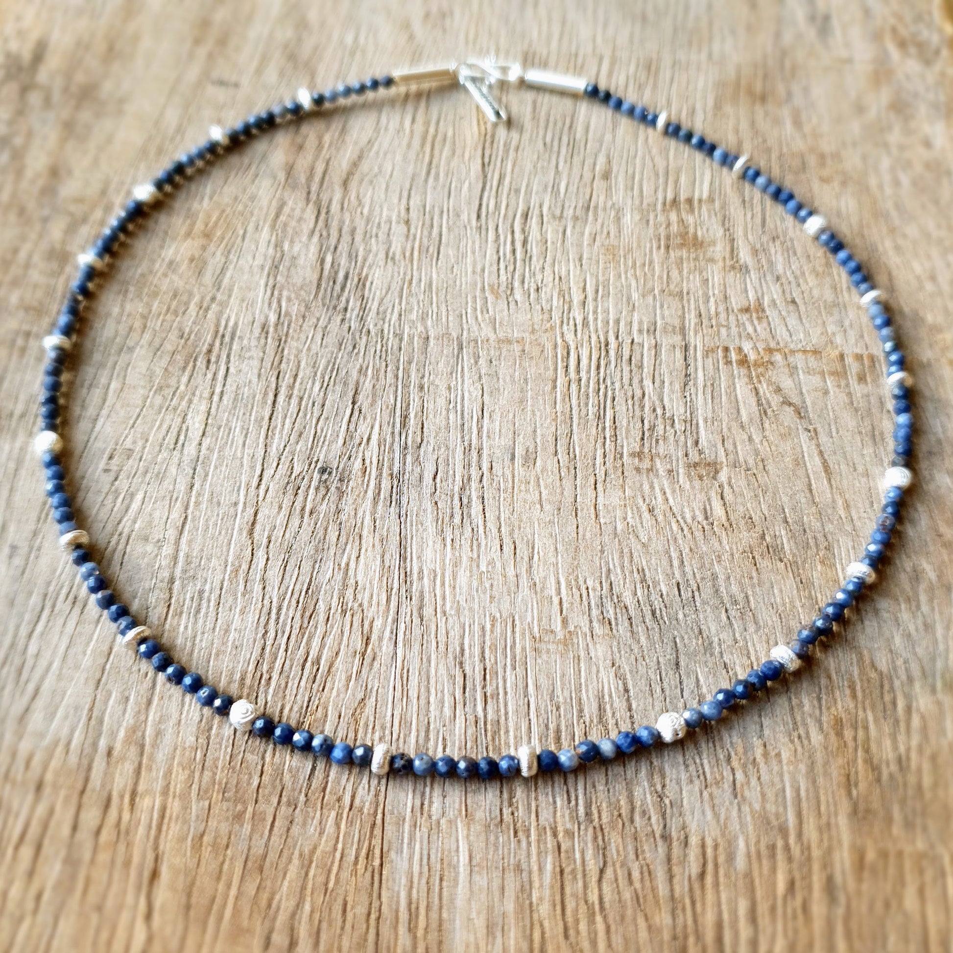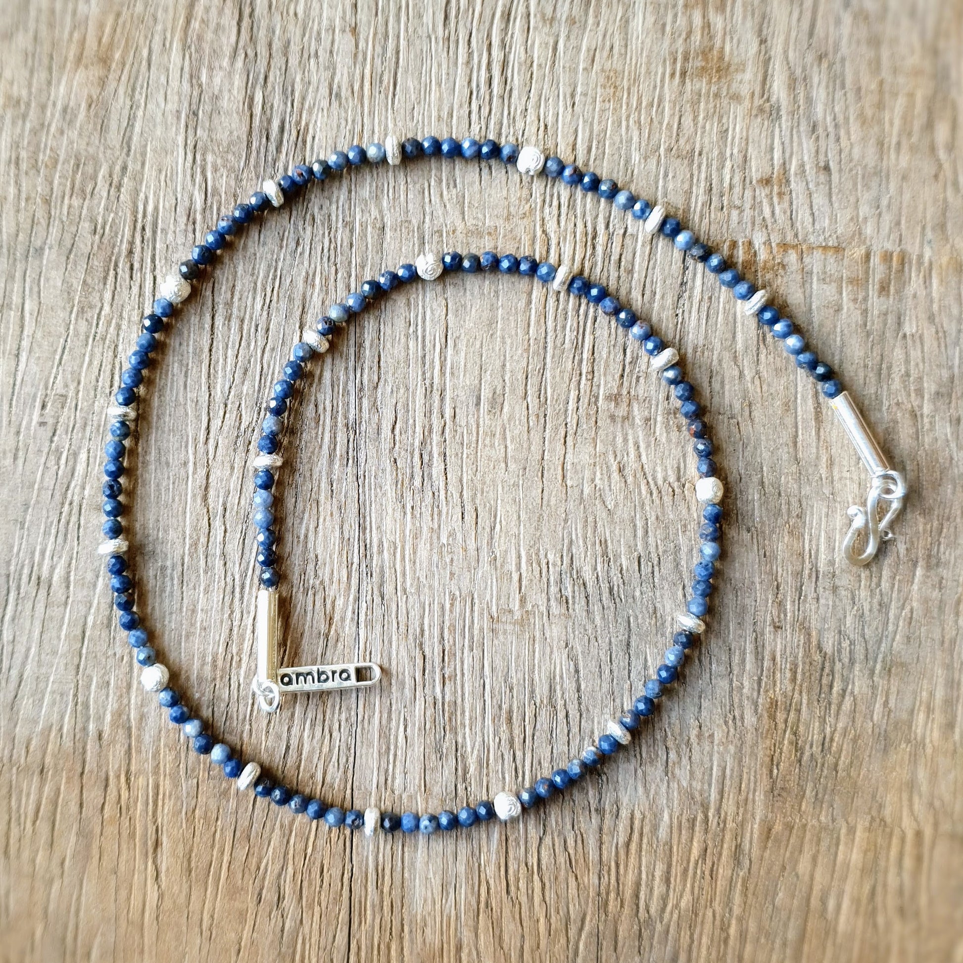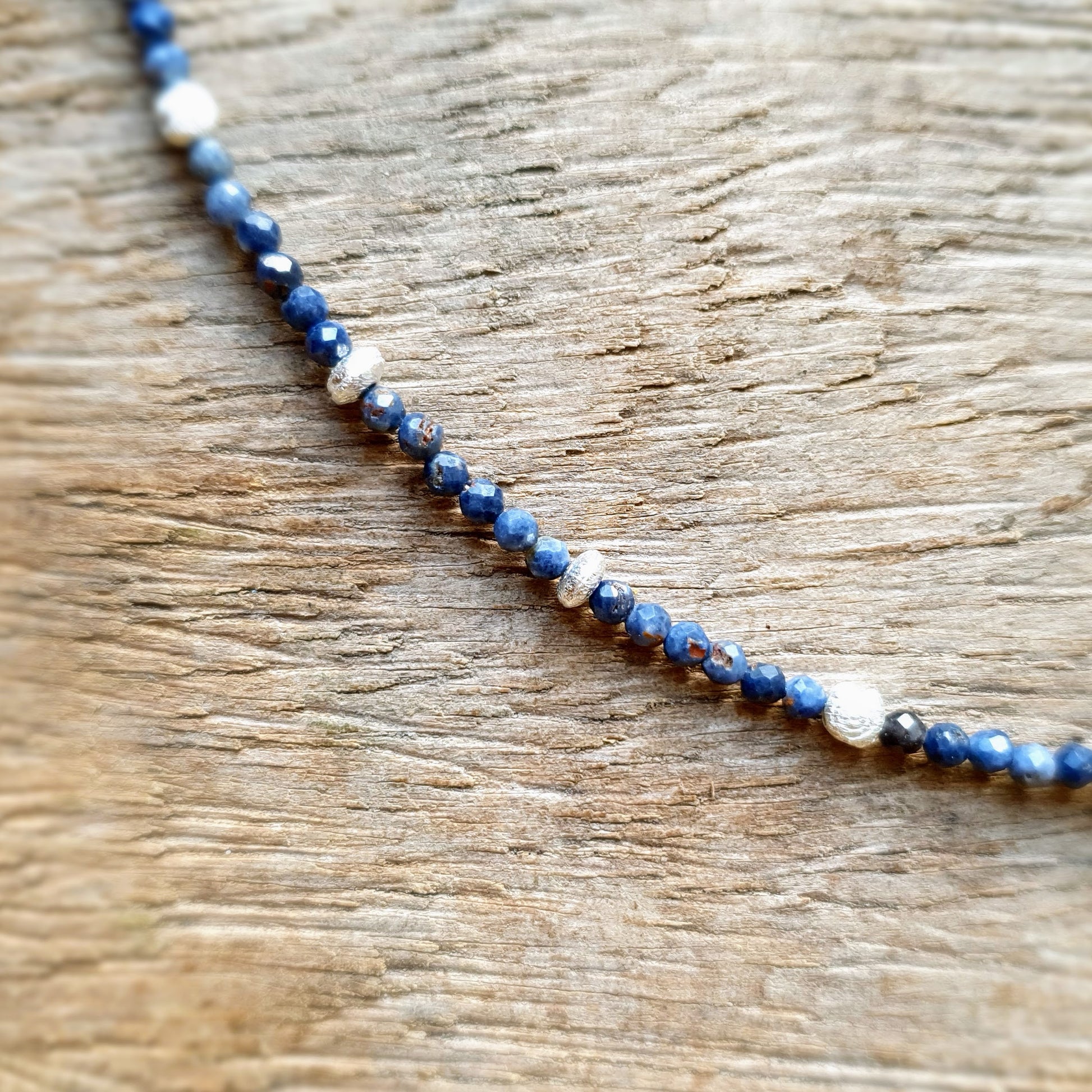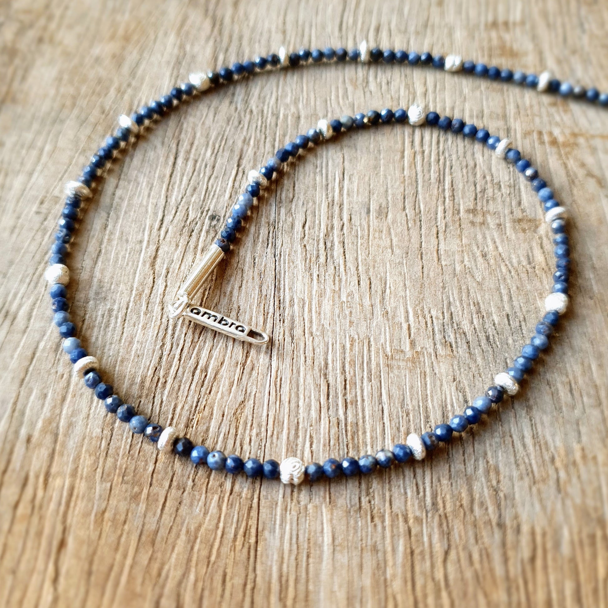 Feine handgearbeitete Halskette mit blaugrauen facettierten Saphirsteinen und mattierten Silberperlen mit Silberverschluss von ambra Schmuck.