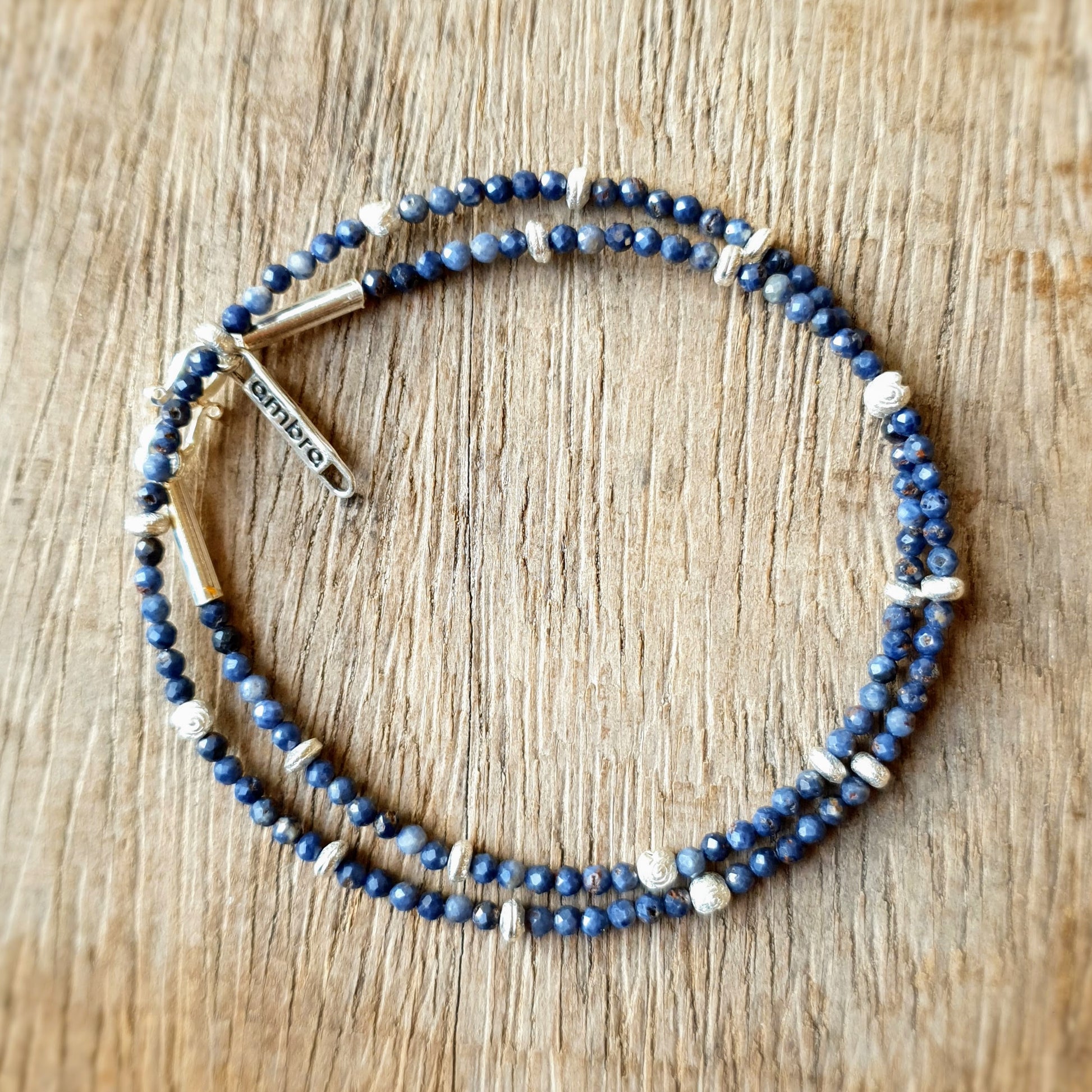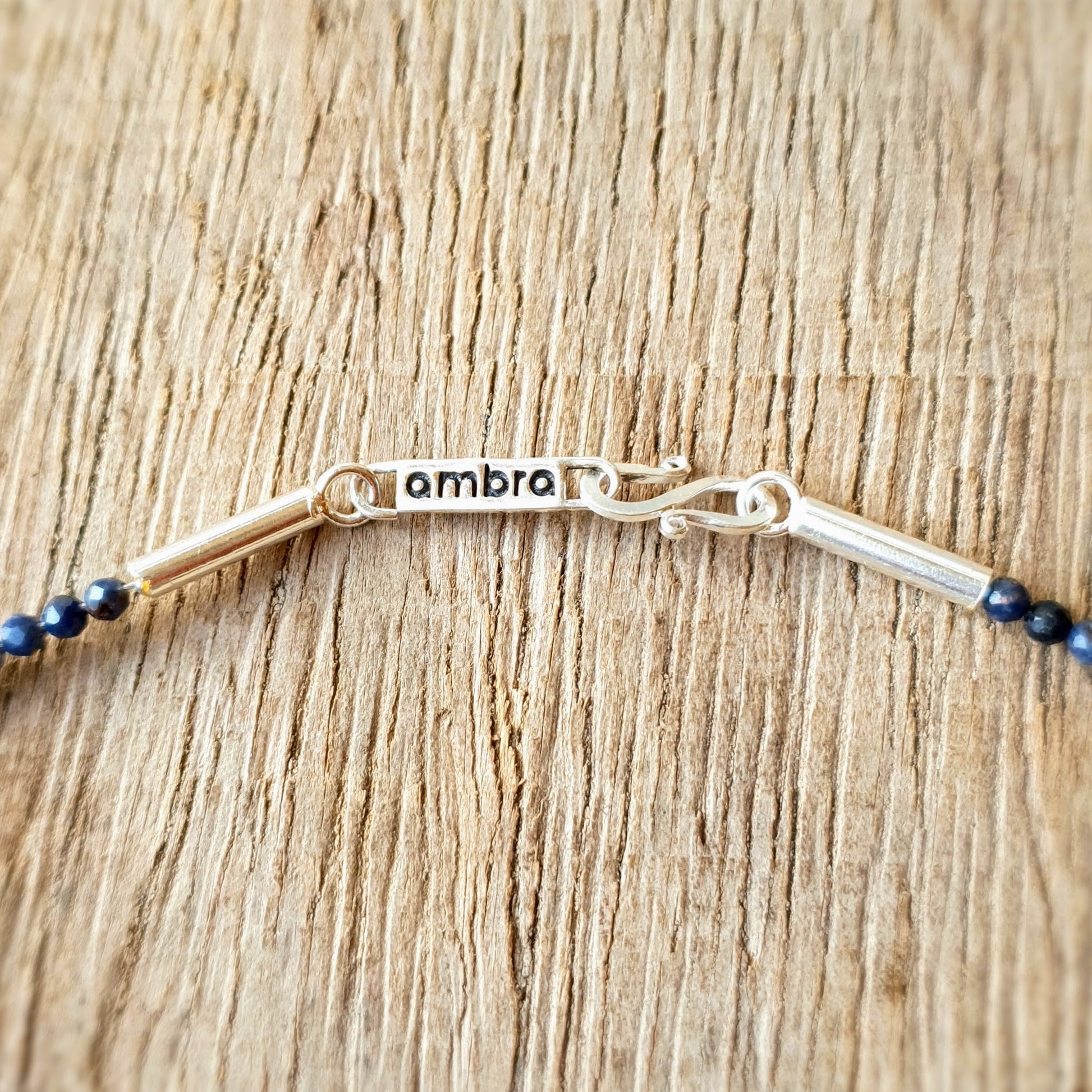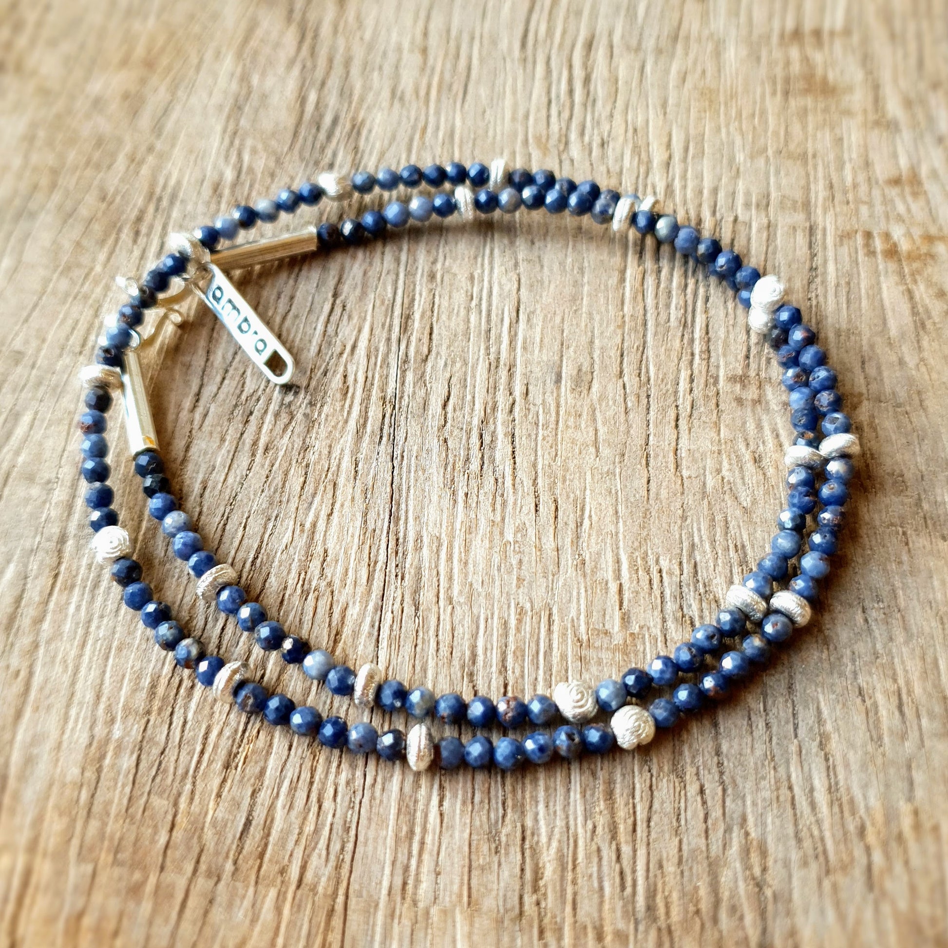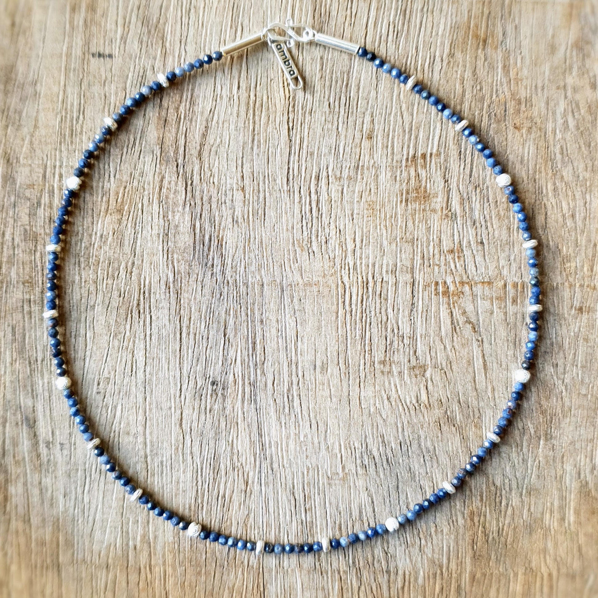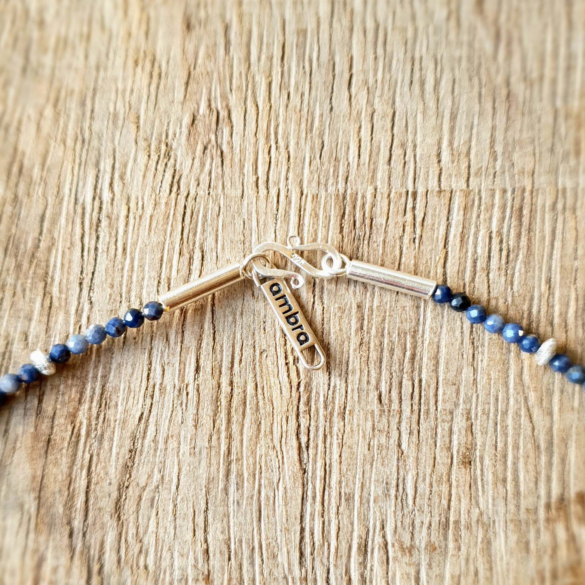 Feine handgearbeitete Halskette mit blaugrauen facettierten Saphirsteinen und mattierten Silberperlen mit Silberverschluss von ambra Schmuck.