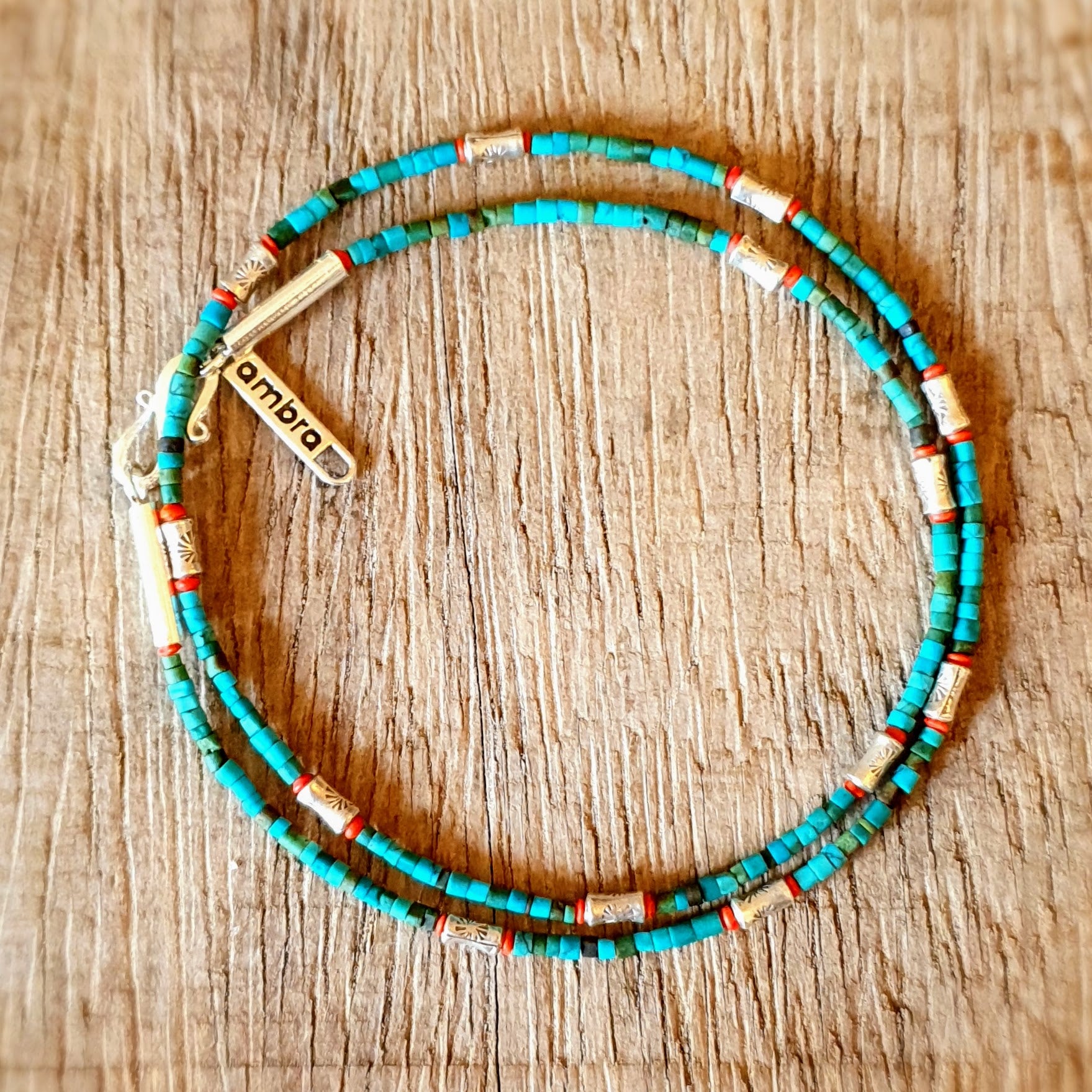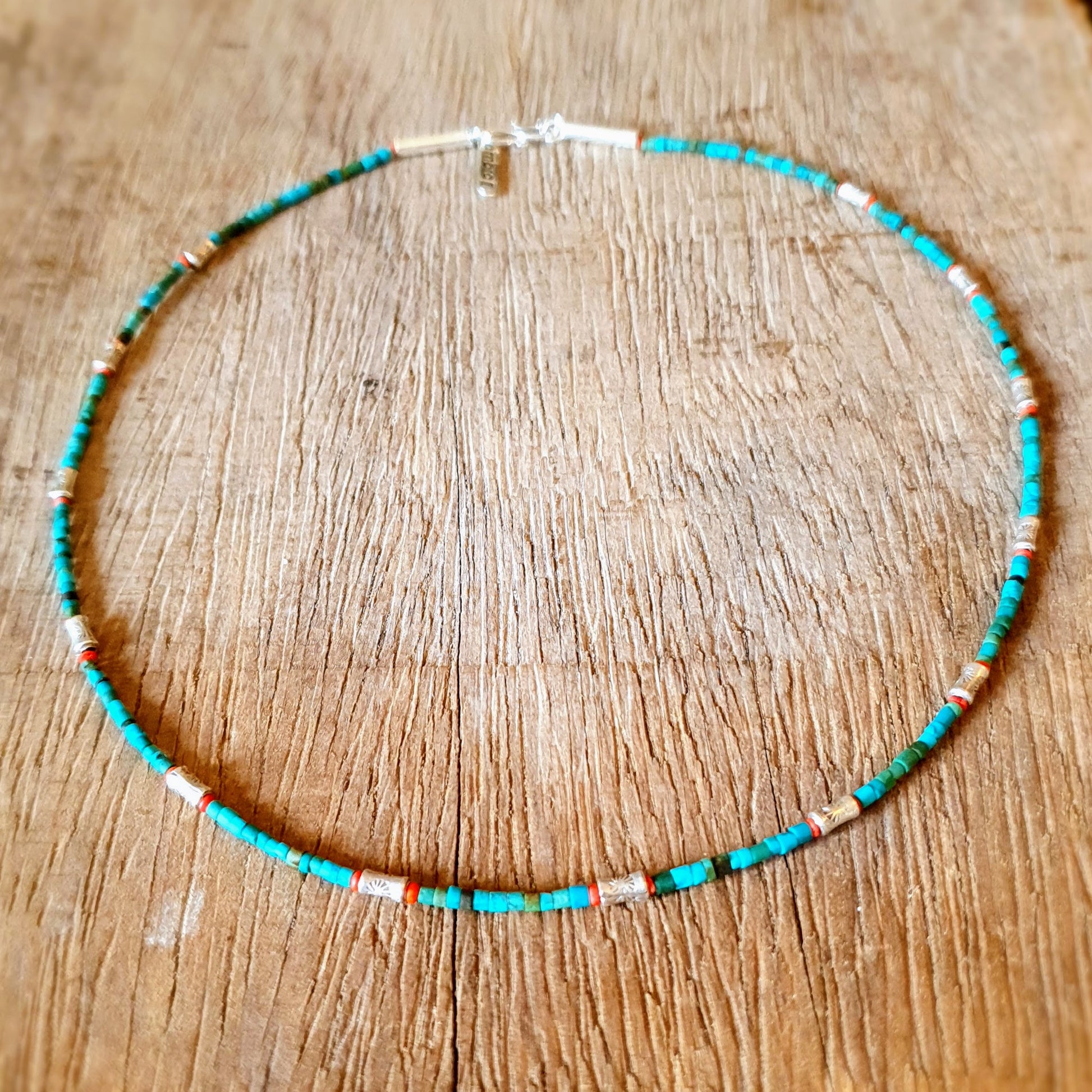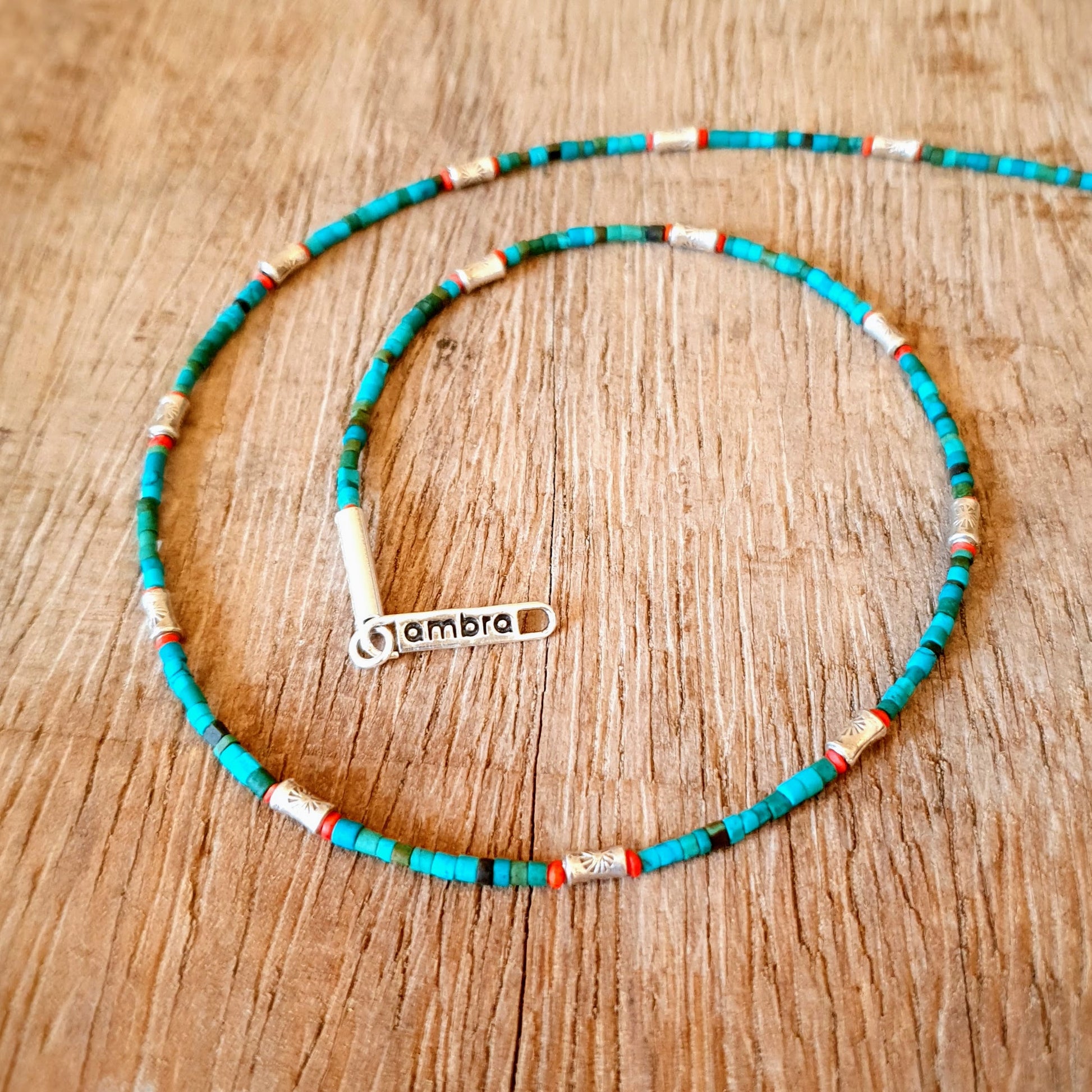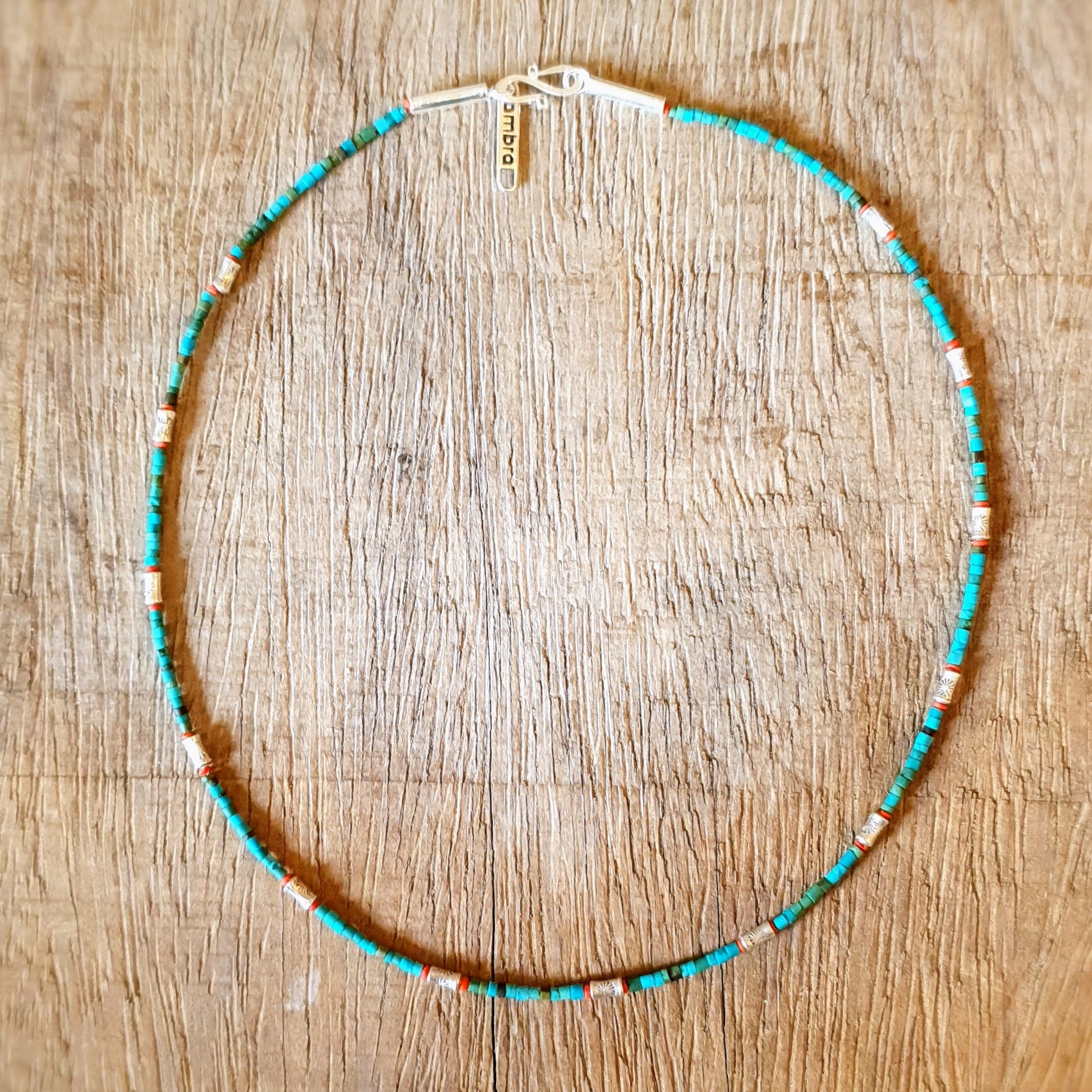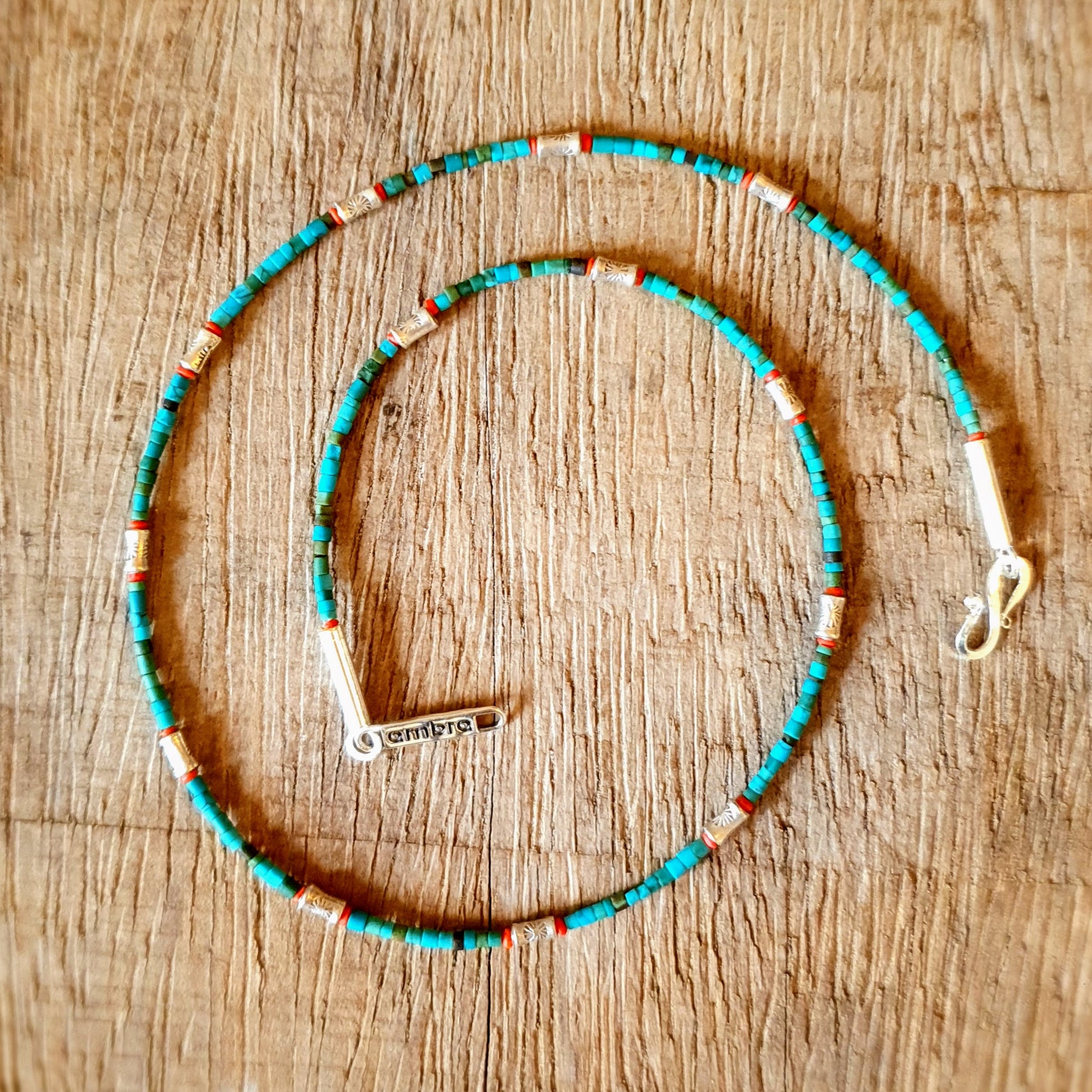 Fine handcrafted necklace with turquoise stones, red coral beads and hammered silver beads from Burma silver clasp by ambra Schmuck.