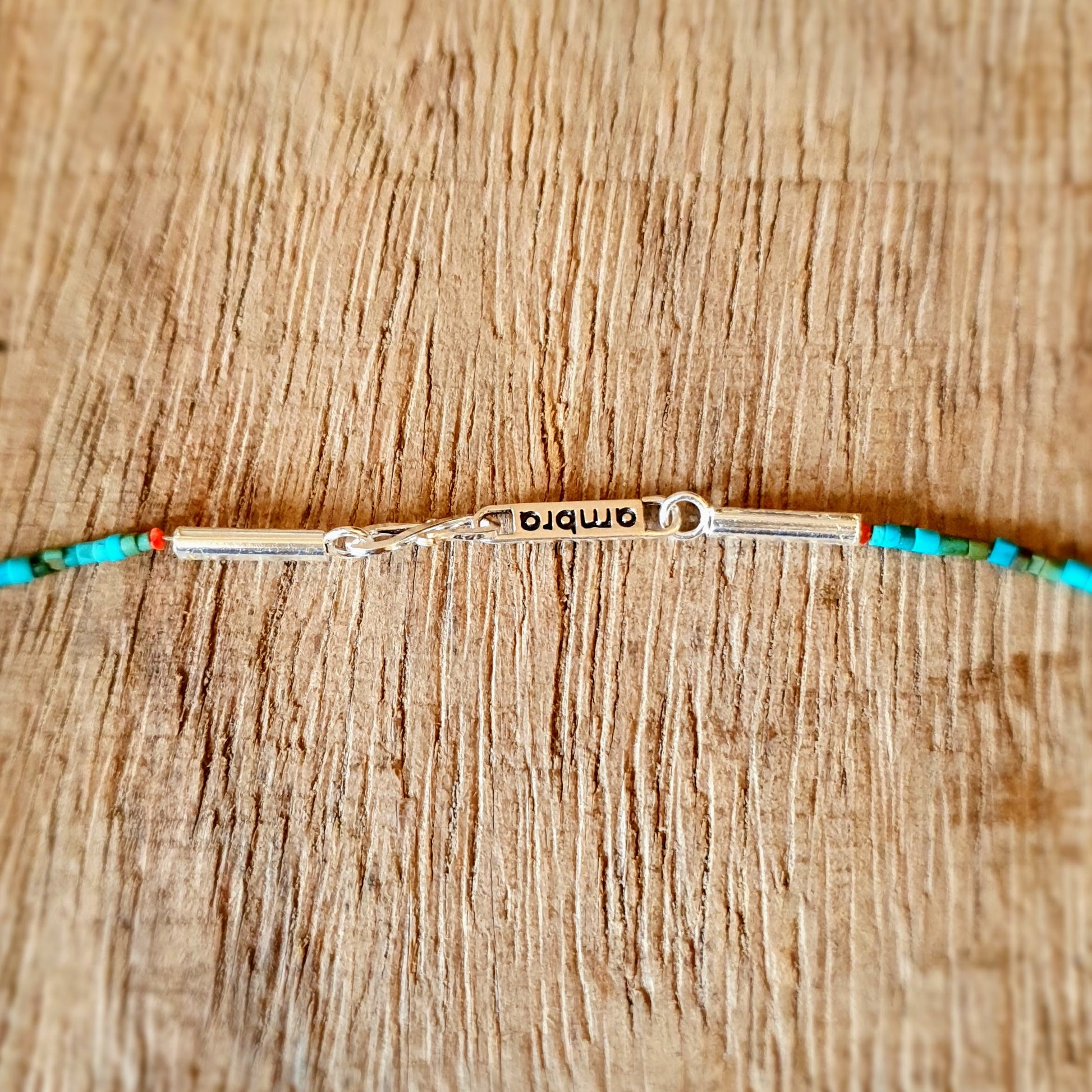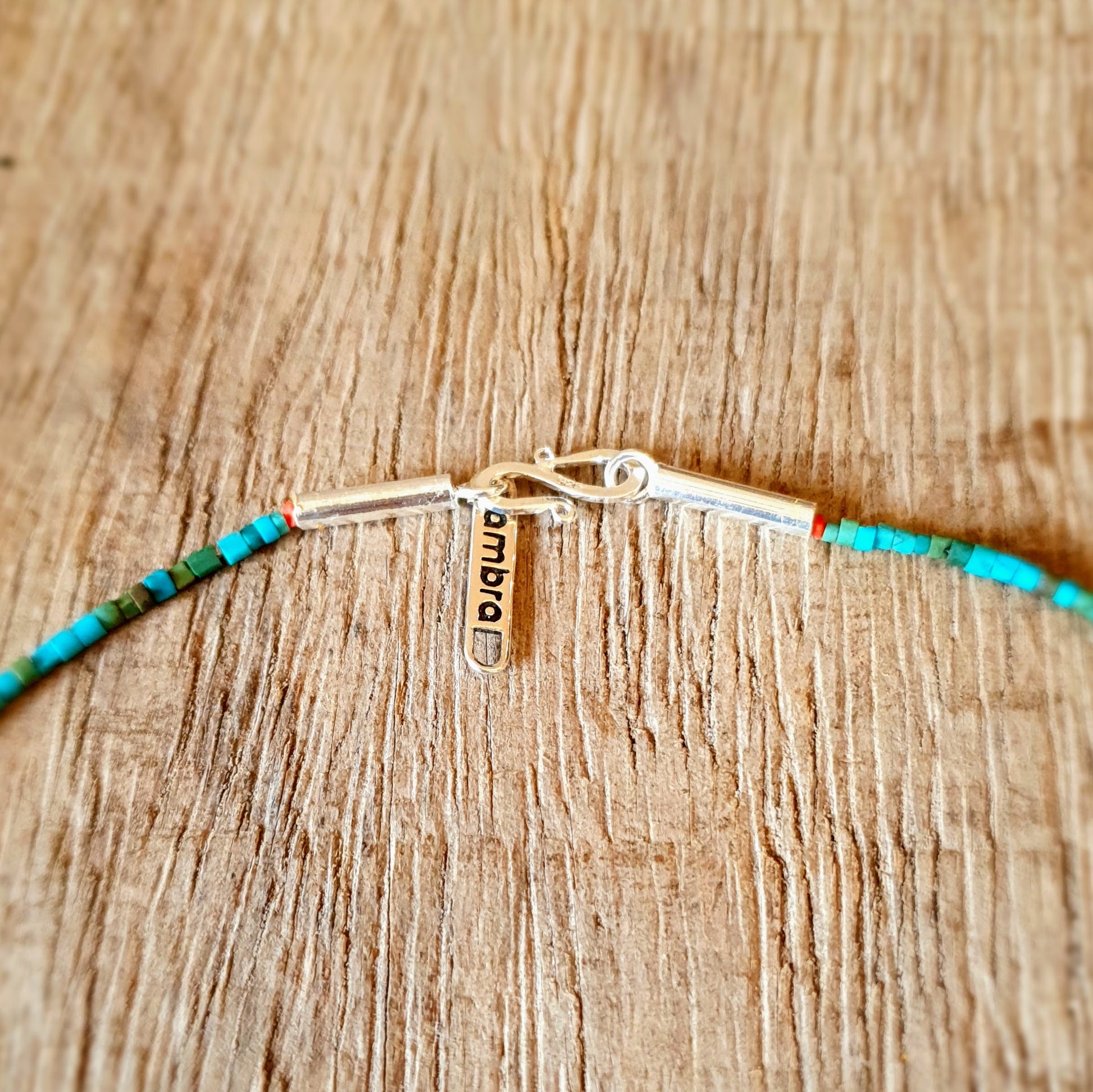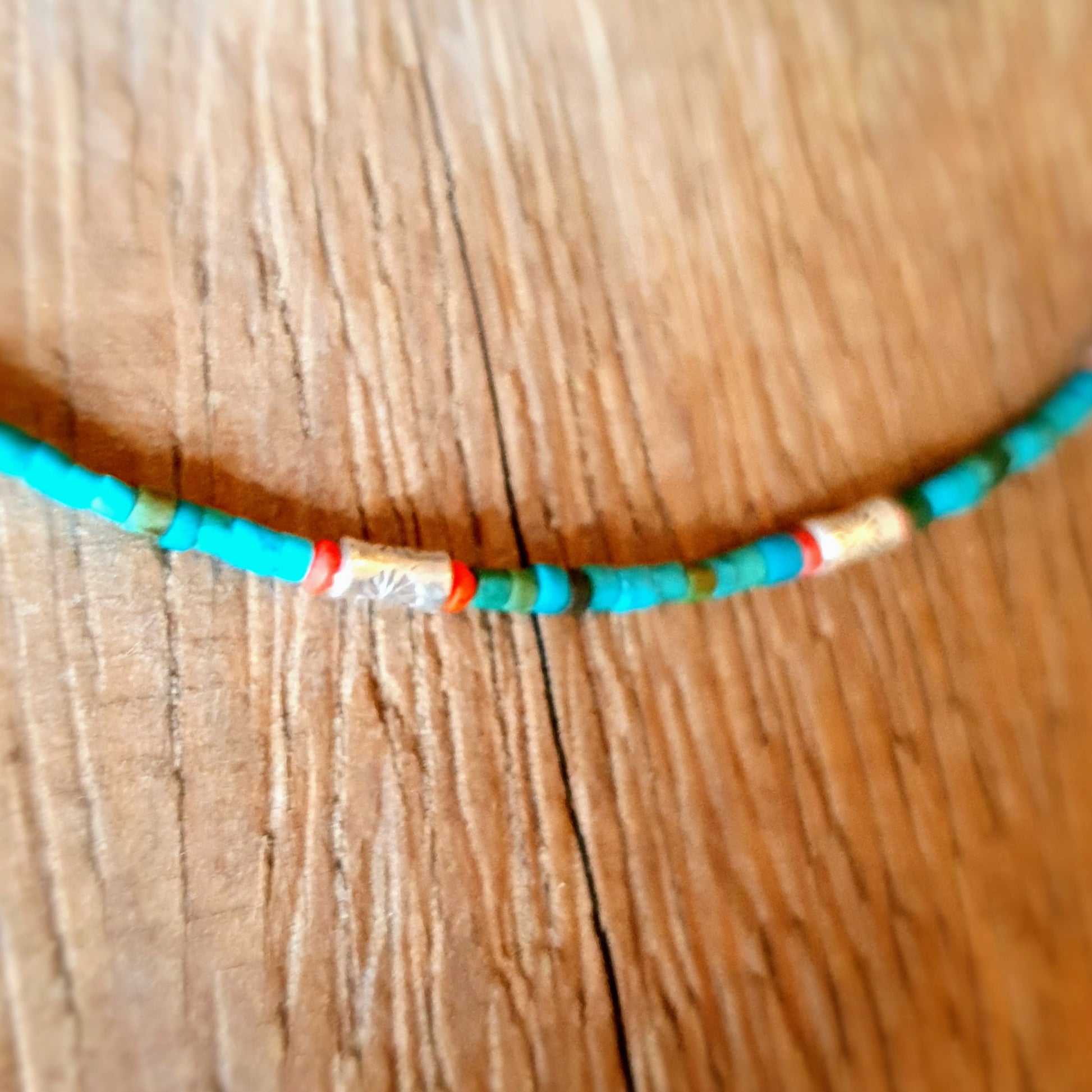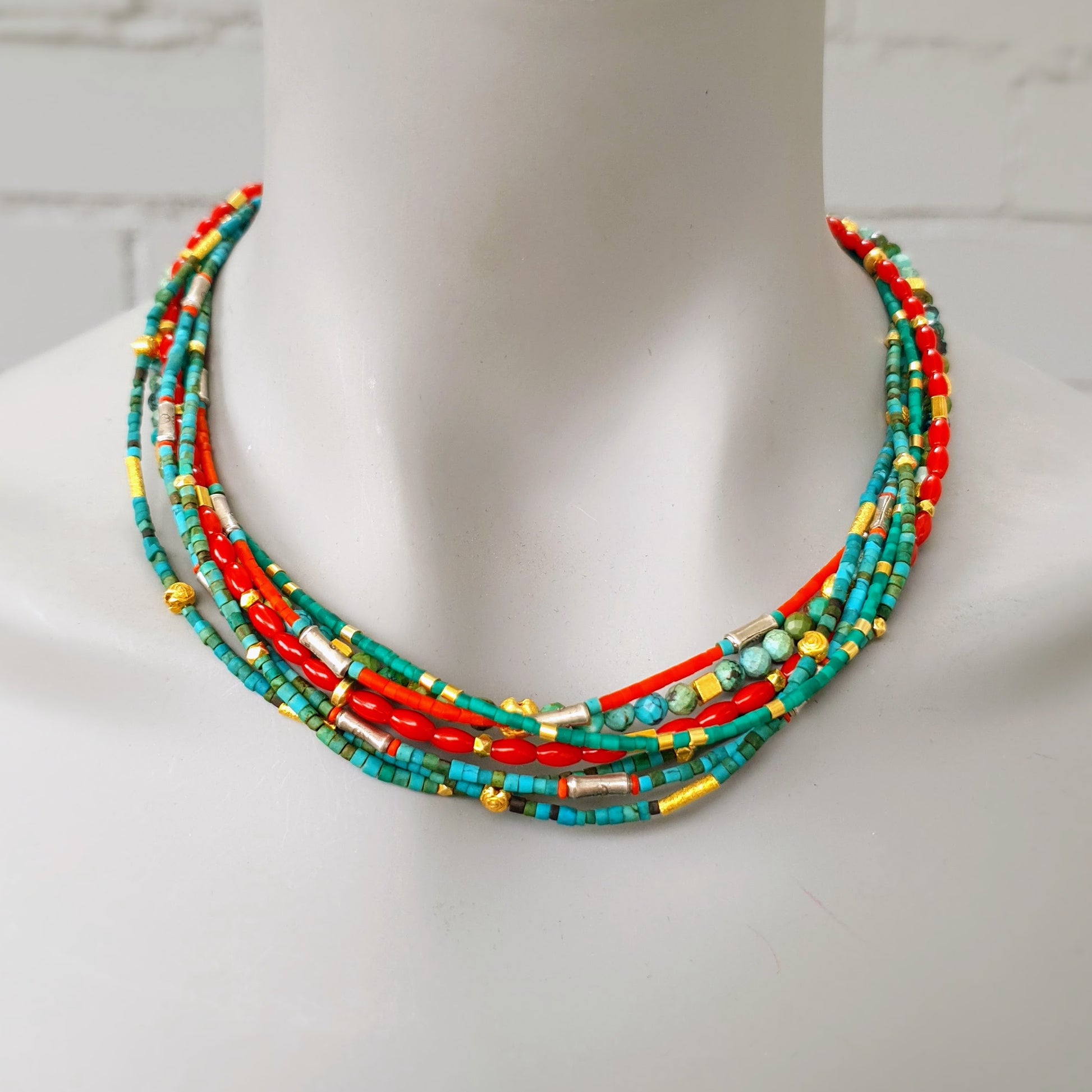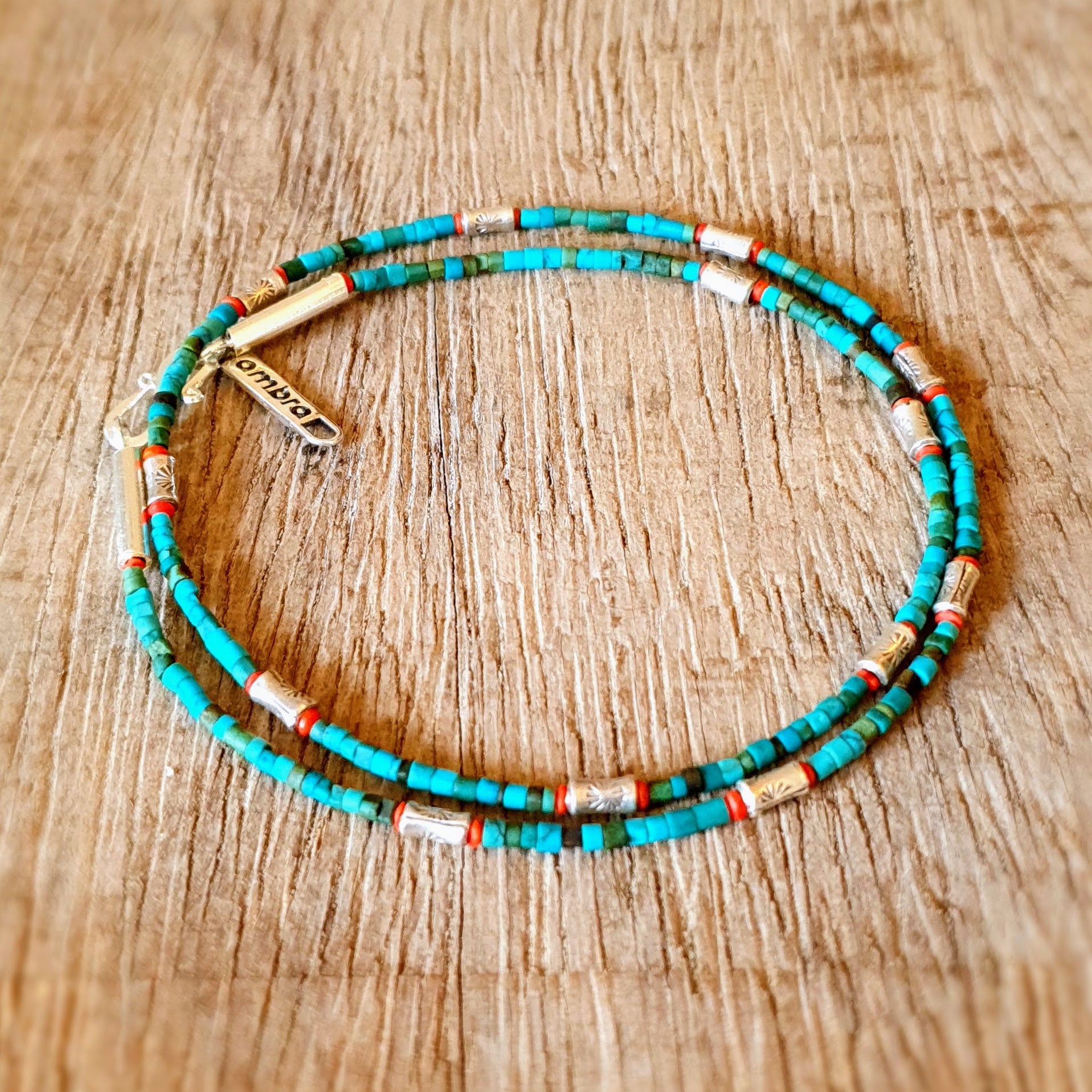 Fine handcrafted necklace with turquoise stones, red coral beads and hammered silver beads from Burma silver clasp by ambra Schmuck.