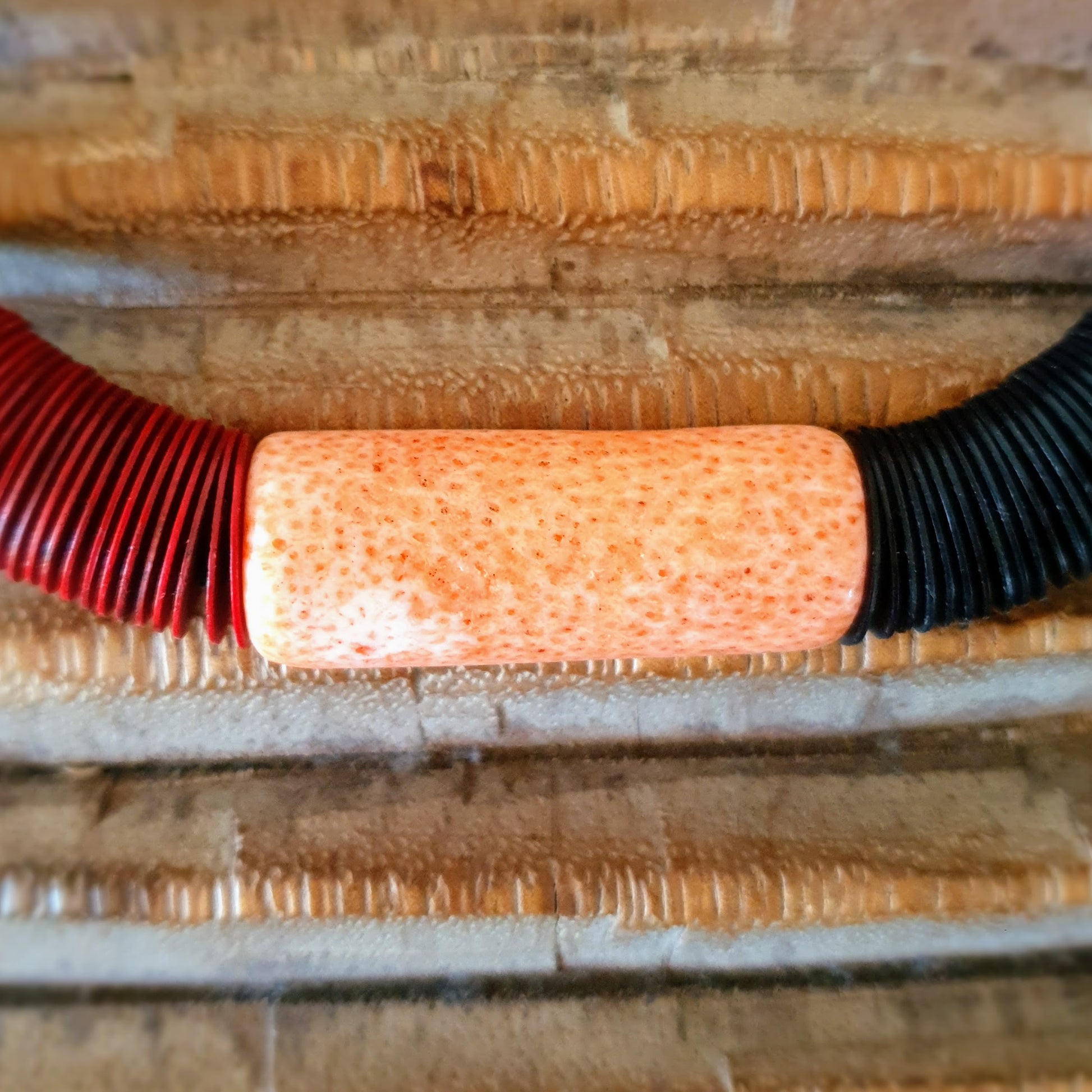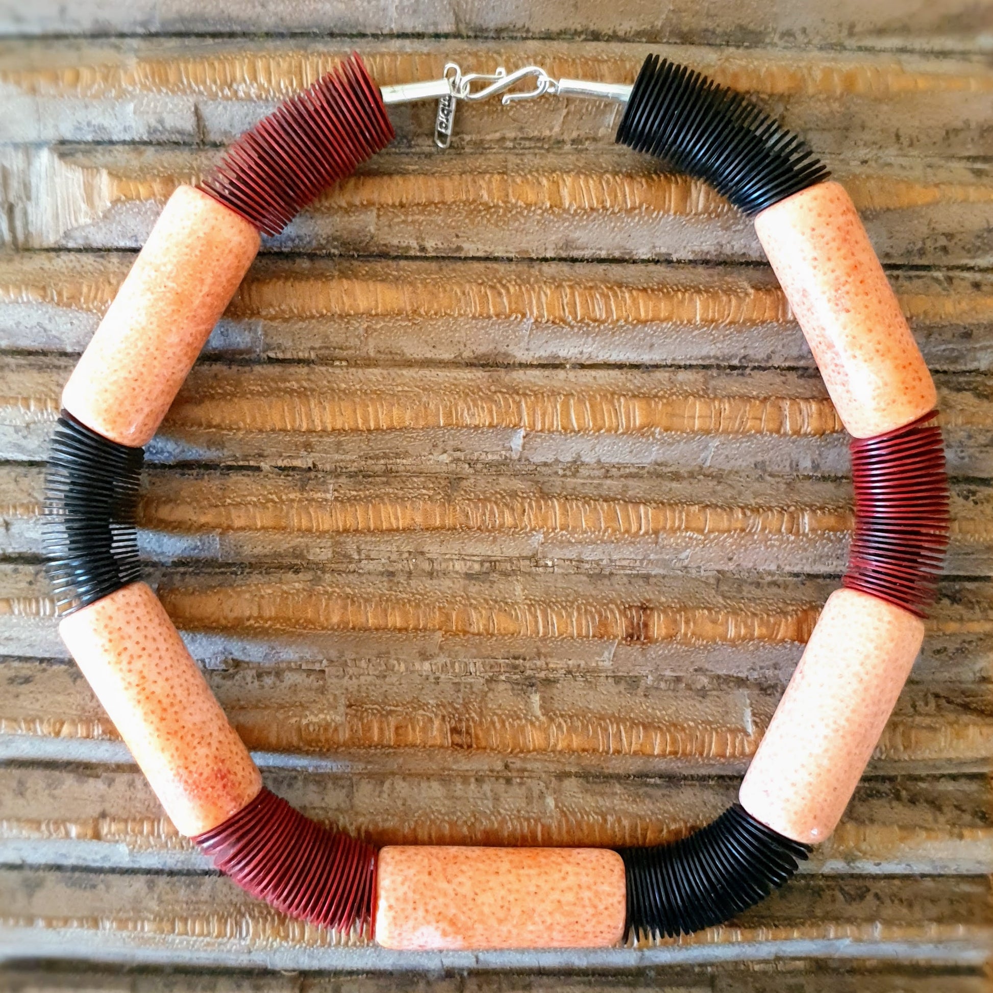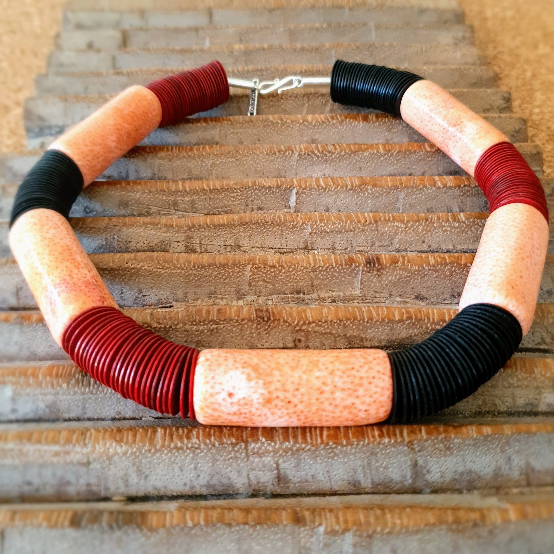 Large handcrafted necklace with salmon-colored coral beads and red and black Bakelite discs from Africa with a silver clasp by ambra Schmuck.