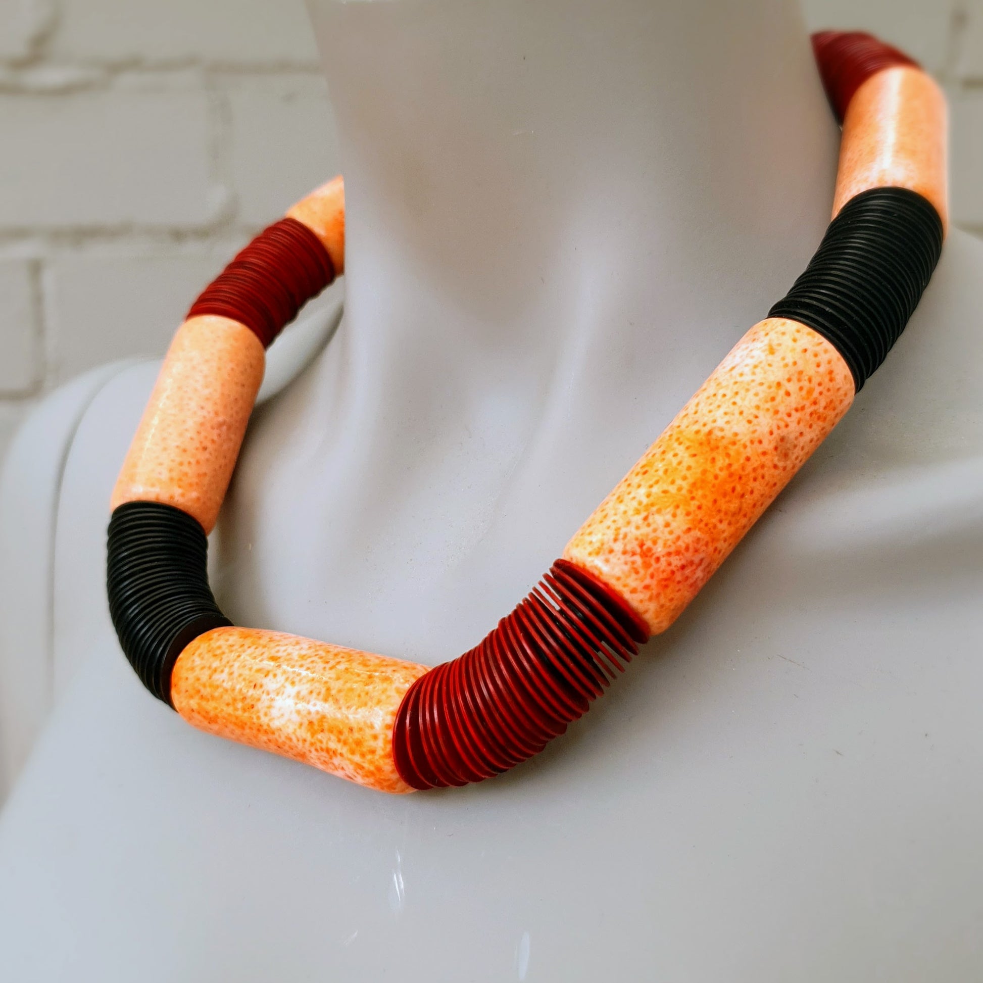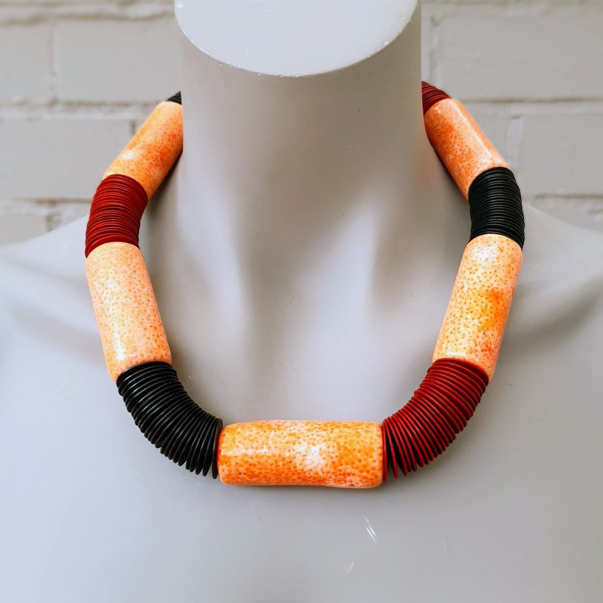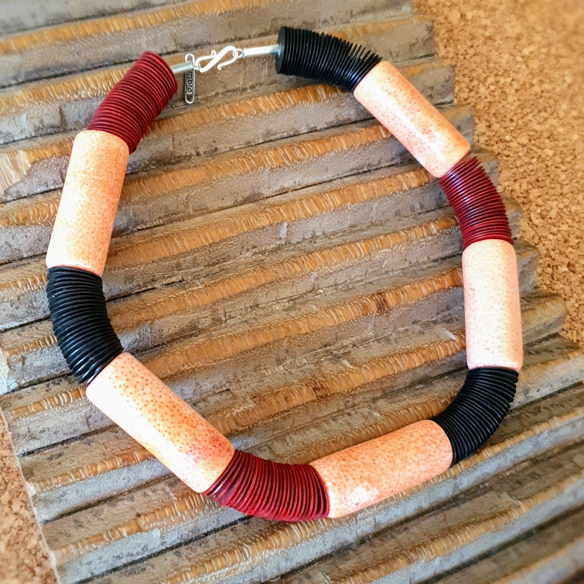 Large handcrafted necklace with salmon-colored coral beads and red and black Bakelite discs from Africa with a silver clasp by ambra Schmuck.